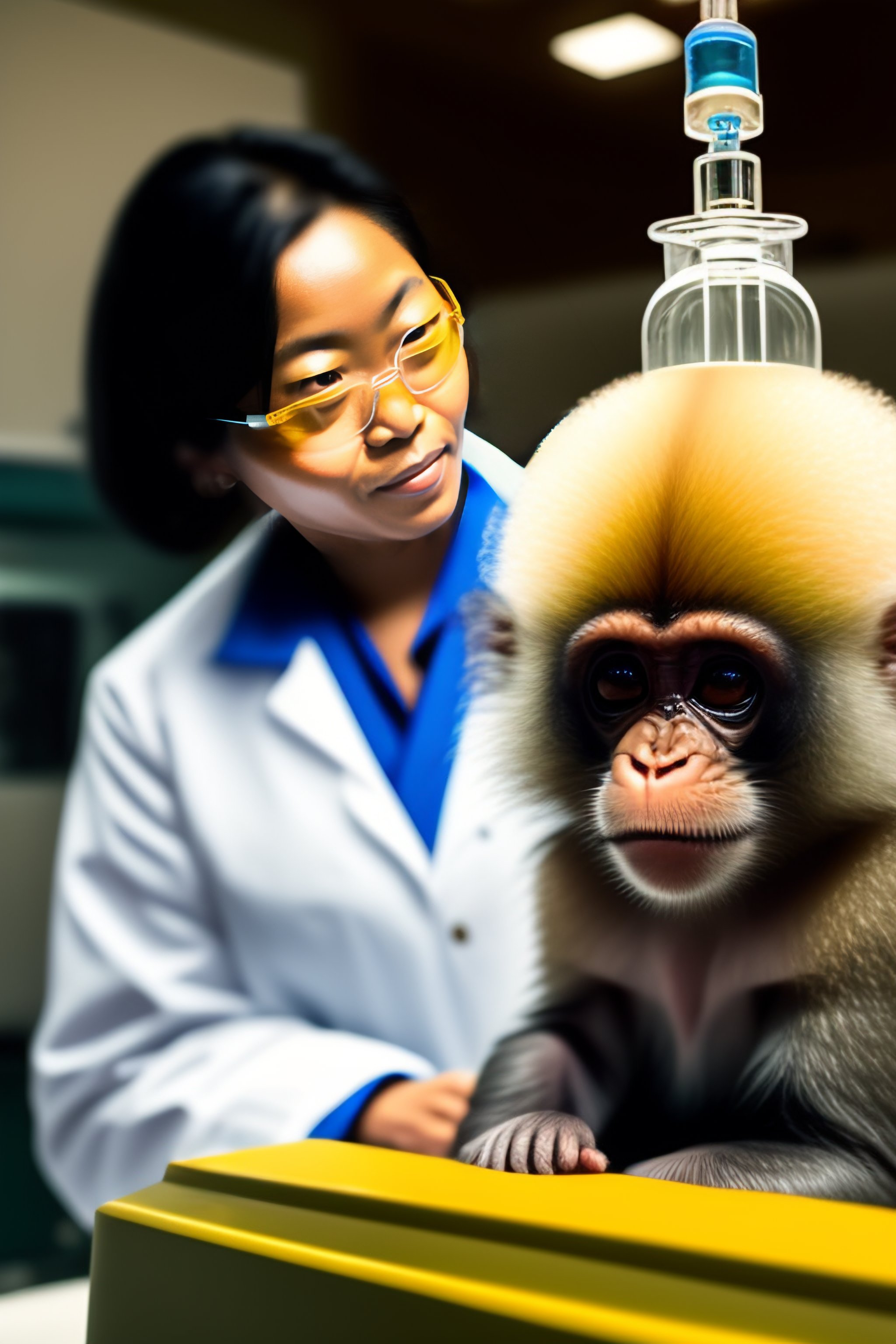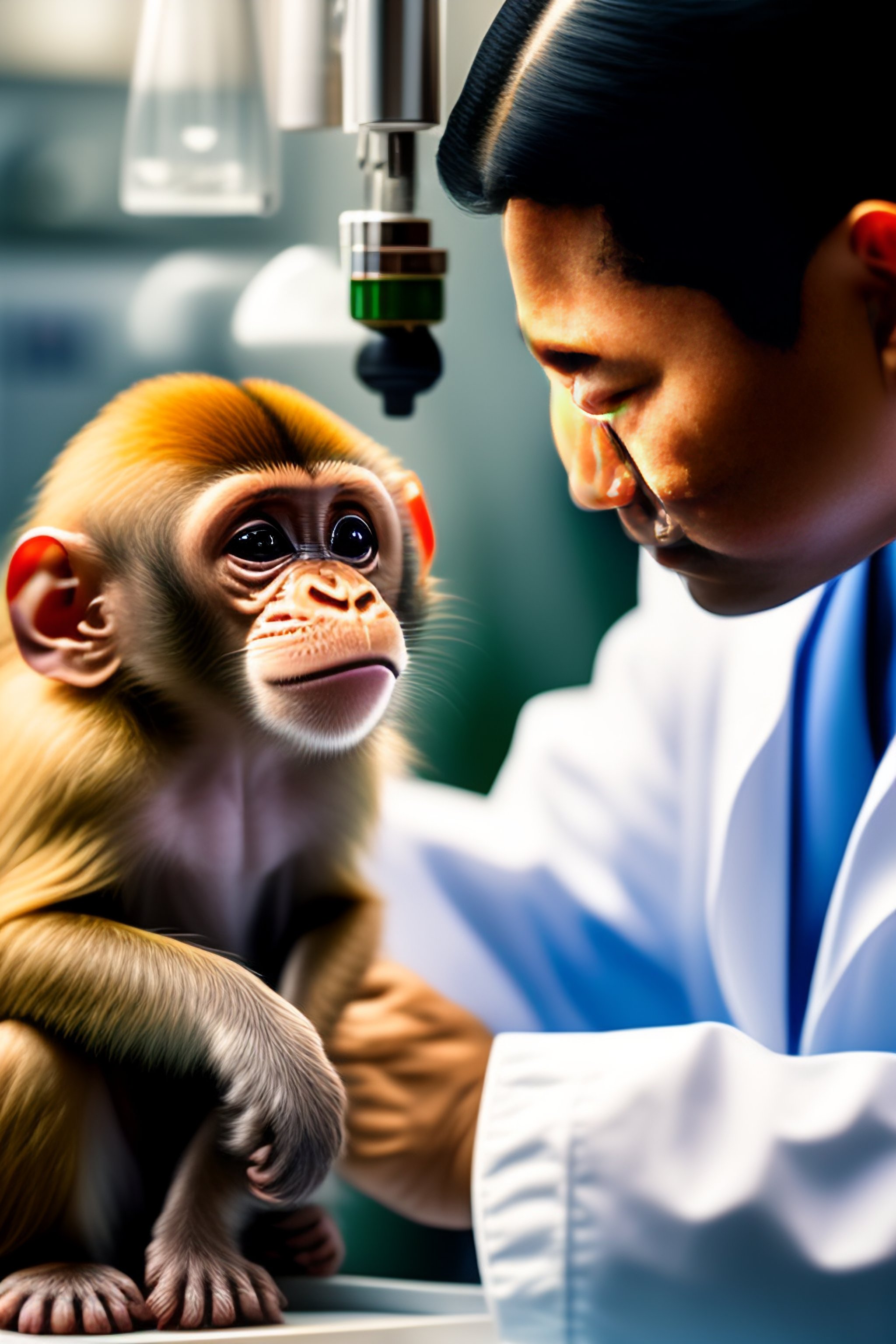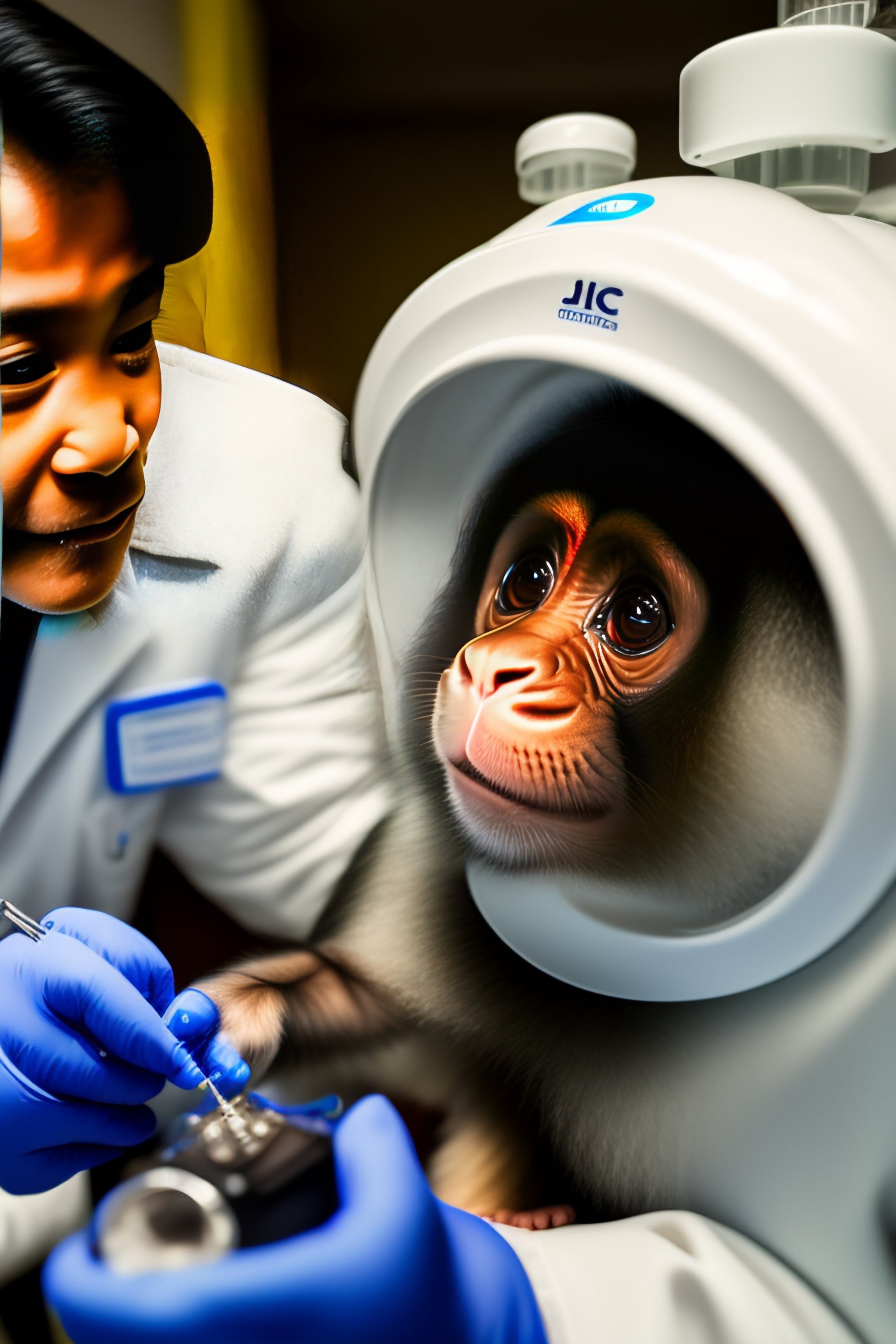 A scientist wearing a lab coat using icms to generate a phosphene in the primary visual cortex of a monkey's brain, with the monkey looking directly into the camera with its eyes wide open. the monkey looks happy.