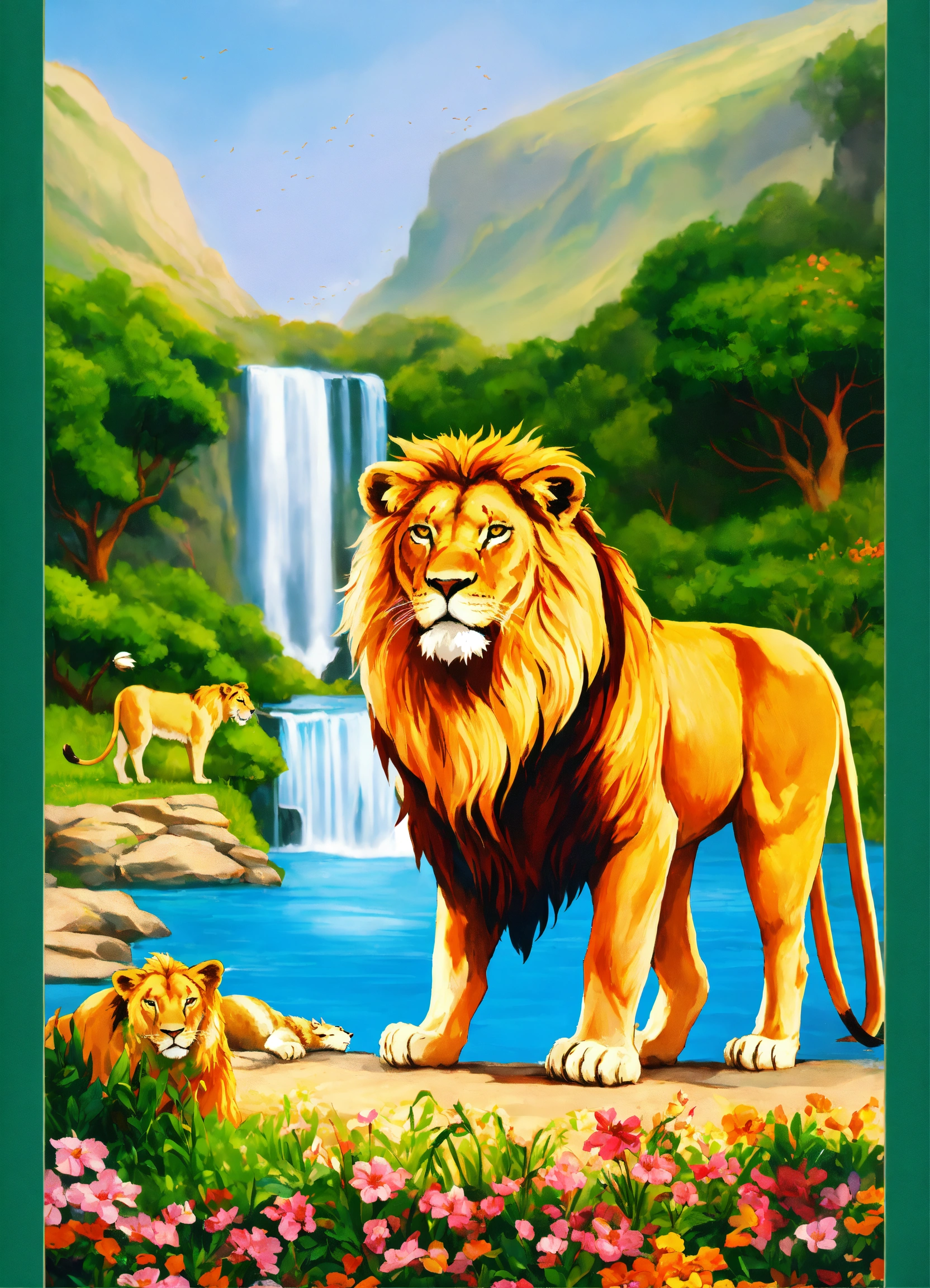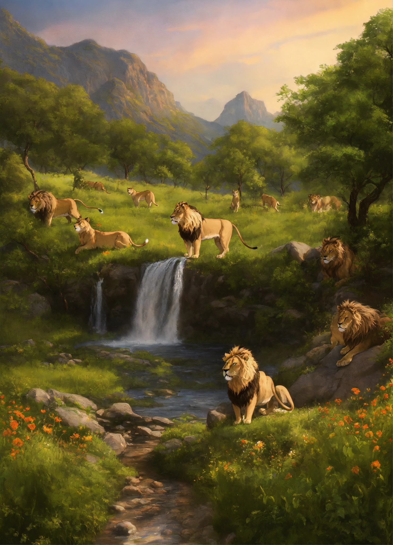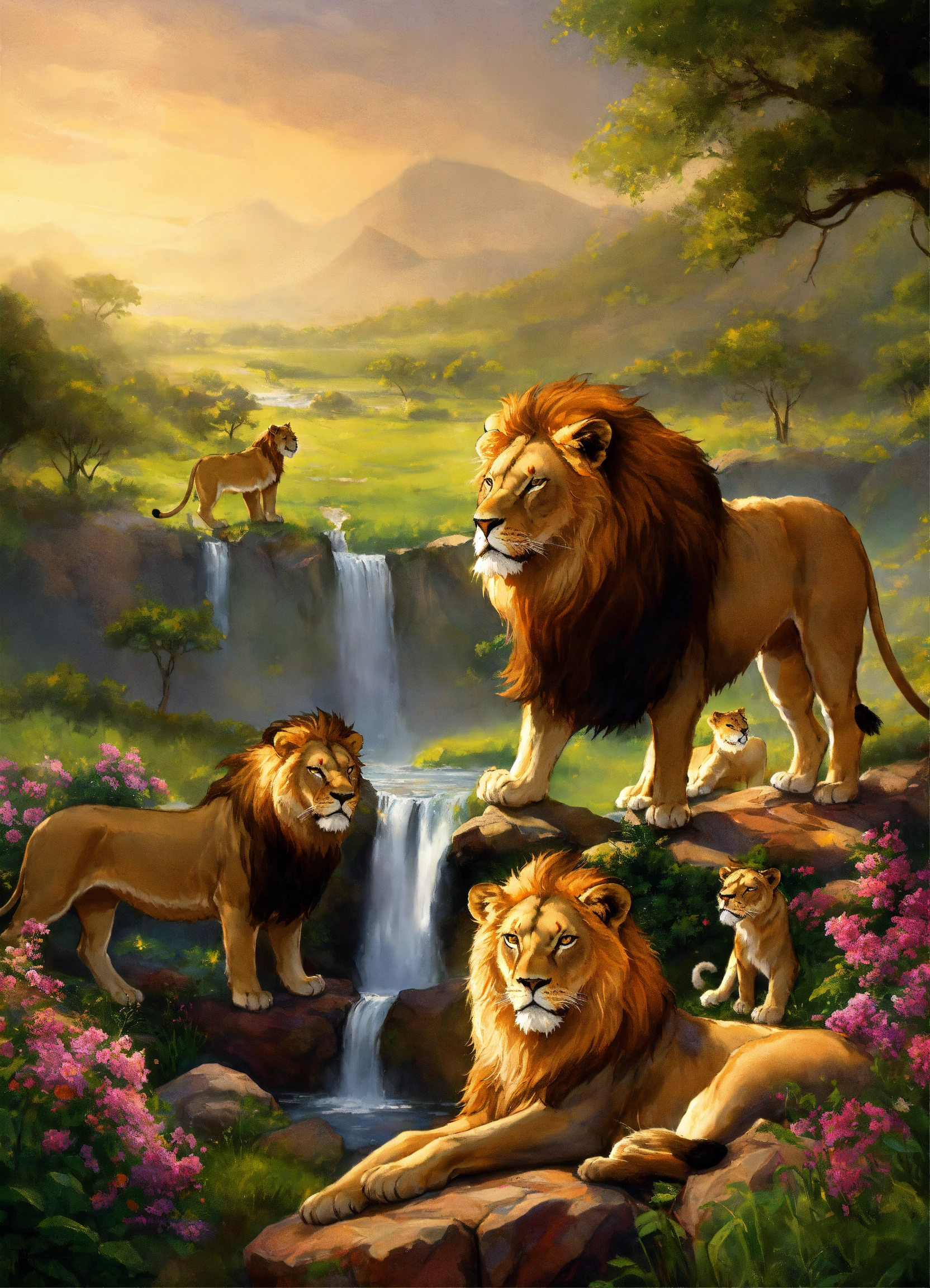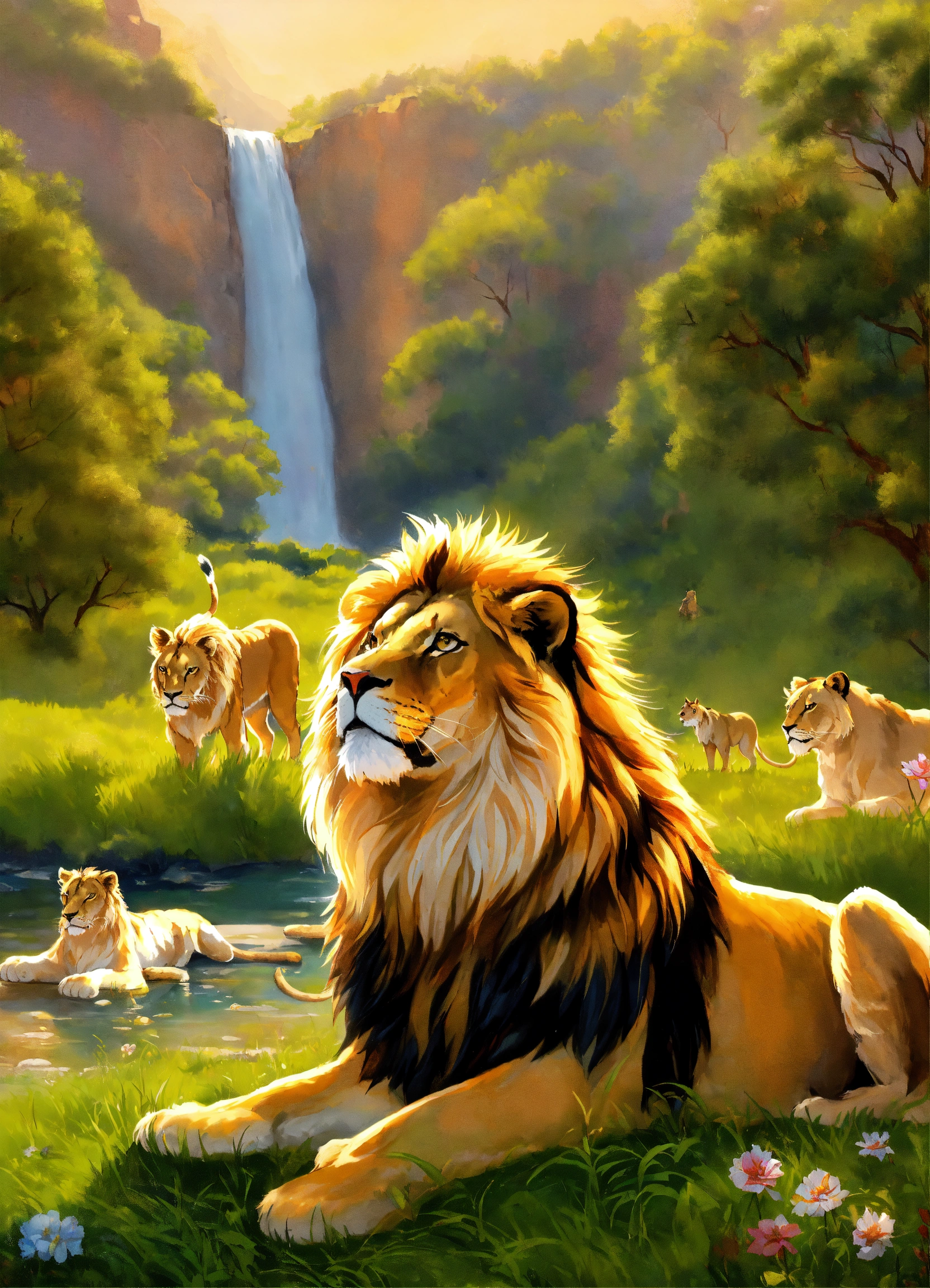 You stand at the edge of a blooming meadow, facing a waterfall framed by a serene landscape. in front of you, a group of lions is gathered, some leisurely lounging while others engage in various activities. one lion stands out before your gaze, positioned on a lower step, pacing back and forth with a majestic presence, its powerful roars echoing through the tranquil surroundings.