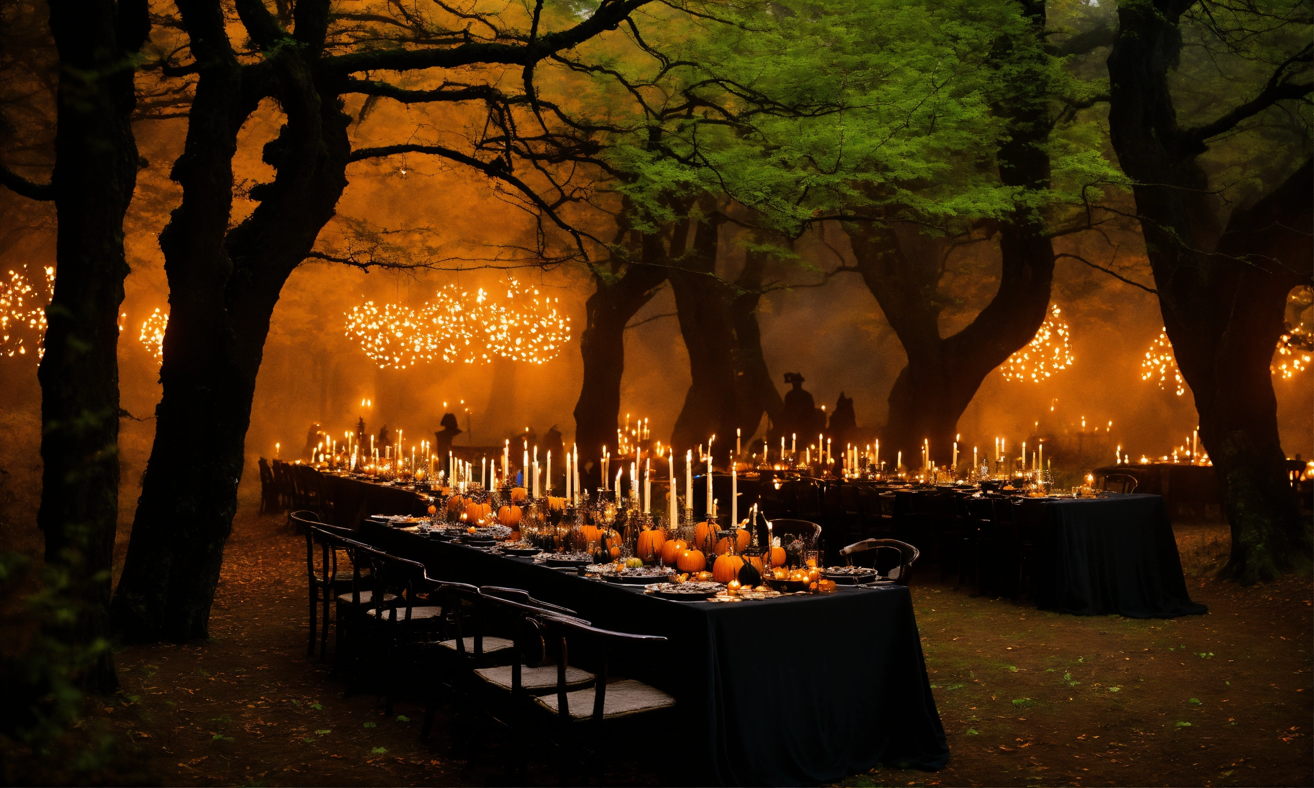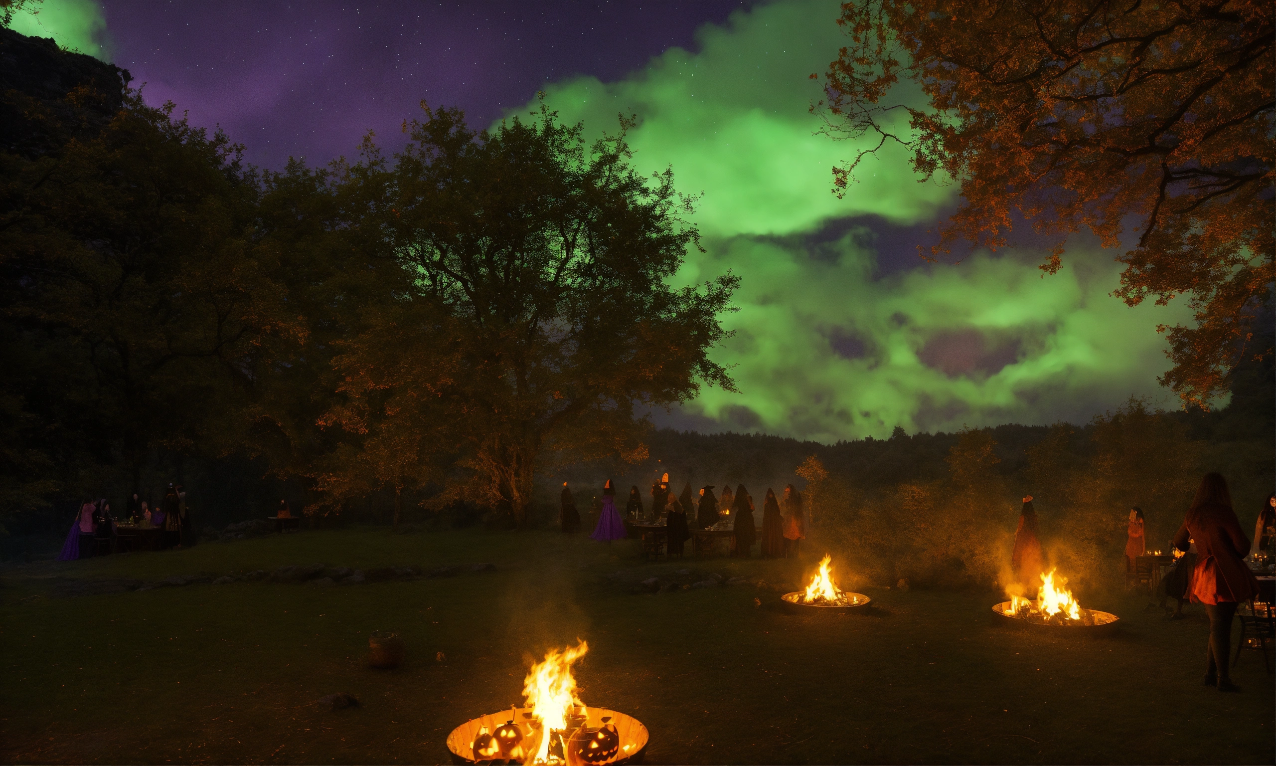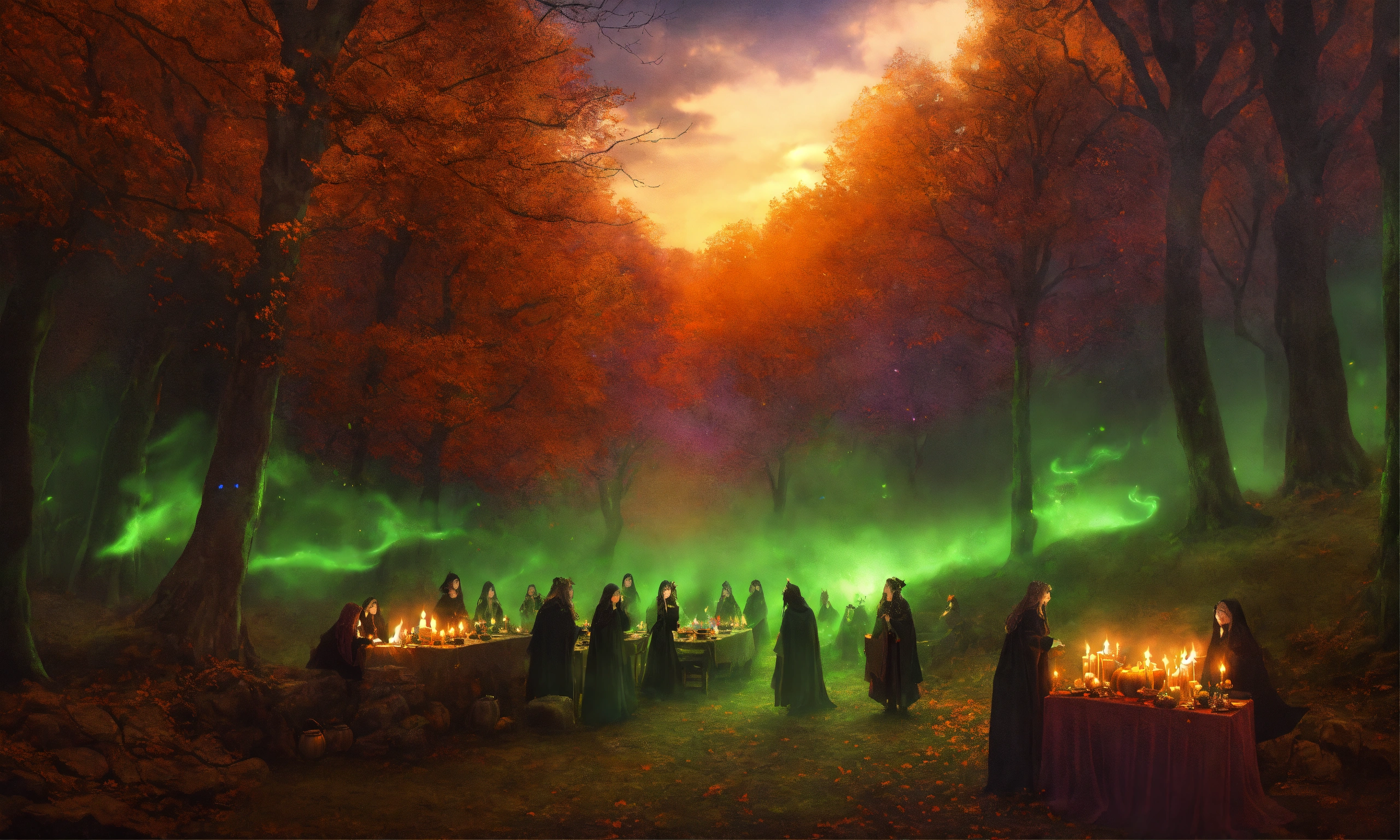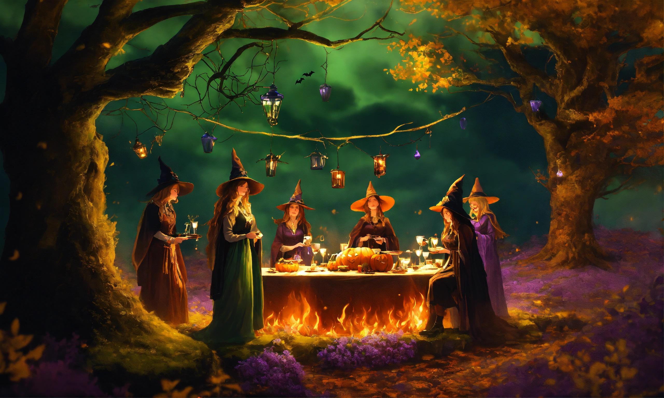 In a secluded glen, surrounded by ancient, whispering trees, a coven of witches gathers for their annual halloween feast. a long table, draped in black velvet, is laden with dishes that shimmer in hues of green, purple, and orange. ethereal flames dance above cauldrons brewing mysterious concoctions. as the witches raise their goblets in a toast, the sky above them swirls with ghostly apparitions, joining in their celebration.