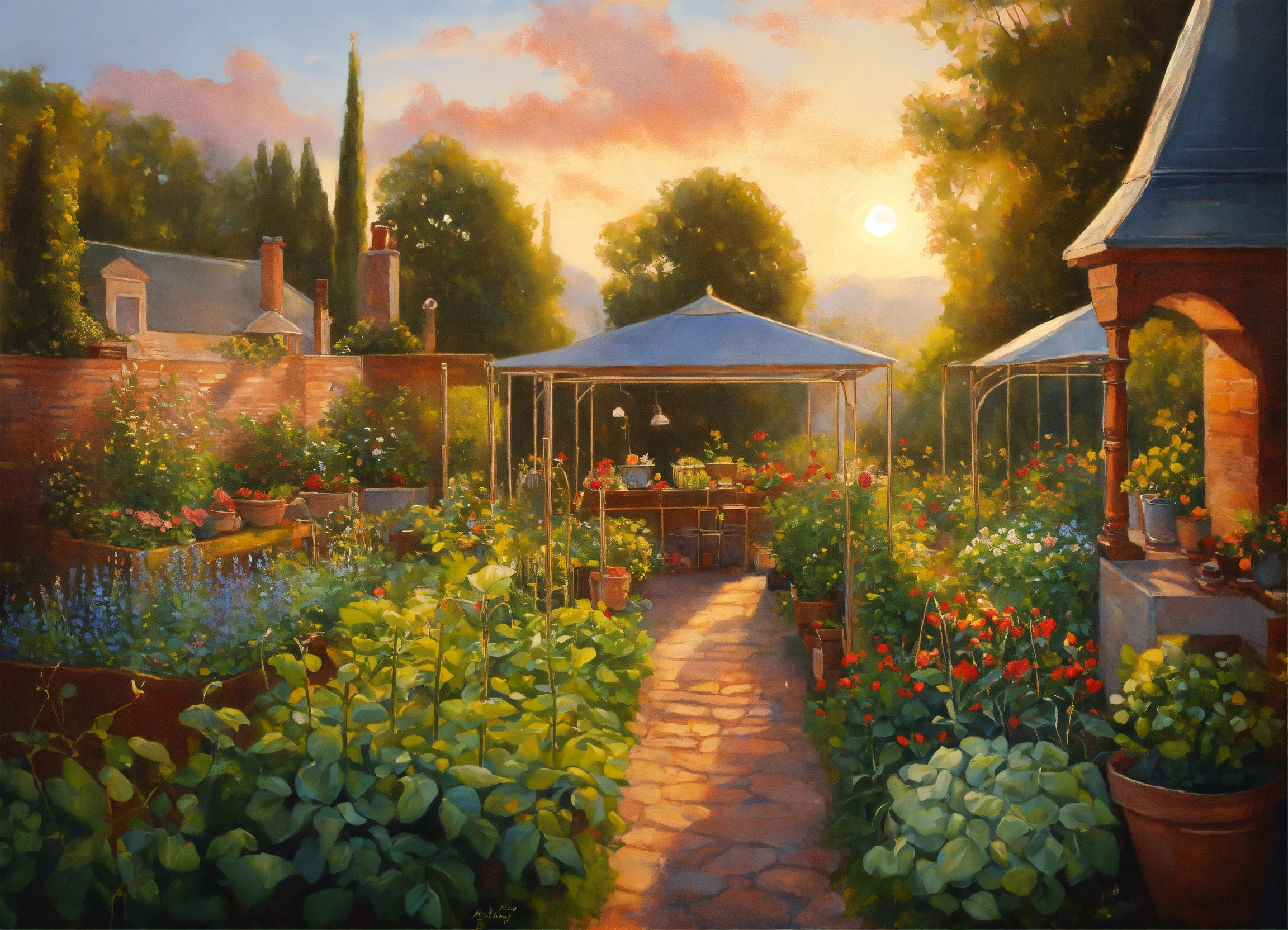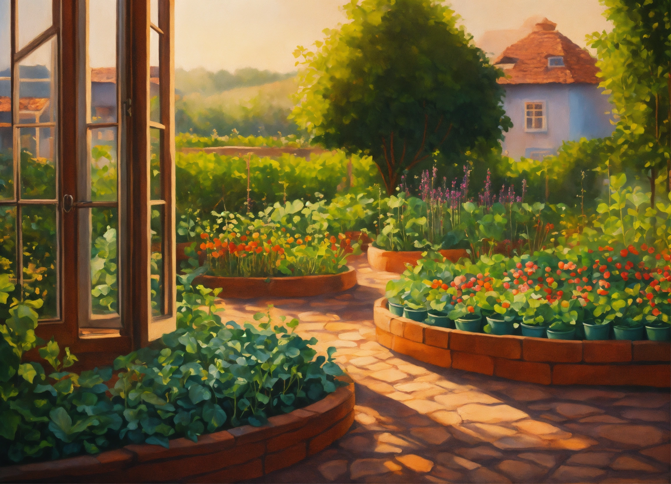 Acrilic painting, beautiful kitchen garden, warm light, intricate and detailed, 8k, ultra-detailed, sharp focus