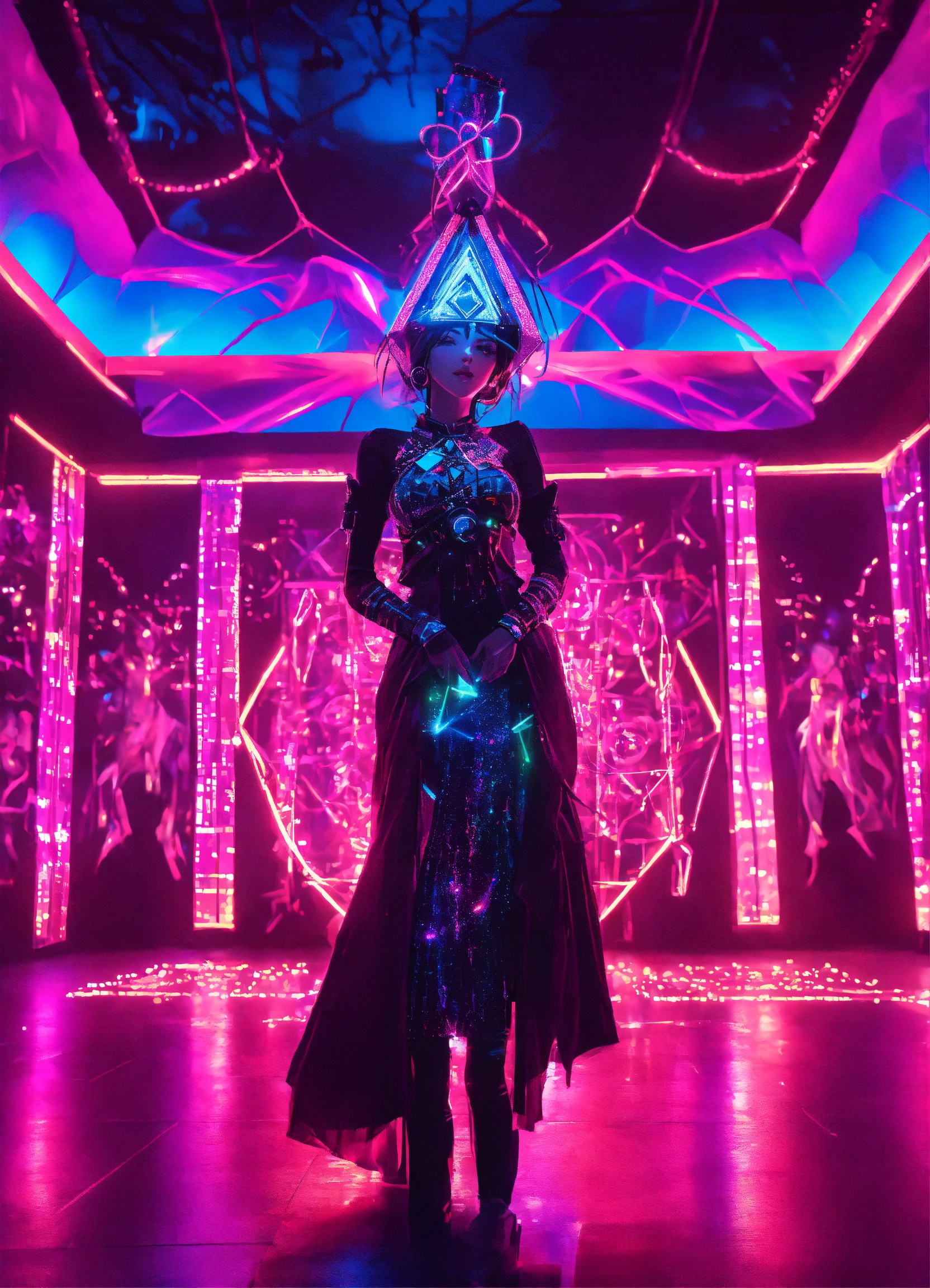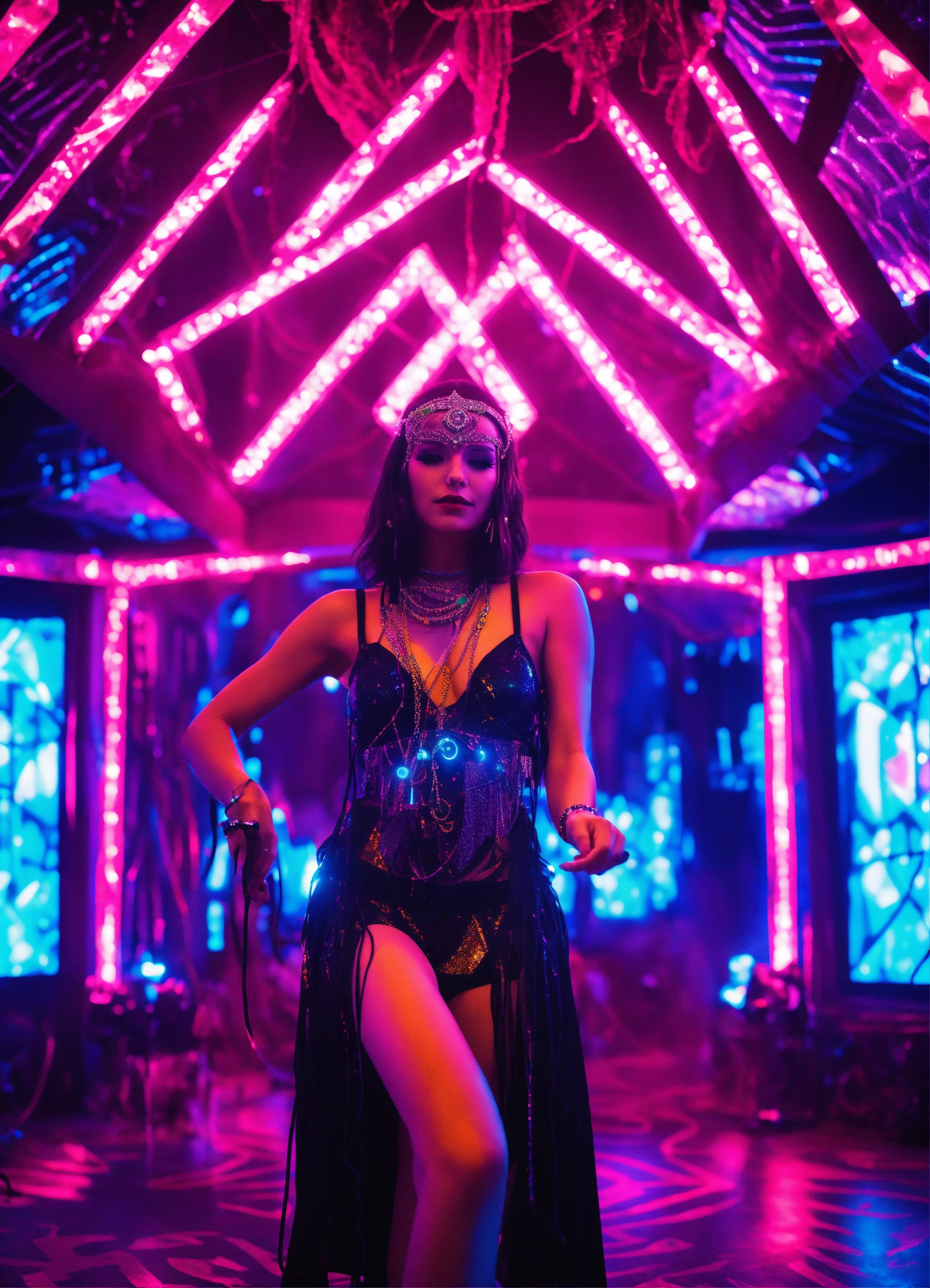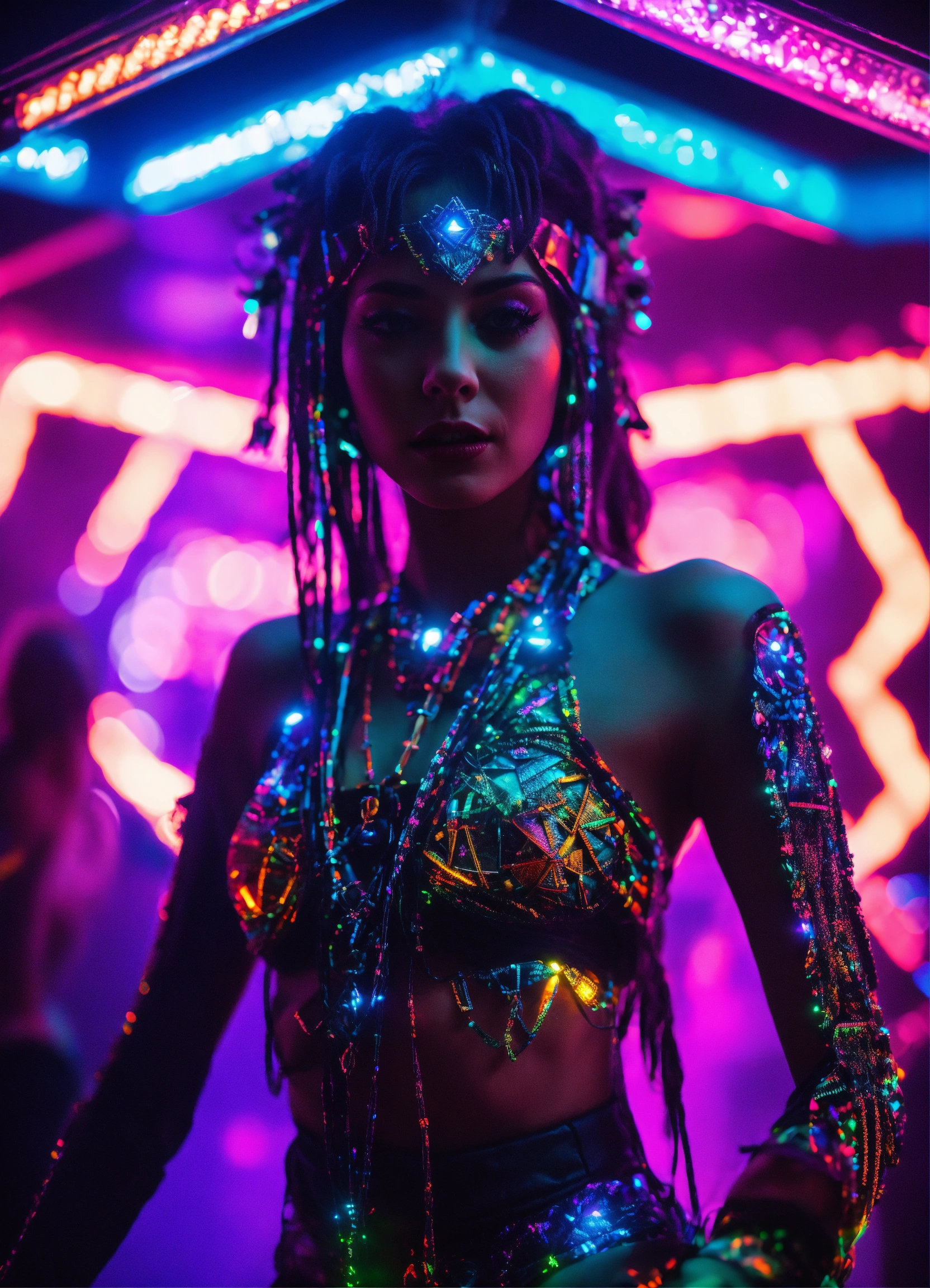 Cyber punk priestess raver dancing in diamond and shimmer black neon light with dmt light beings in a dmt room