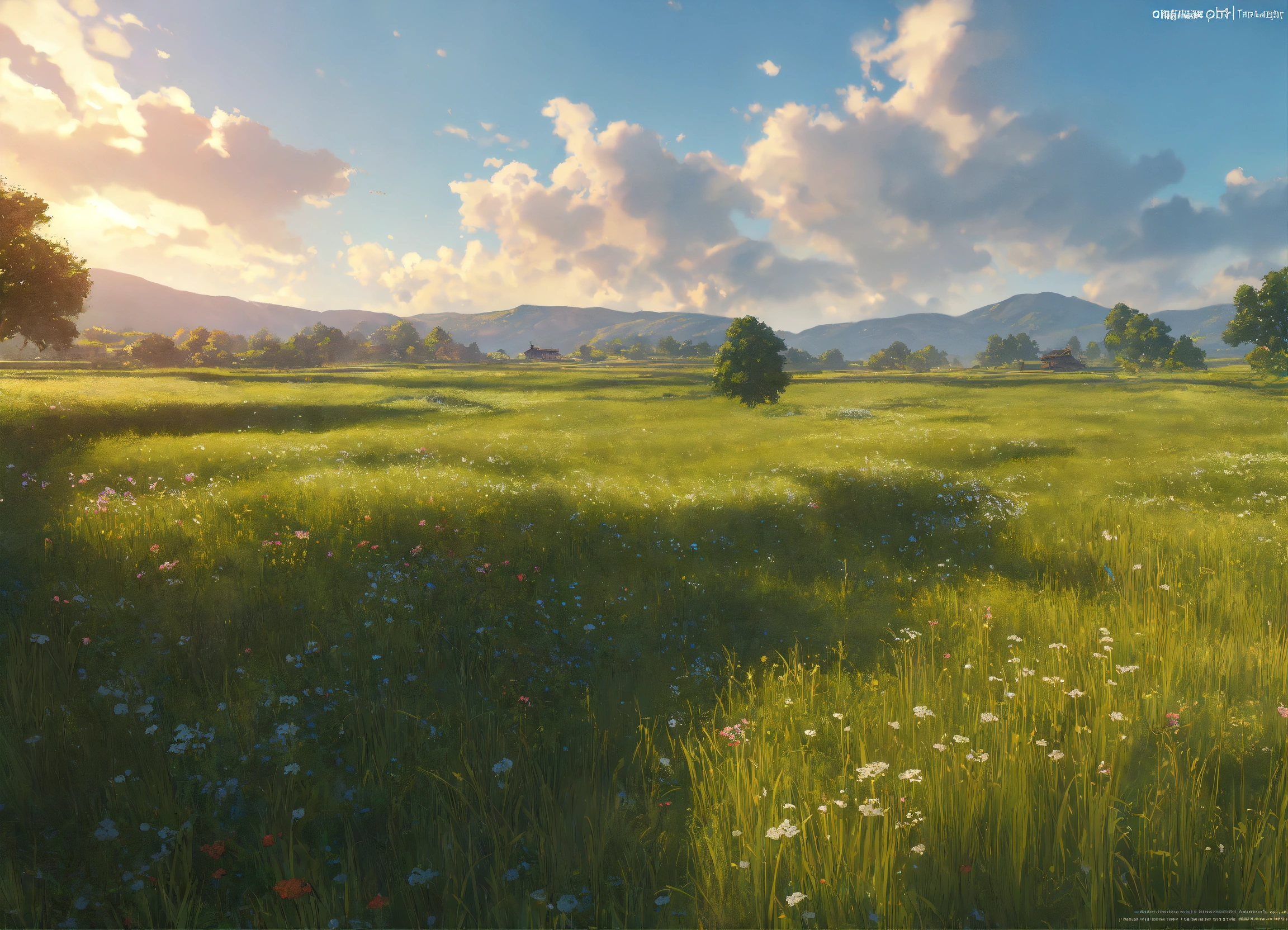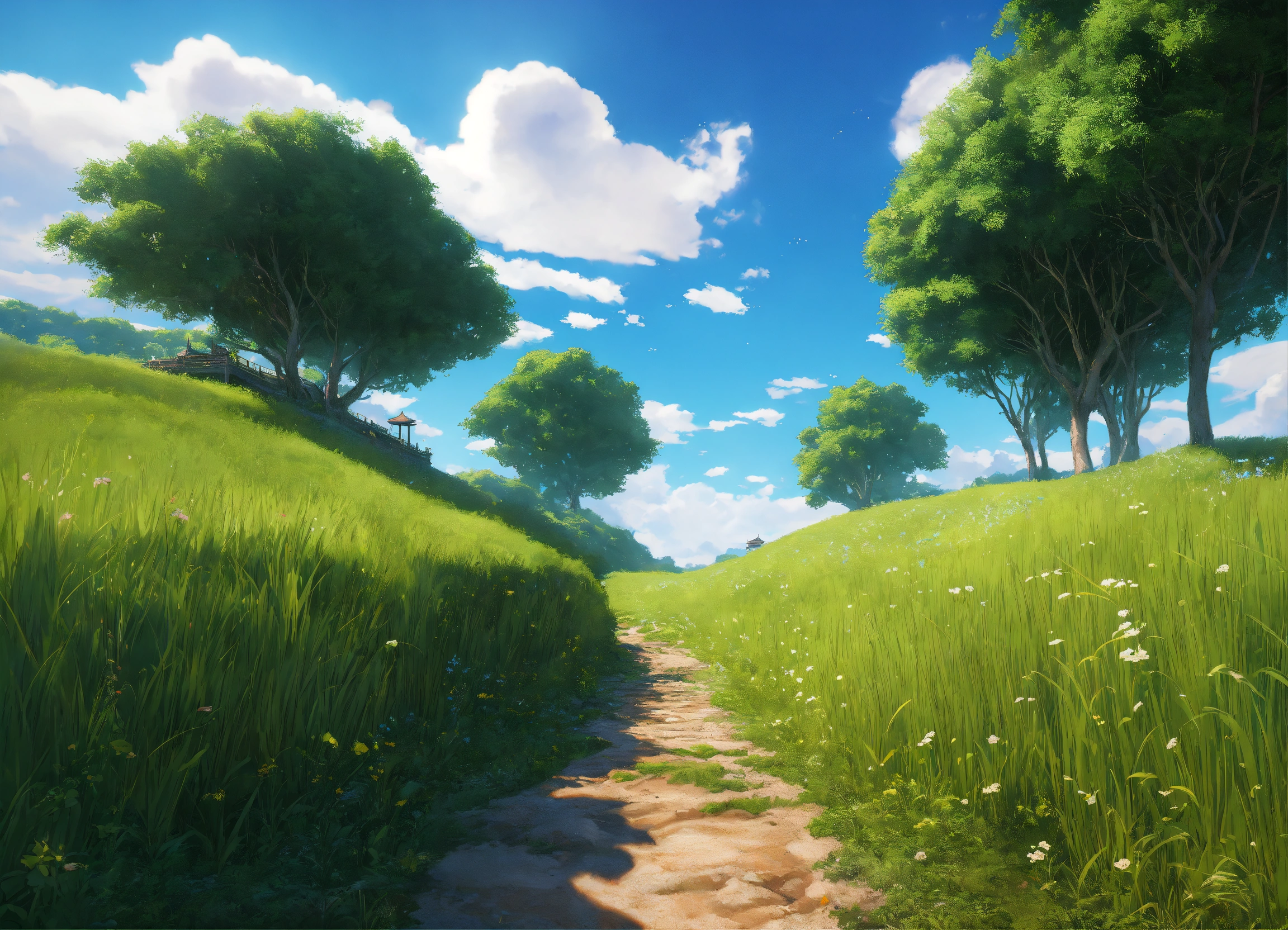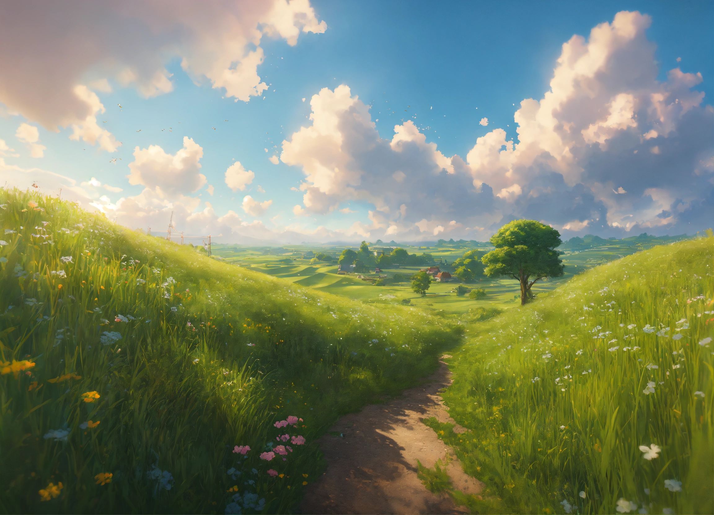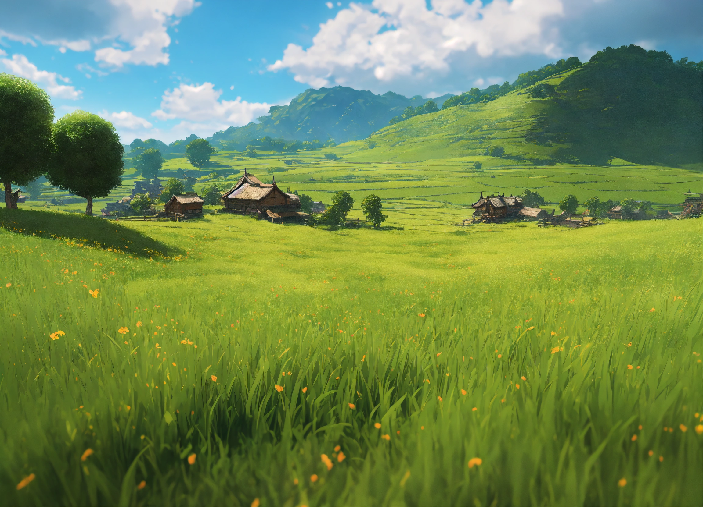 Open fields landscape, seamless texture of grass, blue skies and clouds. studio ghibli's unreal engine, 8k, octane render, trending on art station . highly detailed, digital painting, artstation, smooth, sharp focus, illustration, wide angle, wallpaper, splash art, art by artgerm and greg rutkowski and bo chen and jin xiaodi