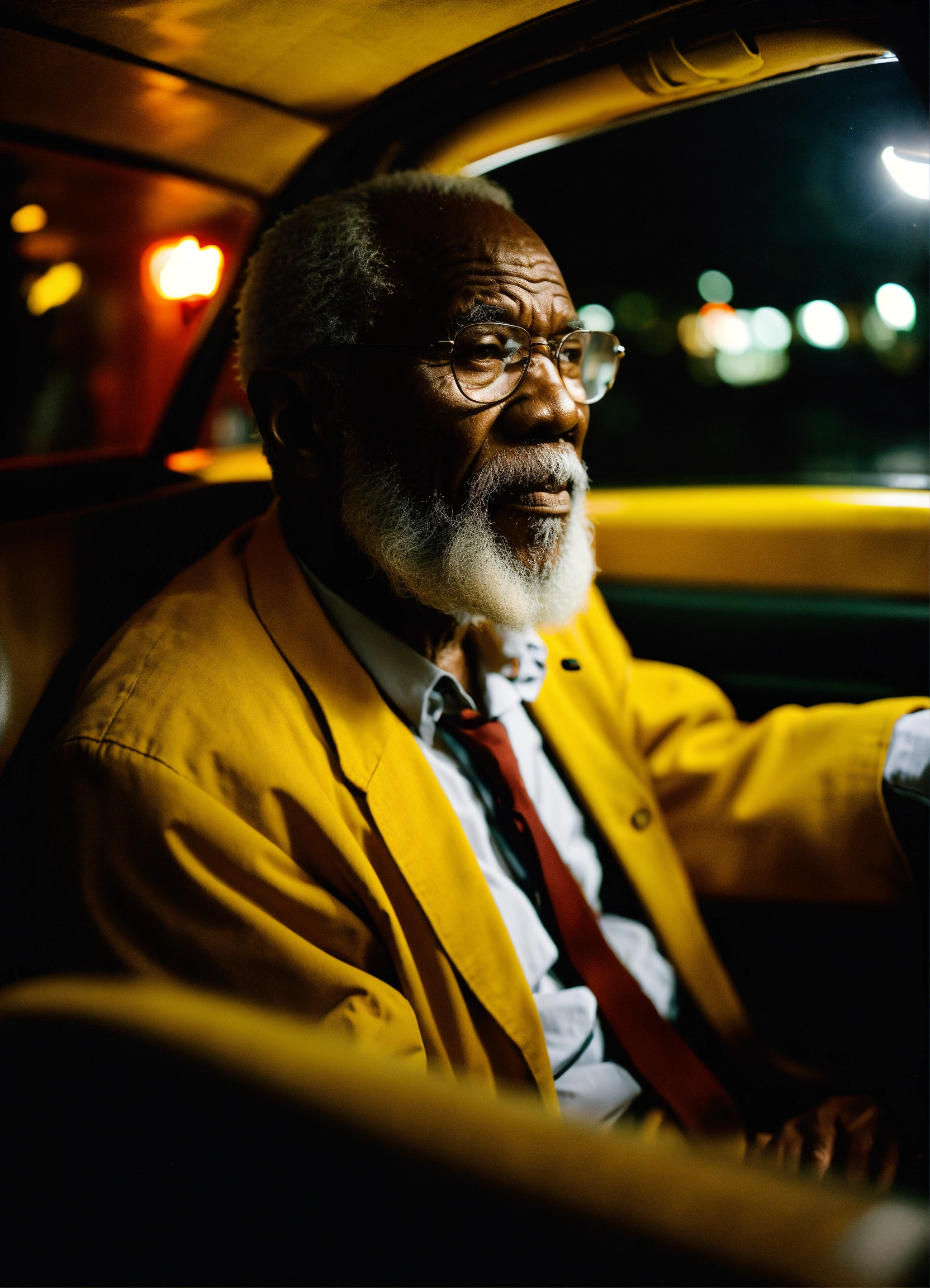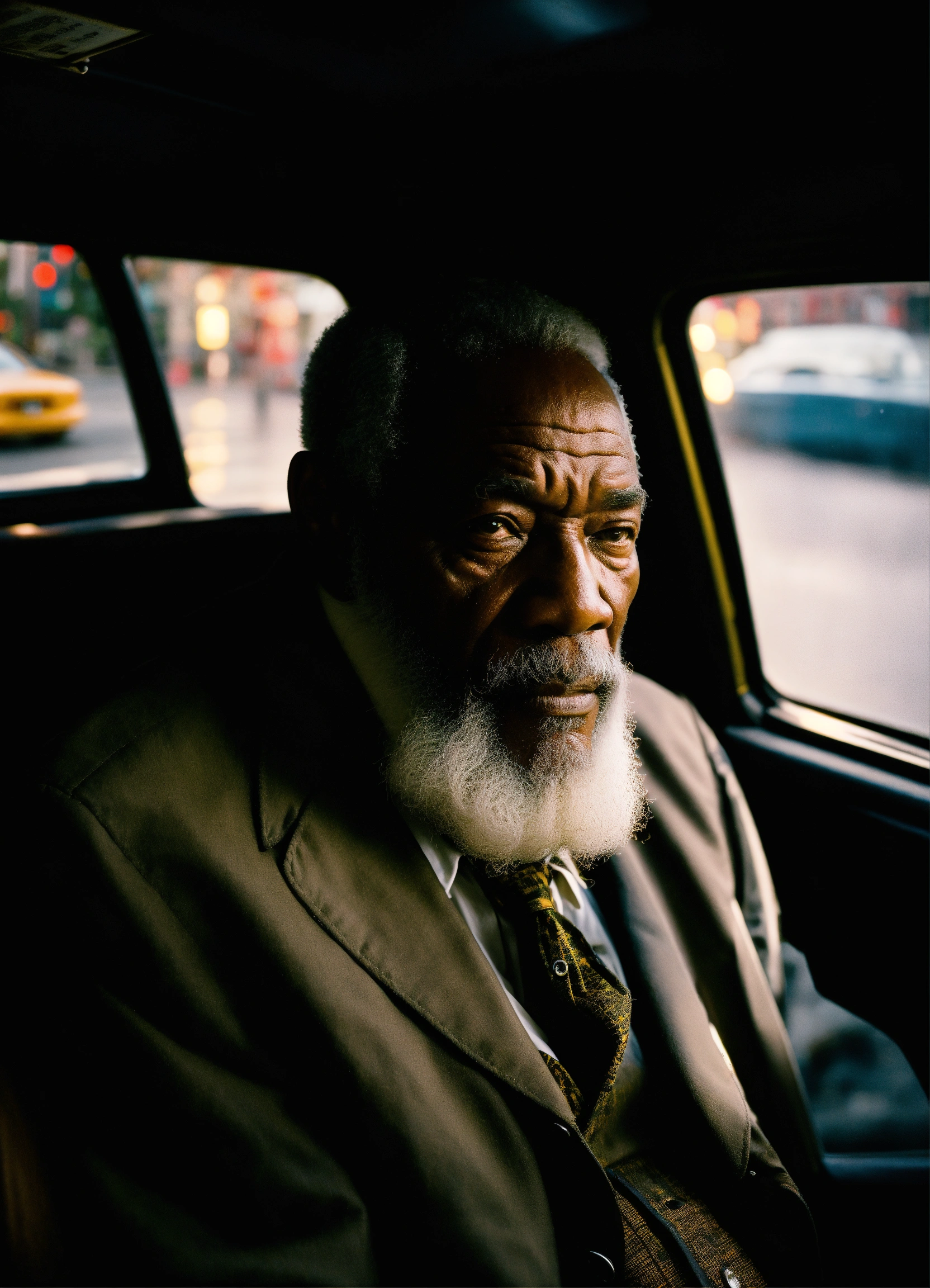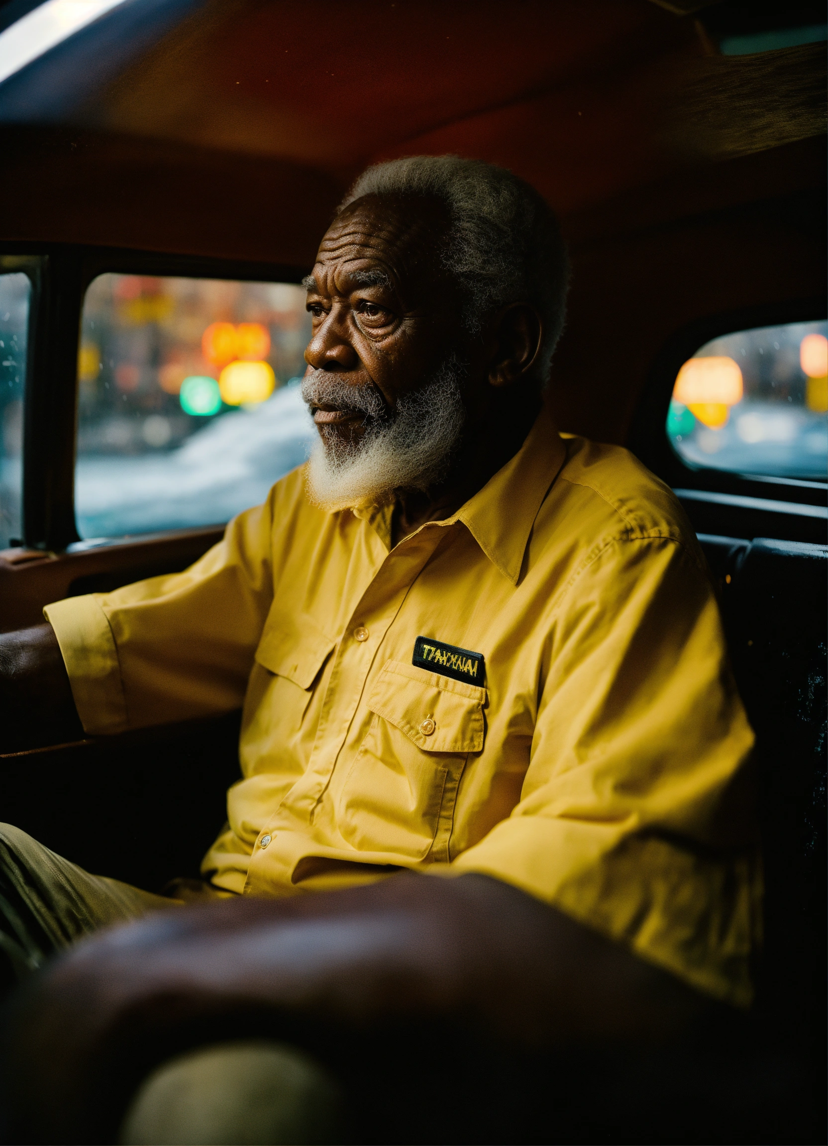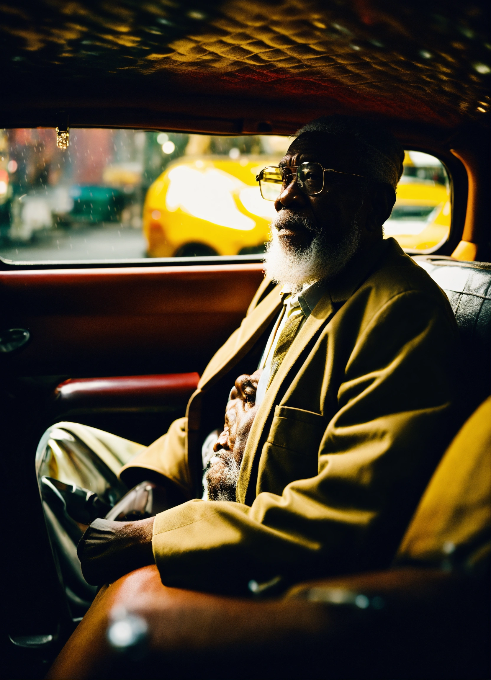 An old jamaican man with white beard driving in a taxi cab in nyc, thunderstorm, sitting on a straw chair, shot on hasselblad, shadowplay