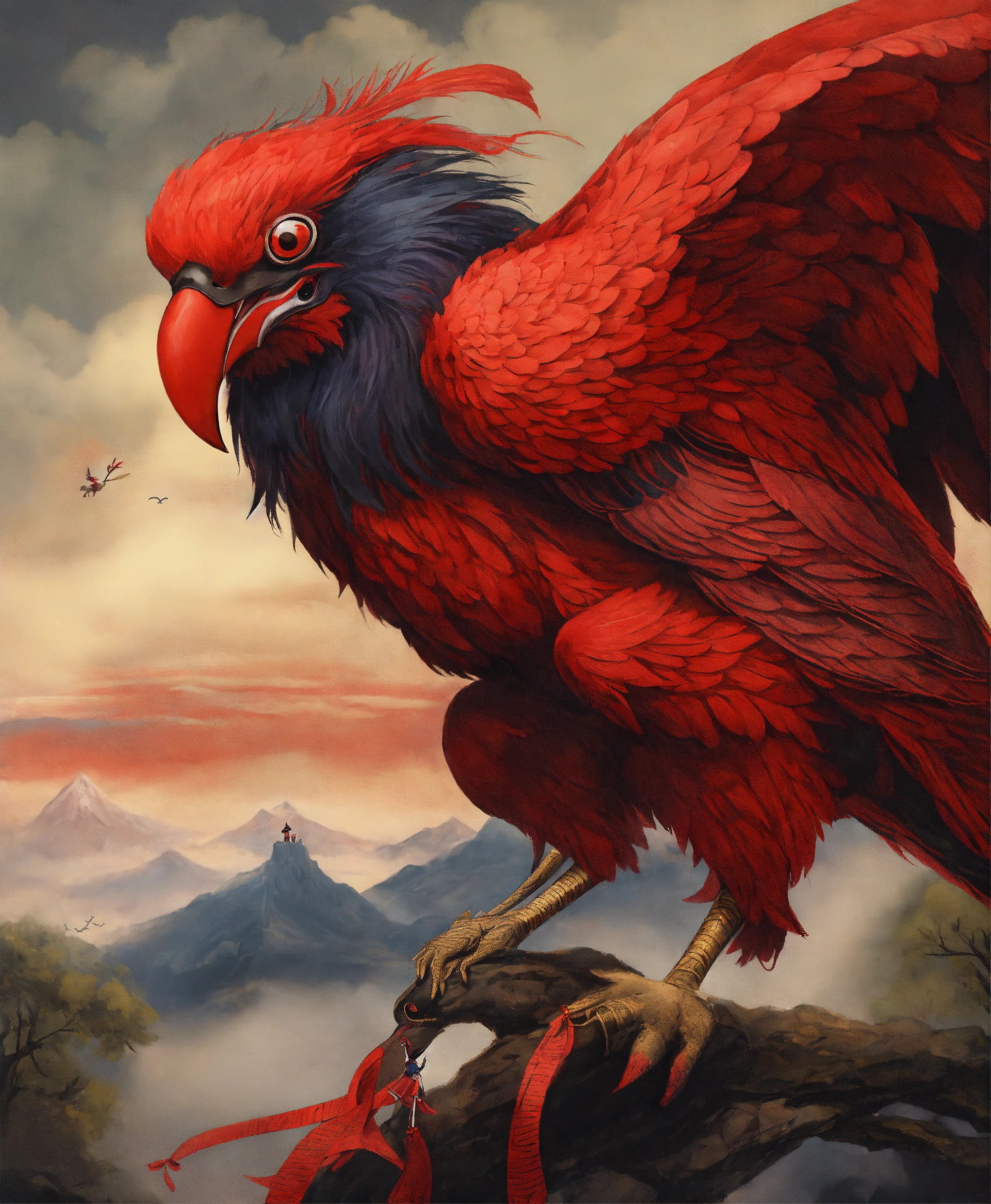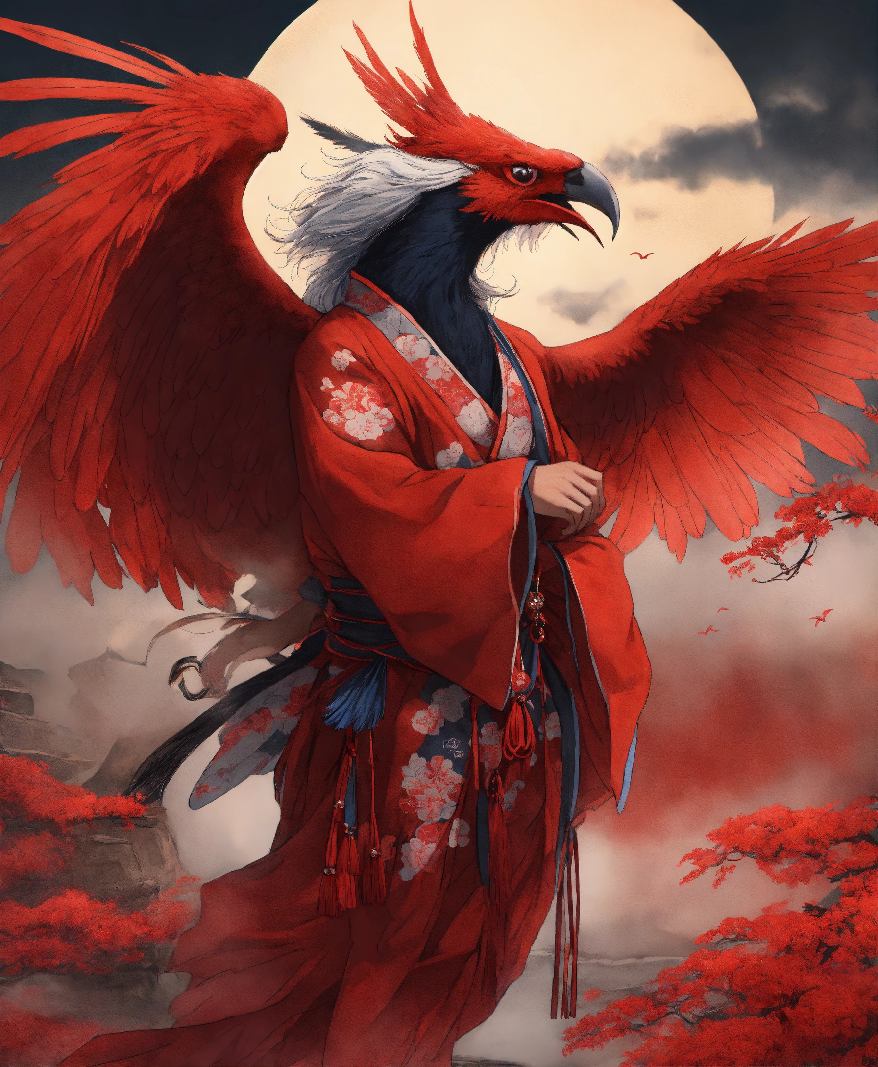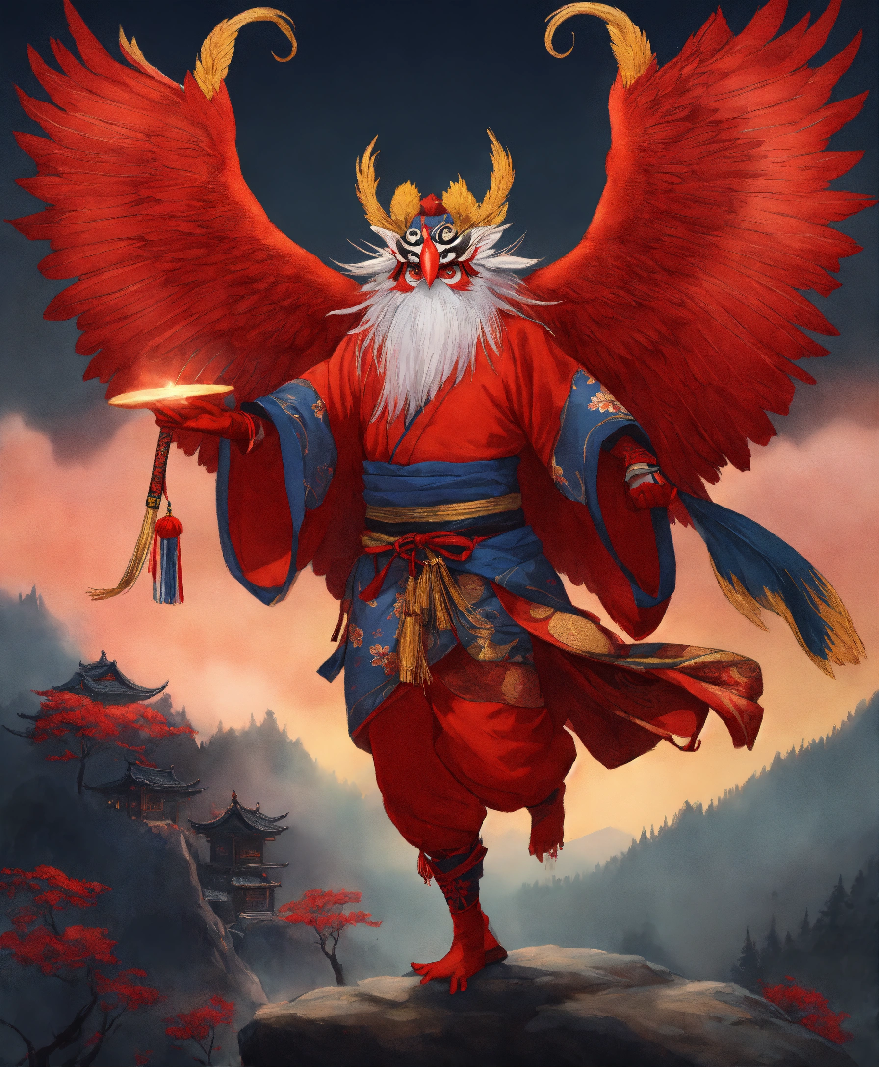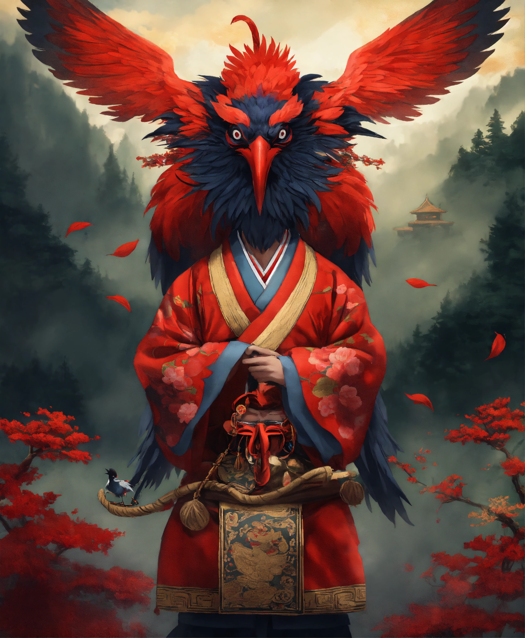 Tengu yokai mystérieux étrange les tengu sont des gobelins au visage rouge écarlate, avec un long nez très typique. le tengu serait une créature mi-homme, mi-oiseau. il possède une paire d'ailes dans le dos et trés long nez visage d'homme et corps d'homme se trouvant dans une montagne ambiance mystérieux