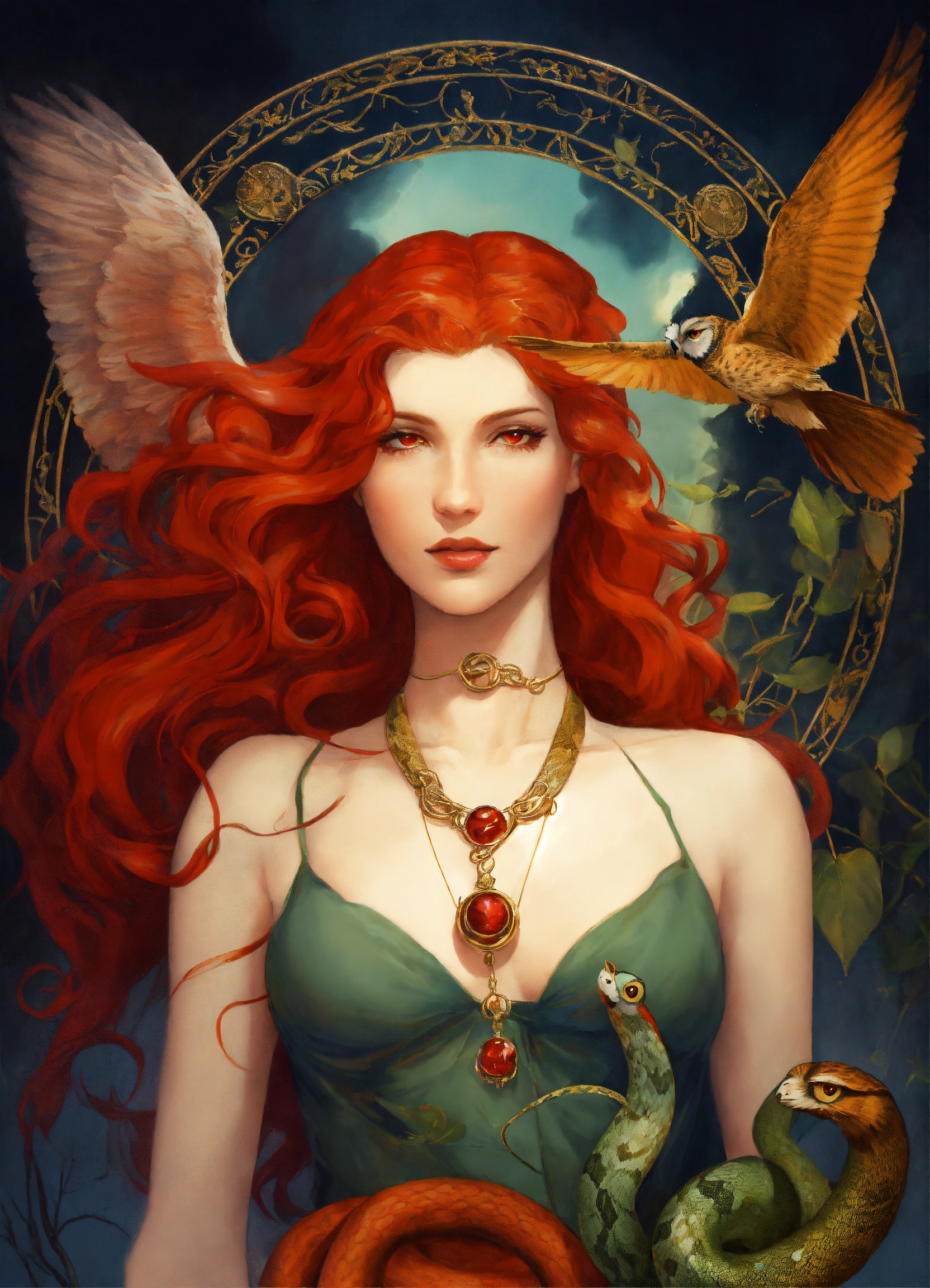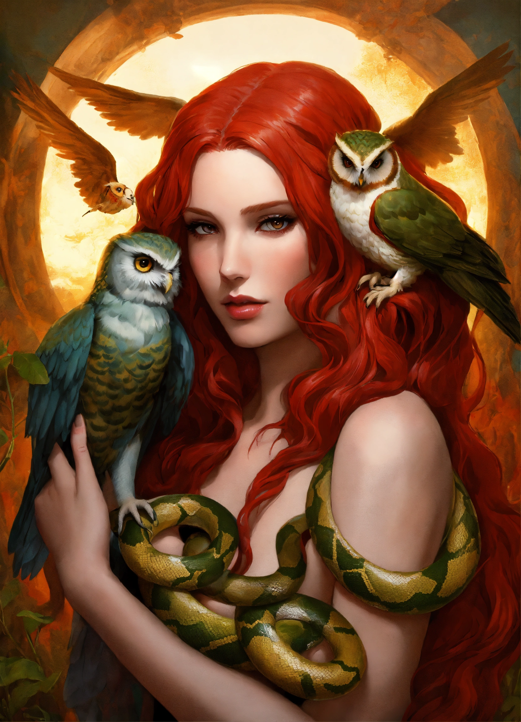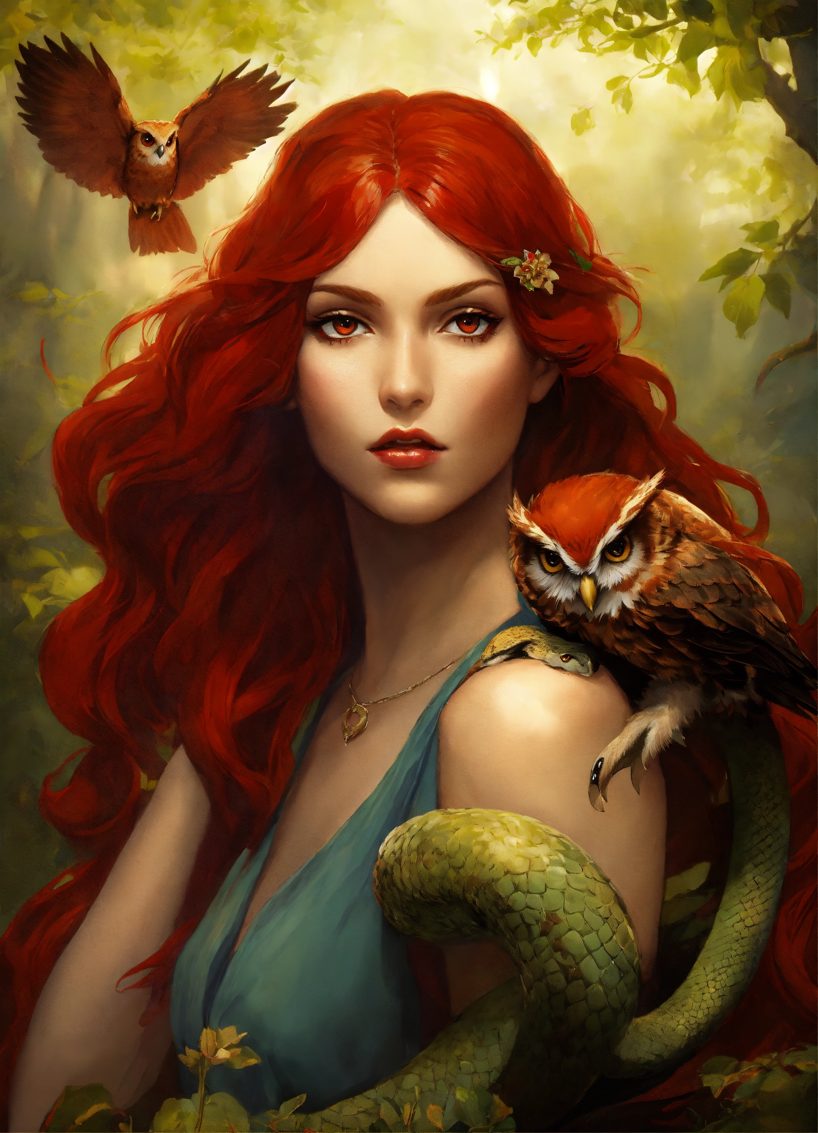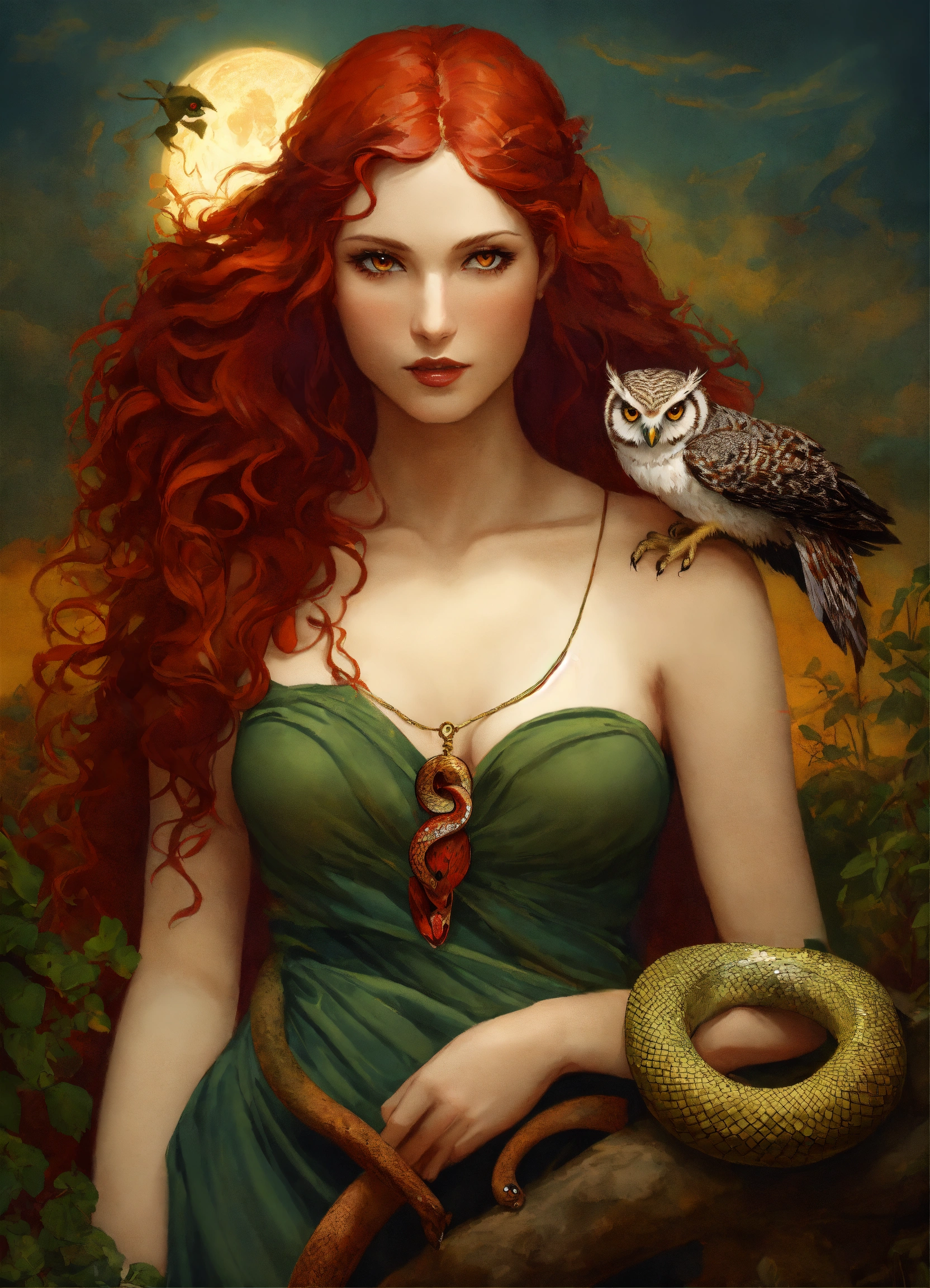 Lilith goddess of seduction with red hair with an owl on her shoulder and a snake