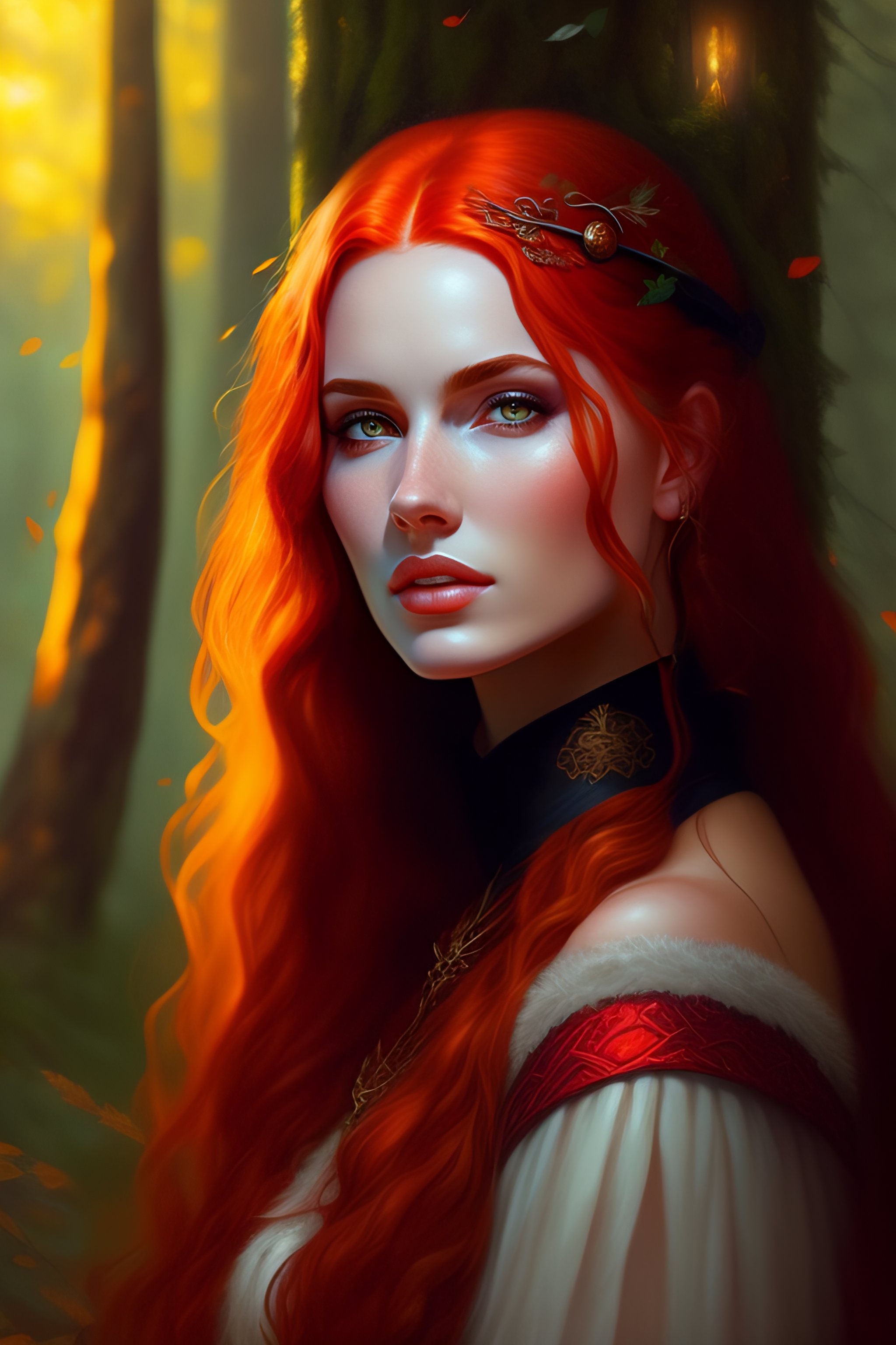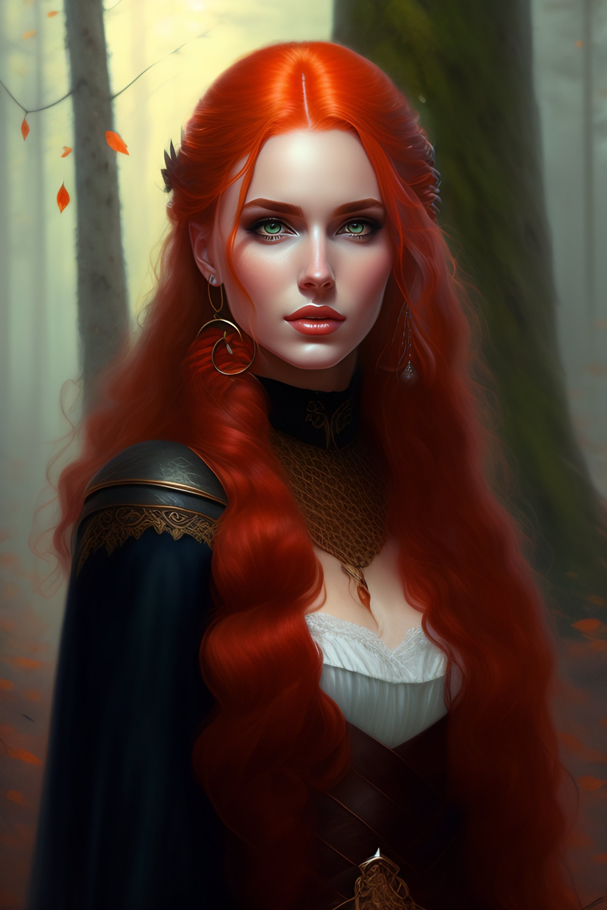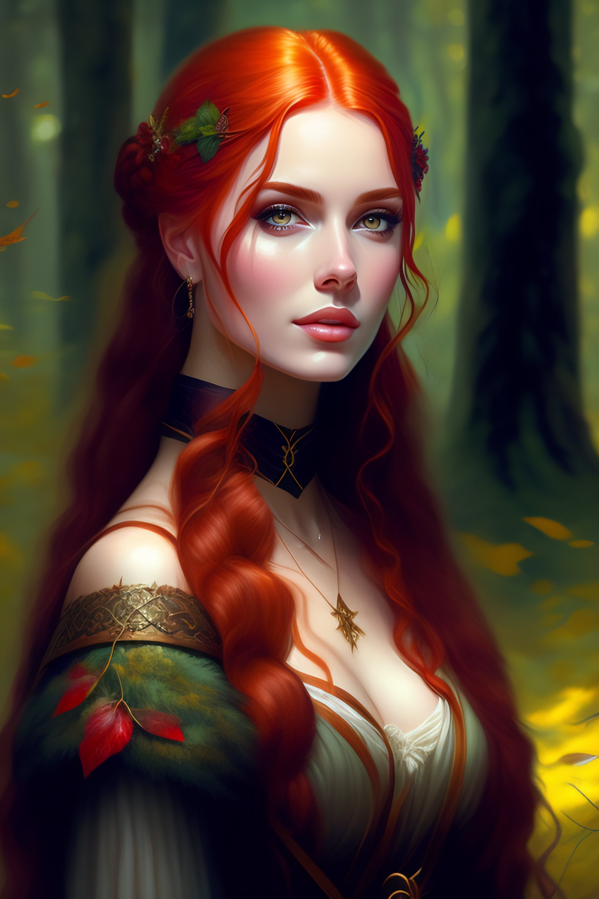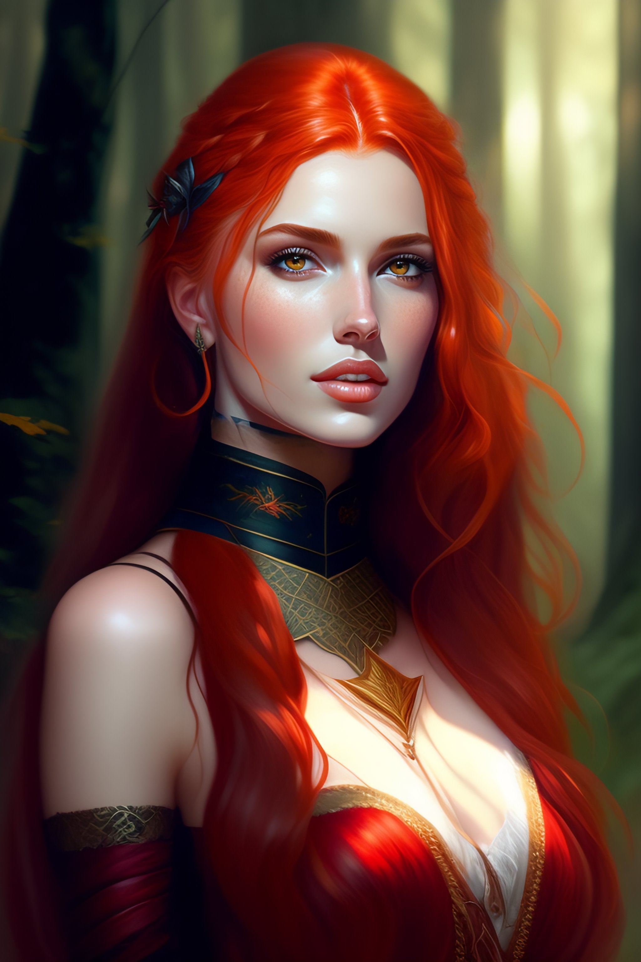 Realistic detailed waist portrait of a beautiful red hair girl, choker, dark medieval clothes, in the dark forest by greg rutkowski, in the style of wlop, stanley artgerm, very coherent