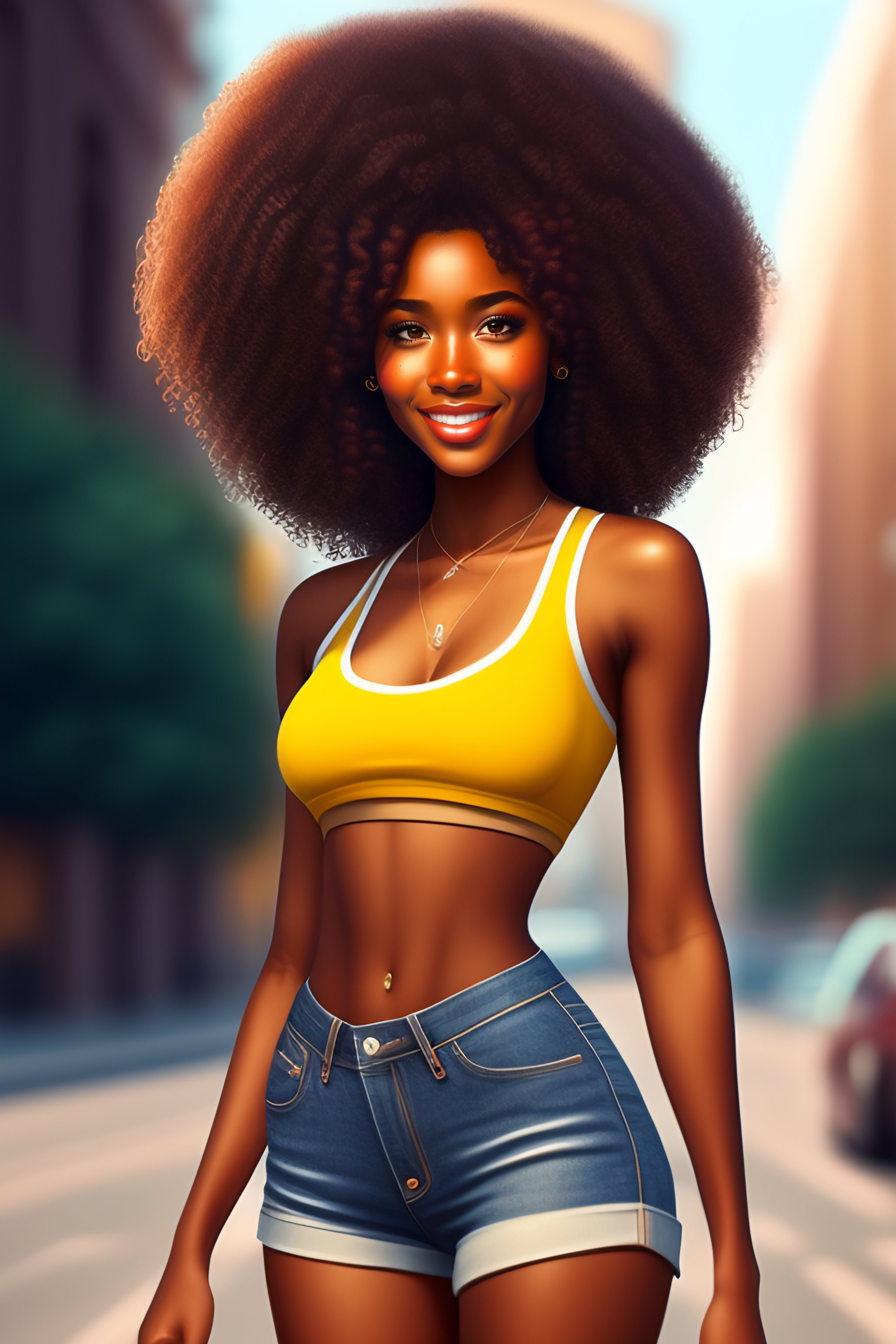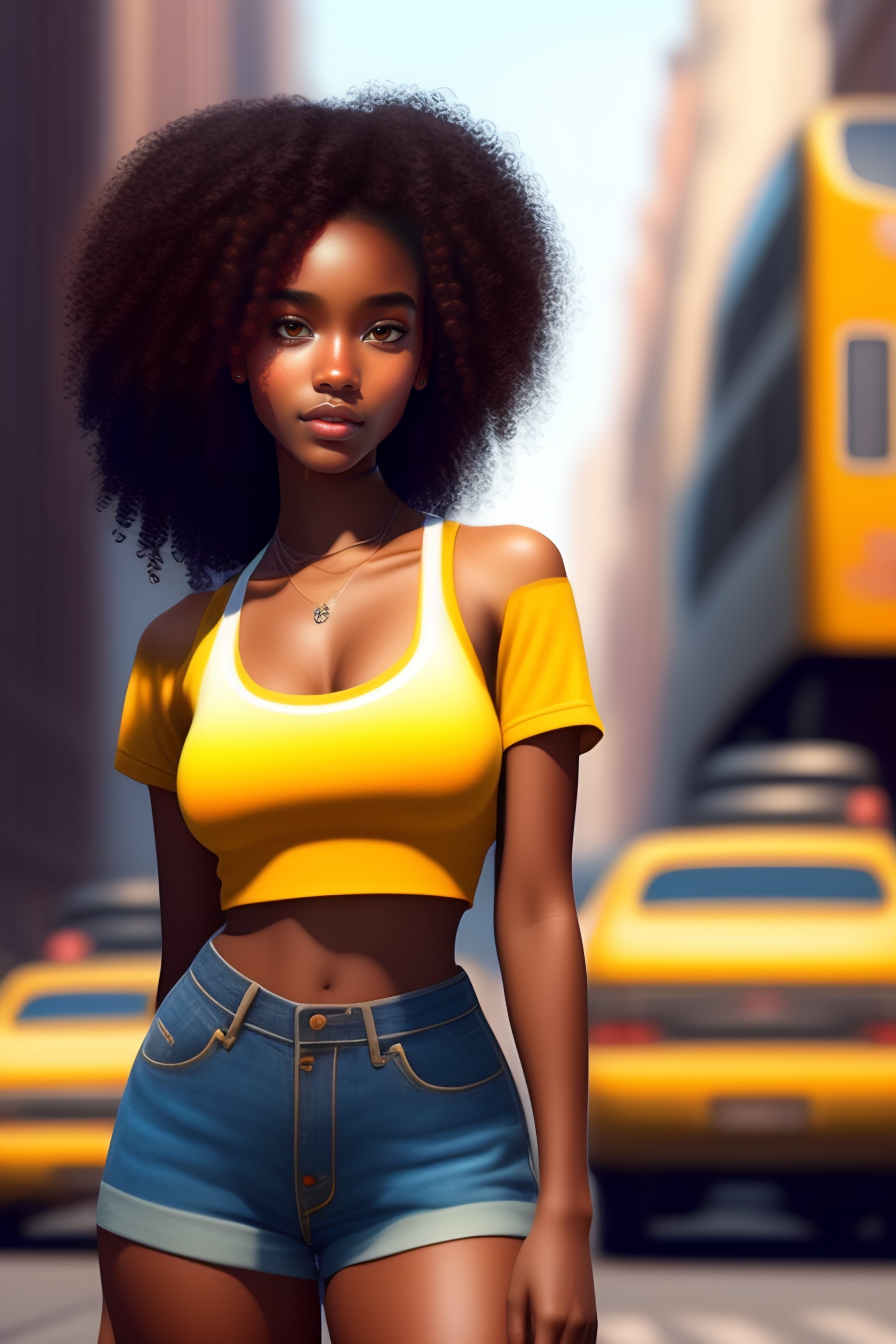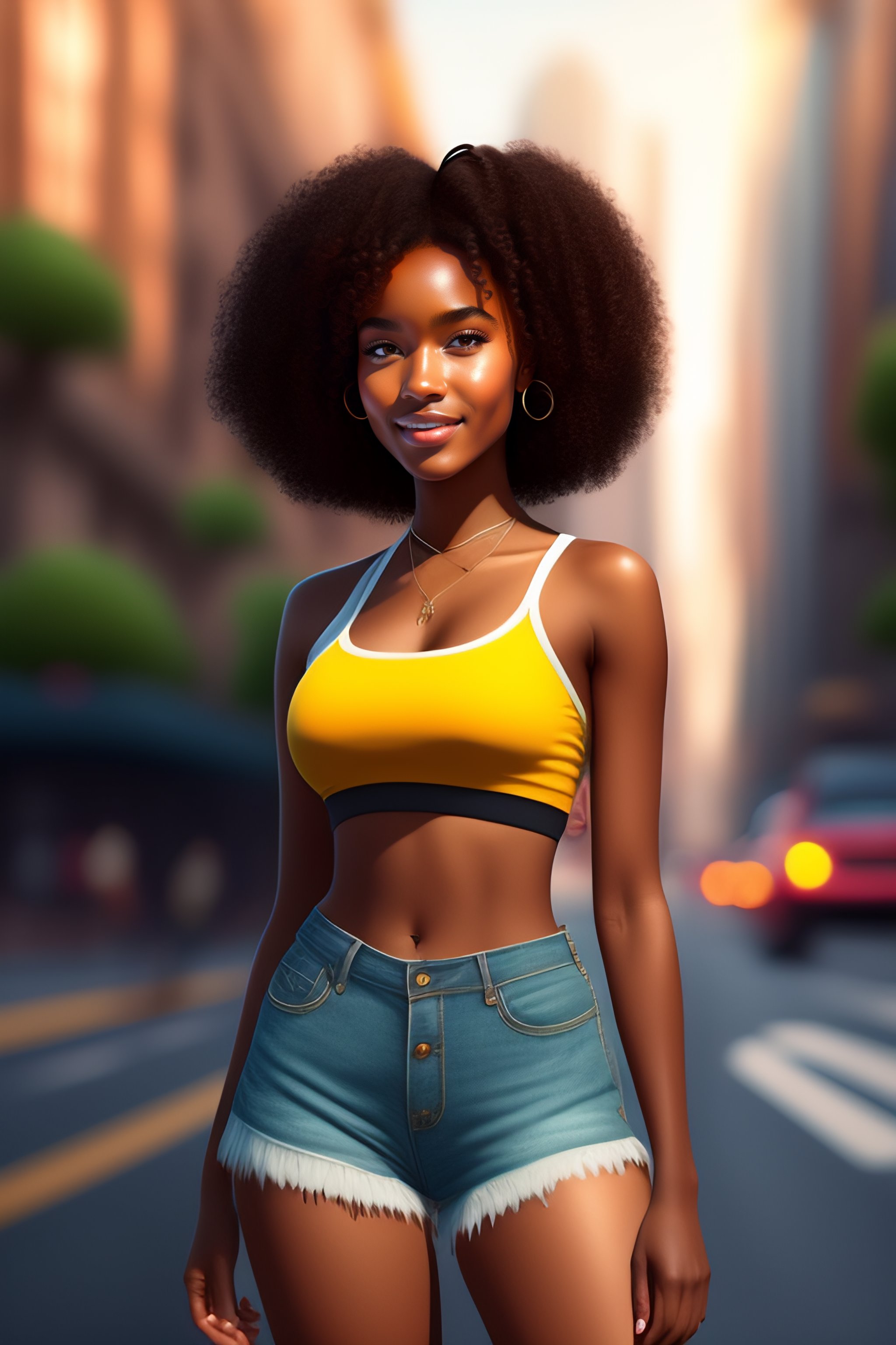 Pixar style, cute girl, 19 years old, darker skin, big medium curly brown hair, skinny, flat belly visible, slim waist, thick, medium bust, crop top, short shorts, on streets in big city