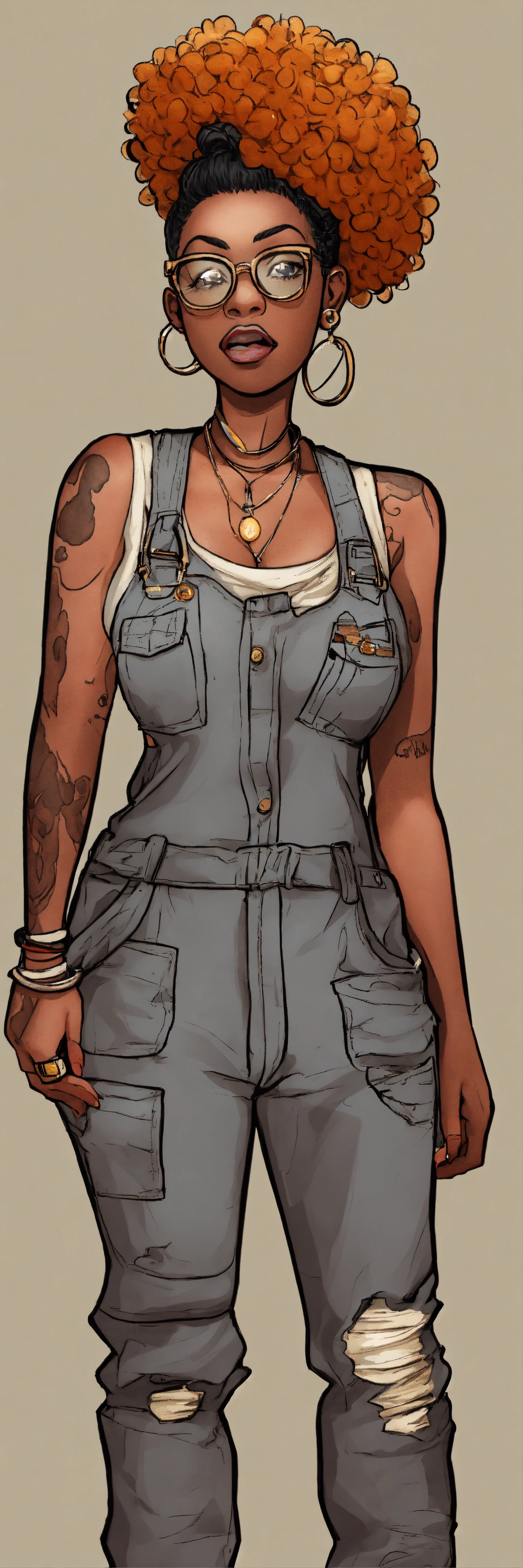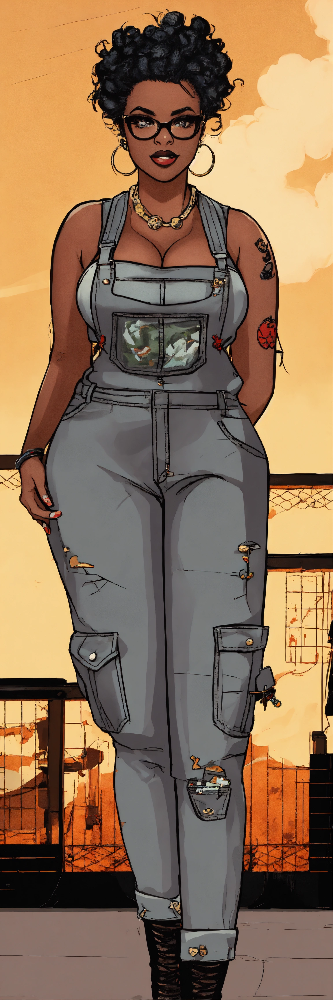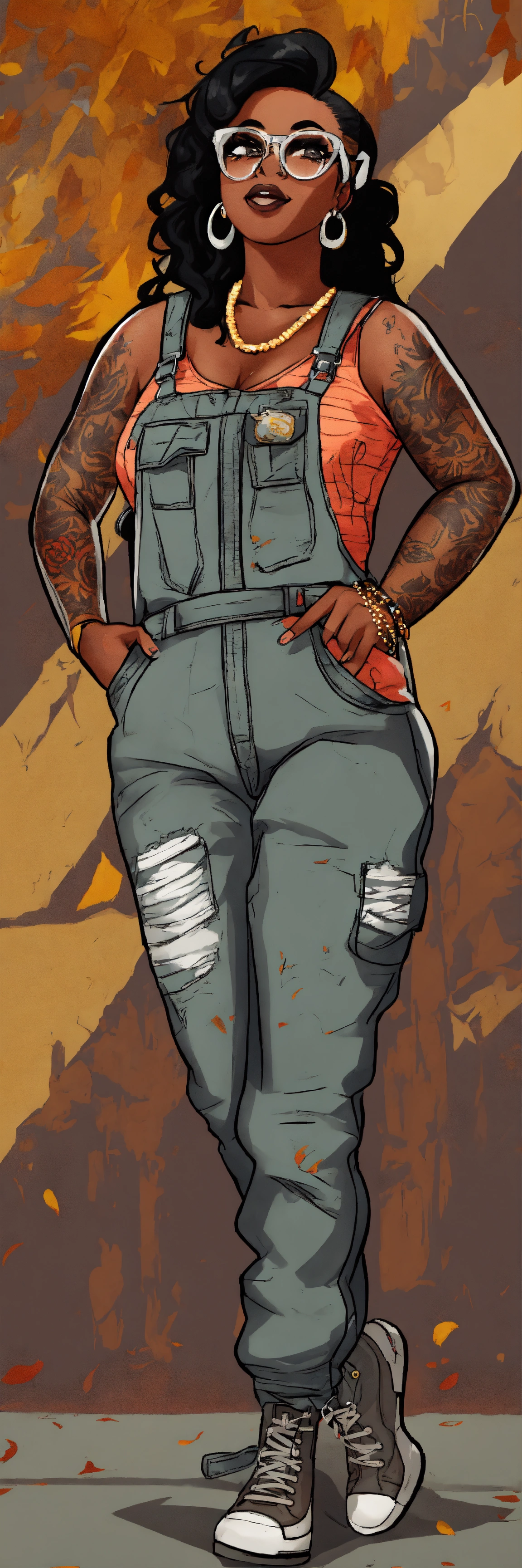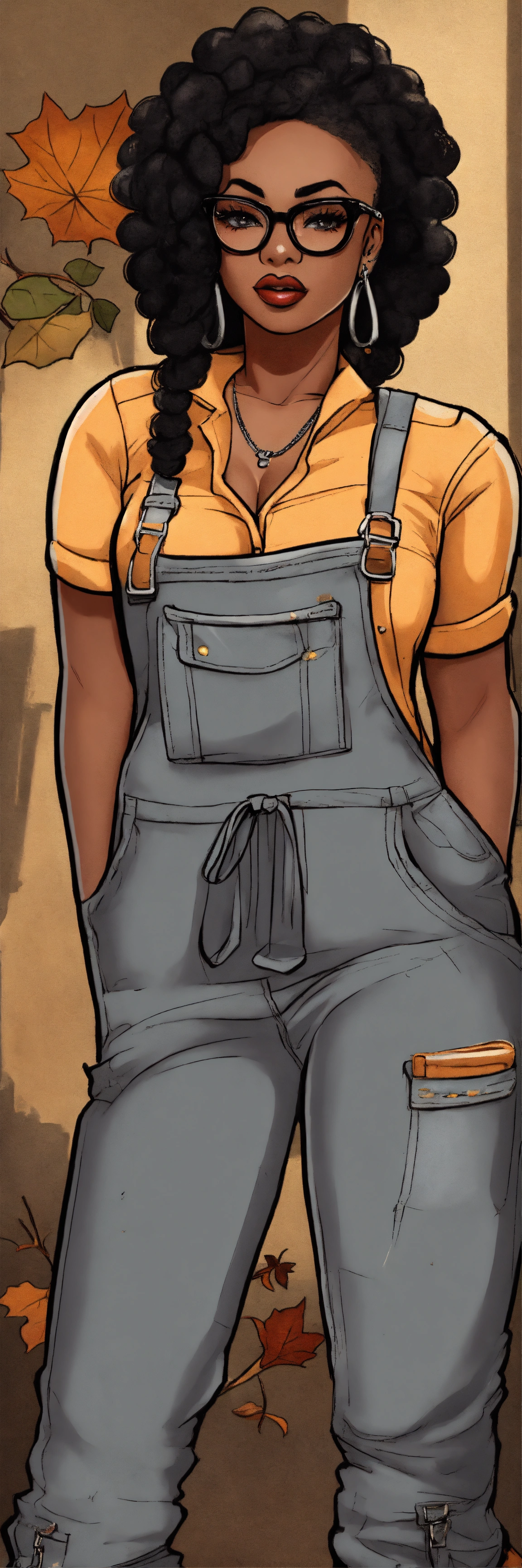 Cartoon, illustration, african american goth rockabilly full figure woman wearing glasses distressed work coveralls over a grey ribbed tank top autumn theme