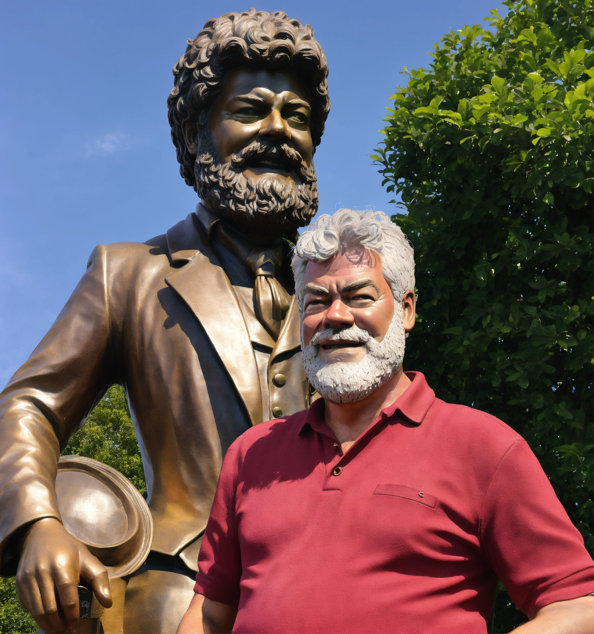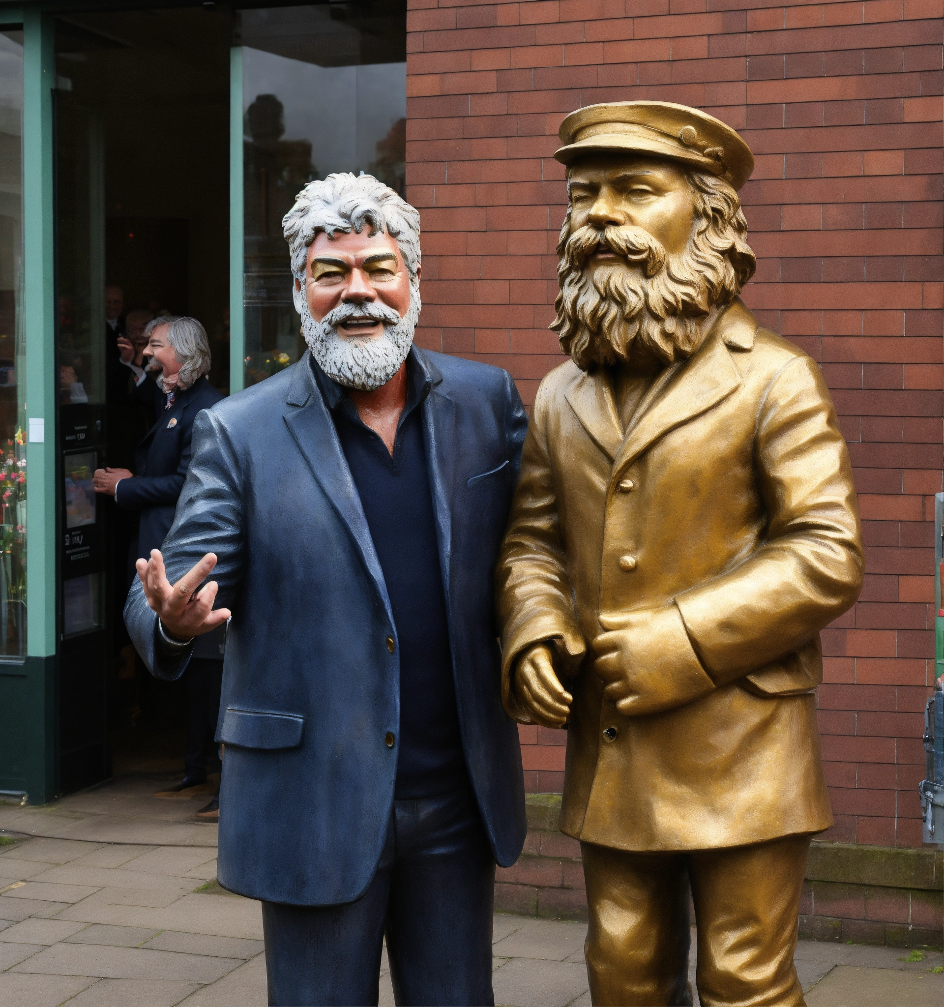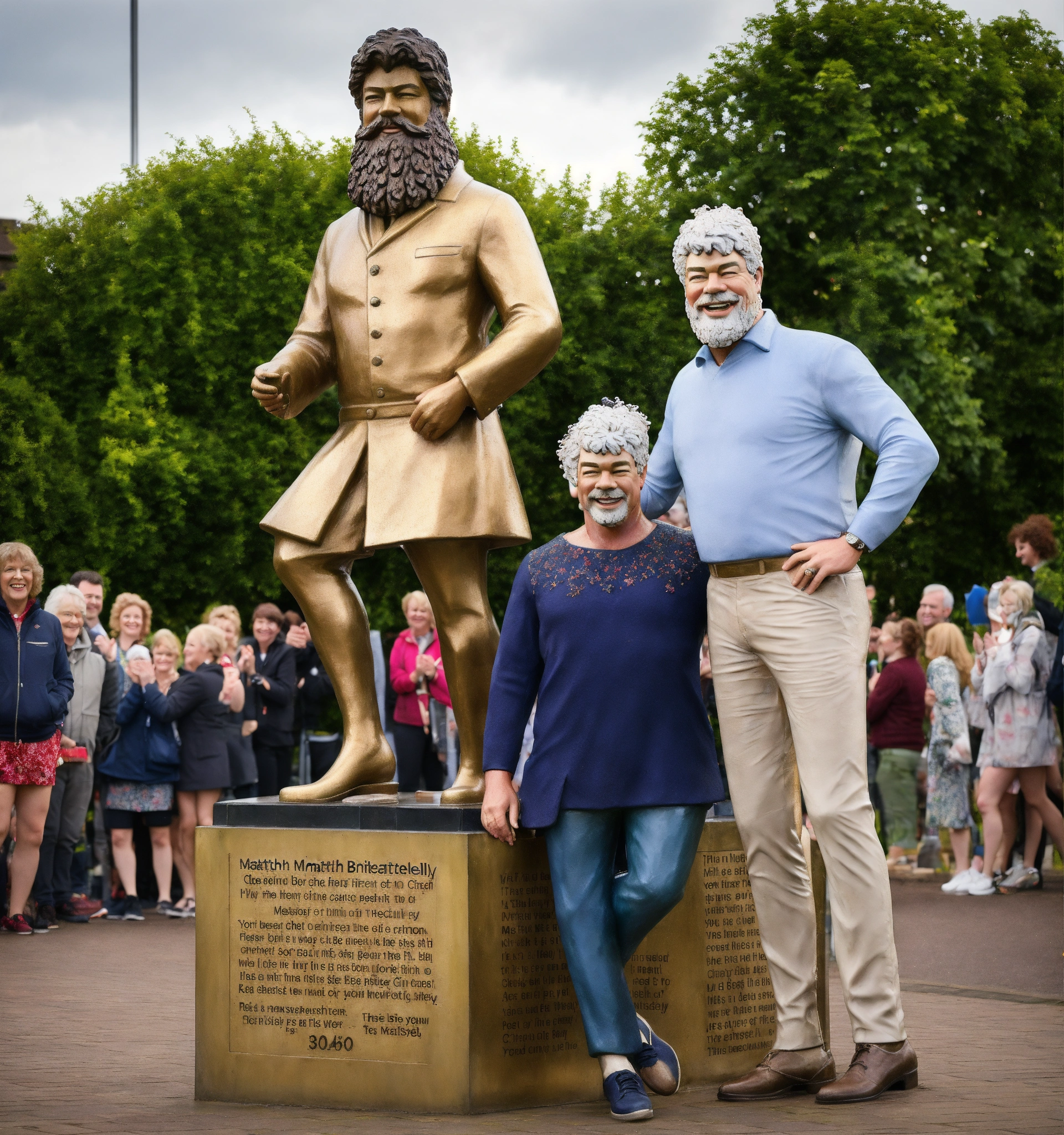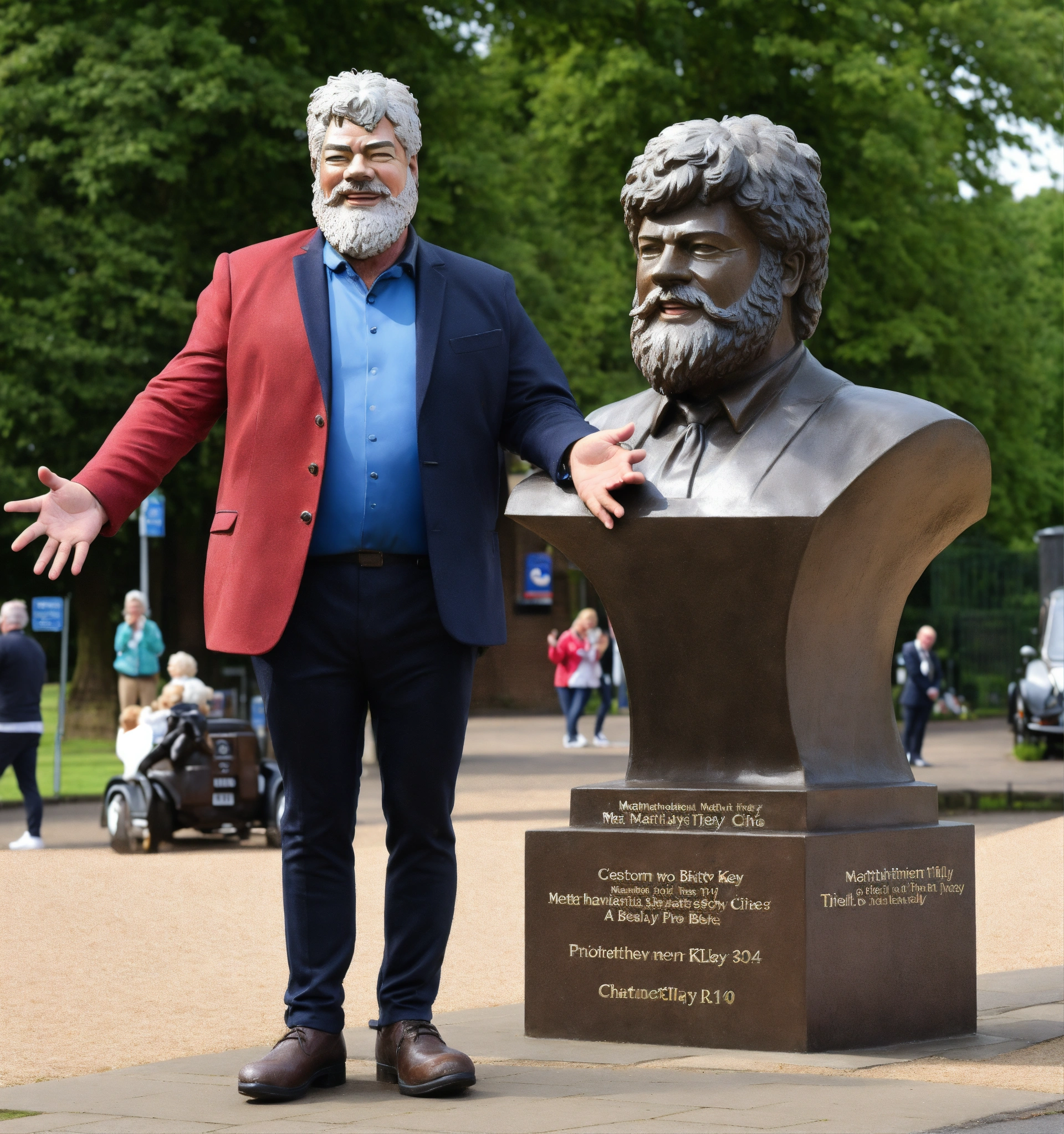 Gigantic statue of british tv presenter matthew kelly, with a beard. it is in urmston. the real matthew kelly, with a beard is stood next to the statue. the real matthew kelly is looking happy and clapping. there is a poodle. there is a citroen 2cv.