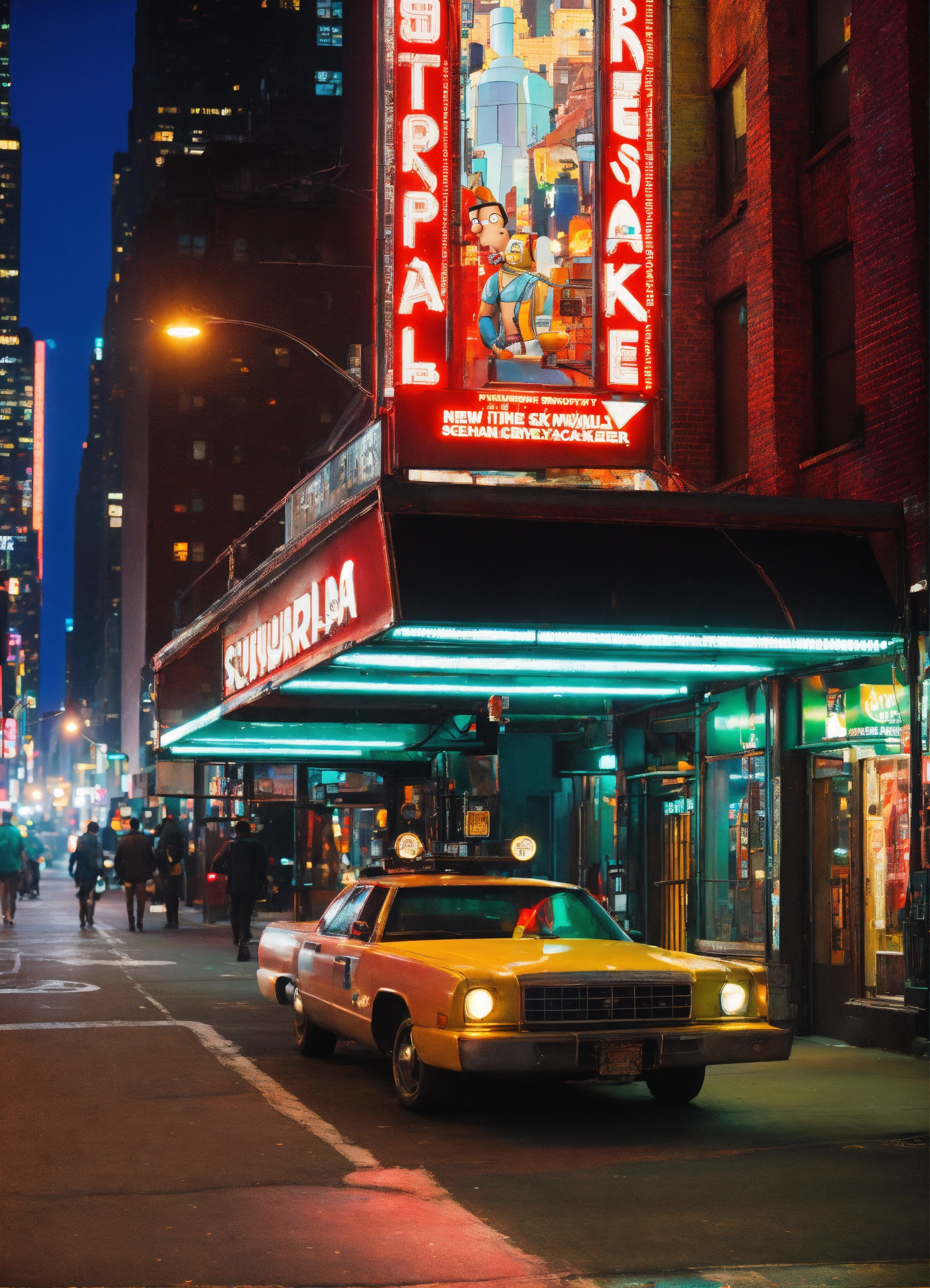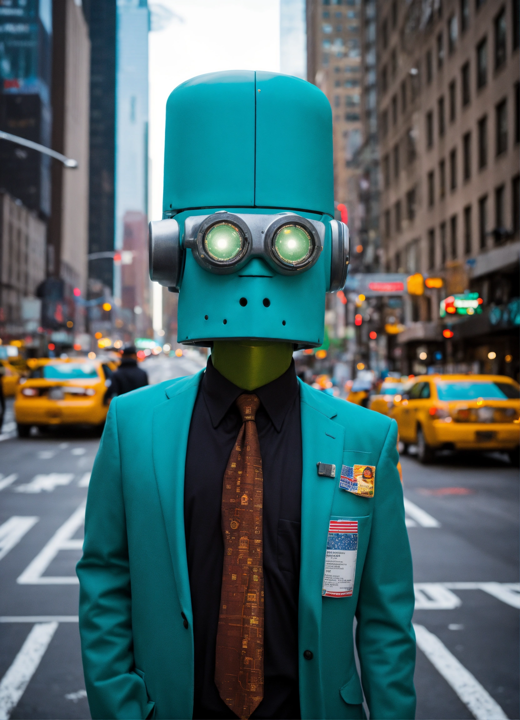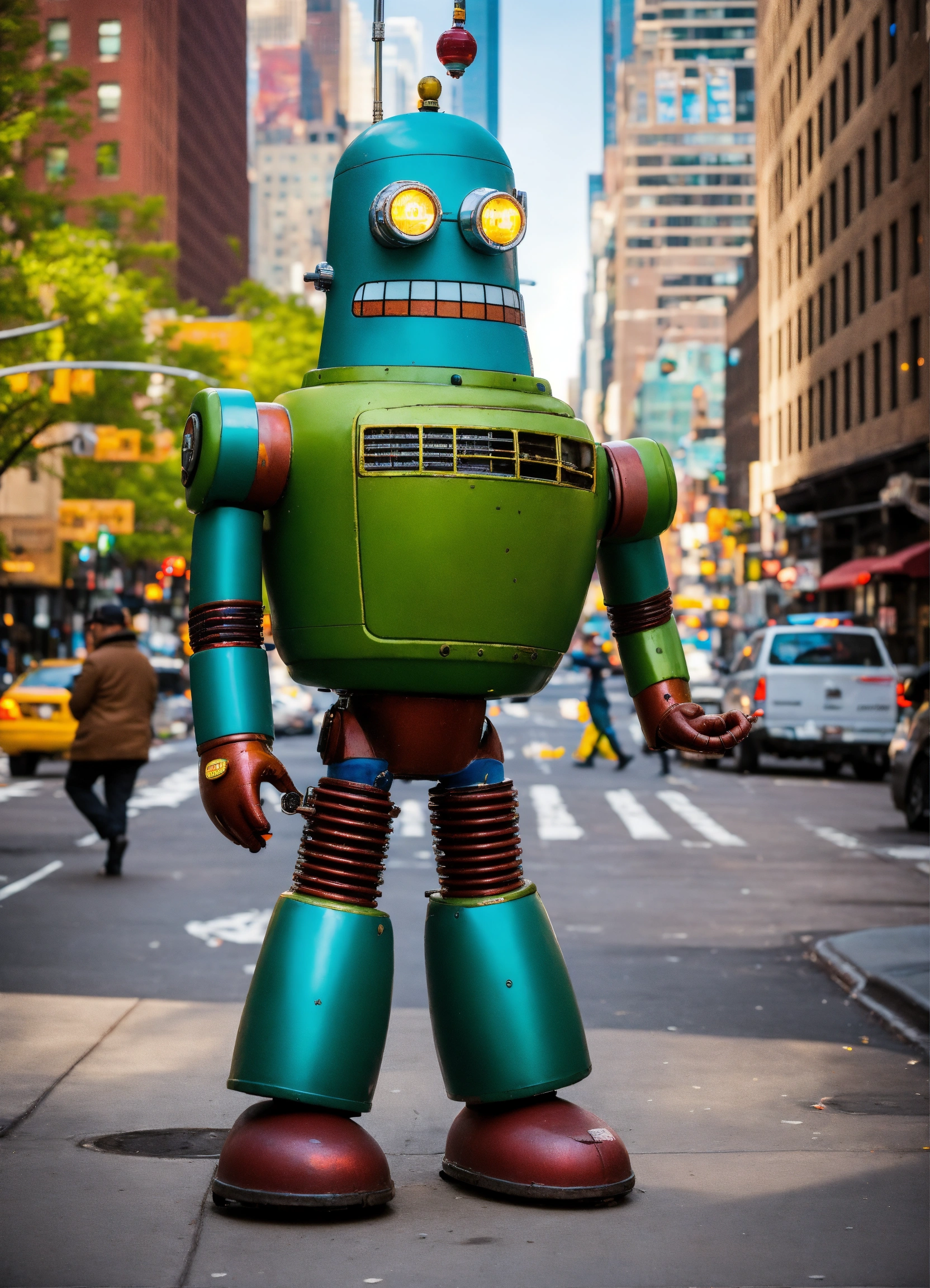 In this photograph taken in a street in new york a bender from futurama size of skyscraper cyberpunk