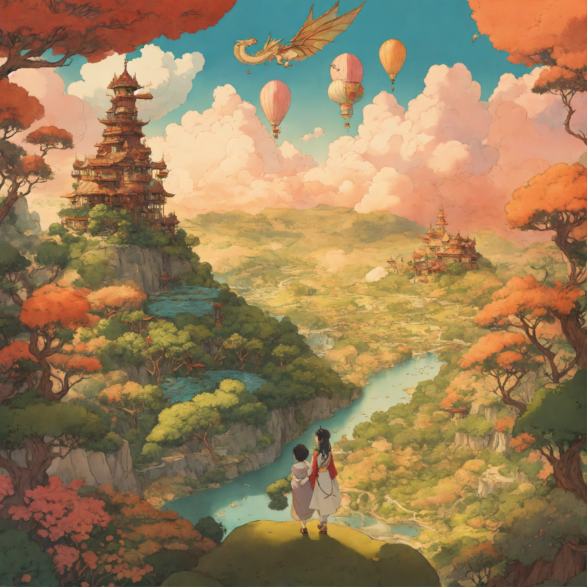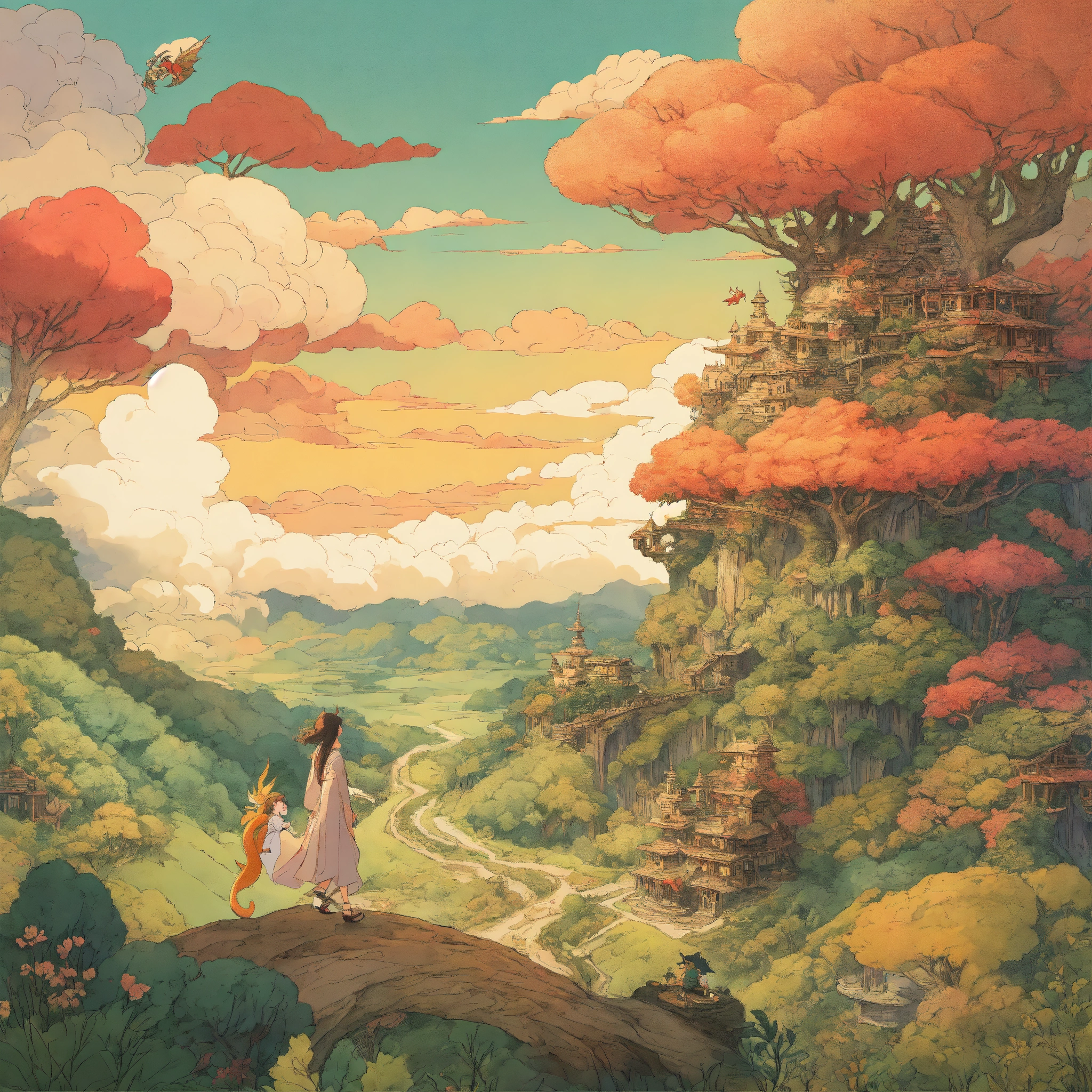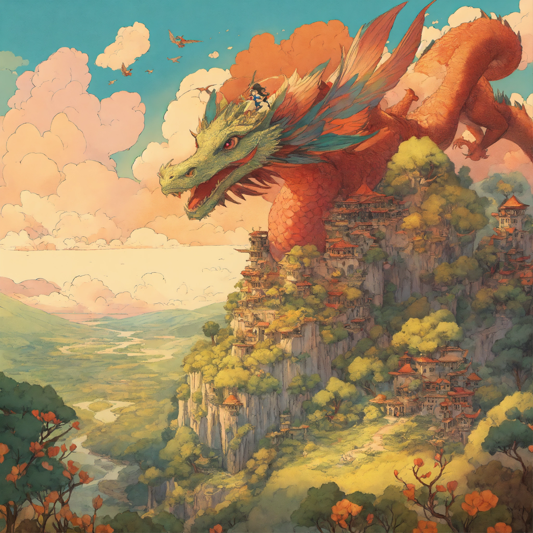 Illustration, styled by hayao miyazaki, a fantastical landscape, a goddess flying, a talking baby dragon, hand - drawn animation cells, whimsical and fantastical, rich and detailed, vibrant and earthy tones, soft and defined lines, balanced yet dynamic, soft natural lighting