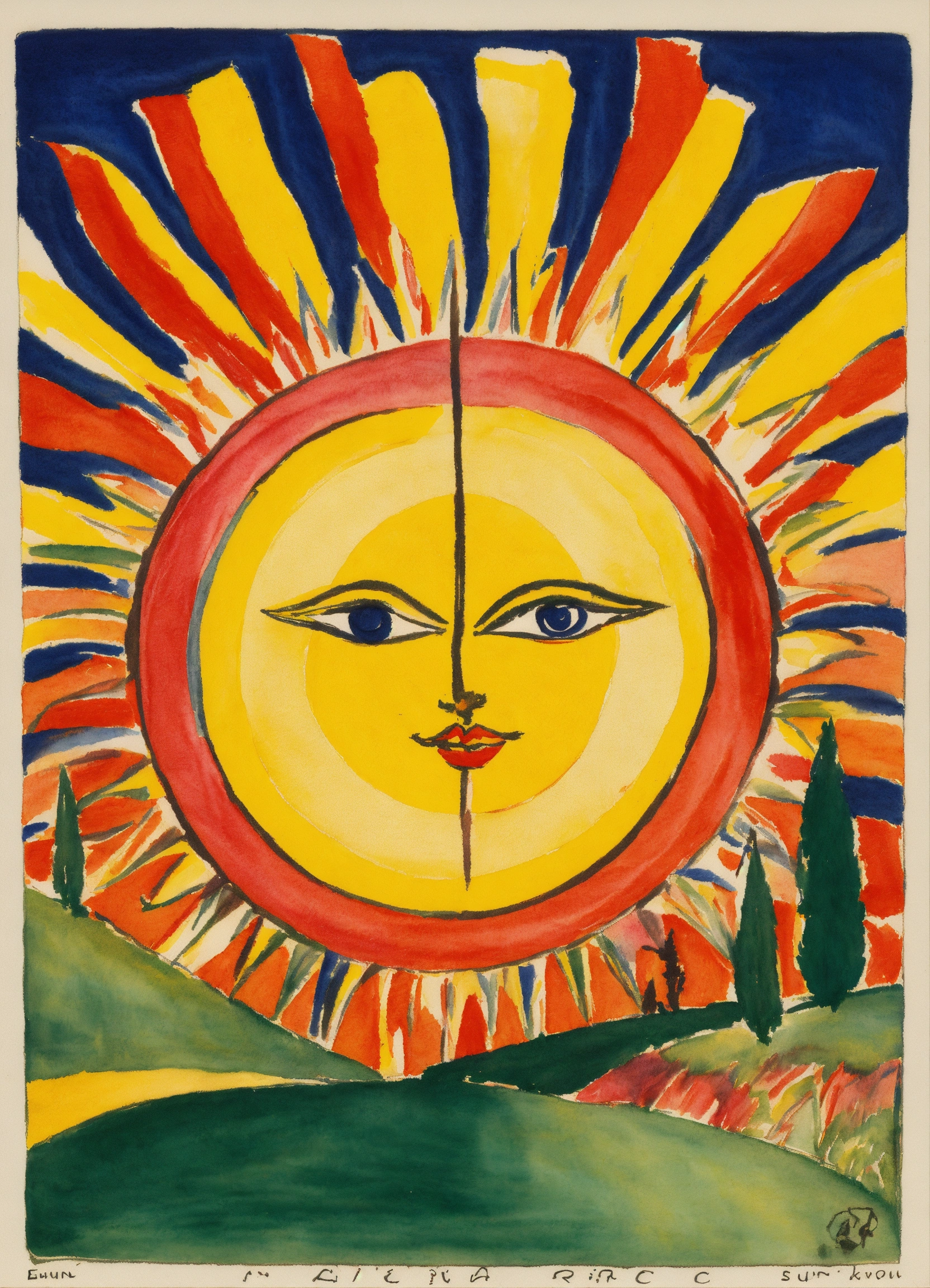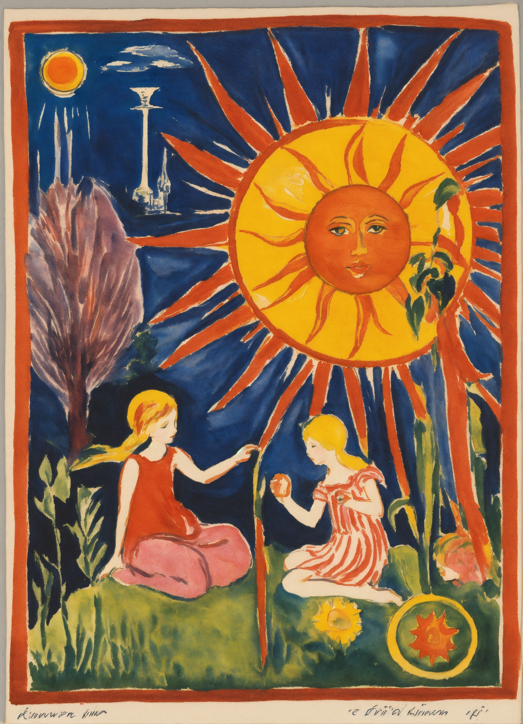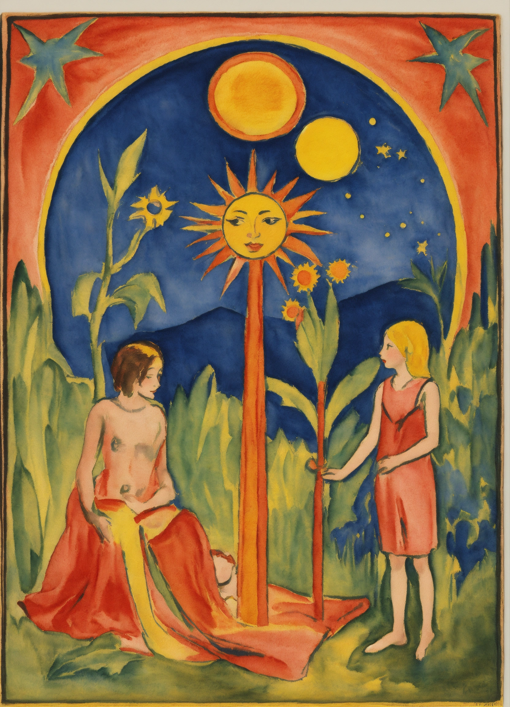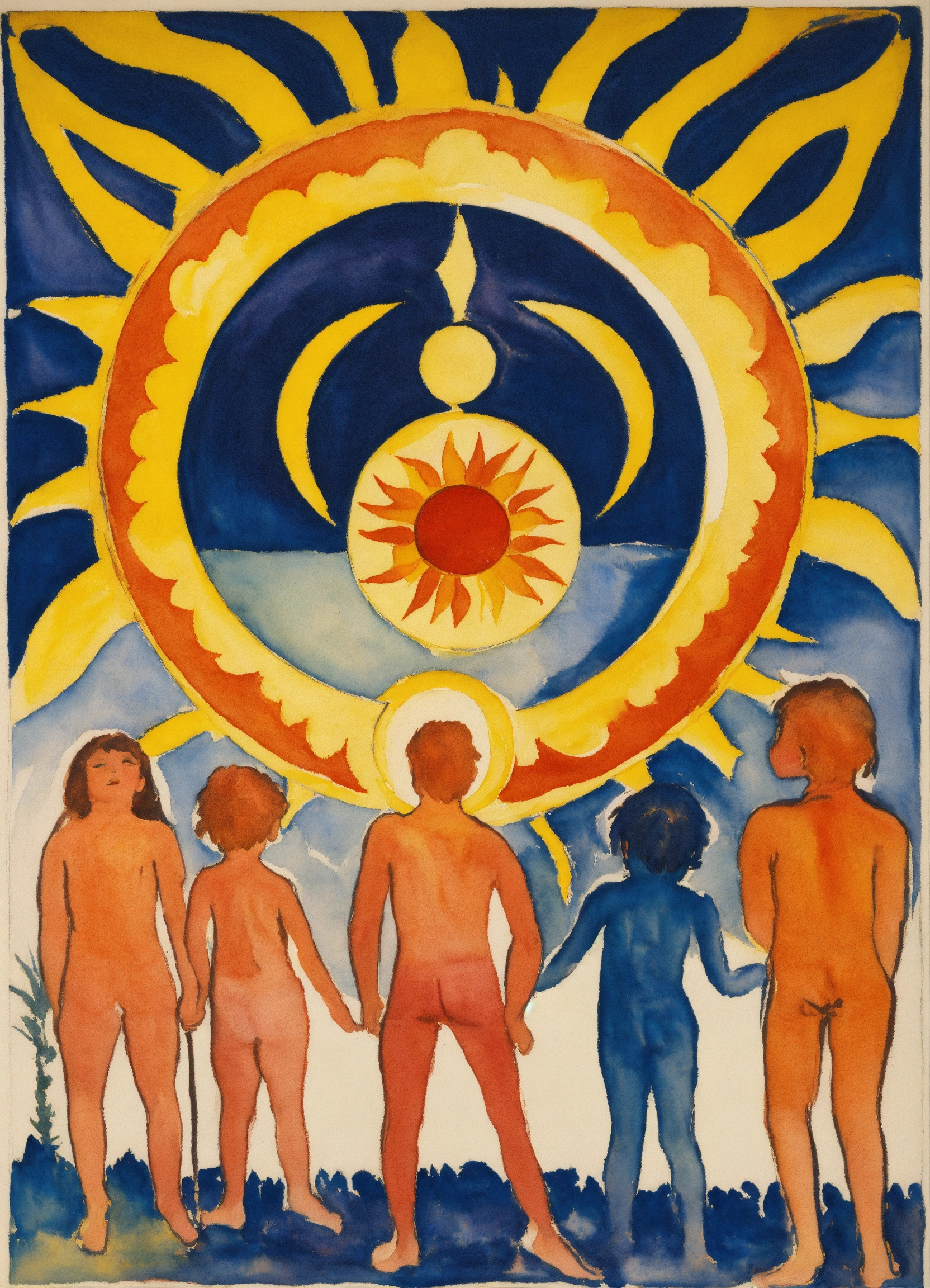Ernst ludwig kirchner peinture, aquarelle, representation of the tarot card, the sun, a large sun posted above two children