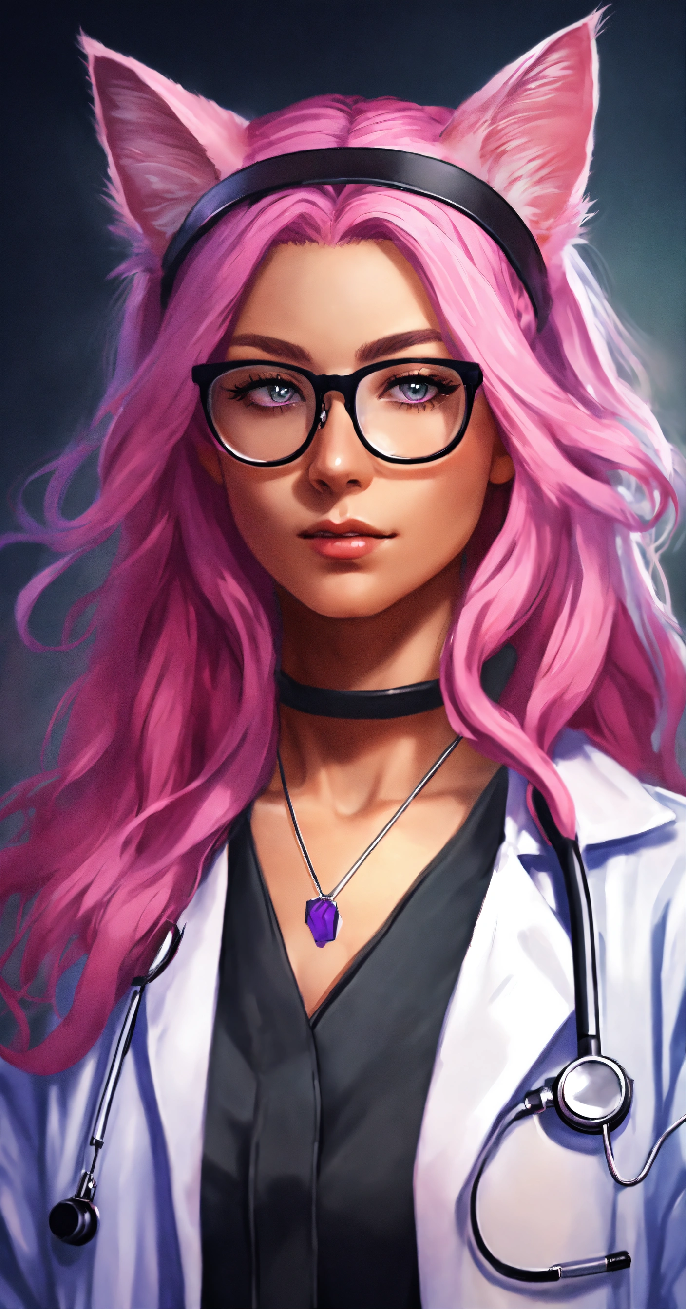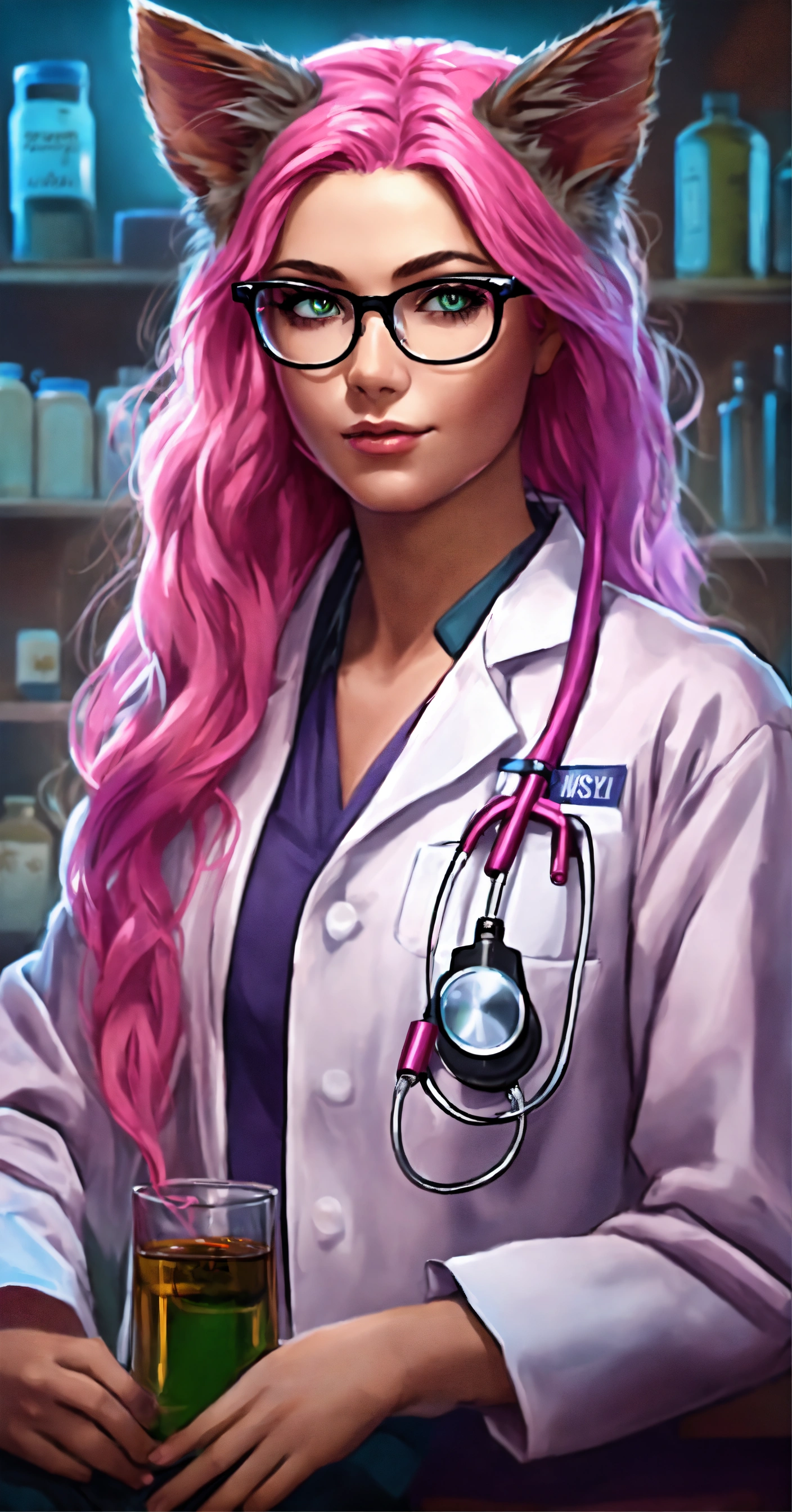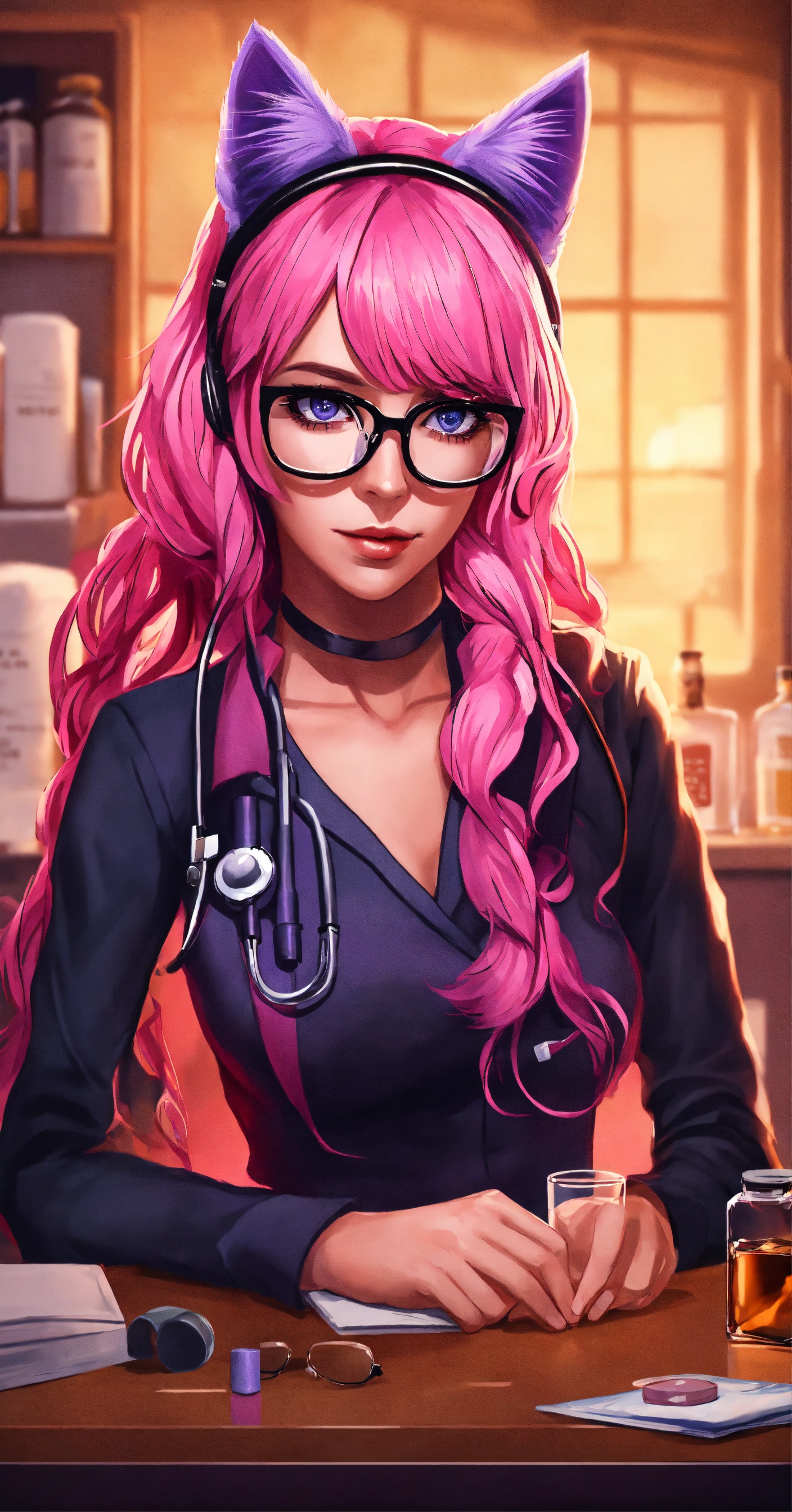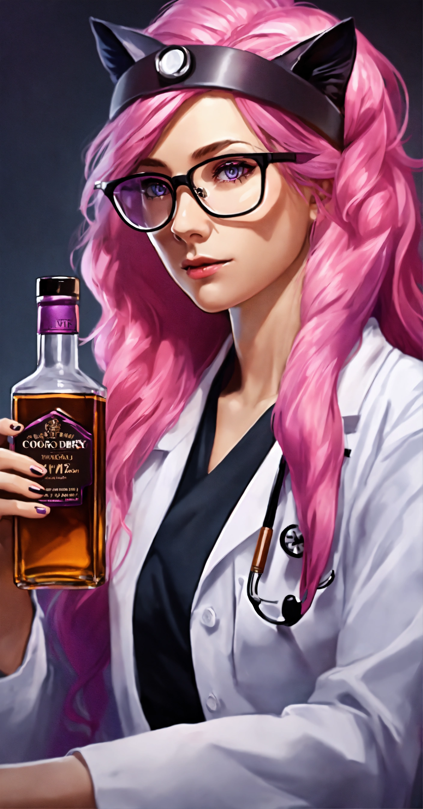 Female doctor, with long pink hair, with cat ears color black on her head, glasses and purple-pink eyes in hospital, realistic style with whiskey bottle
