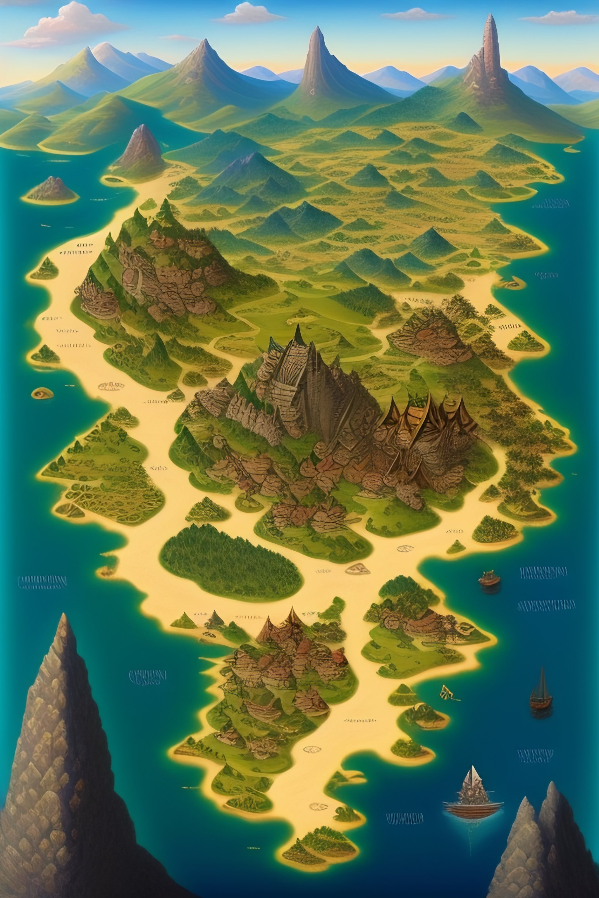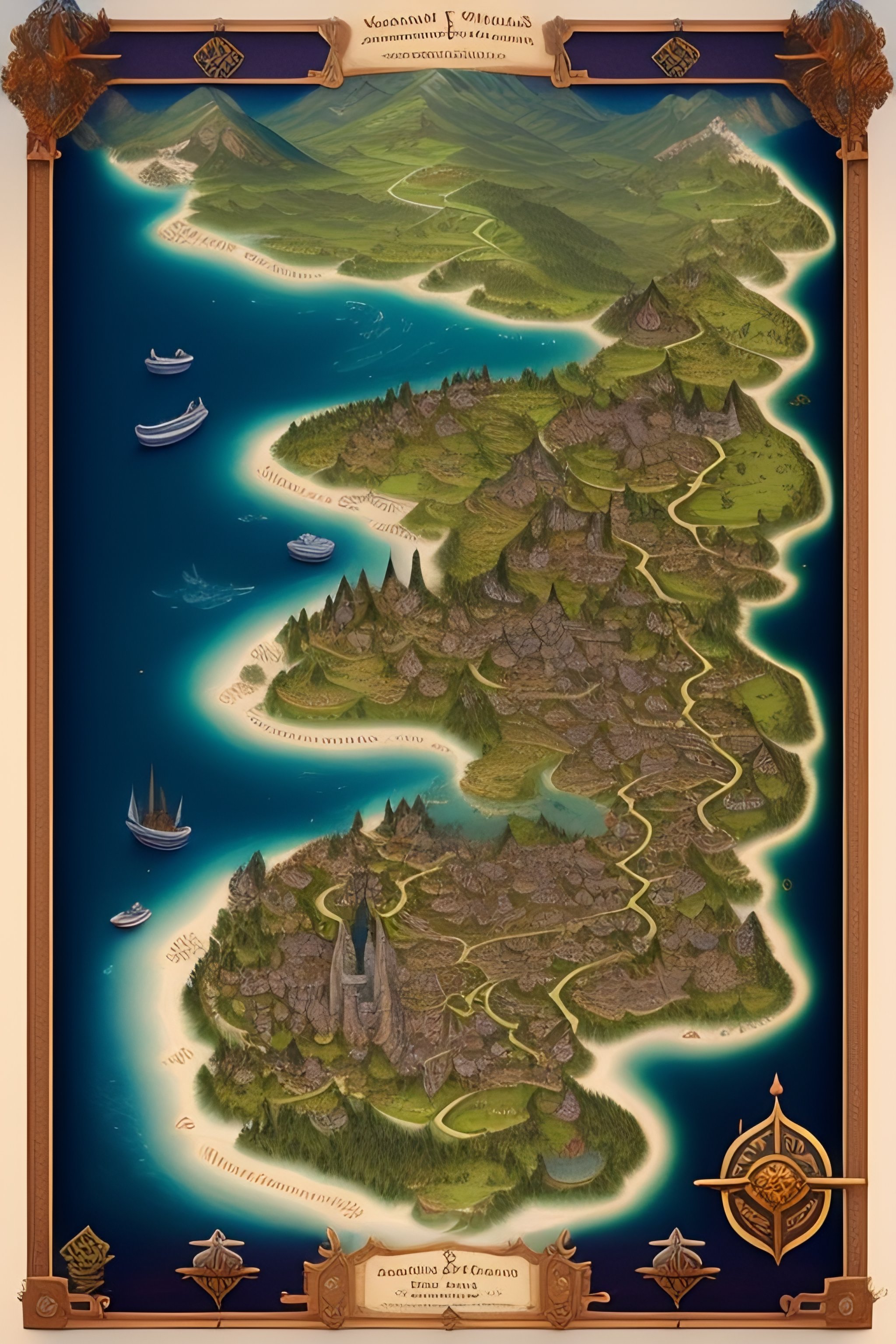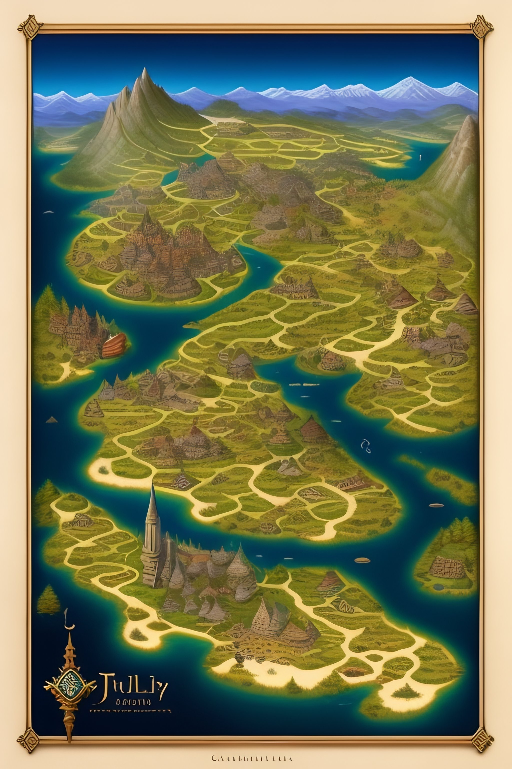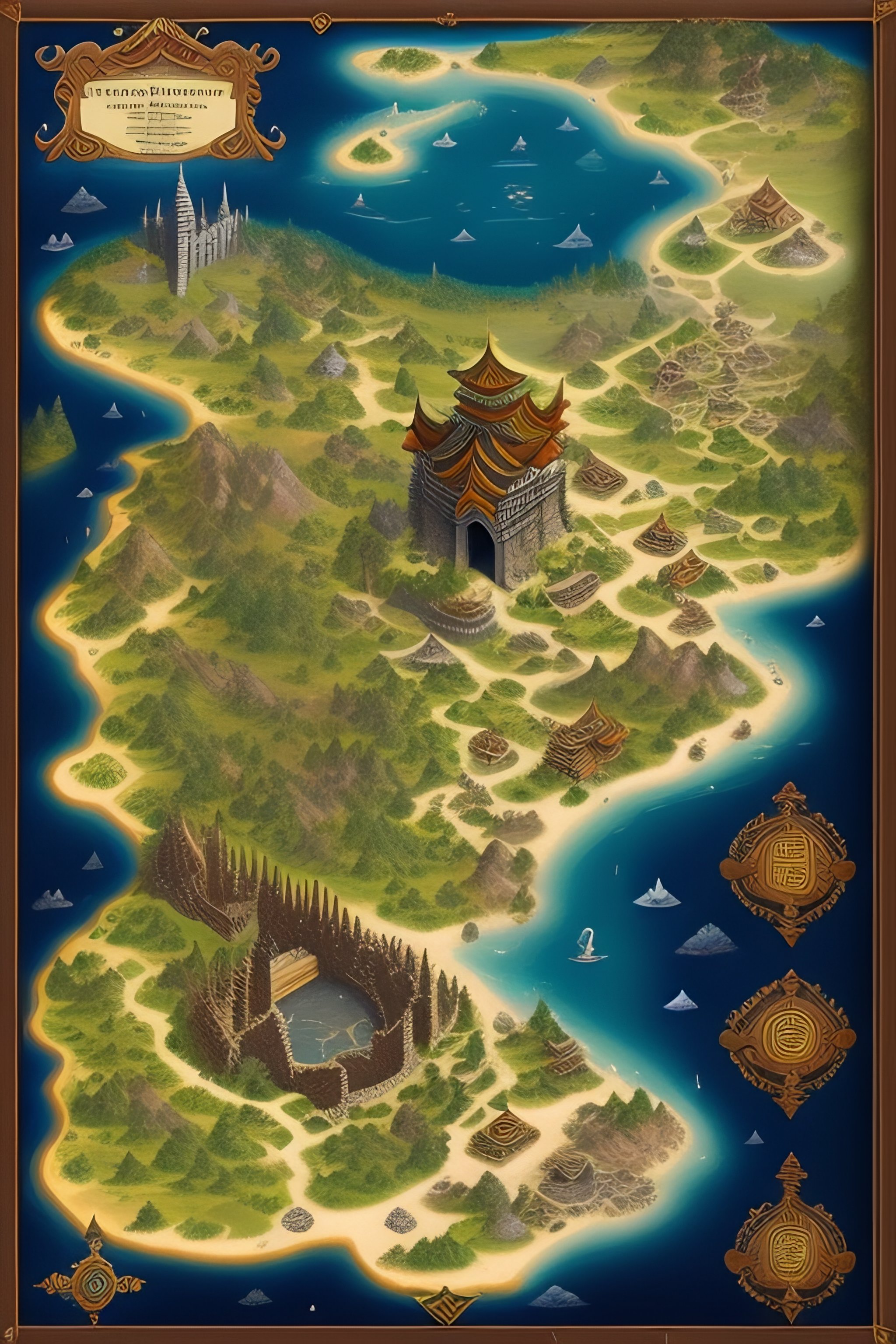 An illustrated fantasy country map, tabletop game, detailed city, few towns, temples, ruis, ancient, medieval, fortress, dungeons, old, fantasy, ancient, lakes, rivers.