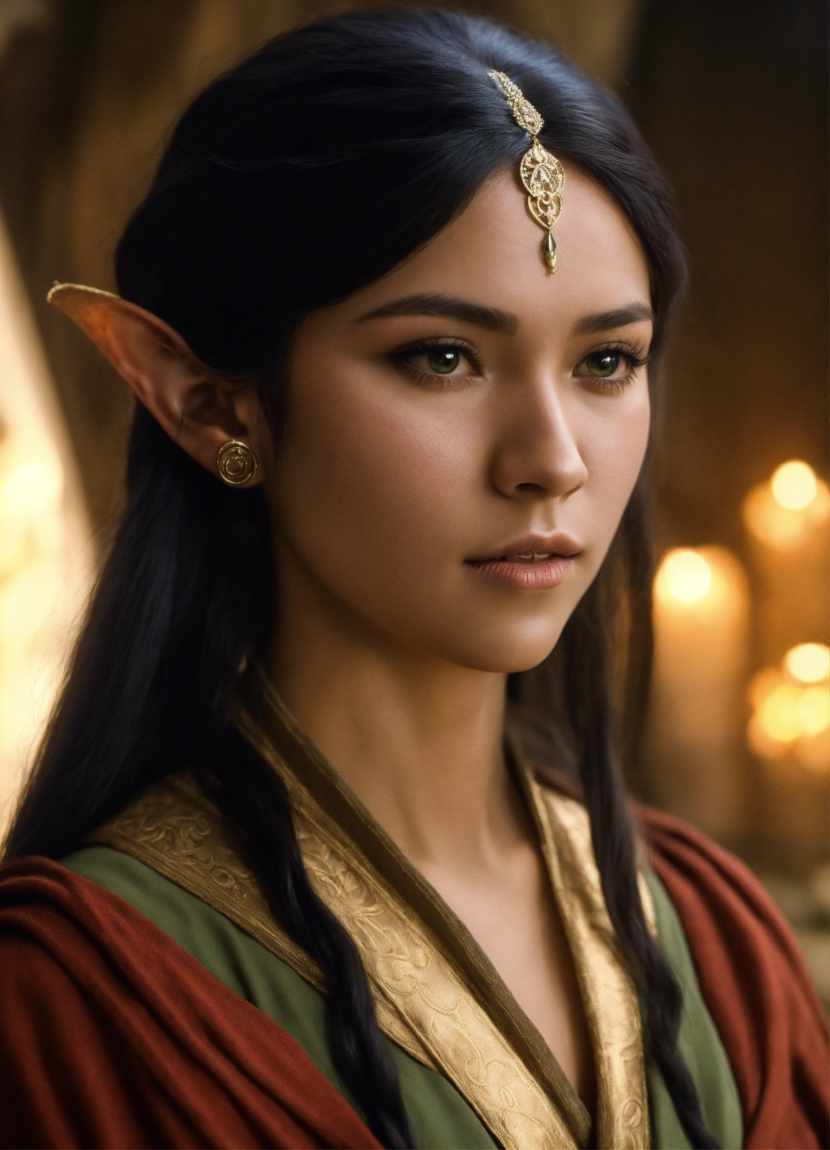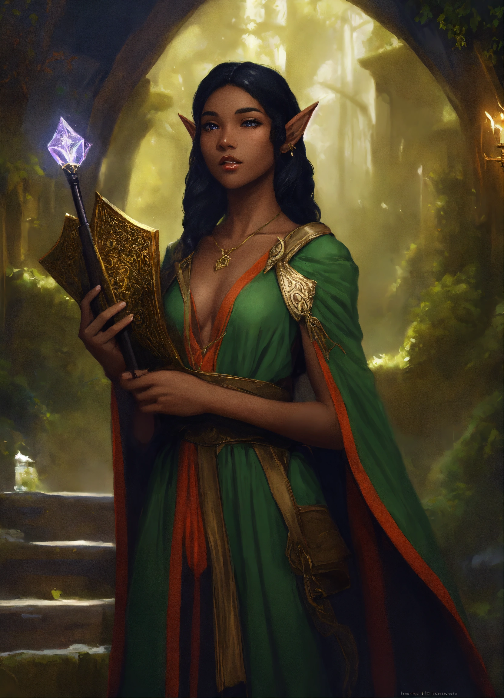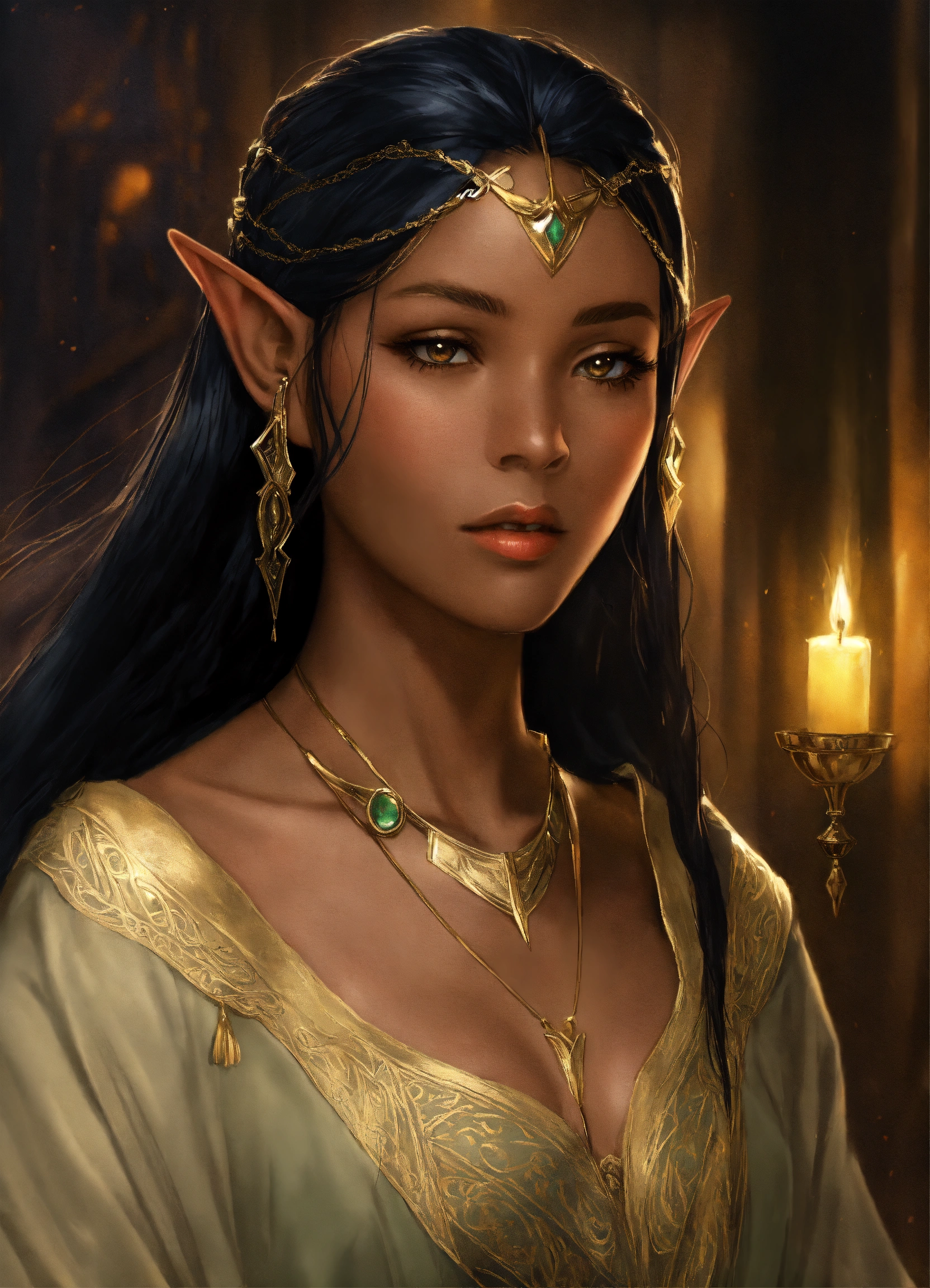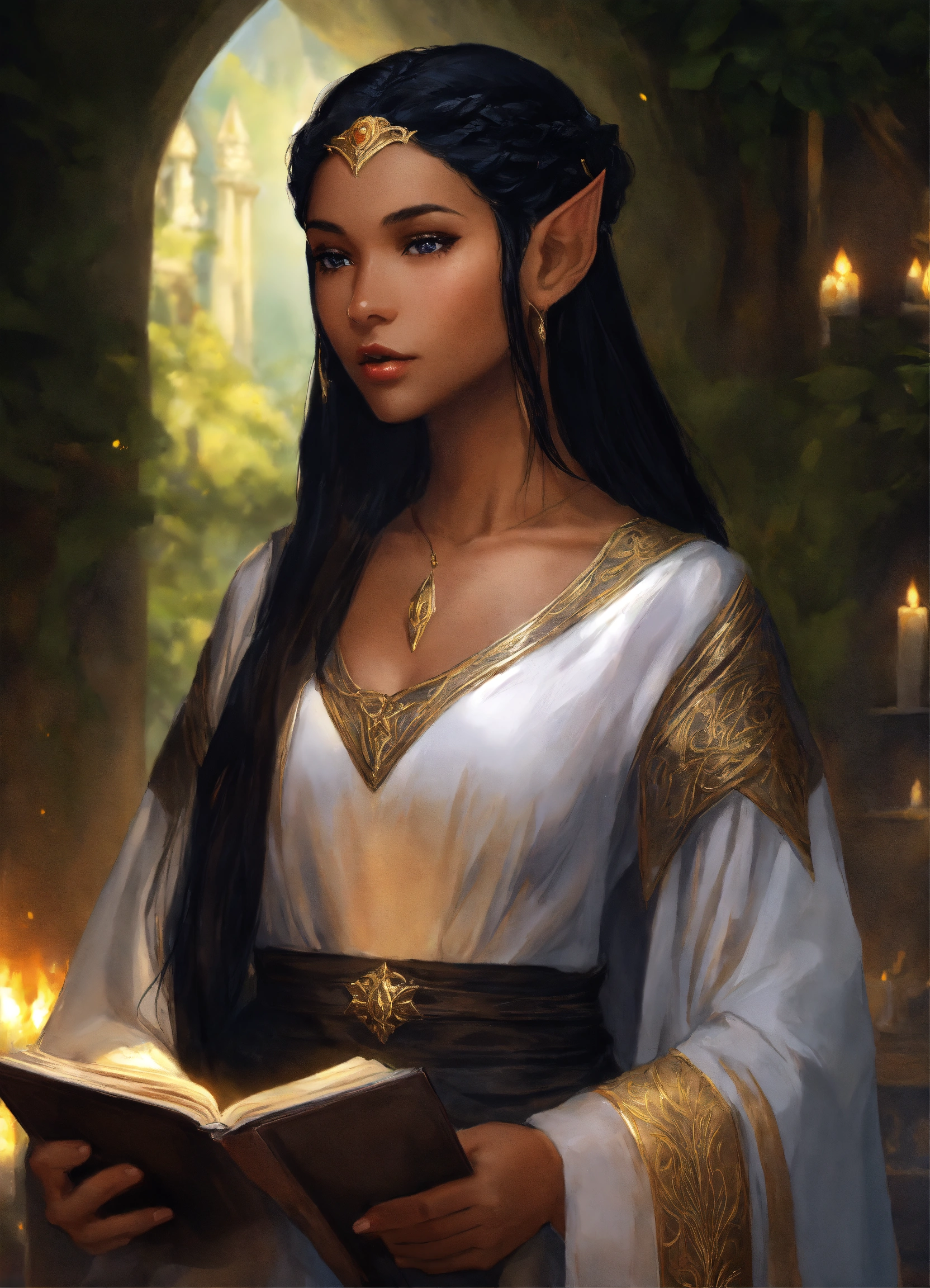 Elf woman, short ears, fantasy, dark complexion, black hair, robe, archive, scholar, lord of the rings