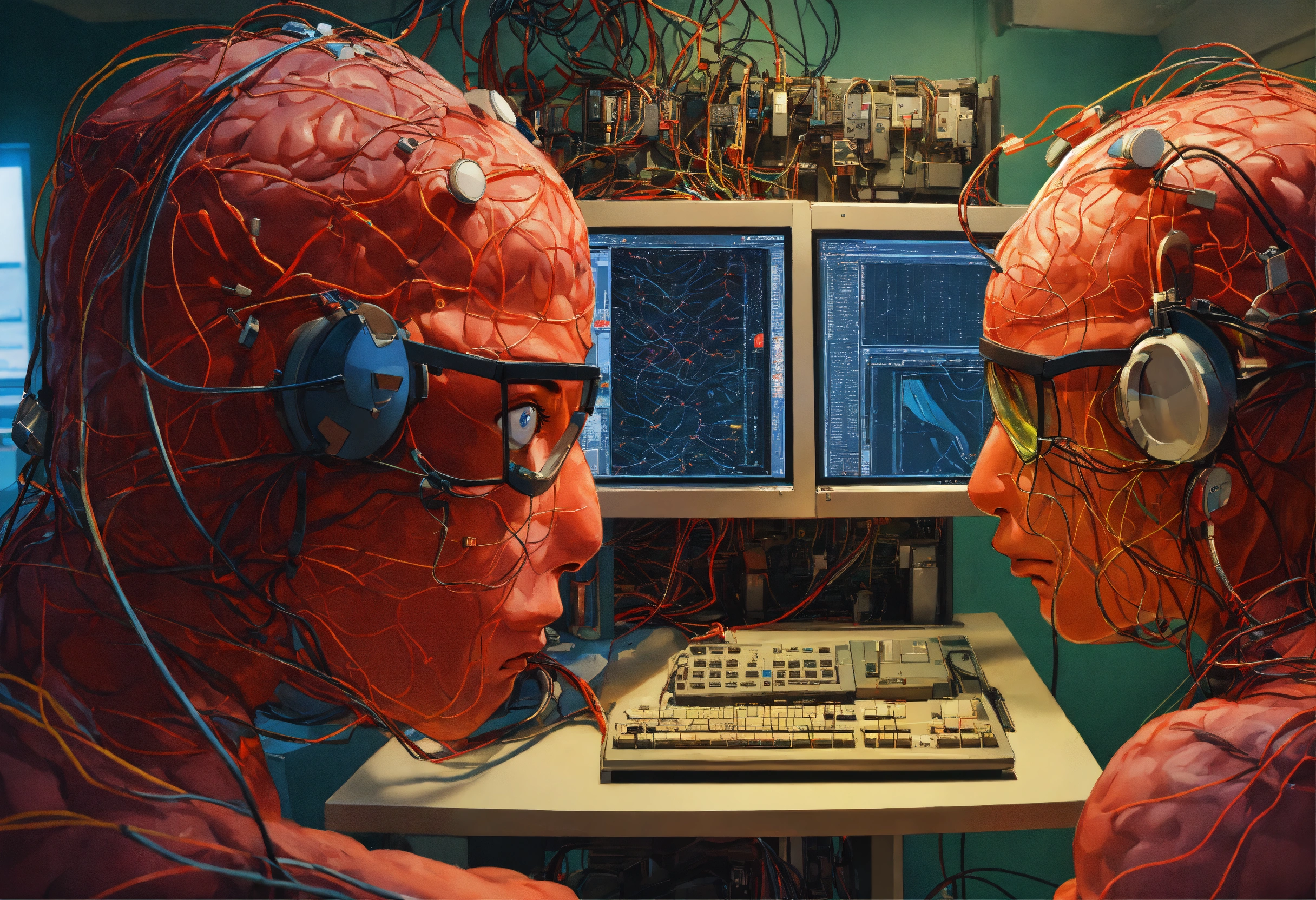 Lofi art by at the room's epicenter, an immense human brain is intricately linked to avant-garde and futuristic computers ensconced in the surrounding state-of-the-art racks, all interwoven by a network of millions of wires. this extraordinary brain possesses two perceptive eyes that focus on us with astonishing precision, immortalized in a painting boasting unparalleled detail and a 64k resolution. within this tableau, two astute donkey scientists are fervently engrossed in their examination of the brain. the brain is supported by a network of 200 robust red cables, each connecting it to various computers, while it also features two expressive eyes and a singular antenna