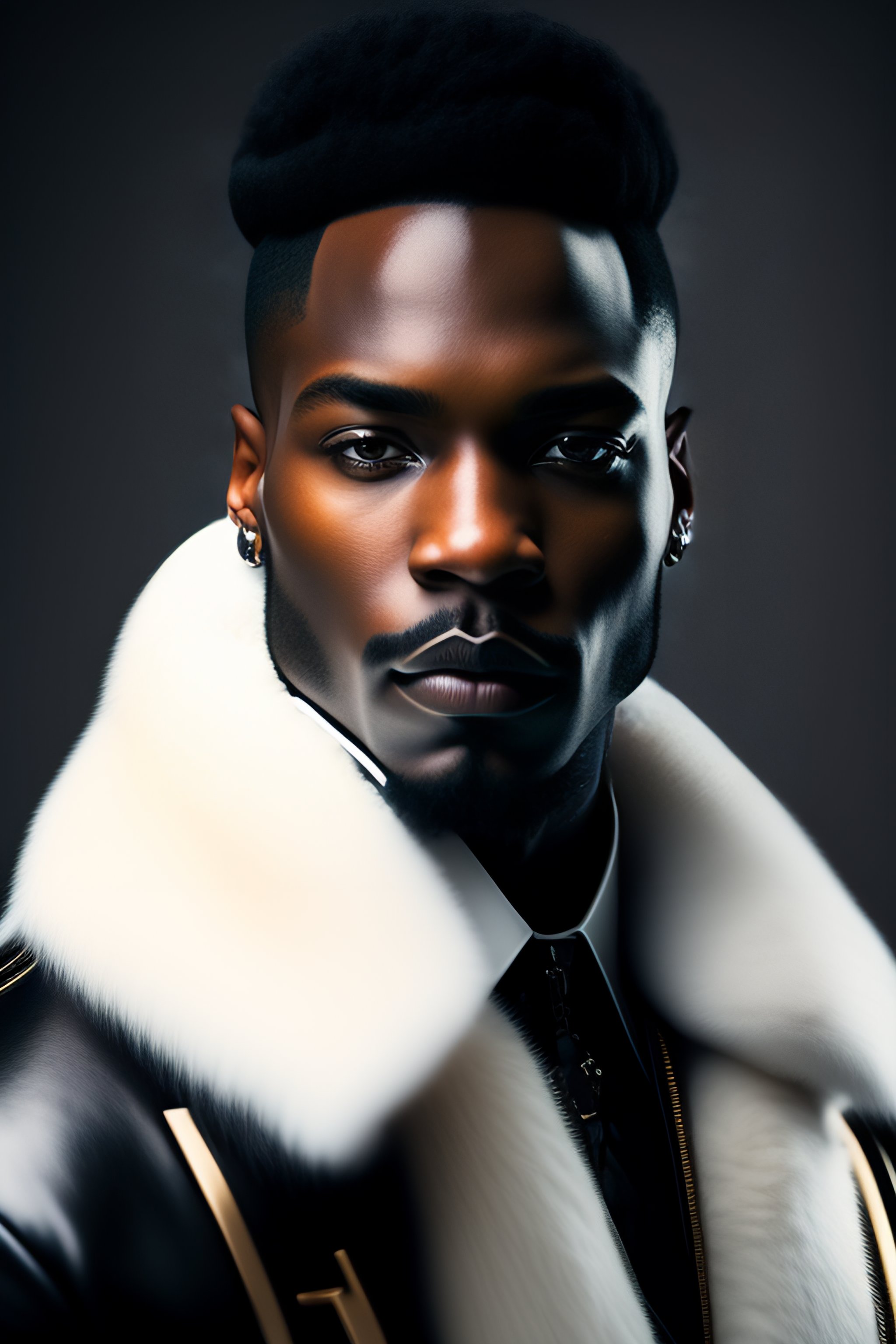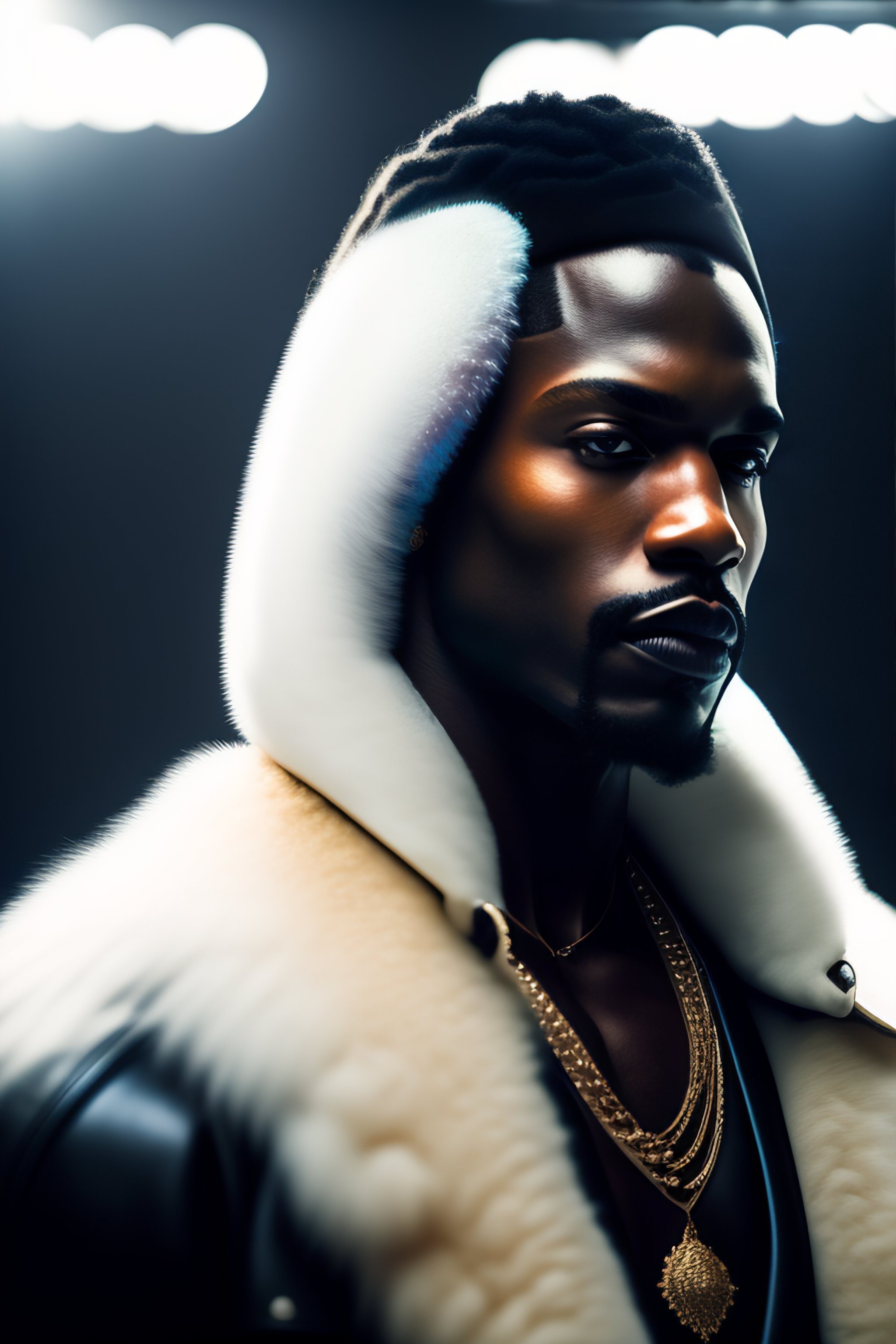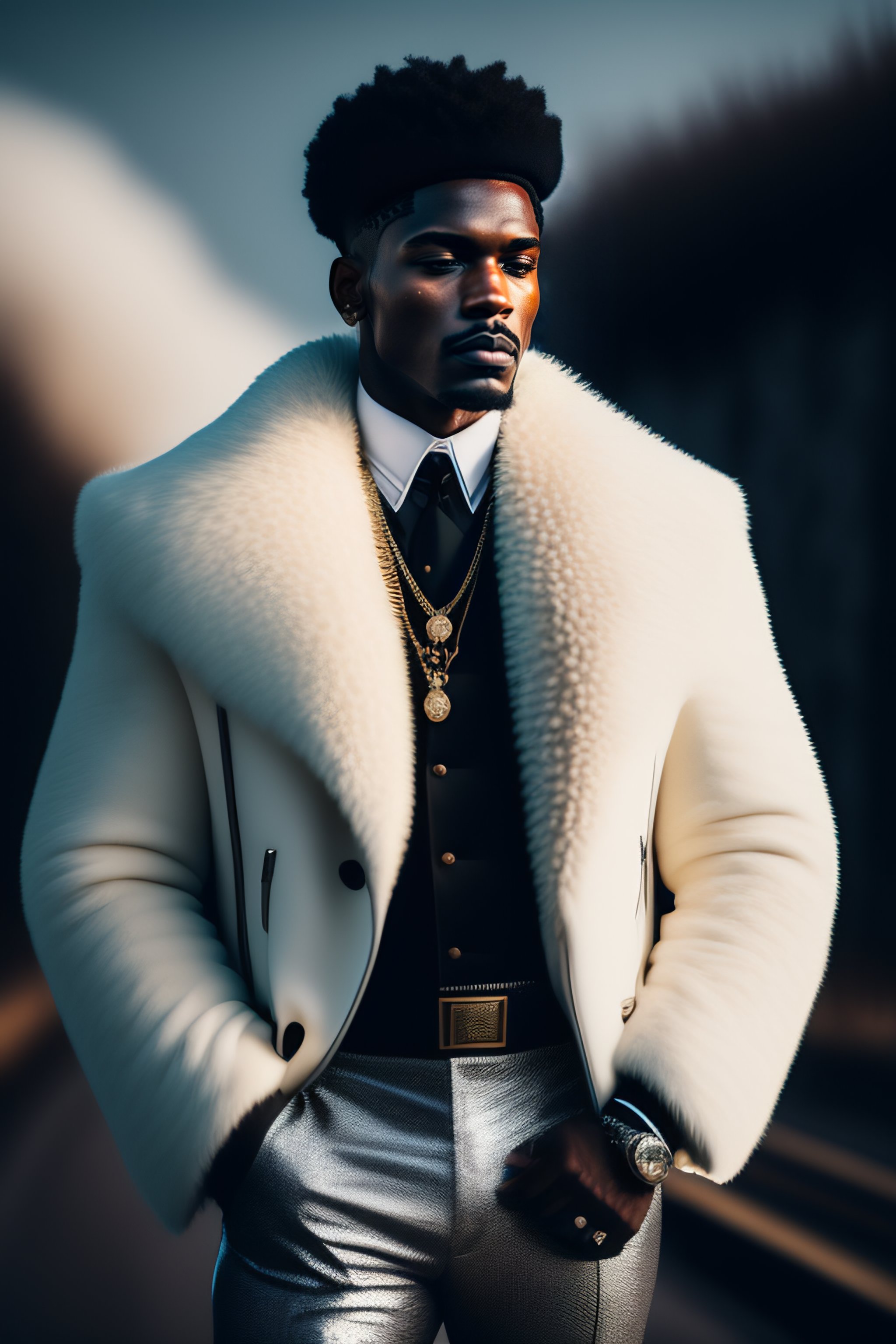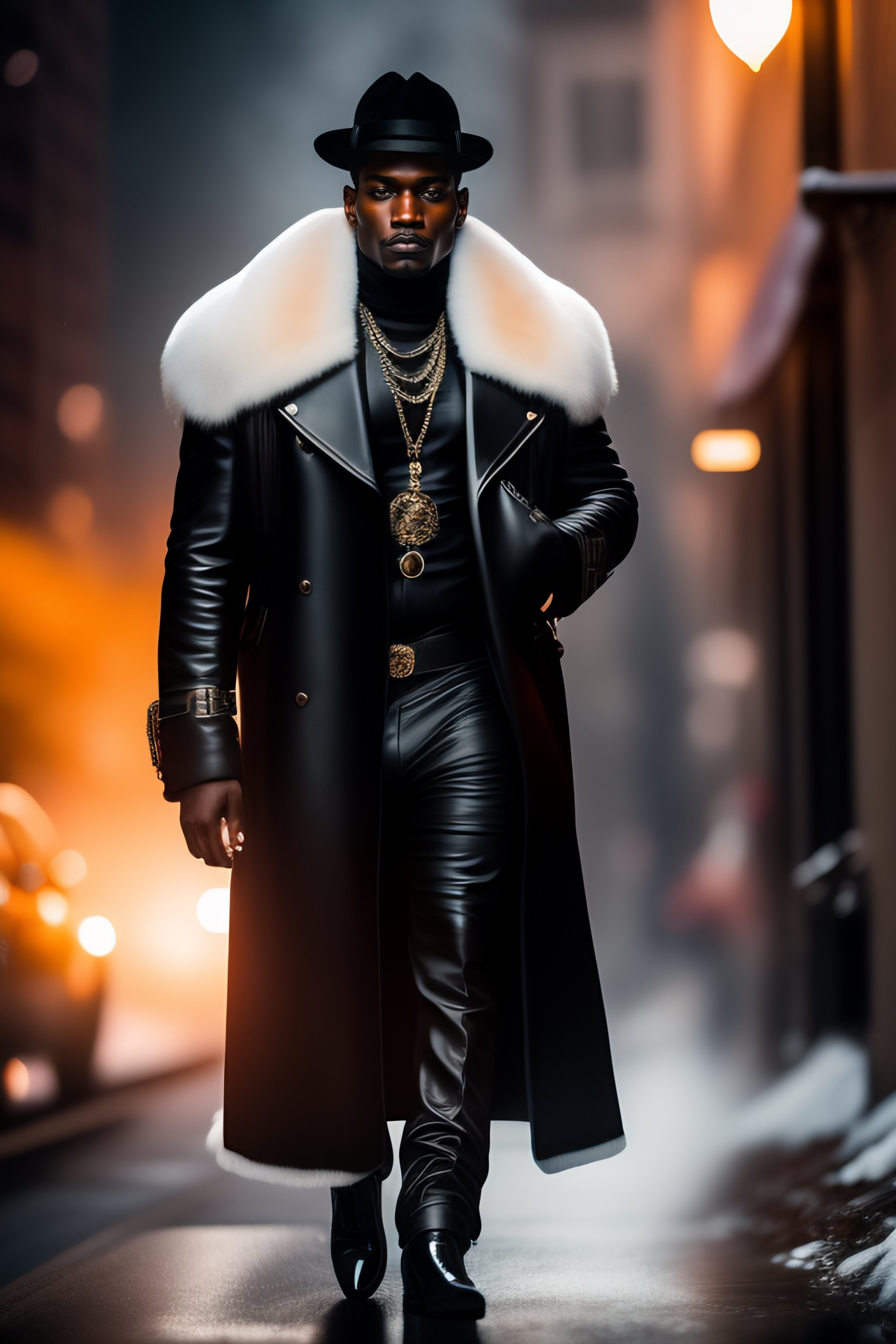 A real person in high quality photography picture looking like a black pimp with black leather clothes and a white fur coat and a big machine gun in his hand, in the style of american gangster movie