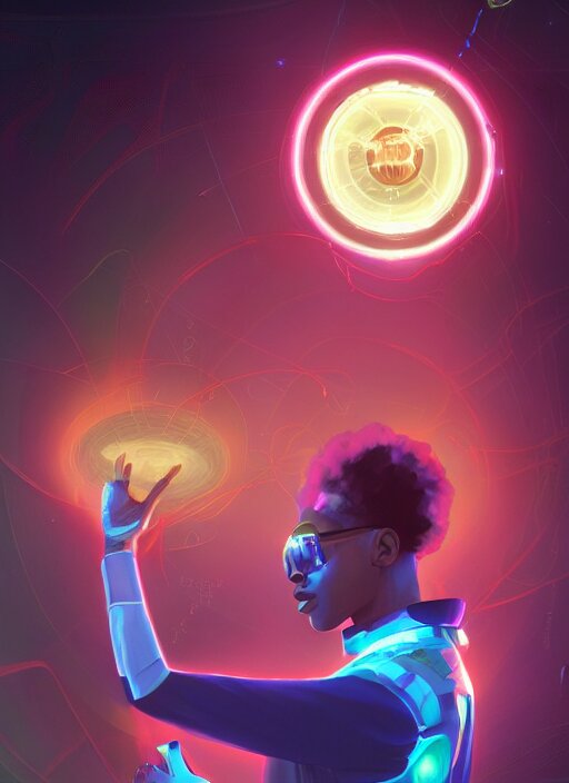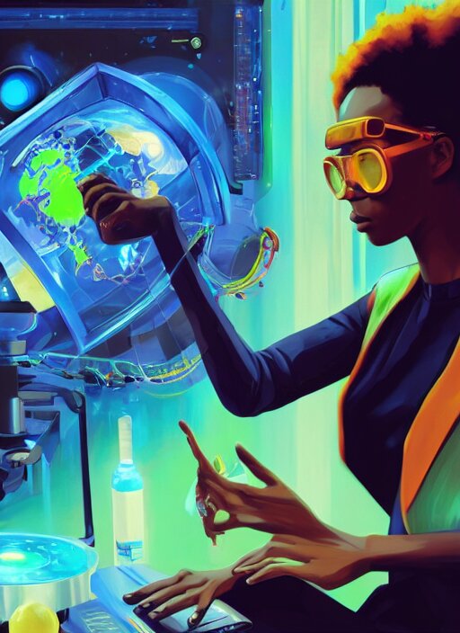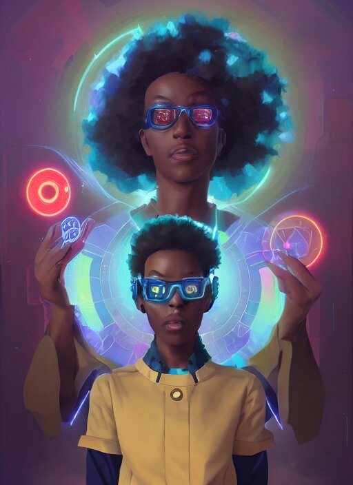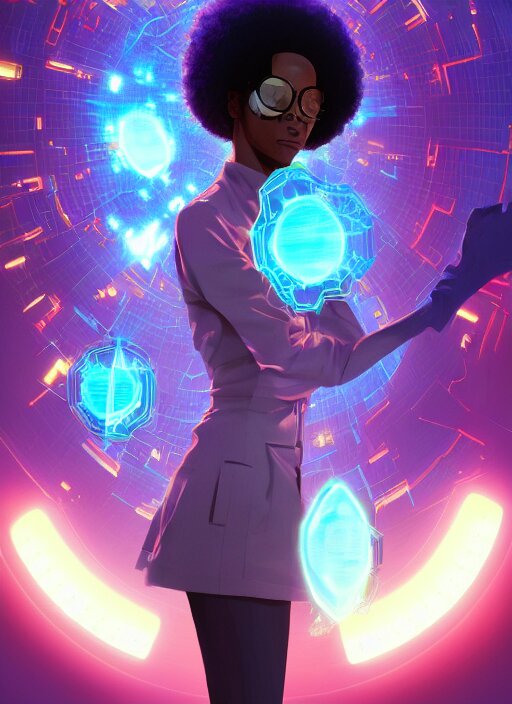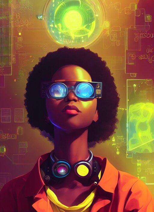 Afro - futurist scientist, computers and holograms, hacking the metaverse | hyperrealistic oil painting | by makoto shinkai, ilya kuvshinov, lois van baarle, rossdraws, basquiat | afrofuturism, in the style of hearthstone, trending on artstation | dark color scheme