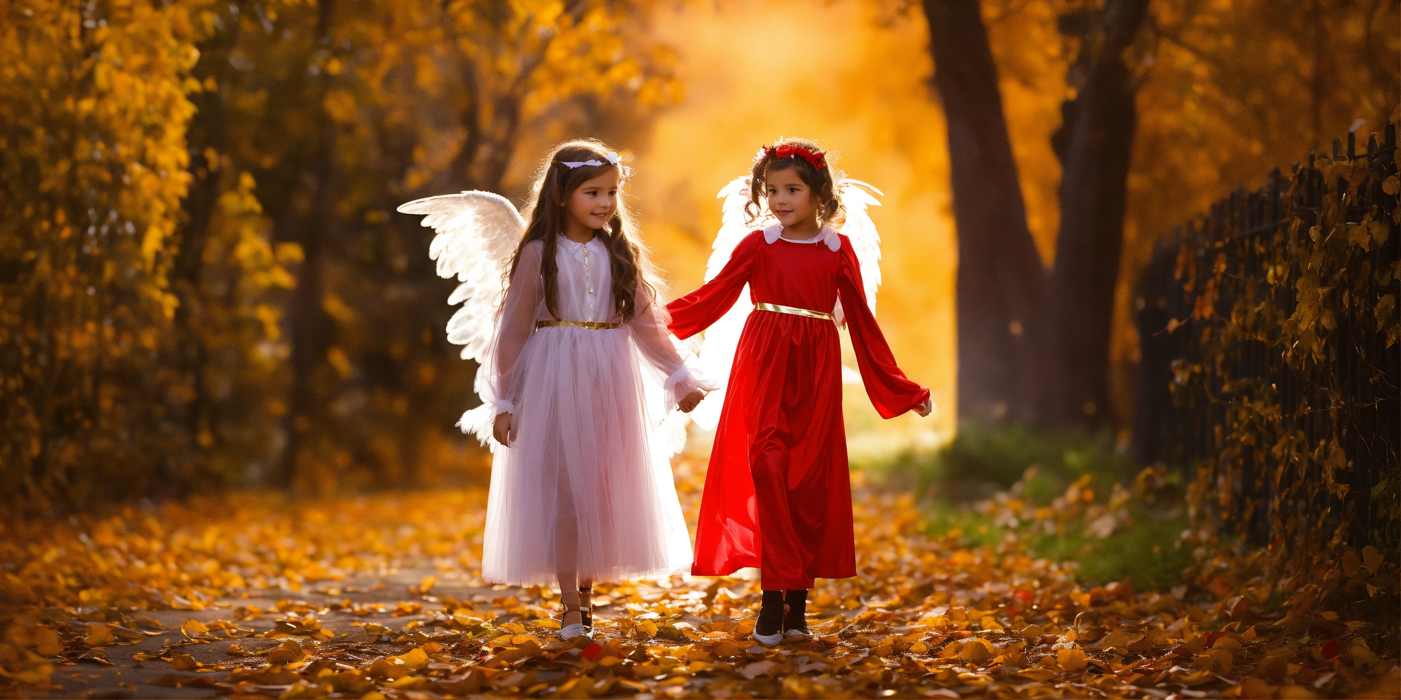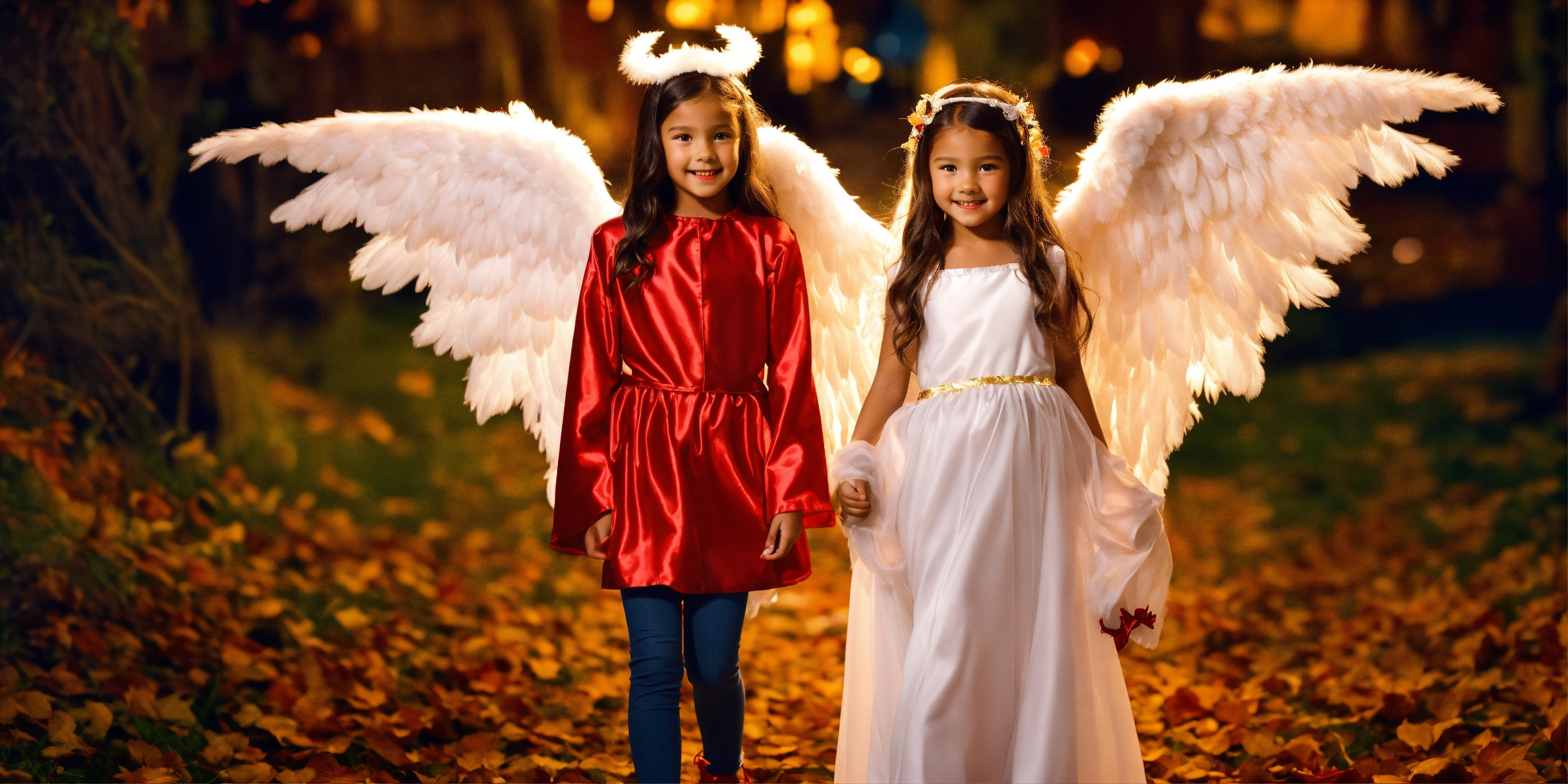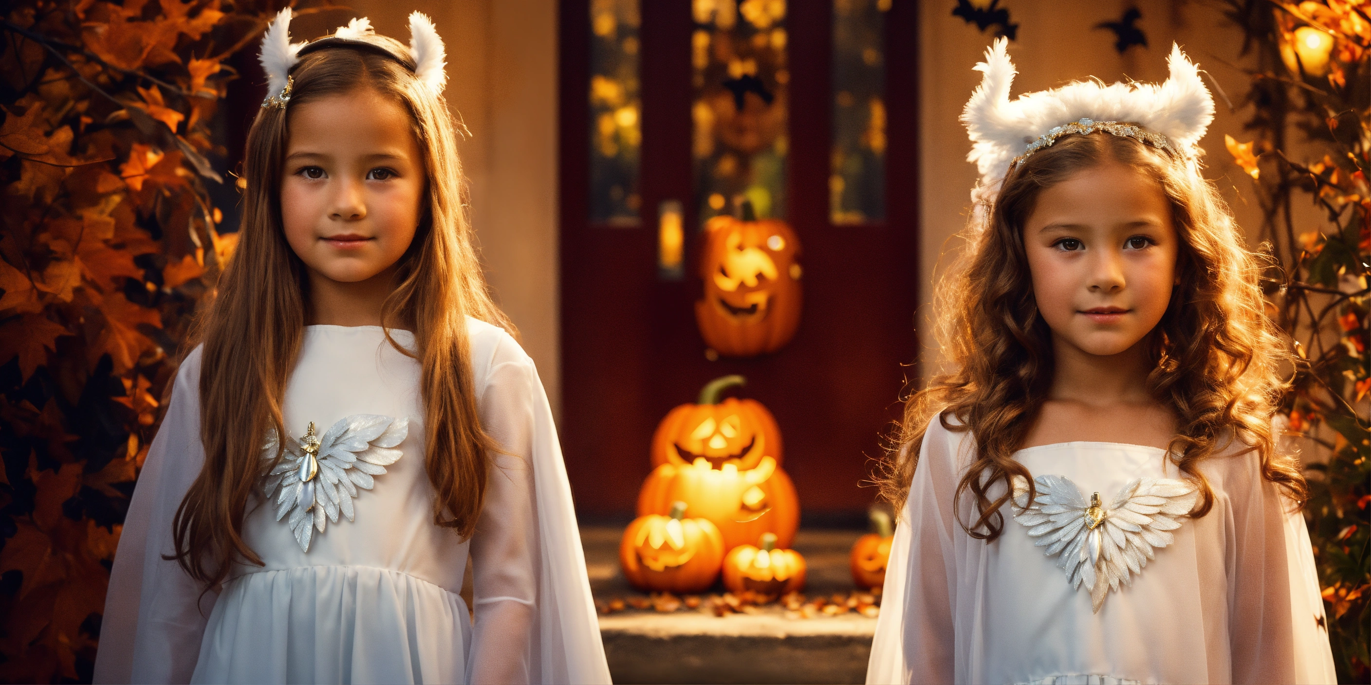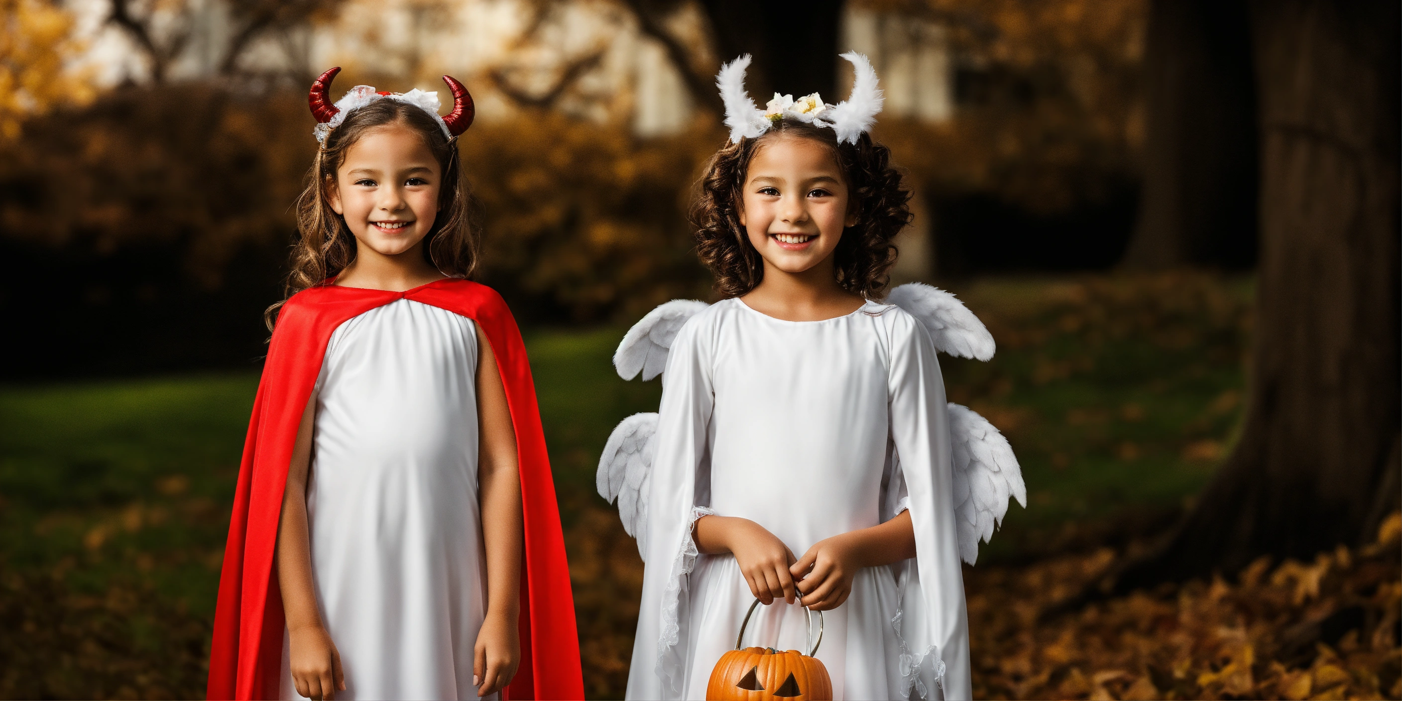 Two 10-year-old girls are trick-or-treating together. one is dressed as an angel, the other as a devil. realistic, full body render.