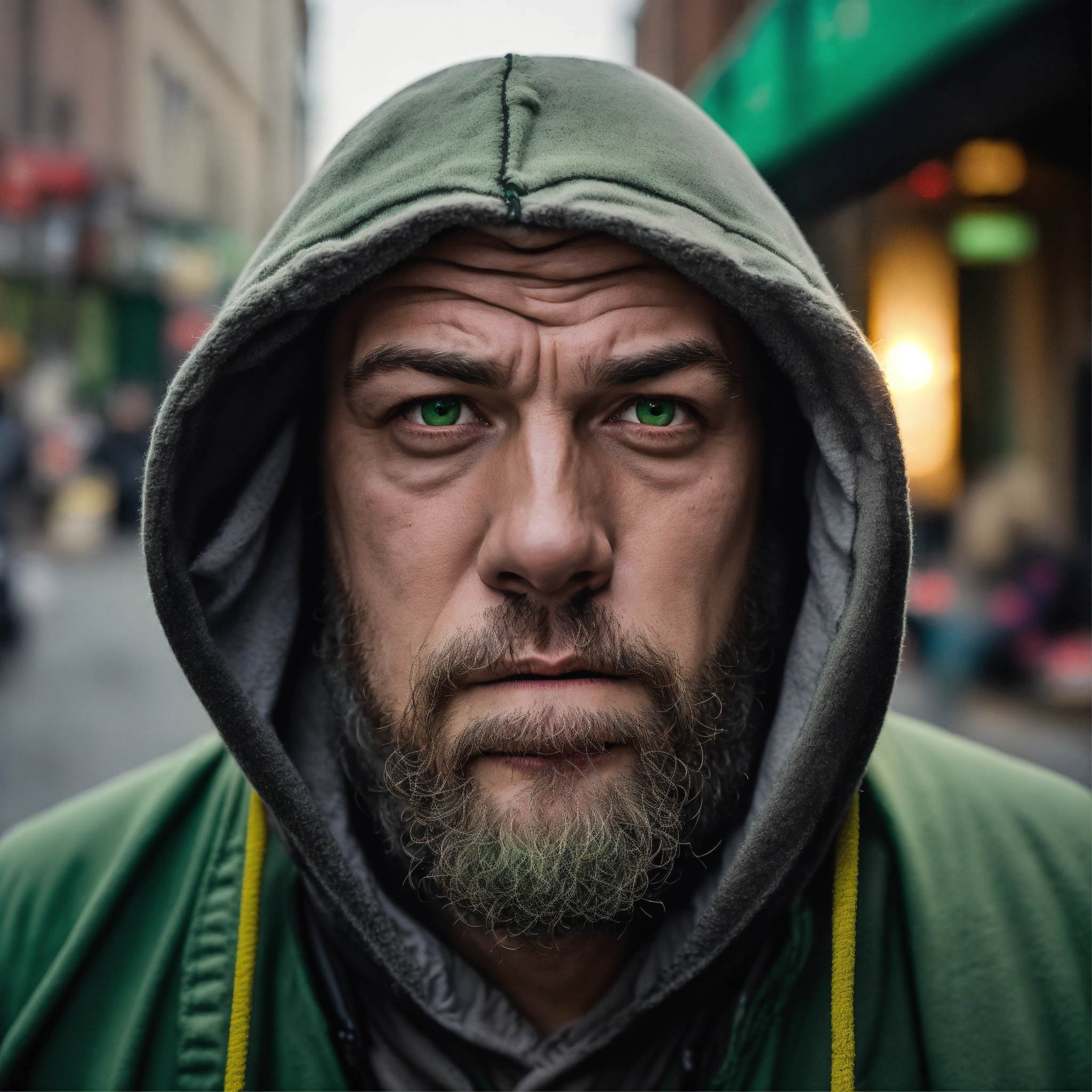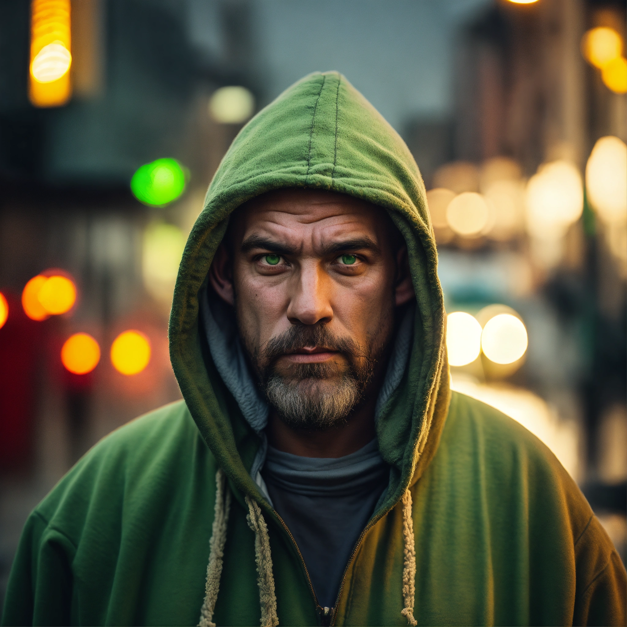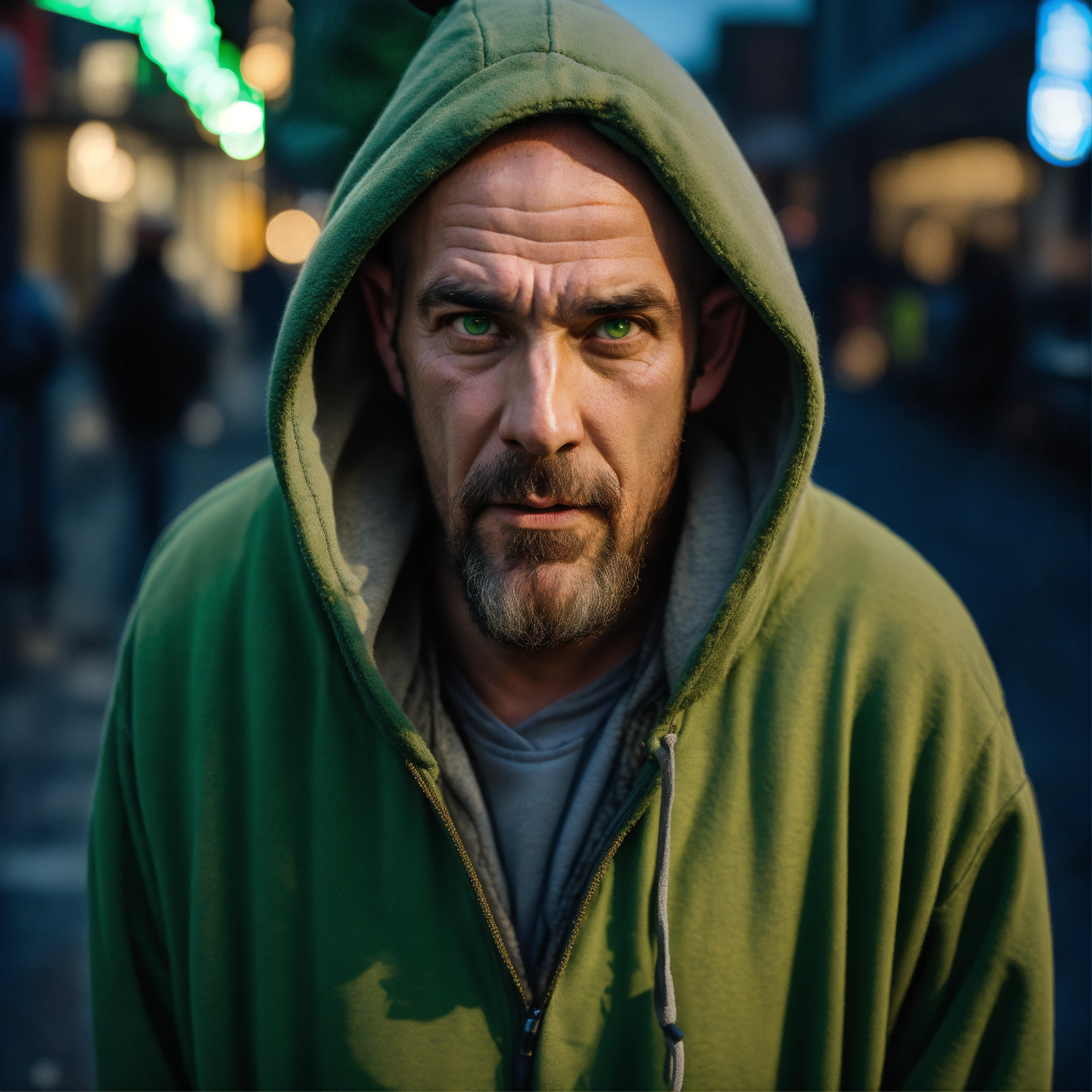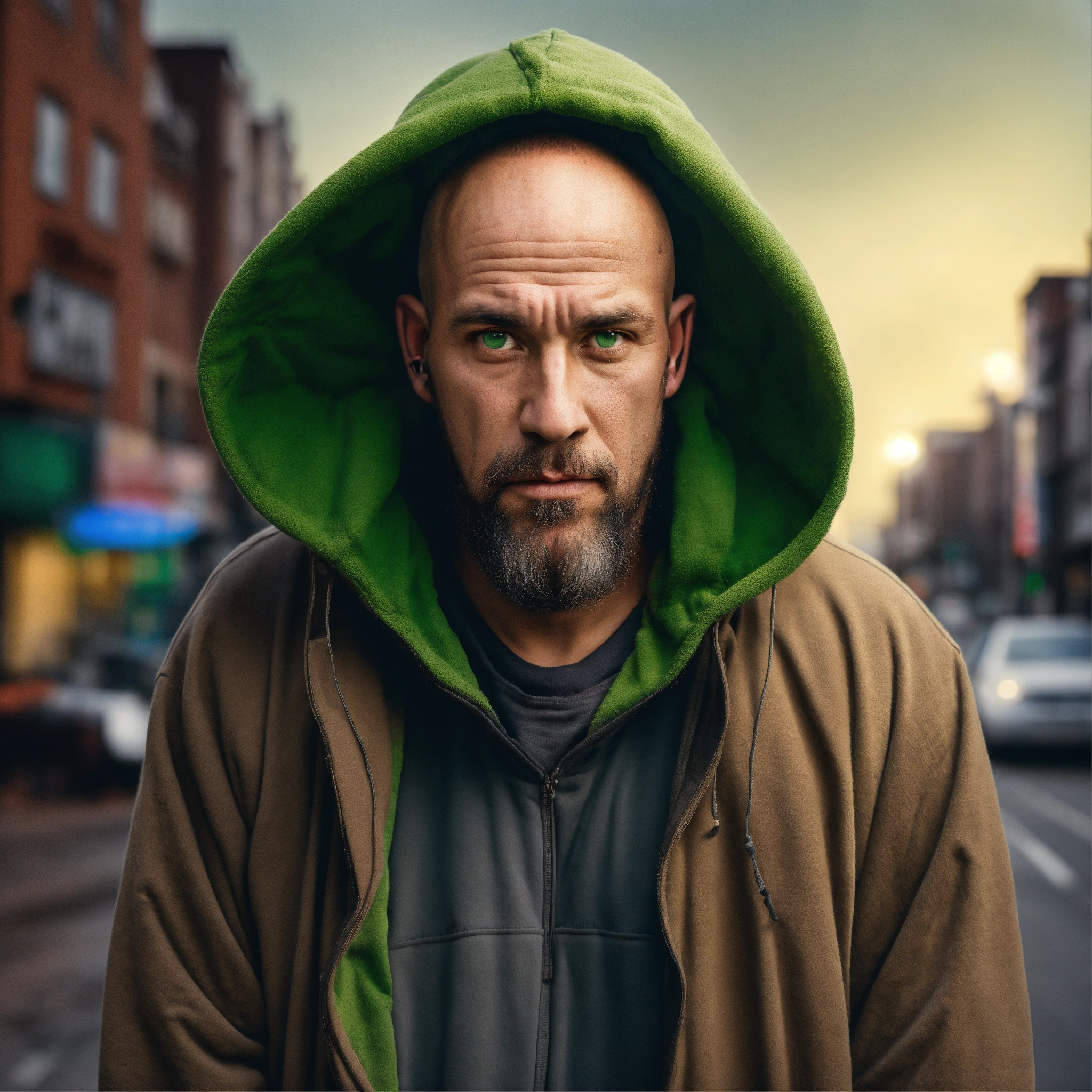 A homeless huge man with a huge lumpy bald head, a tiny goatee, protruding forehead, sunken light gray green eyes, crooked mouth, large ears, wearing a hoodie up over his head, standing in the street