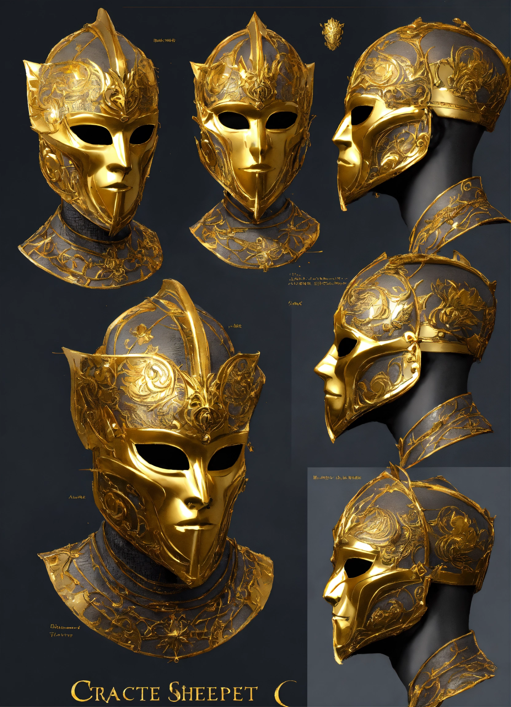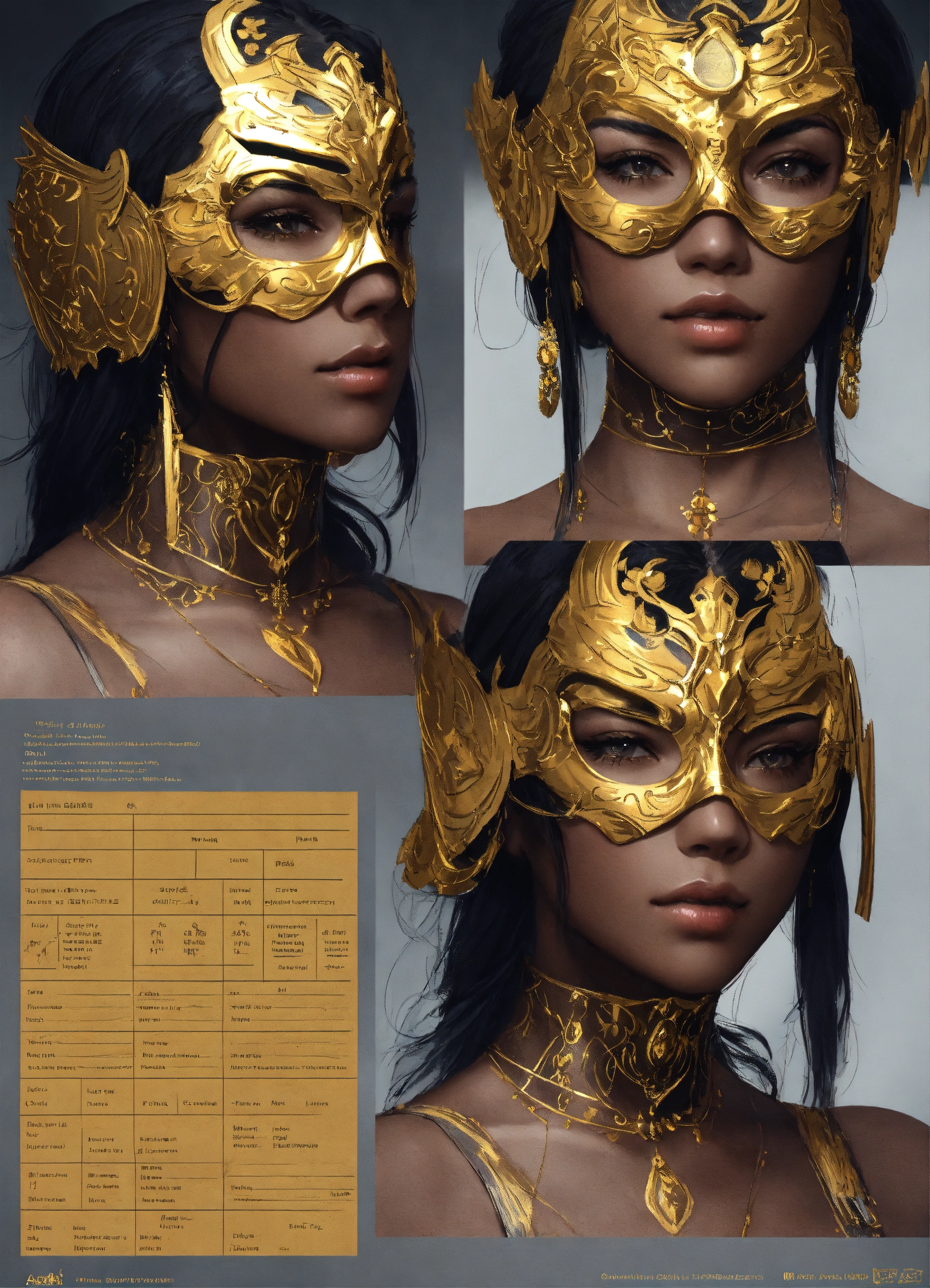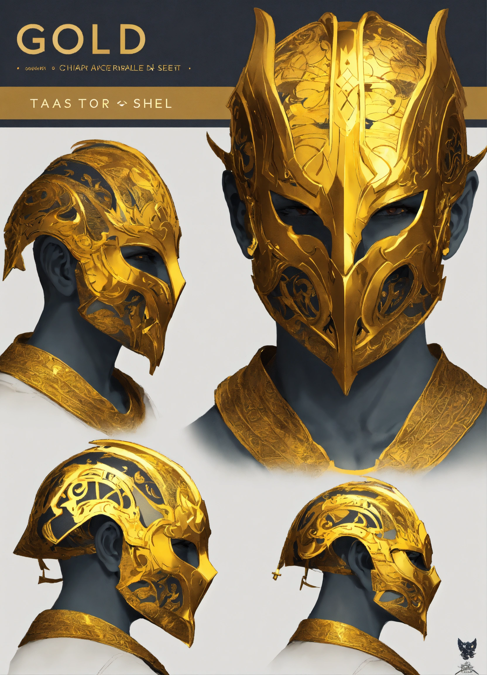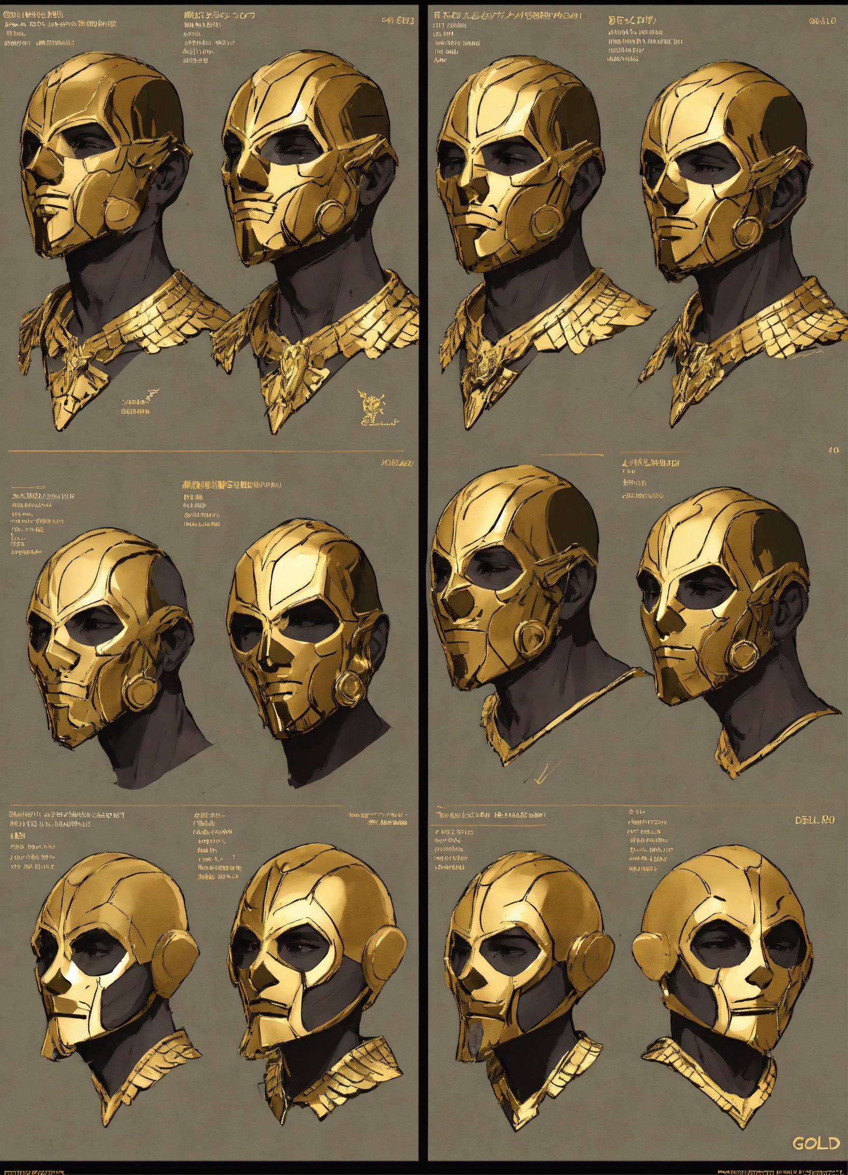 Gold tattoo mask, character sheet, character design, chart, reference sheet, multiple views, high detail, fine details, concept art