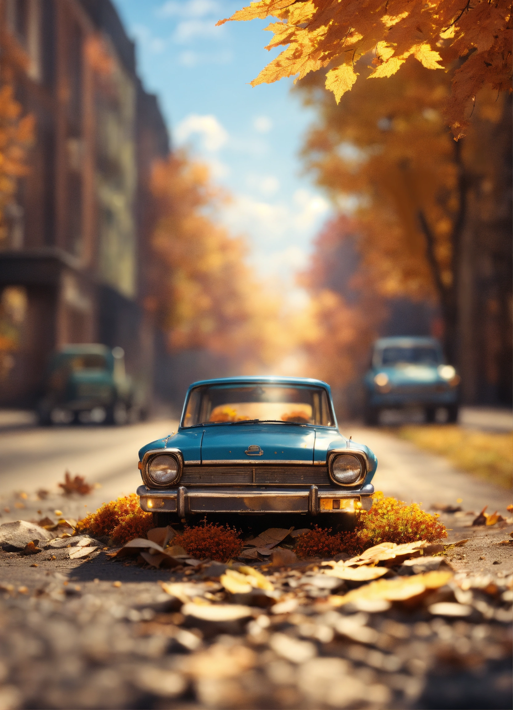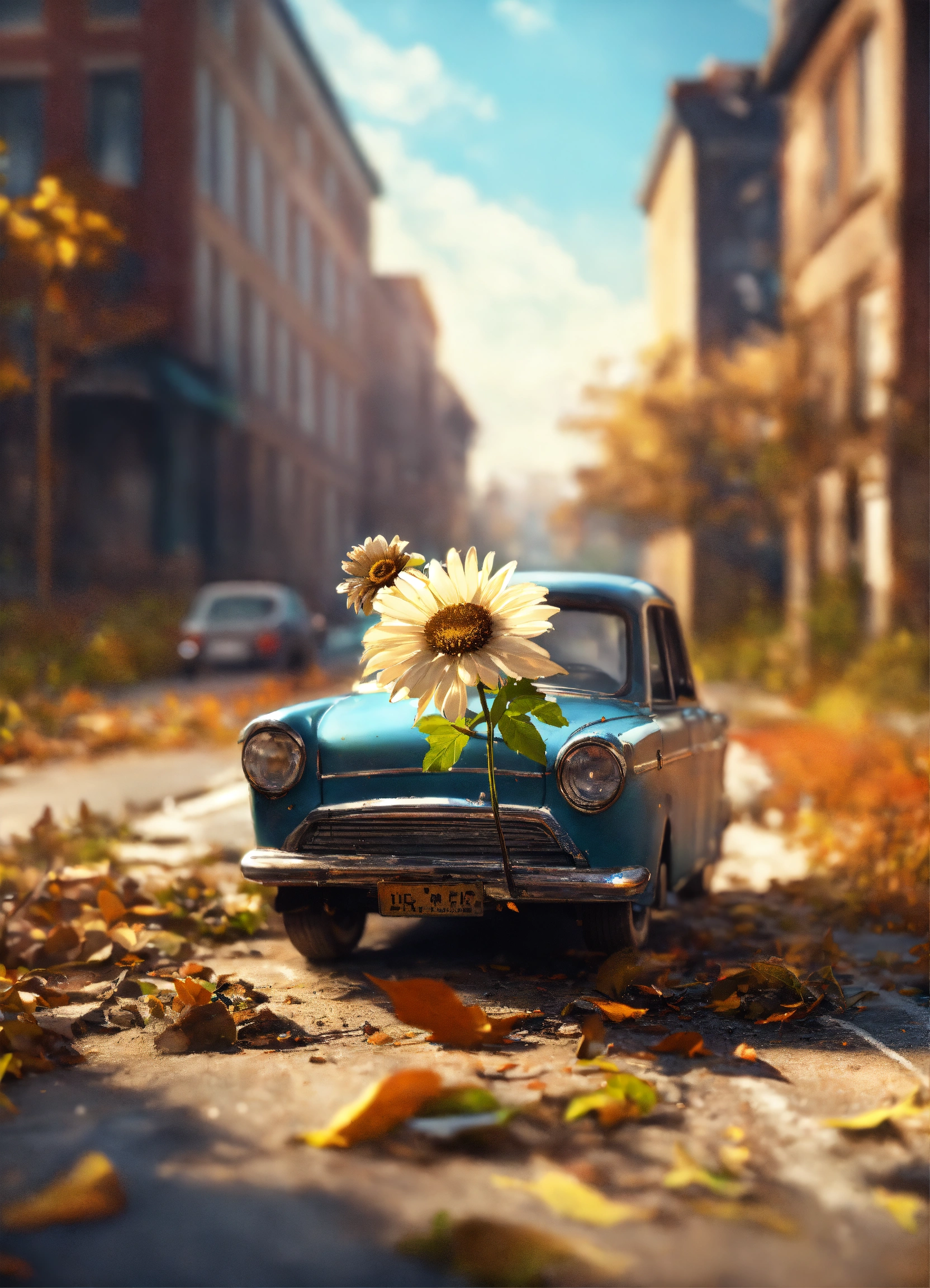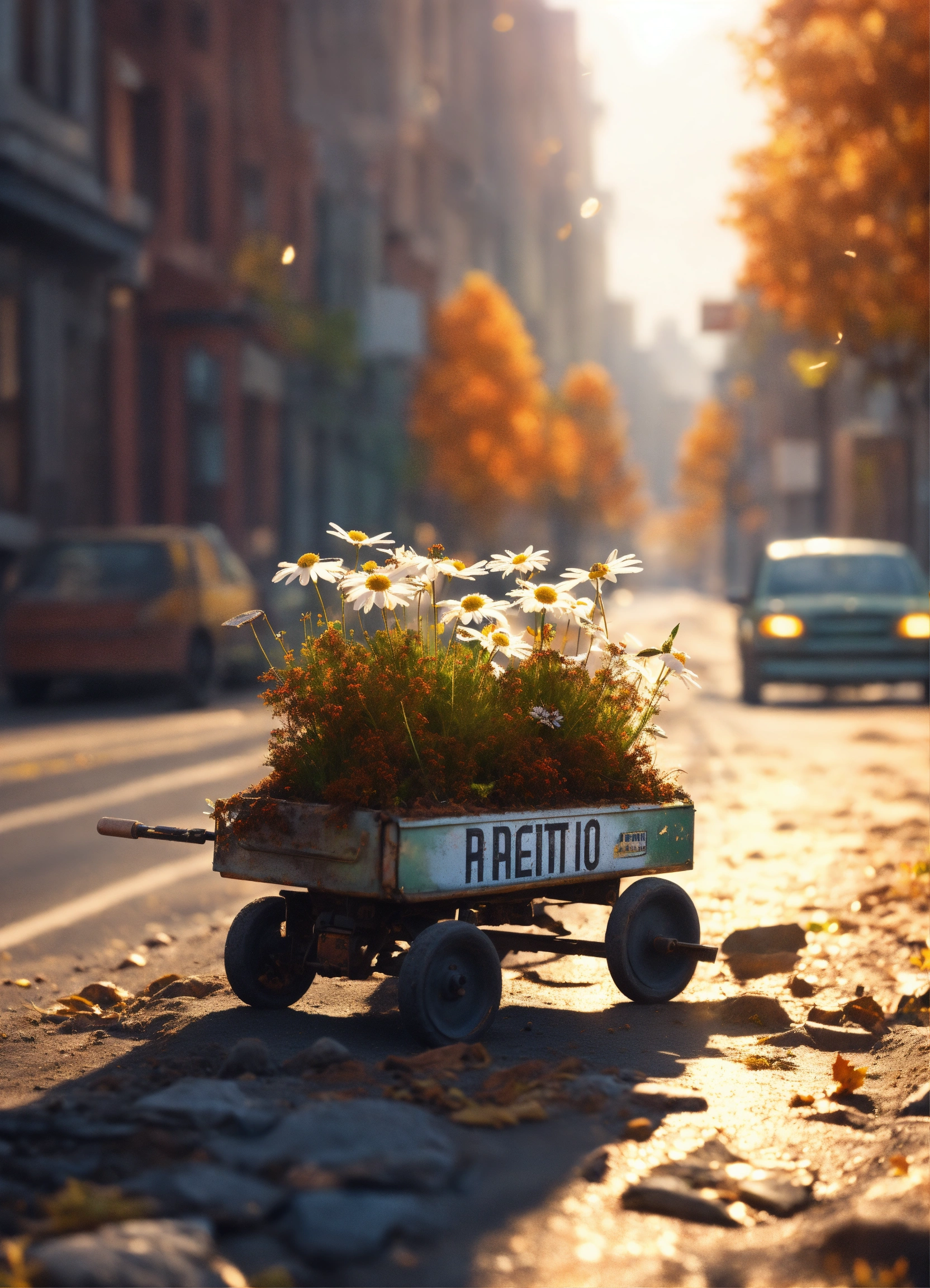 A matchbox full of dirt with a beautiful daisie planted in it, shining in the autumn sun on a road in an abandoned city, fiction, wallpaper, character, cg artwork, art, flash photography