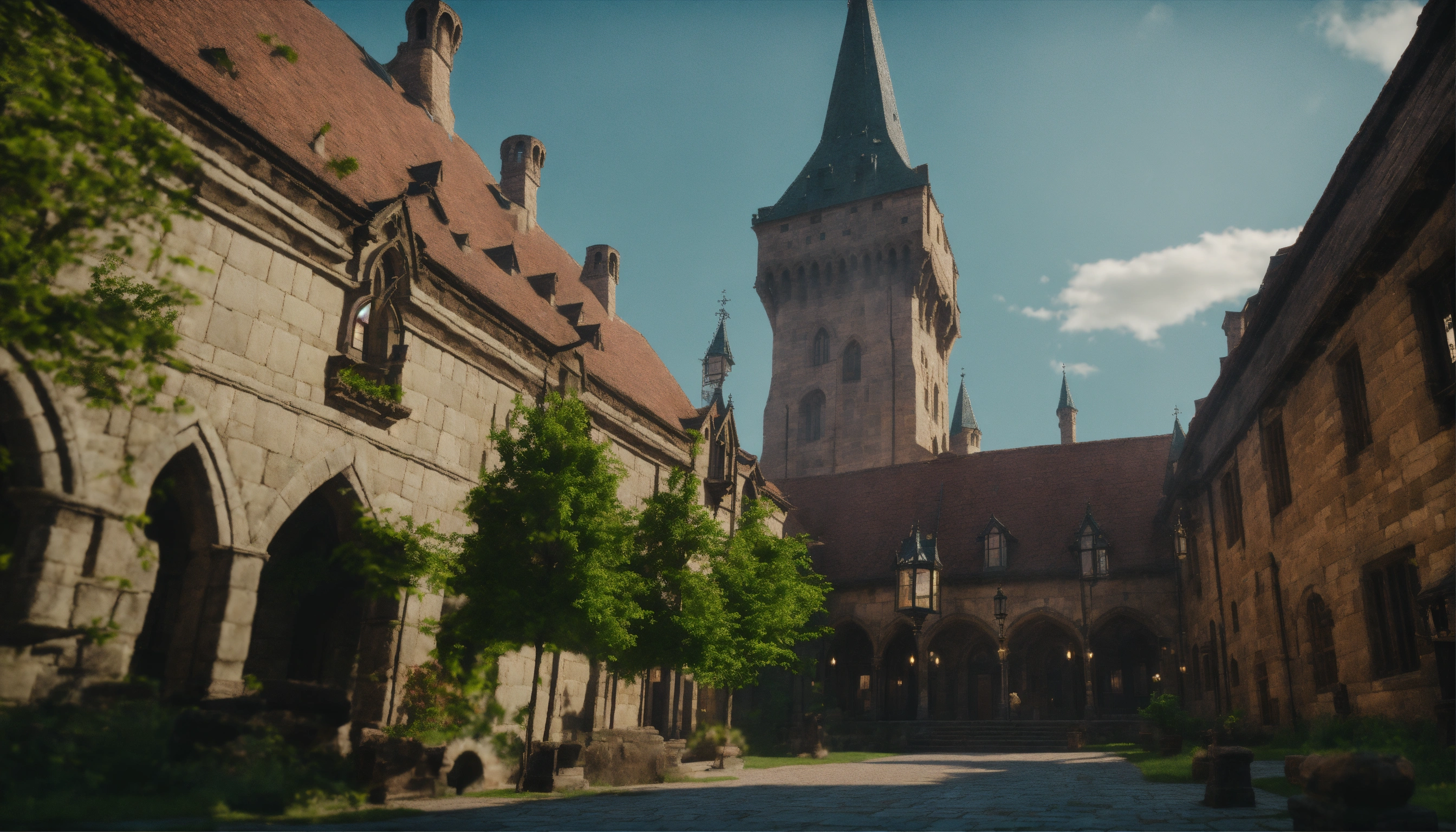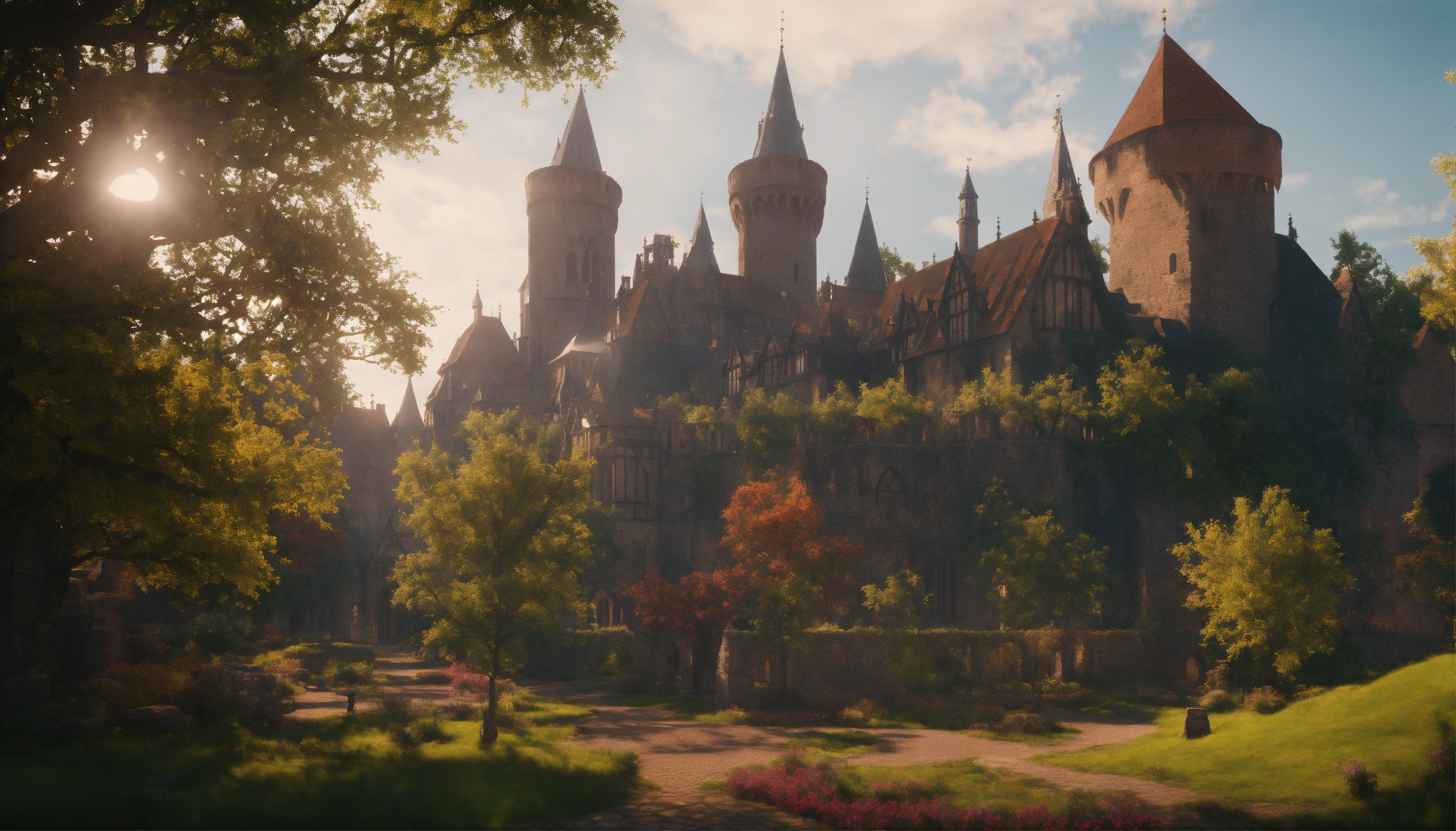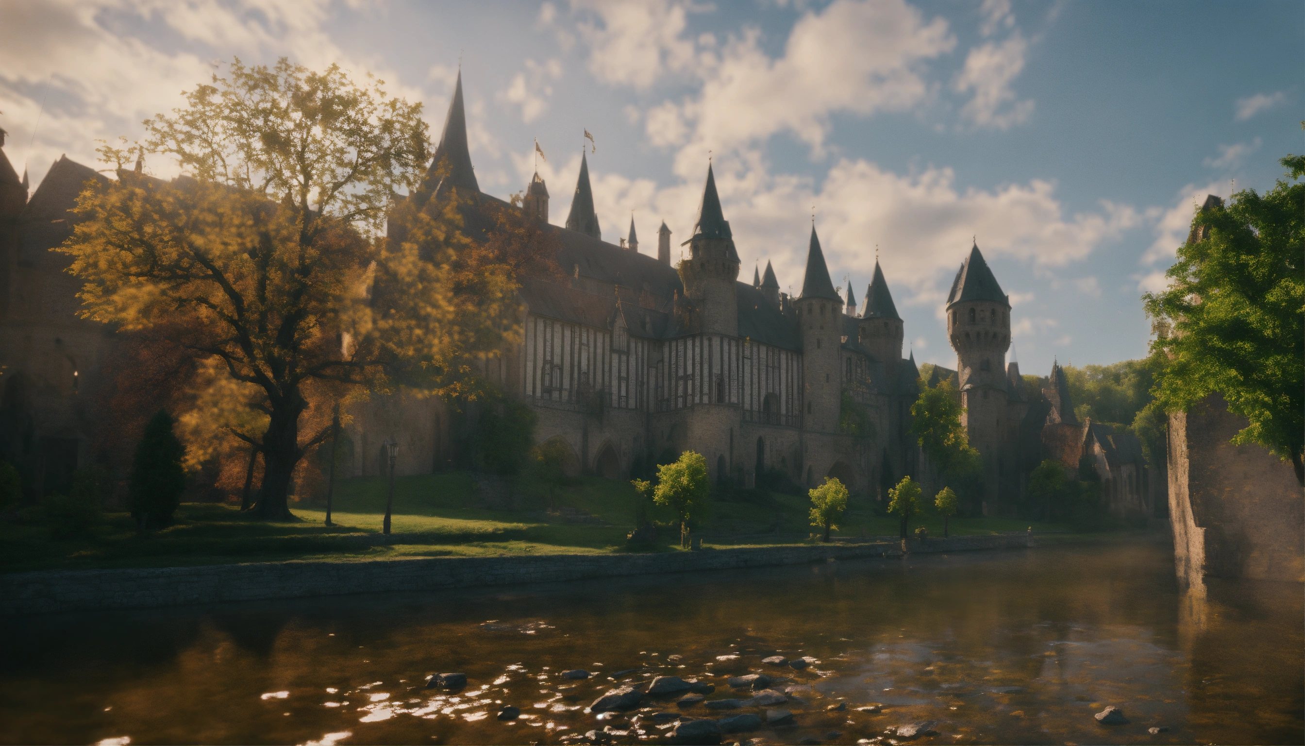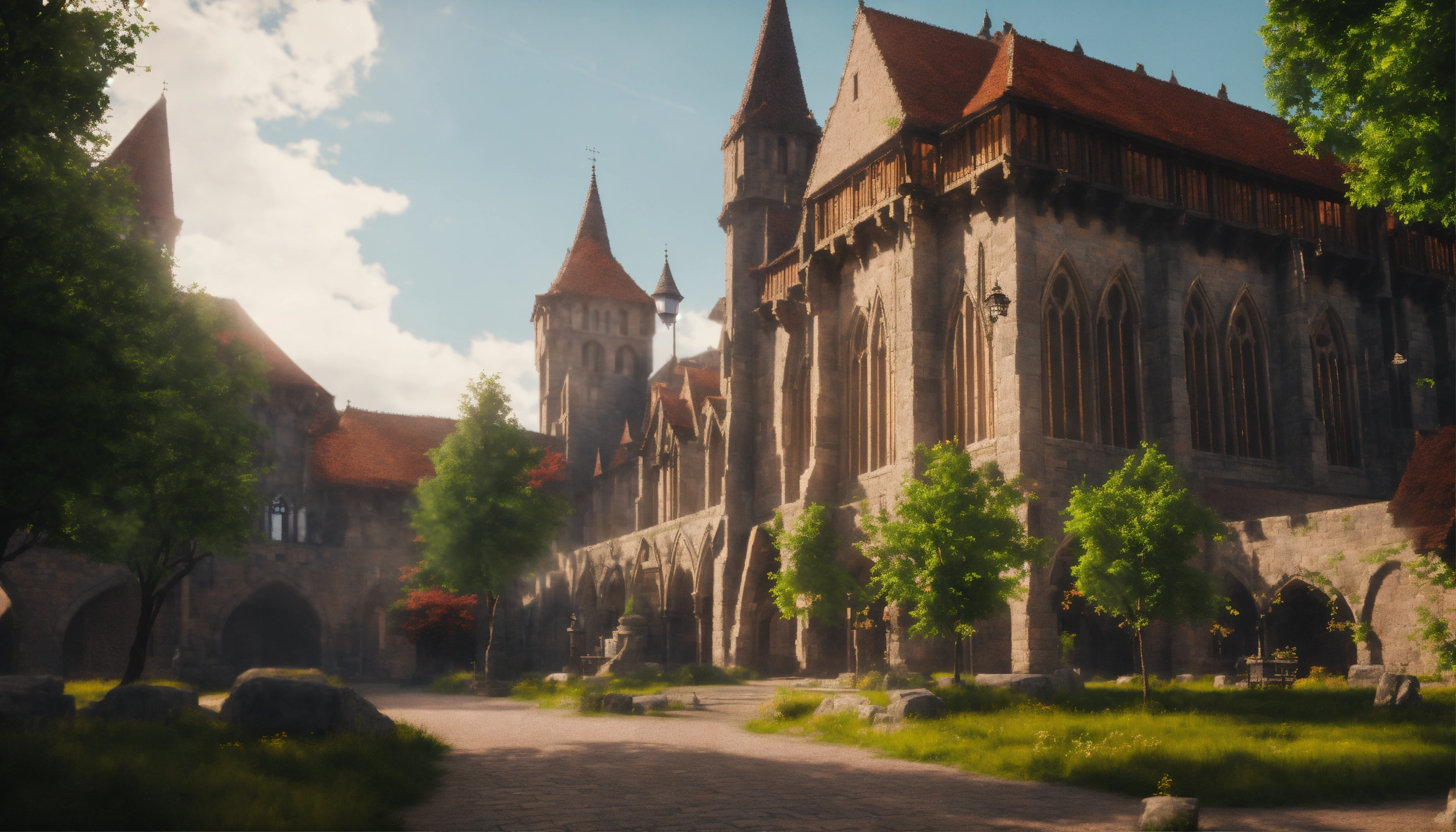 Wide shot of a beautiful d&d medieval city of stone brick and germanic architecture. a few trees in the landscape and one large palace with large stained glass windows. d&d, 4k, cinematic