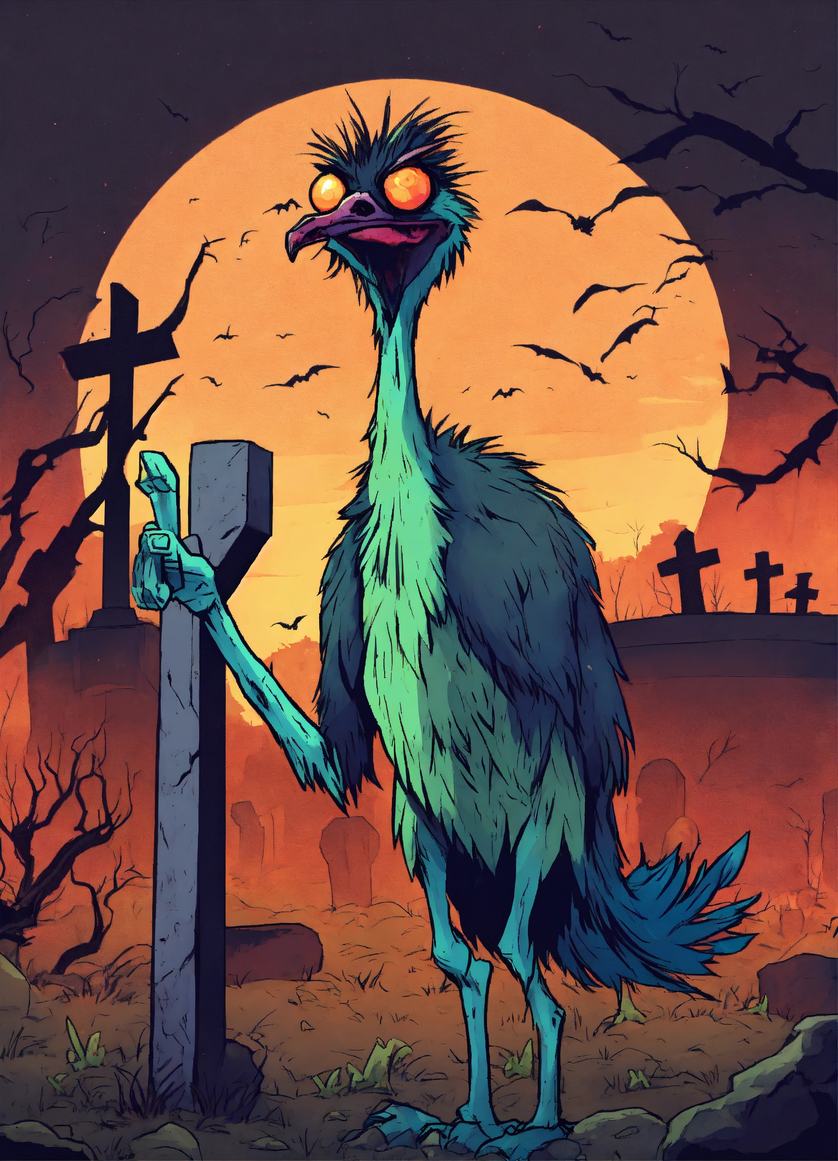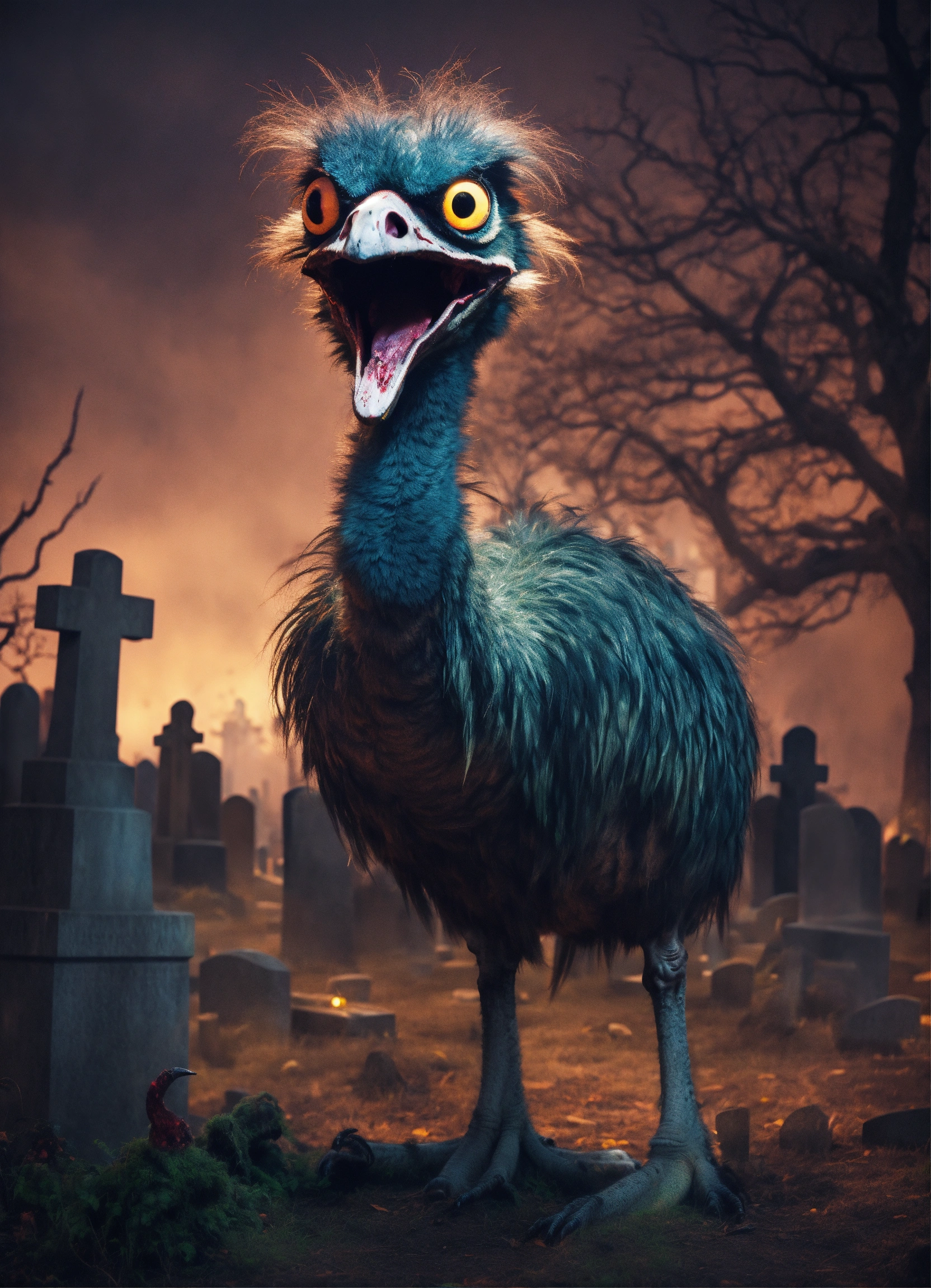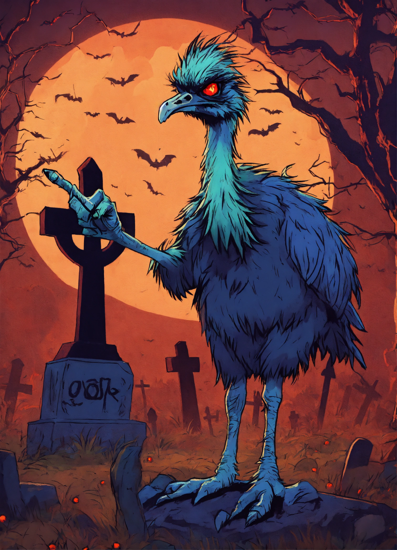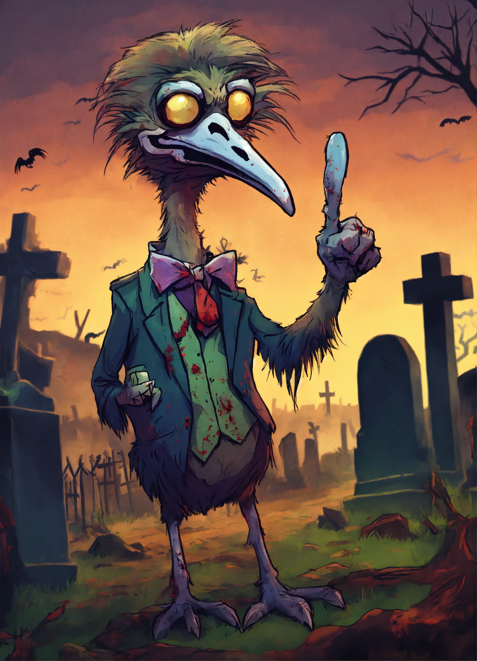 Angry zombie emu giving the middle finger in a spooky graveyard