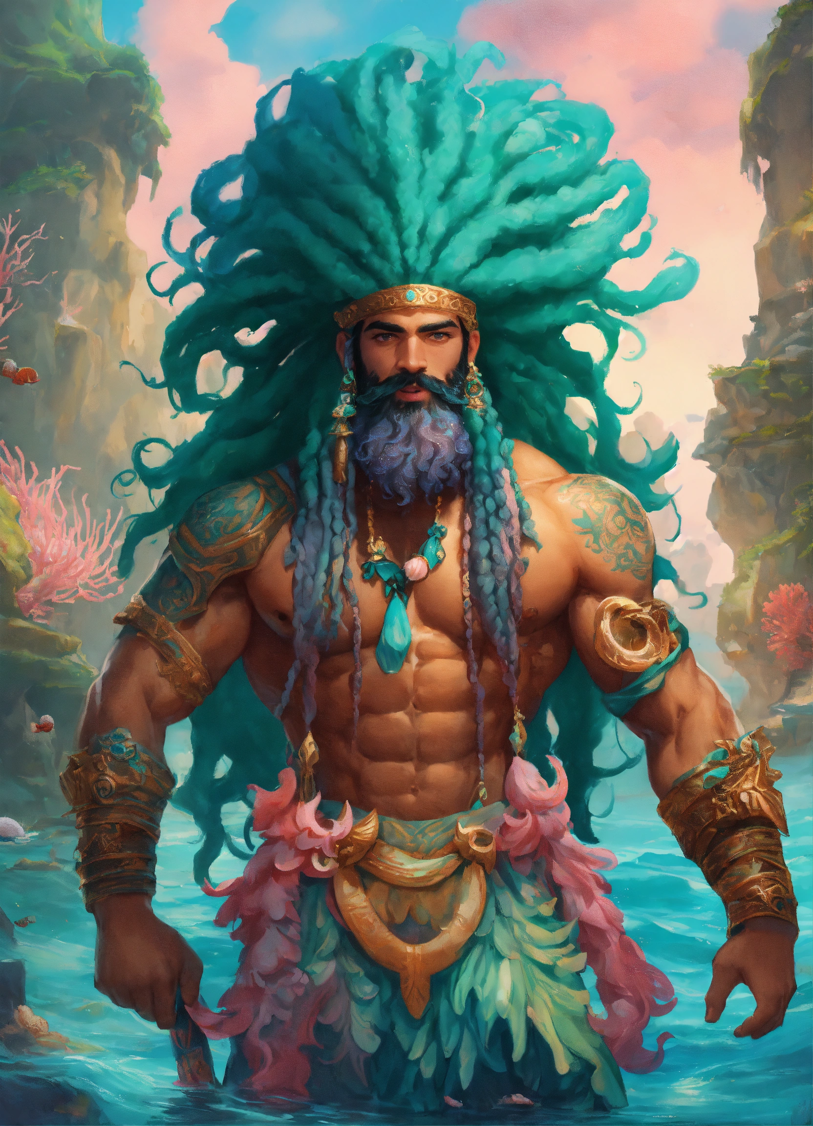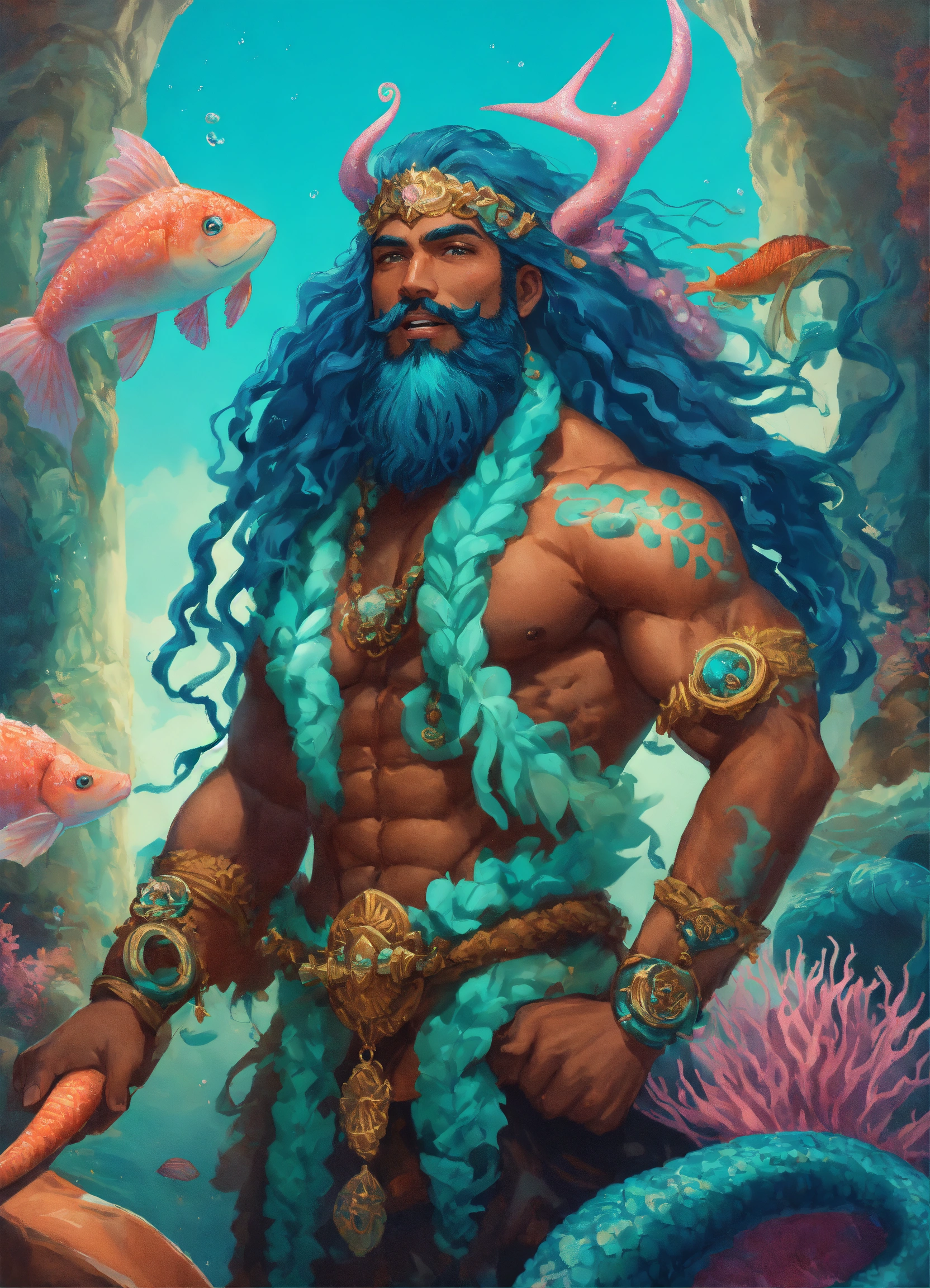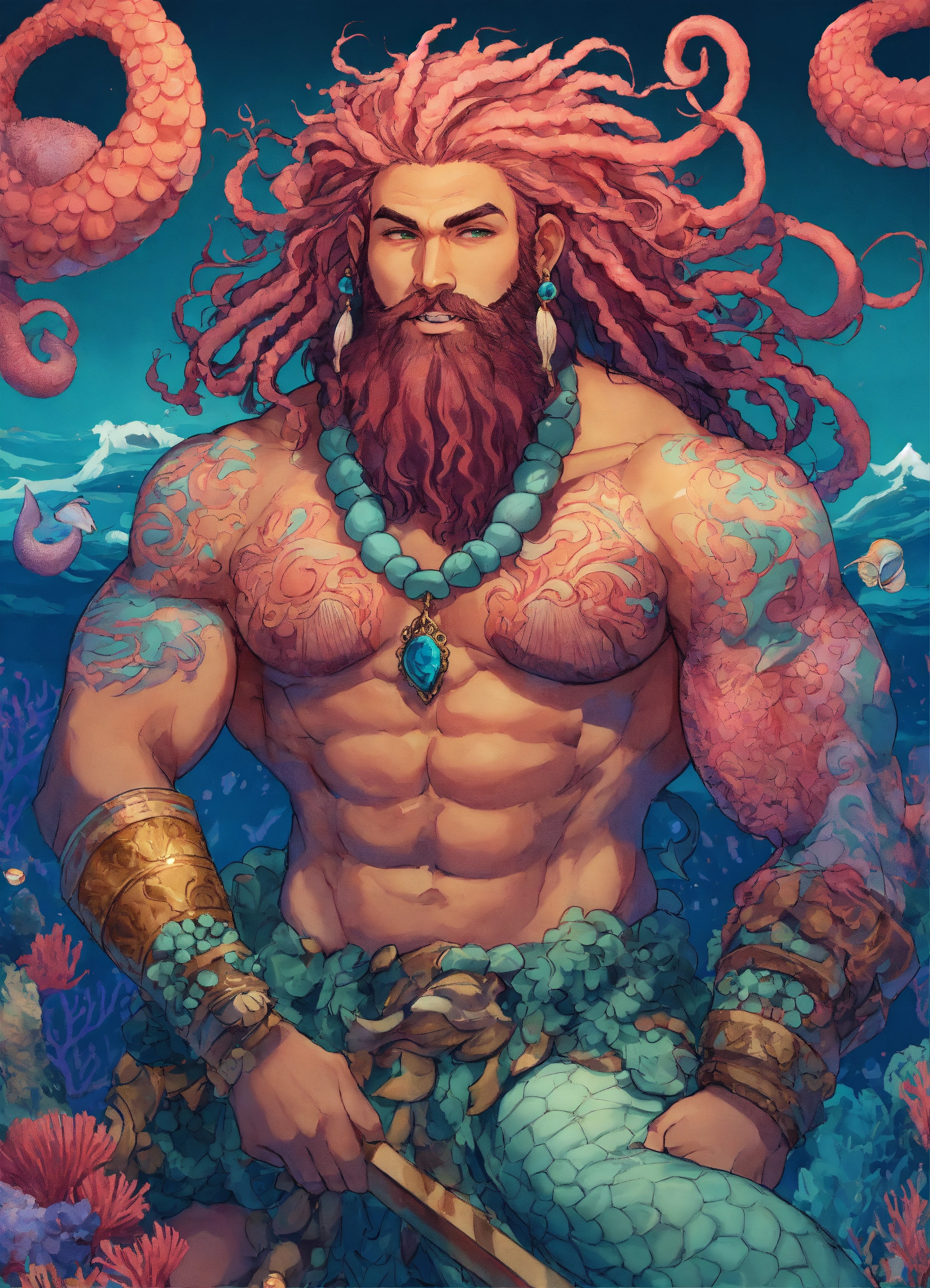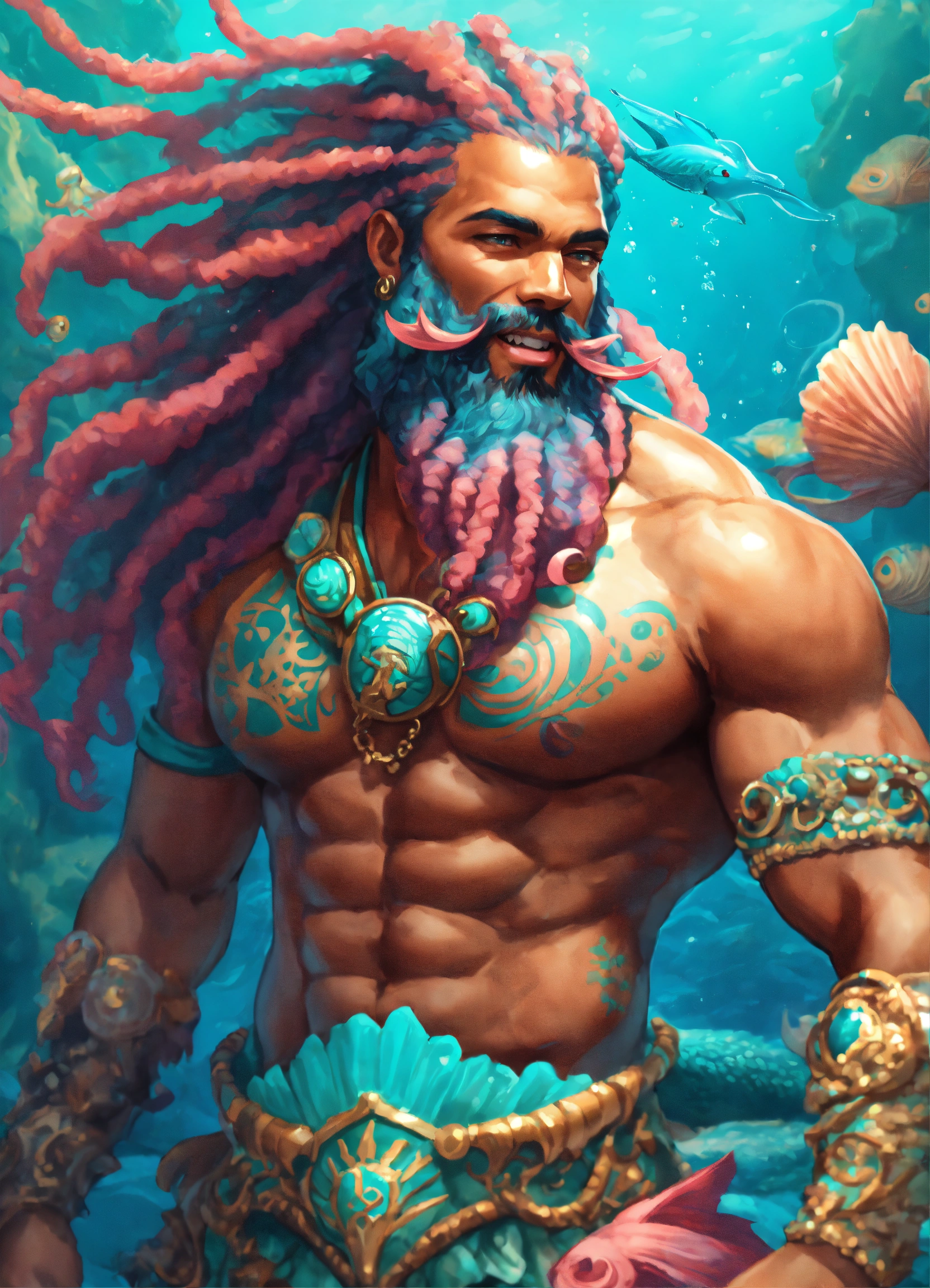 A buff muscular merman with scales blue skintone with pink coral splotches, long seafoam colored dreadlocks with shells in them matching full beard he has ornate rings on his hands wielding a crackling trident, infectious mirth bubbling from his lips polynesian aesthetics residing in the majestic coral palace, a buff muscular triton man with blue skin and pink coral coloration, long seafoam colored dreadlocks with shells in them and a matching full beard he has ornate rings on his hands, jovial toothy laugh