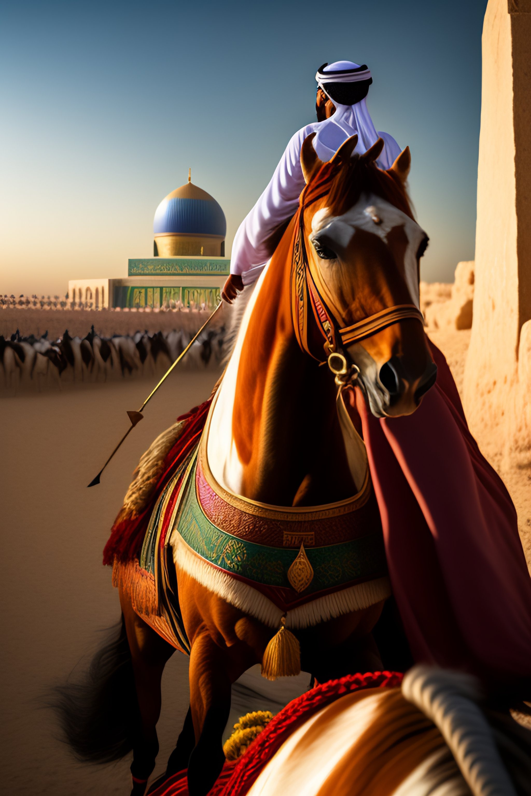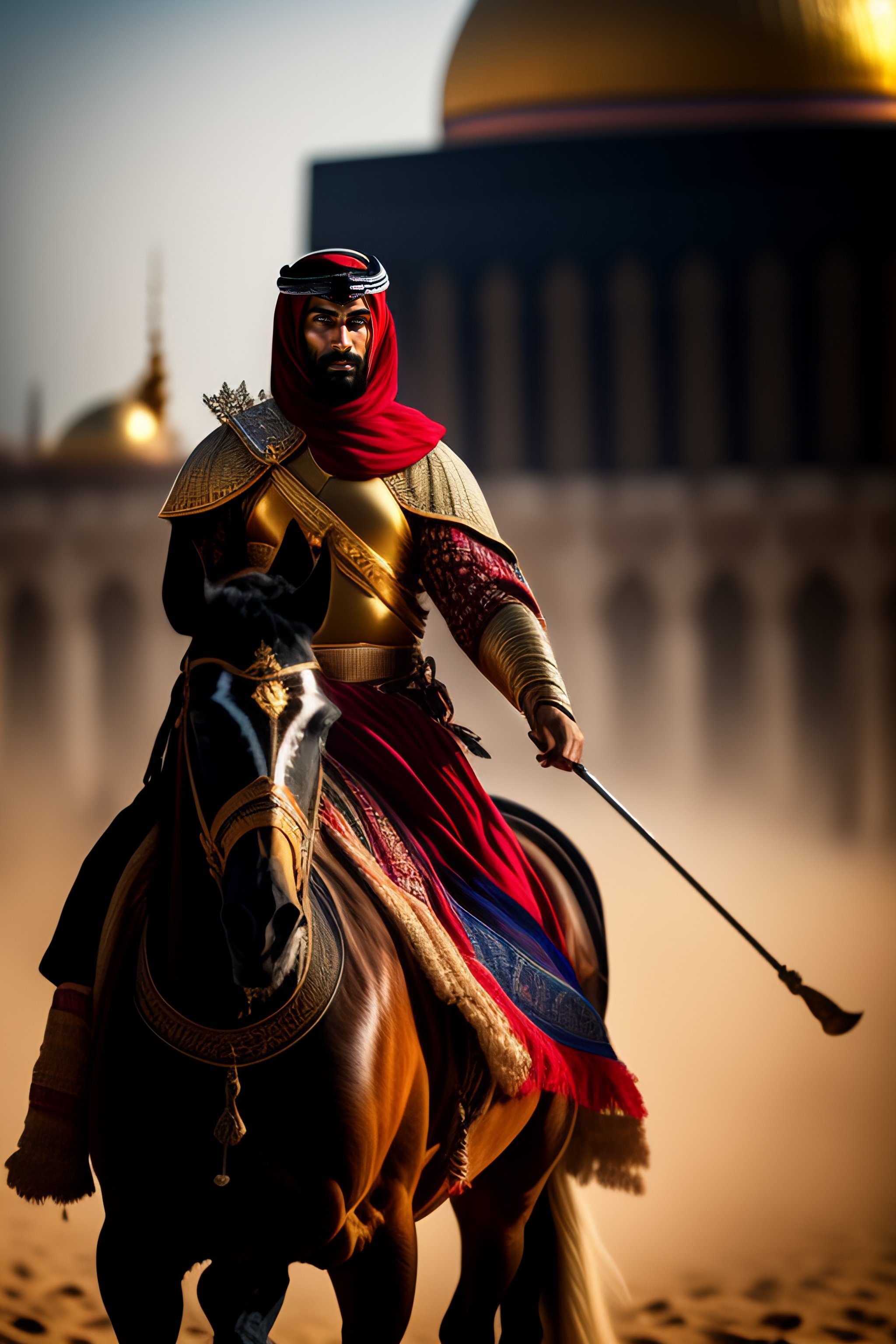 Palestinian warrior, arabic warrior, 1000, epic, 50mm lense, life like, riding an arabian horse, bright, dome of rock, battle, end of time, war, running horse