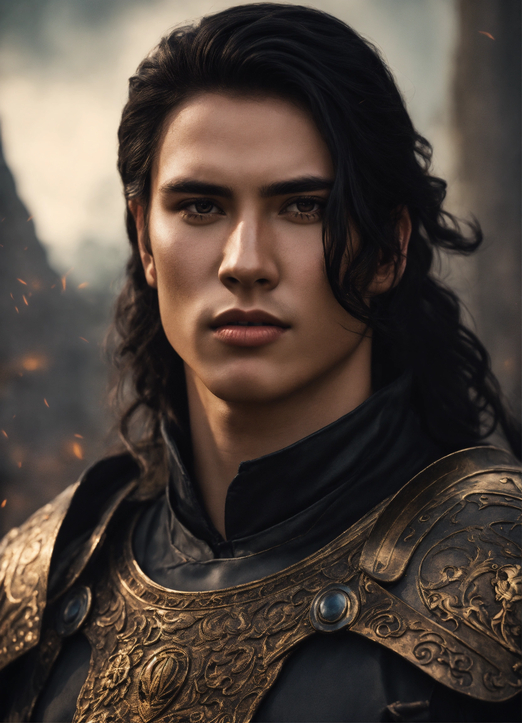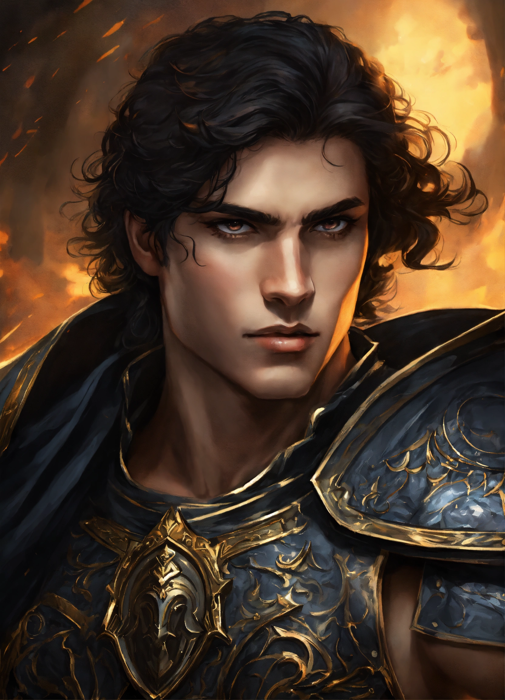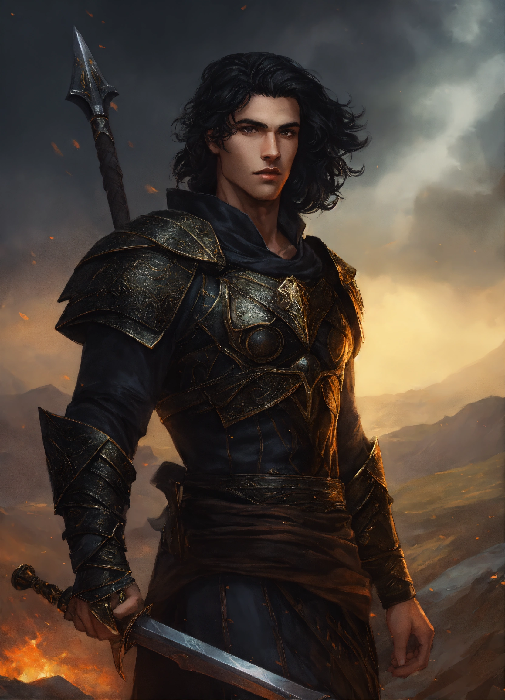 Heroic fantasy black warrior with dark hair and dark eyes and twenty-eight years old
