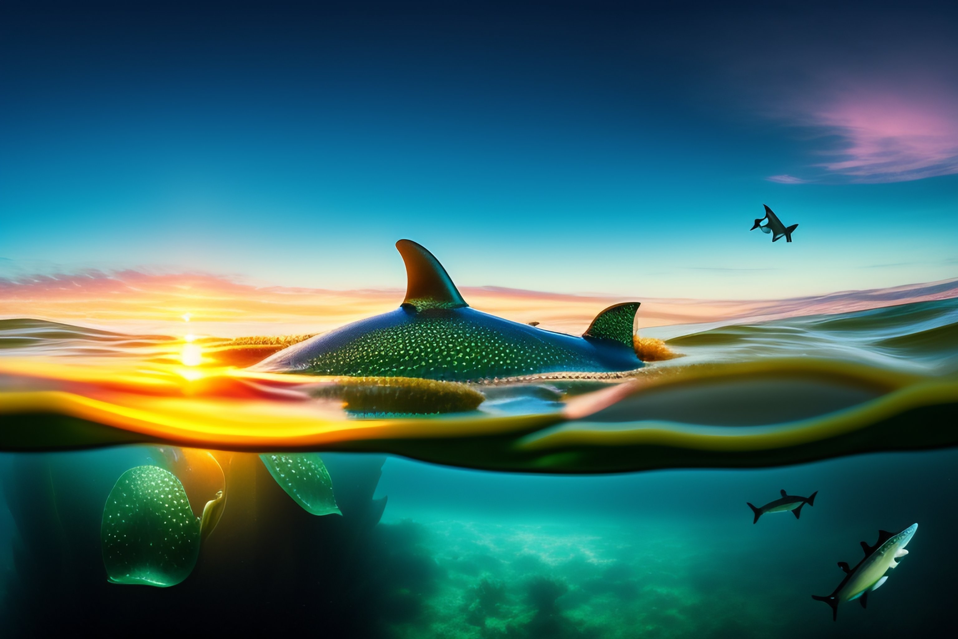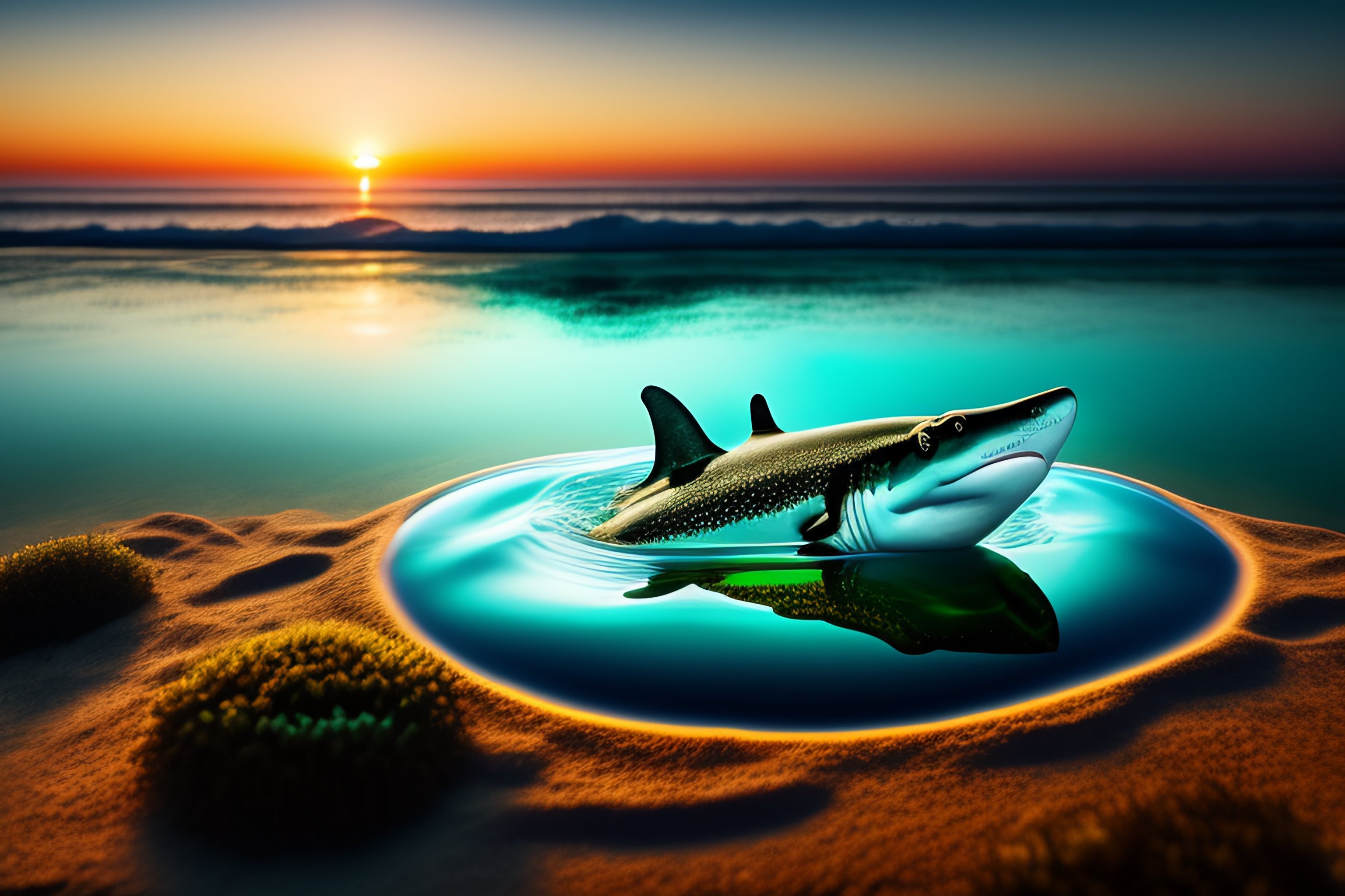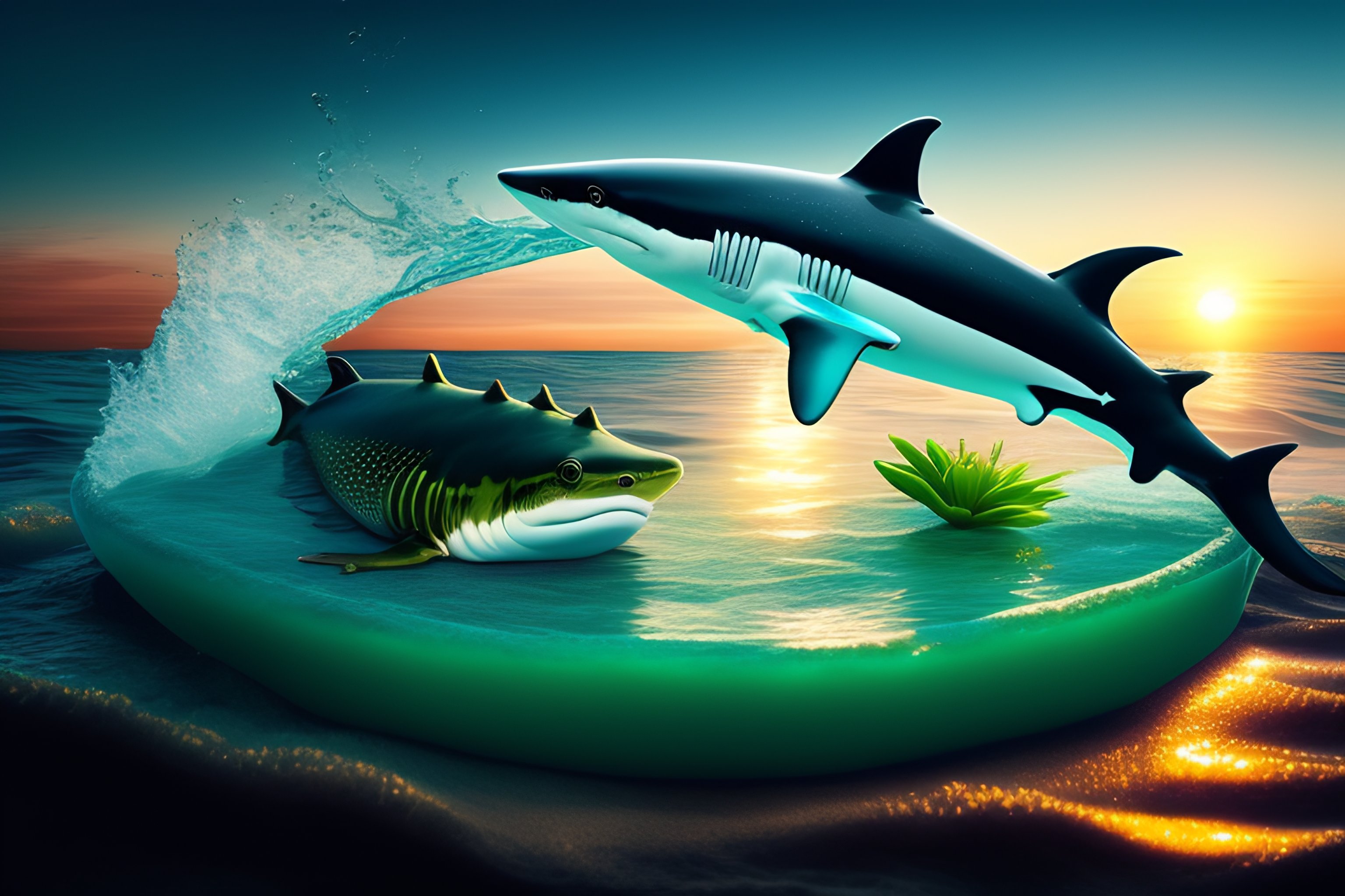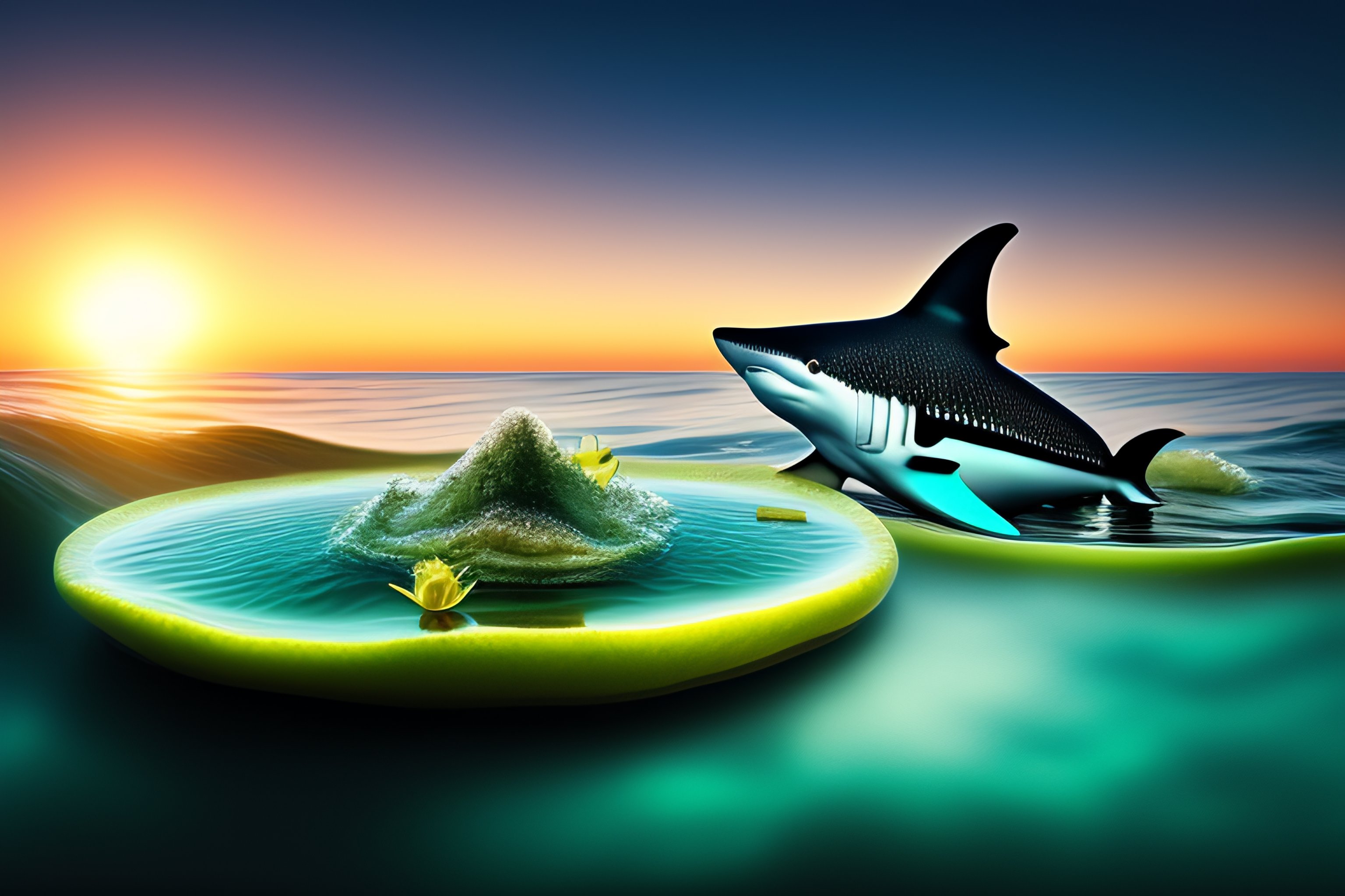 Shark attack with frog on a lily pad in the ocean at sunrise