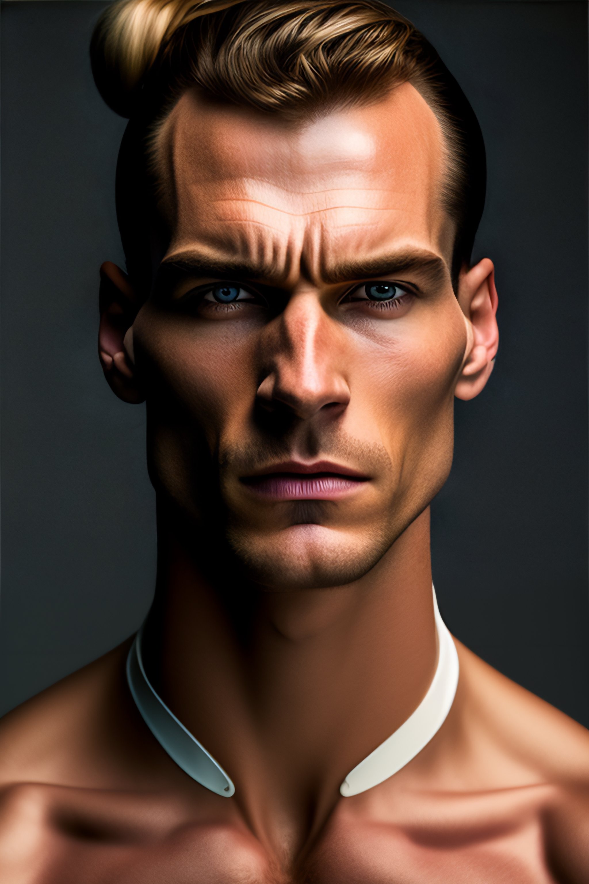 Beautiful studio photograph of colorful portrait photography one caucasian men with square glasses and bun, beautiful symmetrical face accurate face detailed face realistic proportions by ron mueck and matthew barney and greg rutkowski, hysterical realism intense cinematic lighting shocking detail 8 k, hyperrealistic, realistic light and shadows