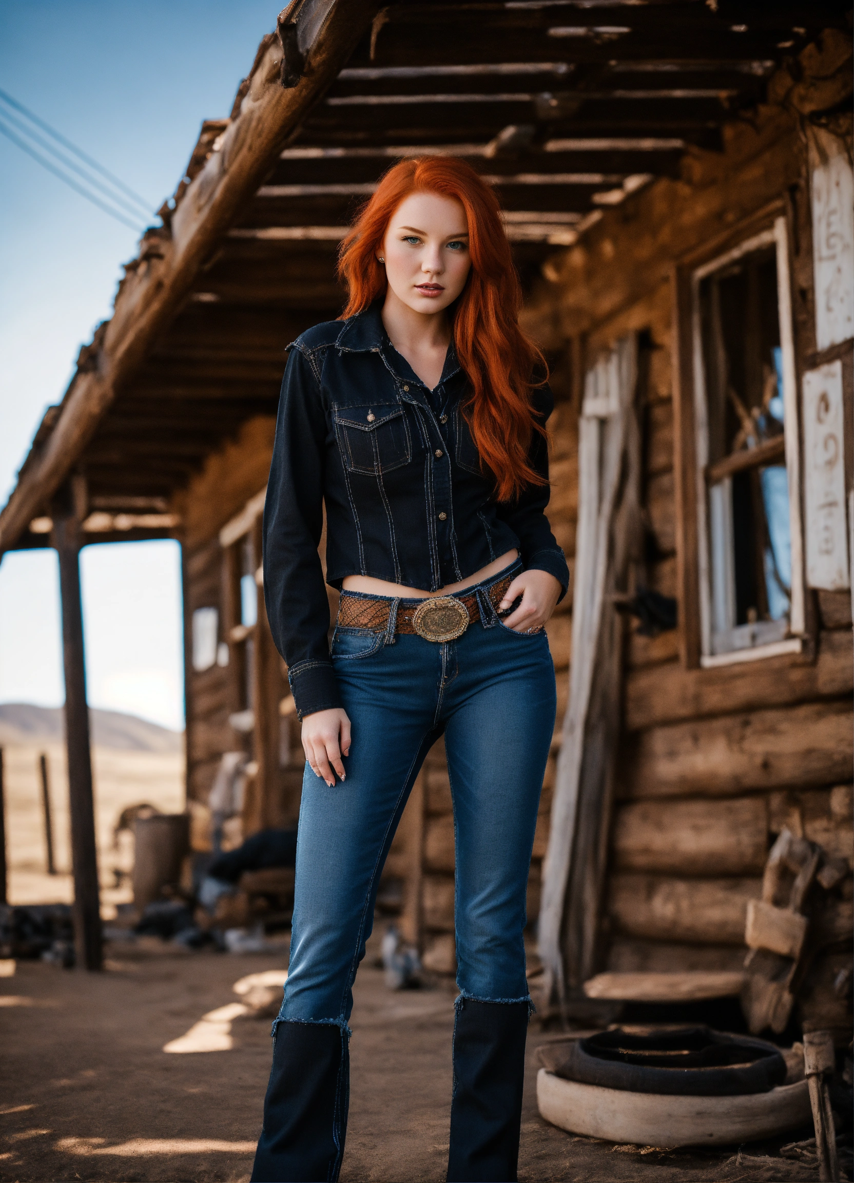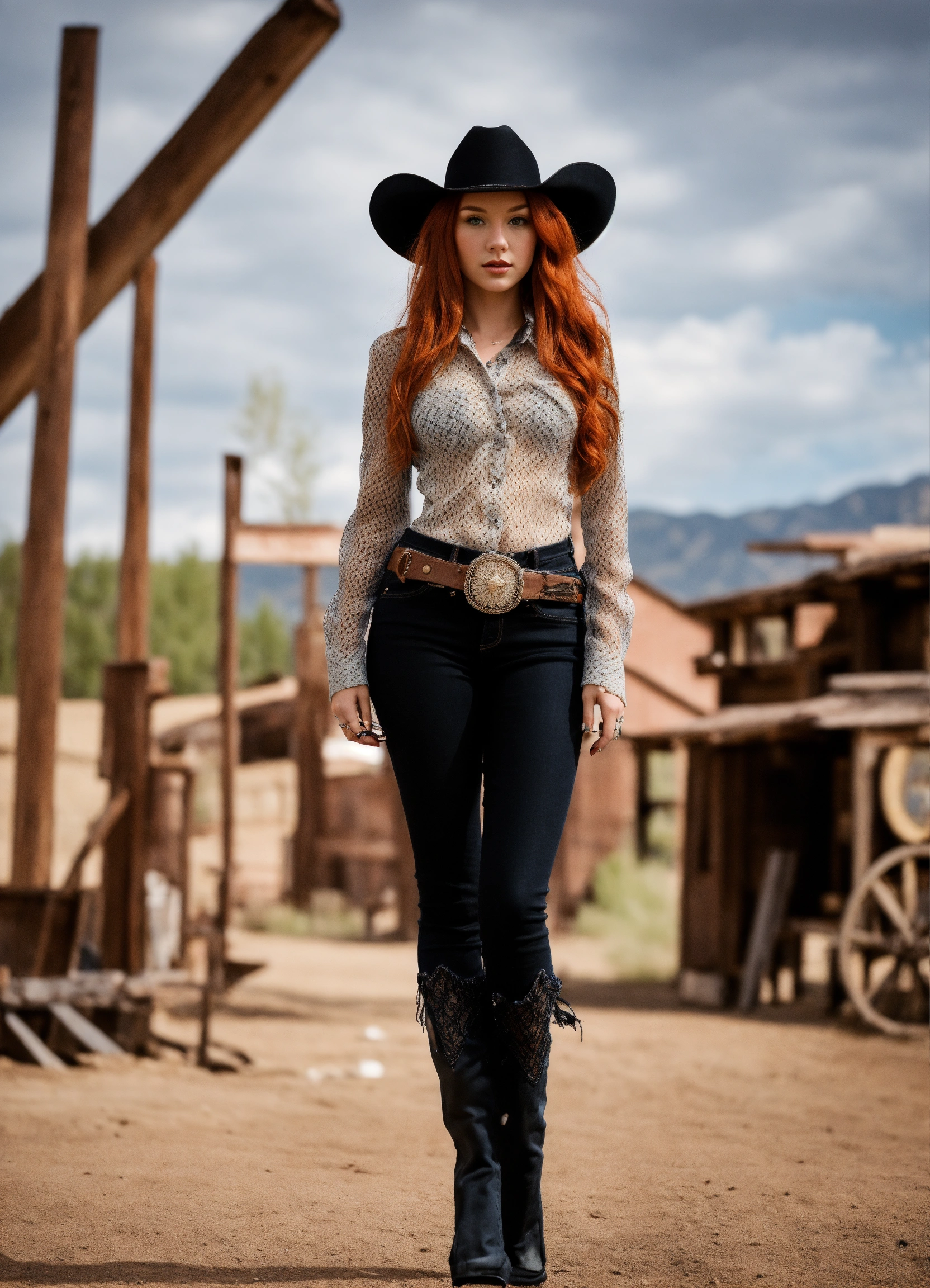 A real photo of a hot 25 year old redhead cowgirl, she is wearing a fishnet and black denim pants, she stands in a very old western alien town