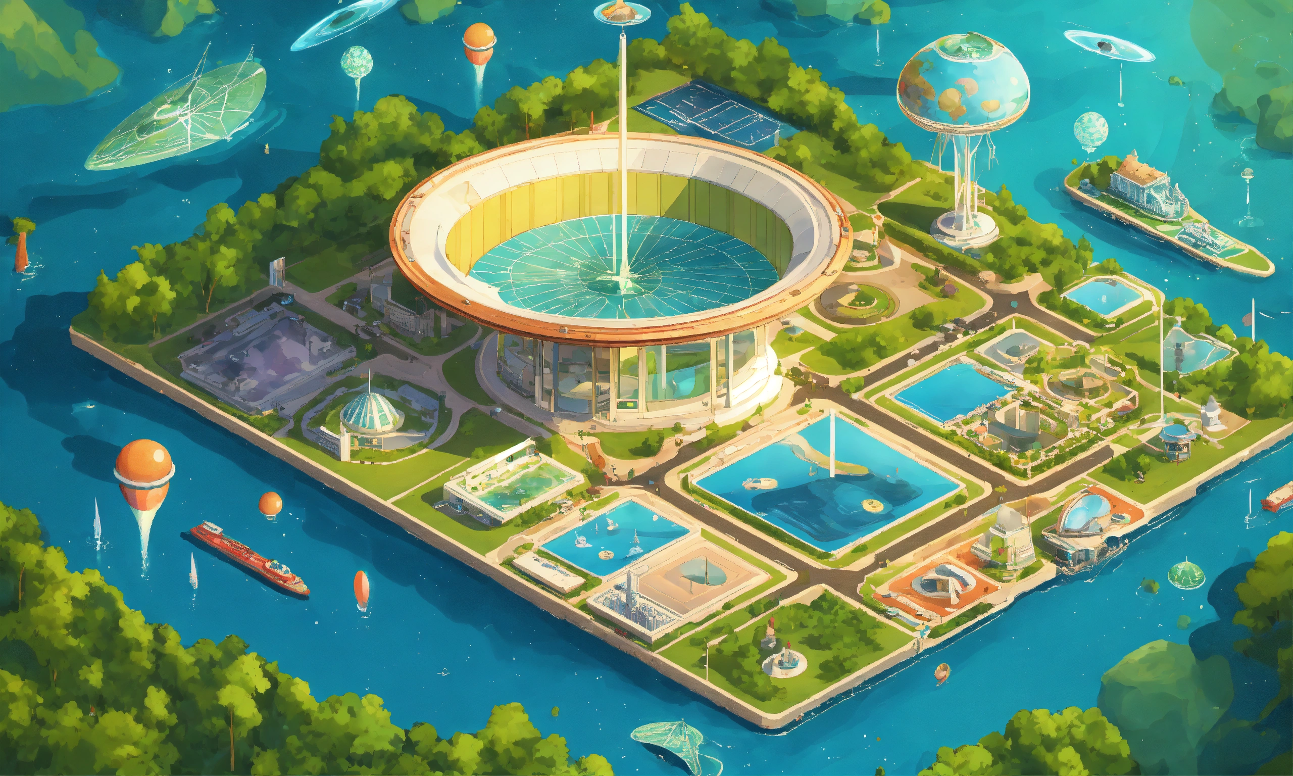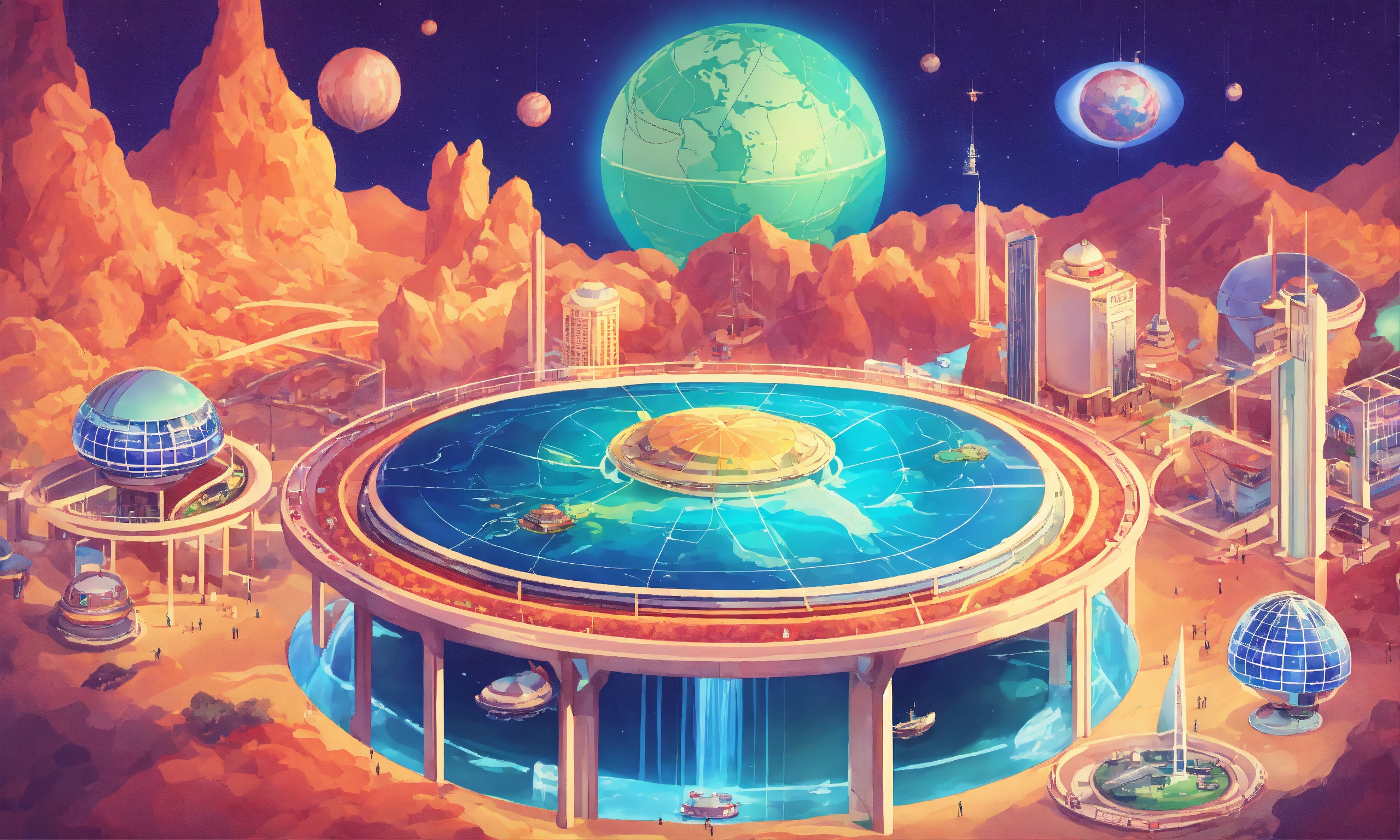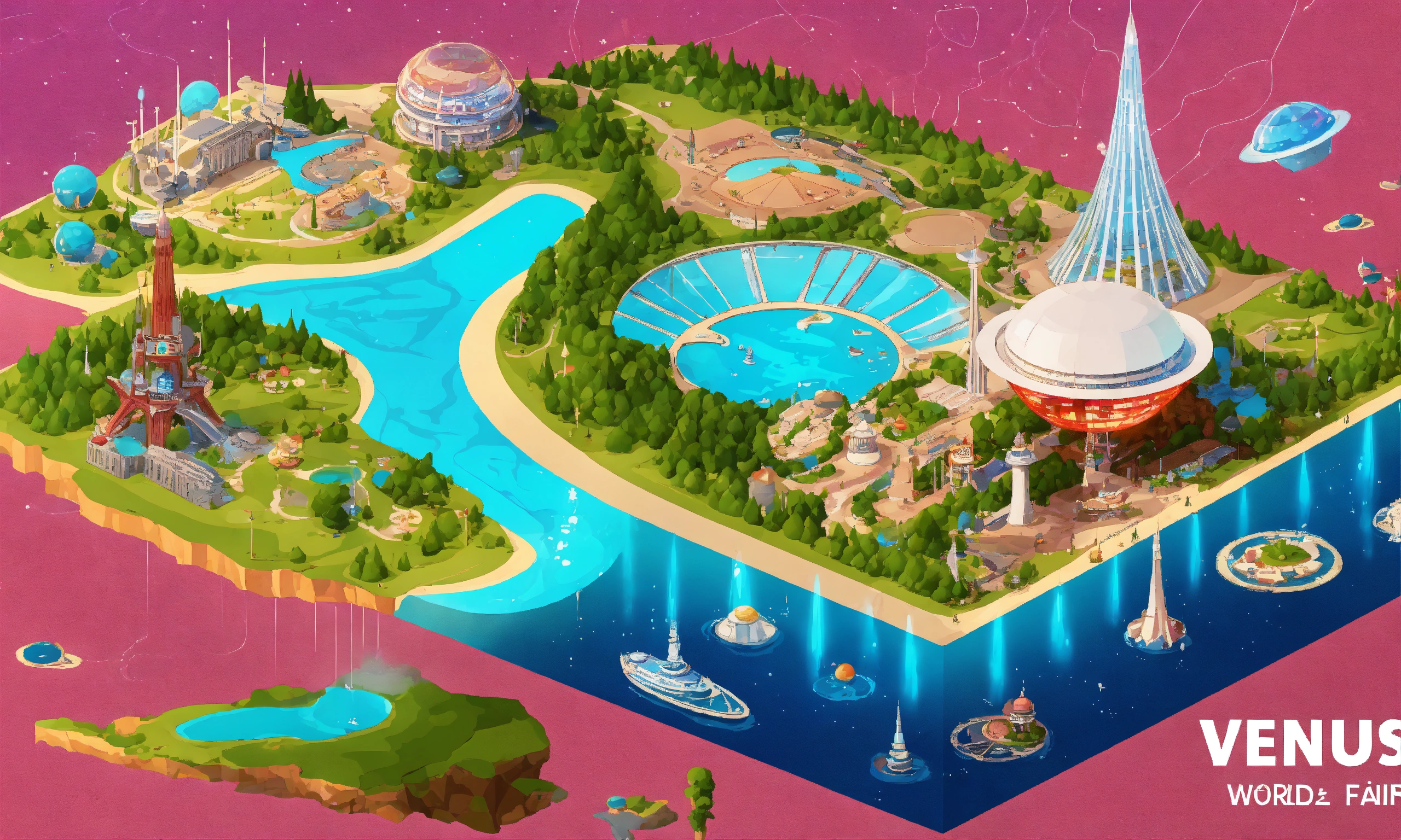 Retrofuturistic world's fair exhibition on venus, isometric, square world map, alien ufo, water, plastic