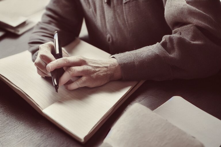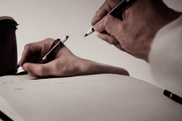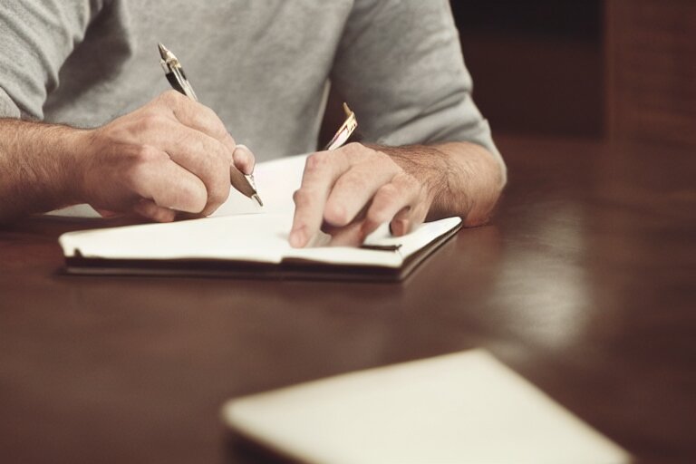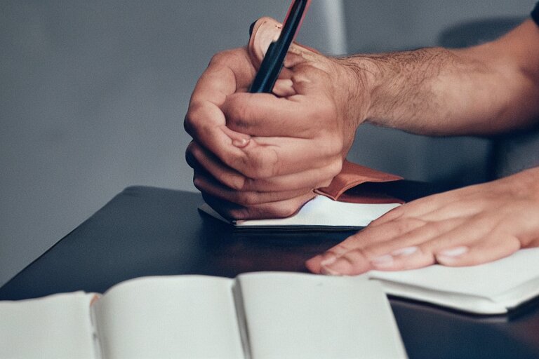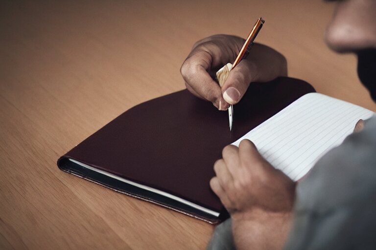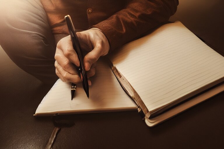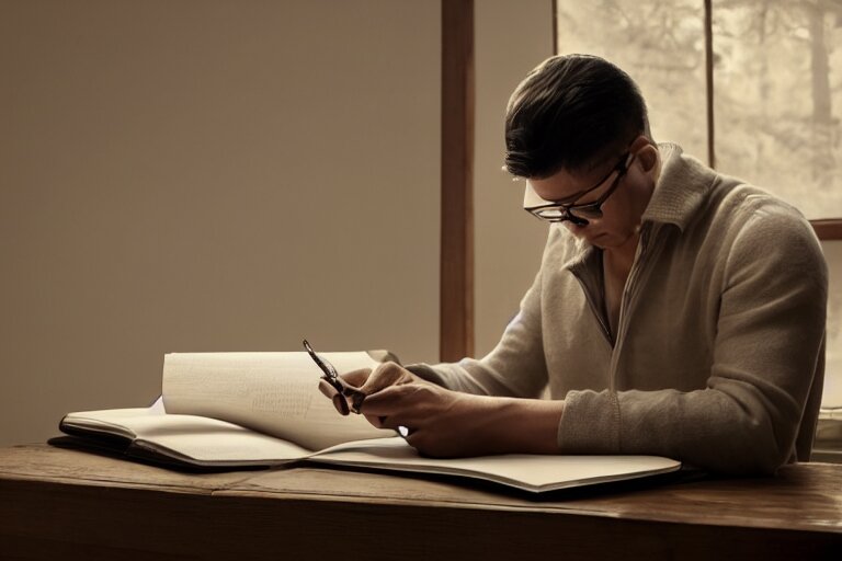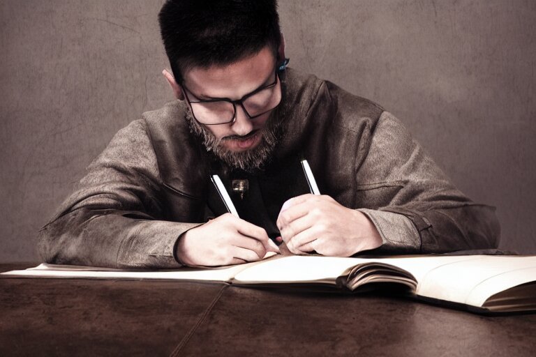 A man writing in a large leather notebook by jama jurabaev, cinematic shot, trending on artstation, high quality, ultra realistic