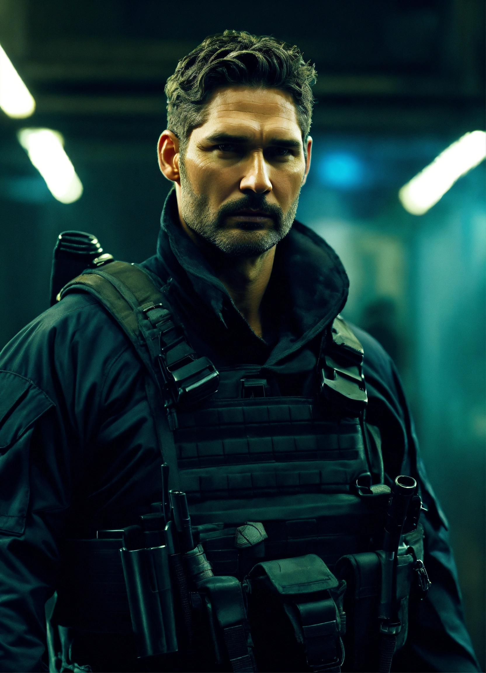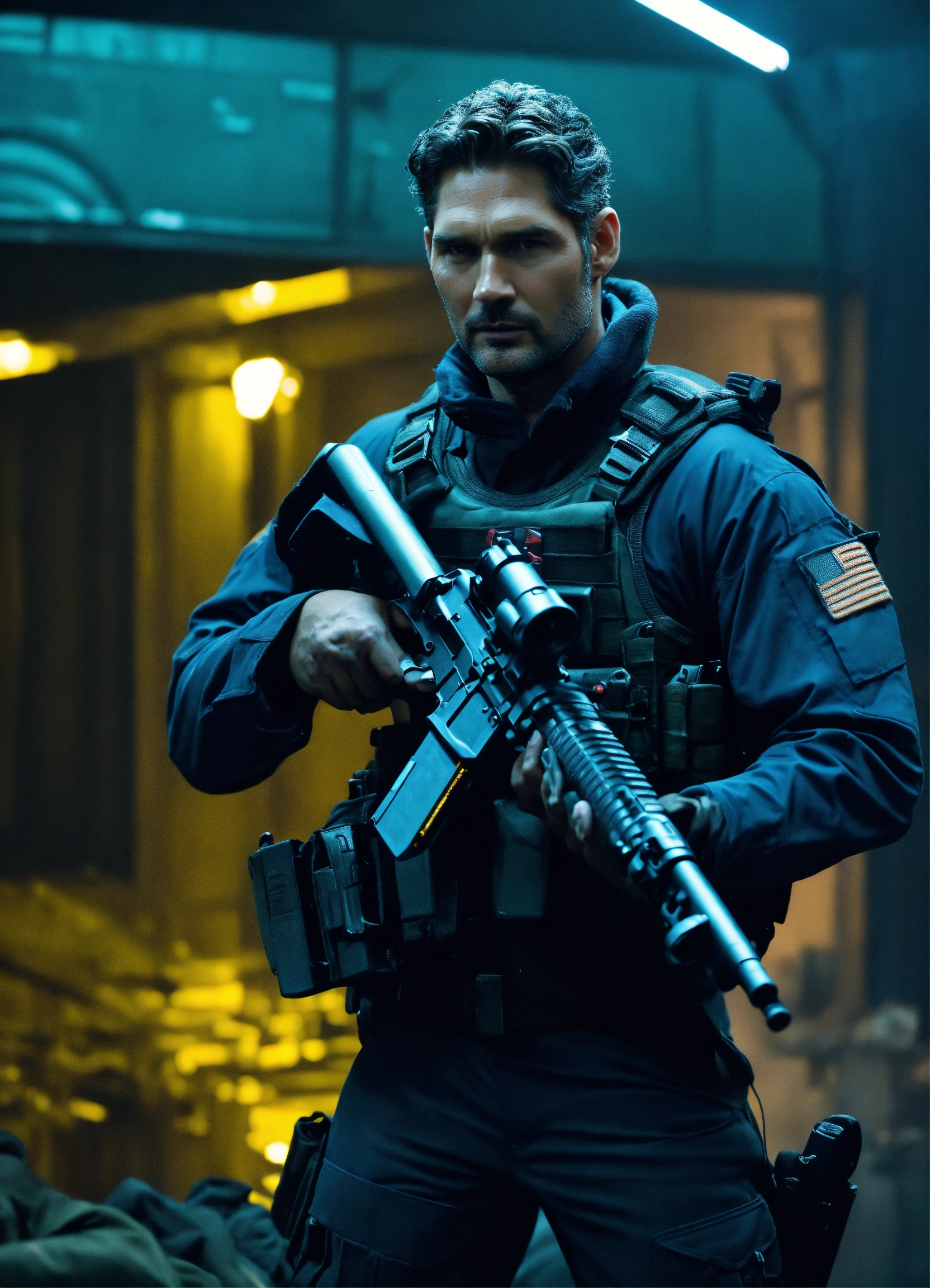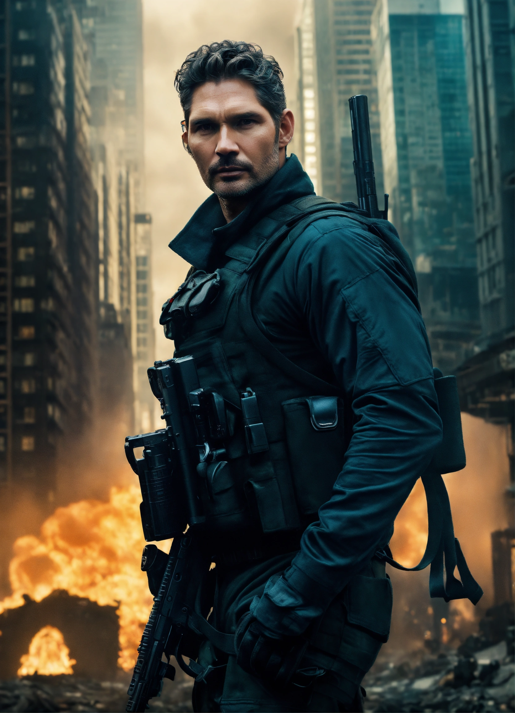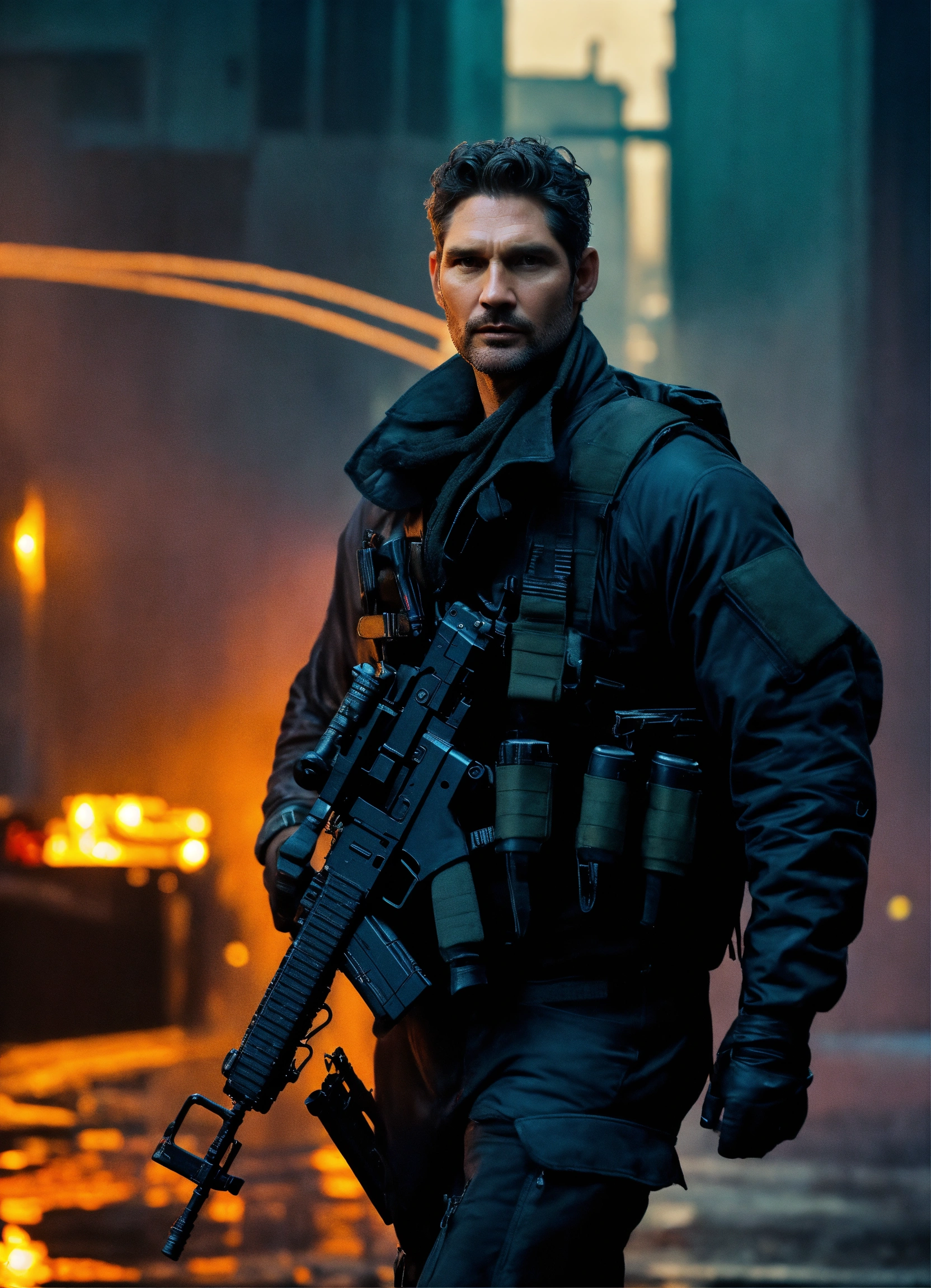 Tall handsome man eric bana, walk, altered carbon style, apocalypse, dark, dangerous, survival, cinematic, epic, gun, soldier, serious