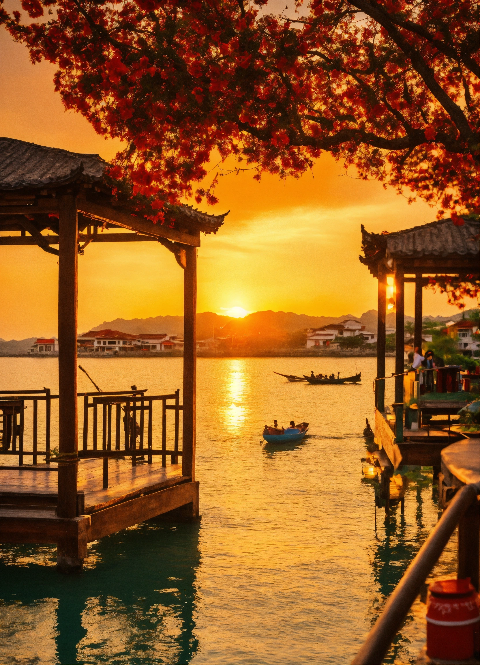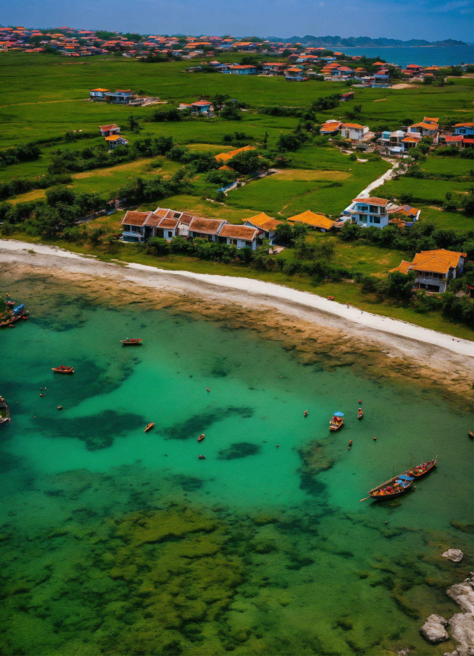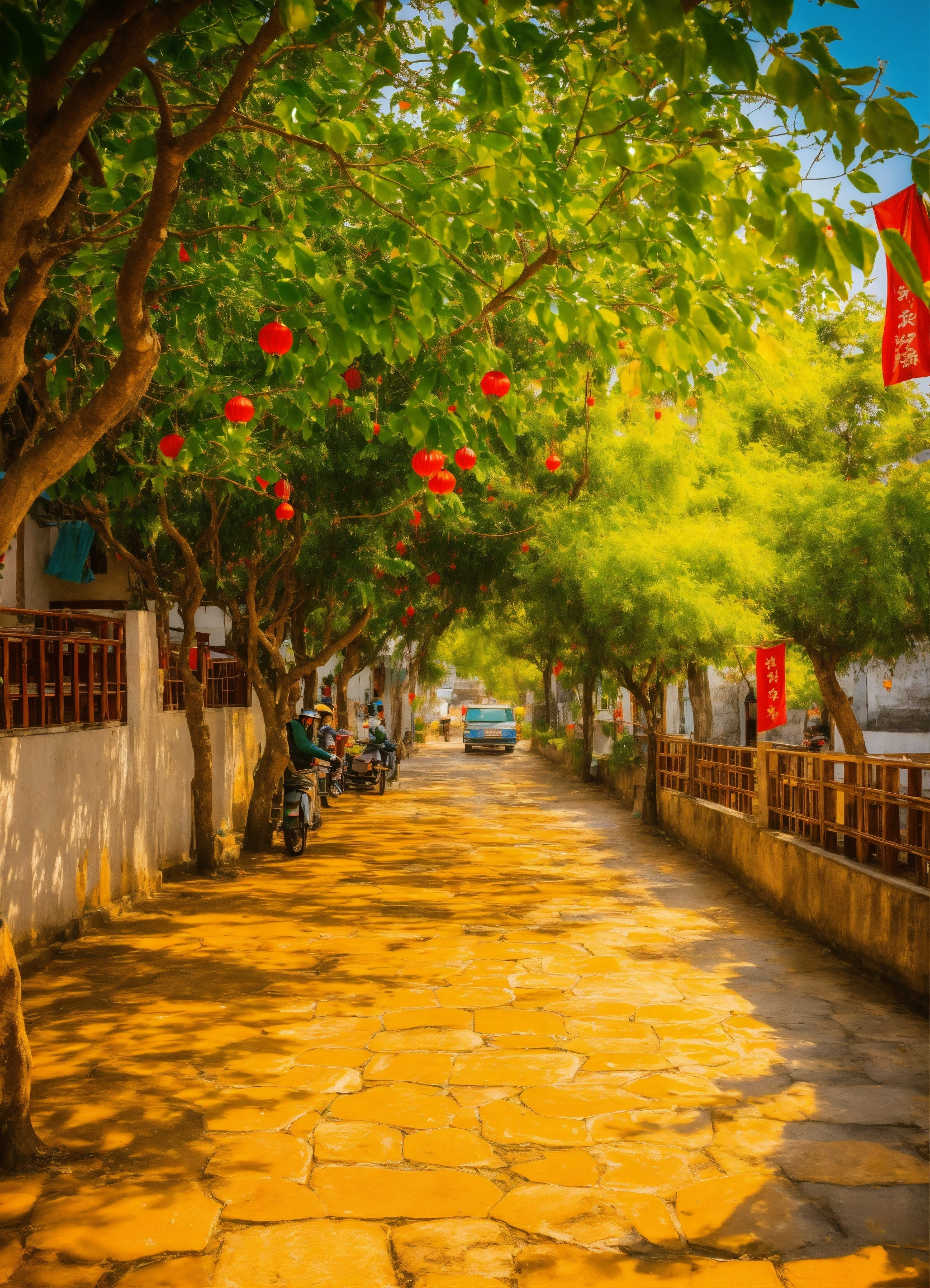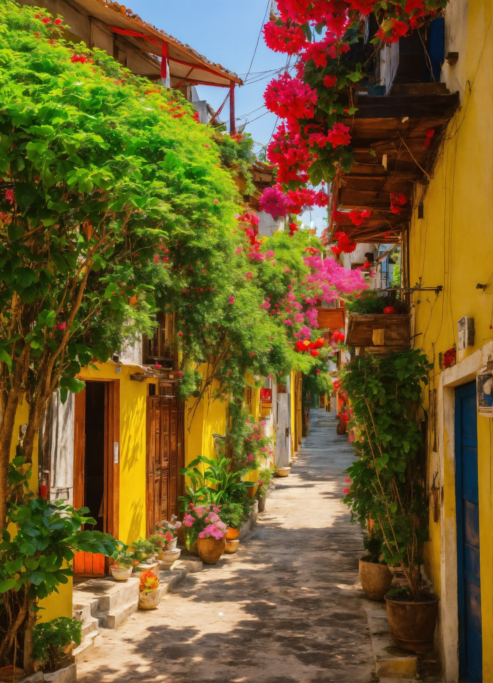 Ngôi làng alacati, thổ nhi kỳ, tuyệt đẹp, vẻ đẹp hình ảnh điển hình, vẽ nét bút chì màu tươi sáng với giàn hoa giấy, ô của nhiều màu sắc, không giá rộng, có chú cho mèo đang vui dùa, và có những hạt mưa