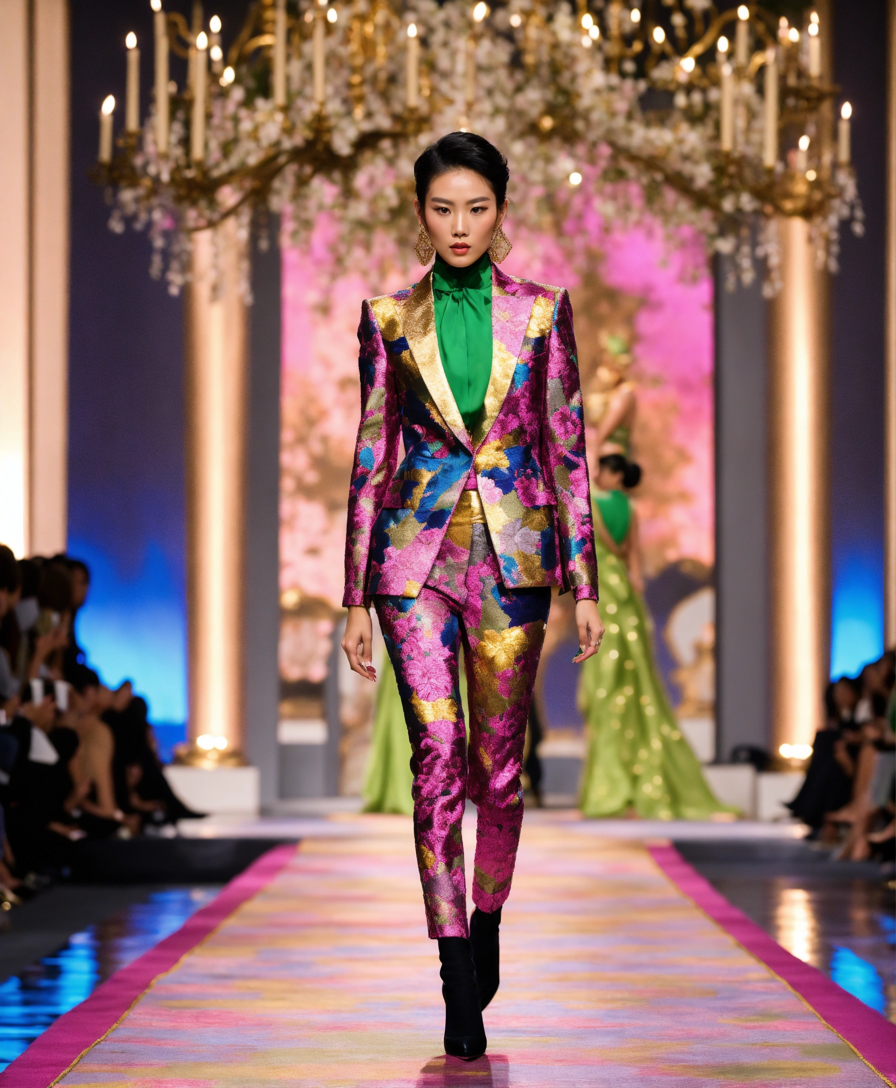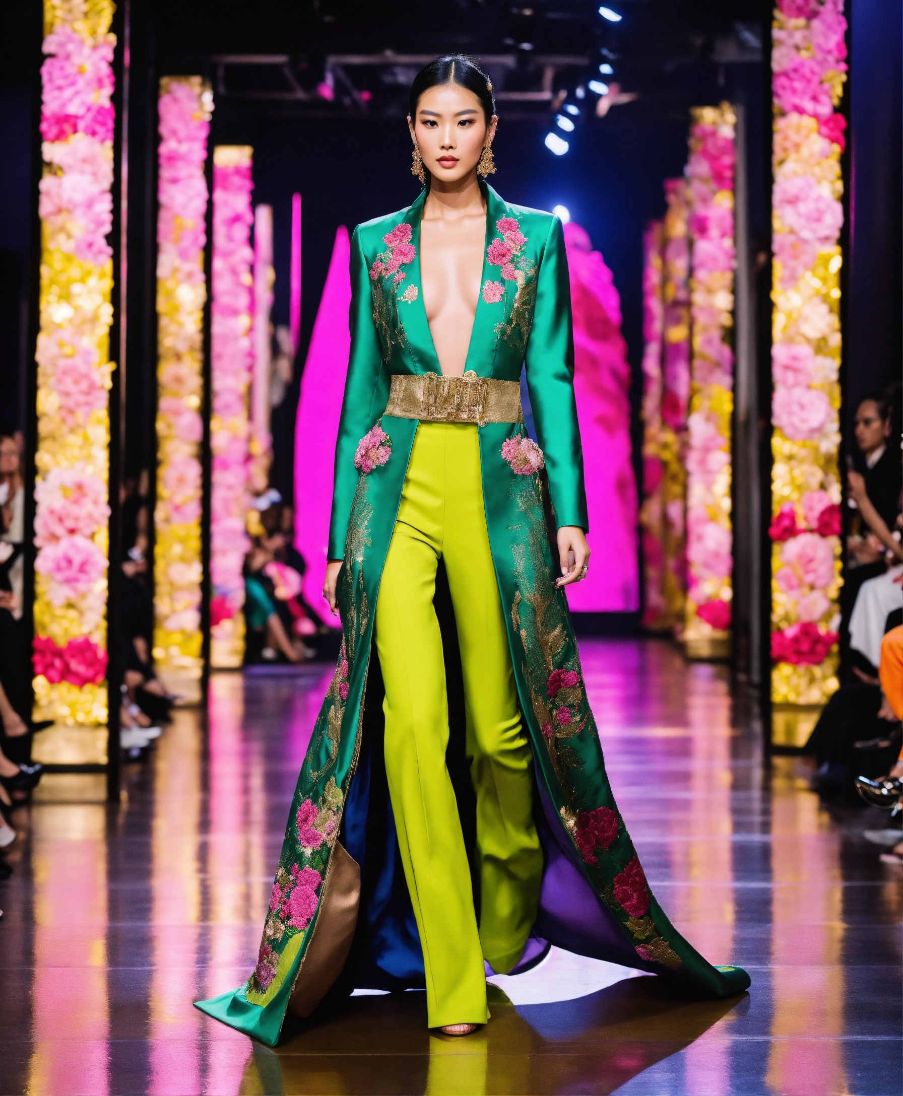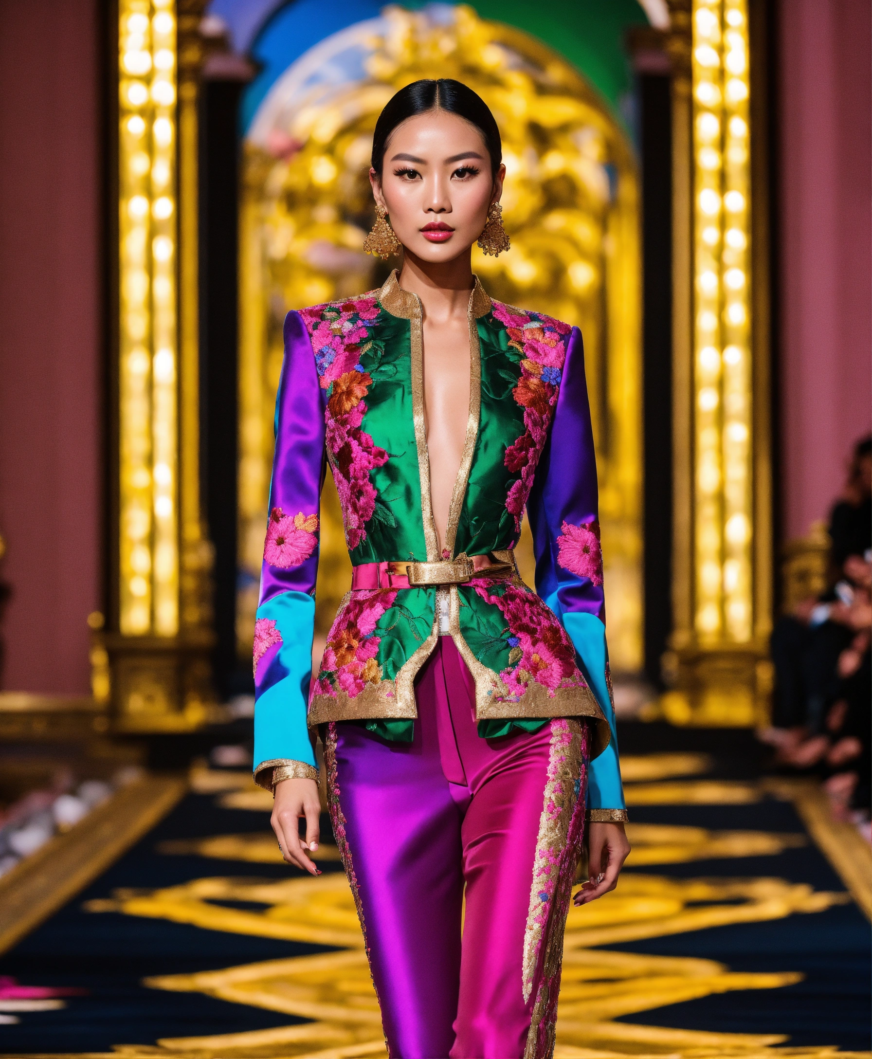 Ultra realistic full body photo of a stylish beautiful asian runway model walking the runway modeling summer cruise designer wear brave, paris versailles details cutouts and gold geometric pattern floral structured tailored jacket pink gold green lilac peridot silver magenta lime fuchsia yellow blue black gray copper mauve bronze haute couture embroidered contrasting colors vivid intricate bold vibrant glamorous ultimate elegance beautiful luxurious awesome wealthy opulent exquisite resplendent magnificent sublime 12k