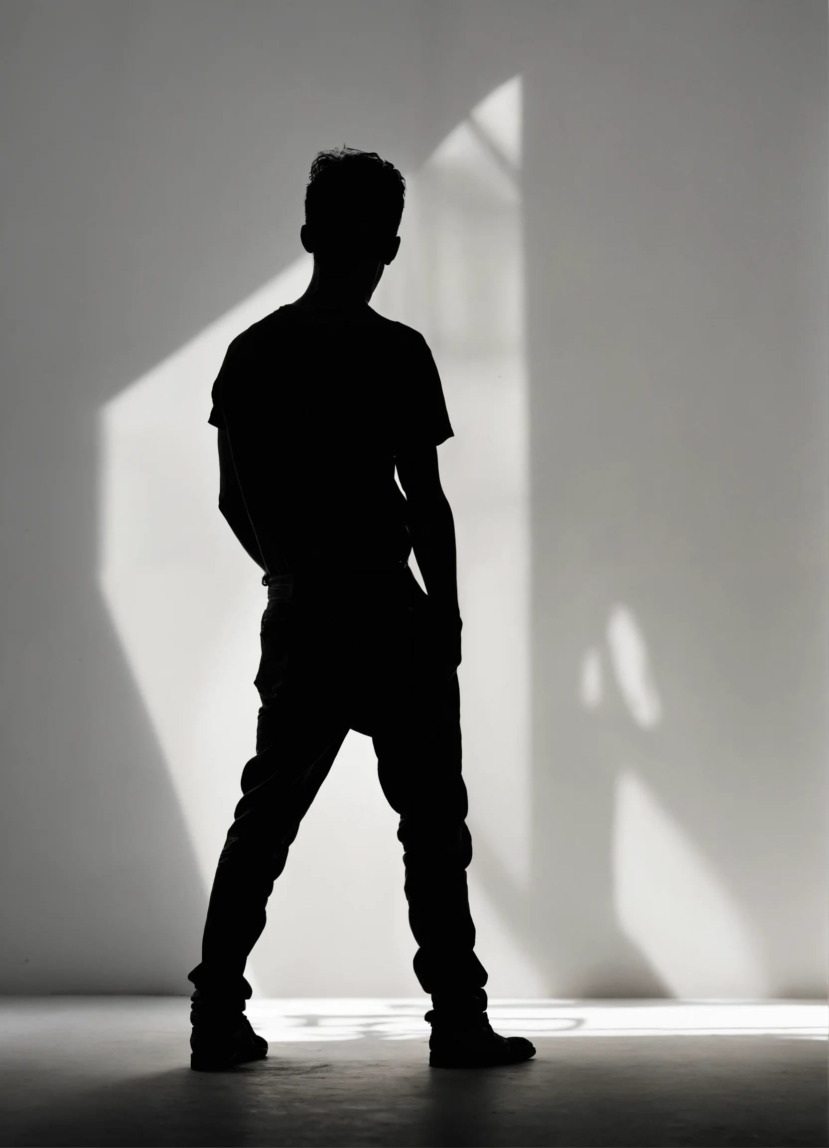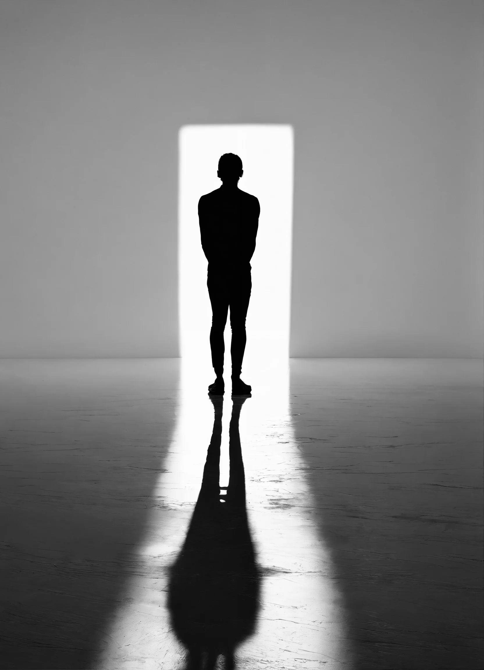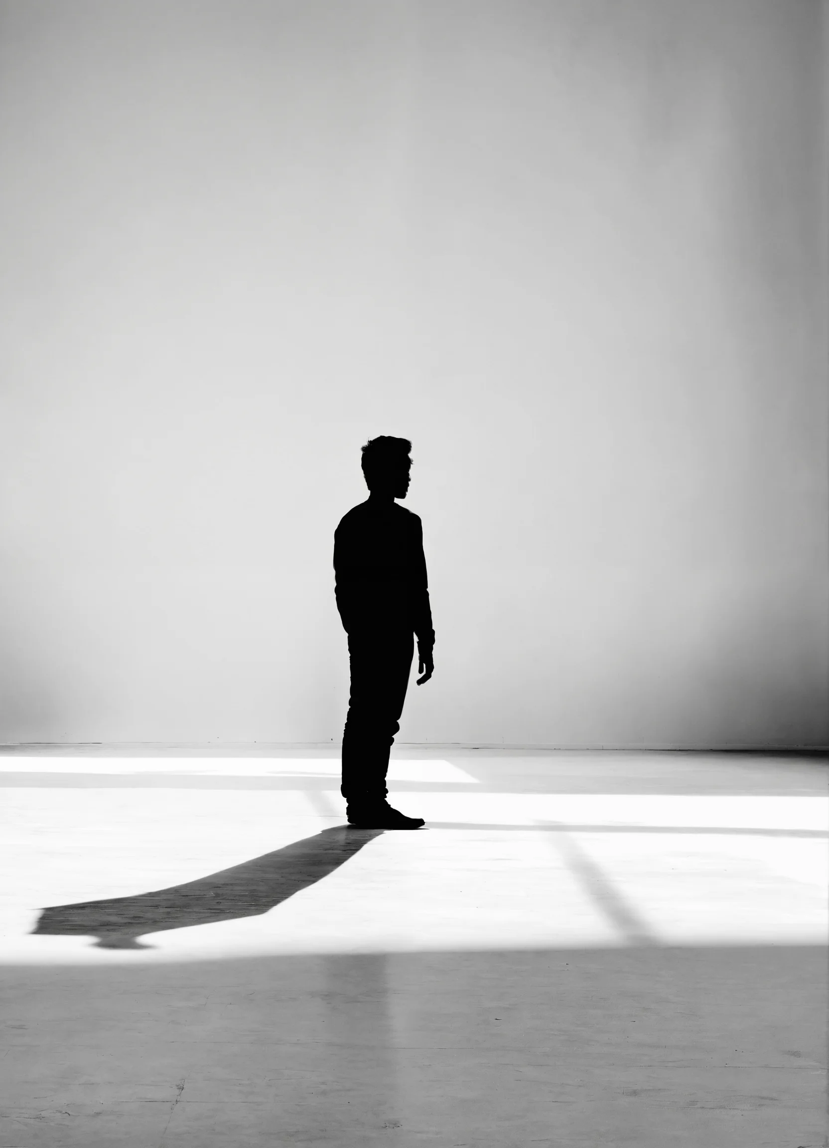 Black silhouette of a person standing with their back to the viewer on a white background, sharp shadow style, minimalist art.