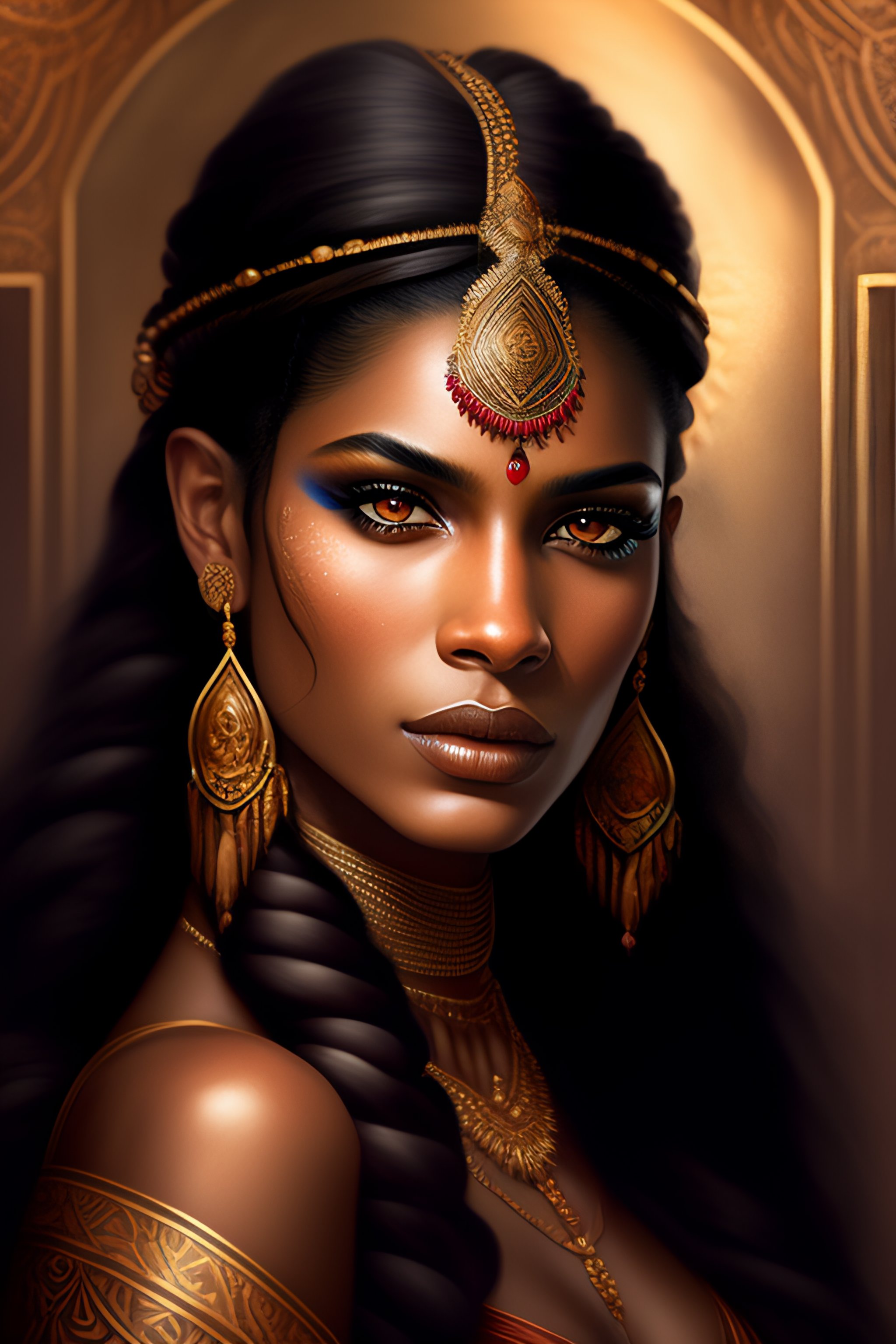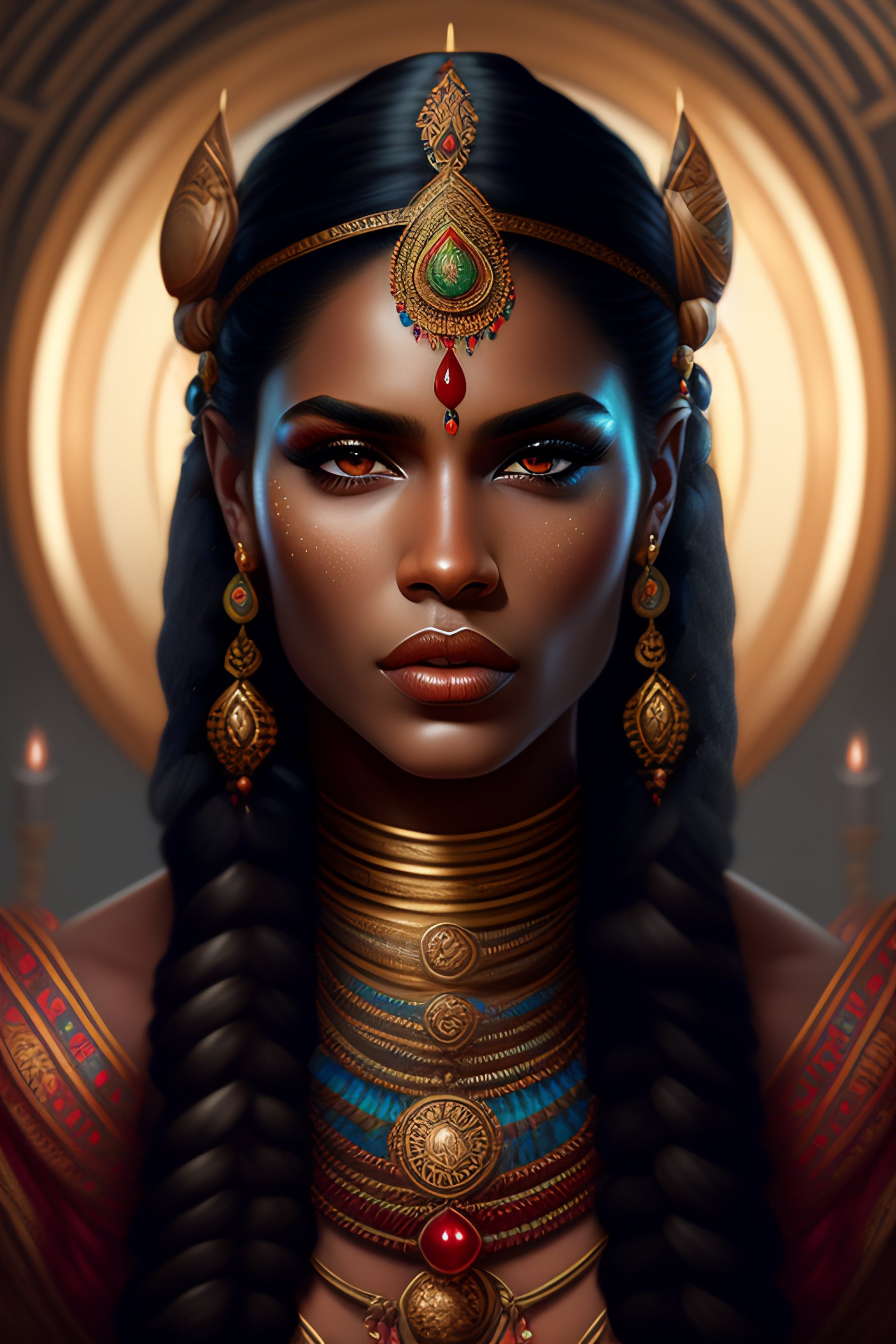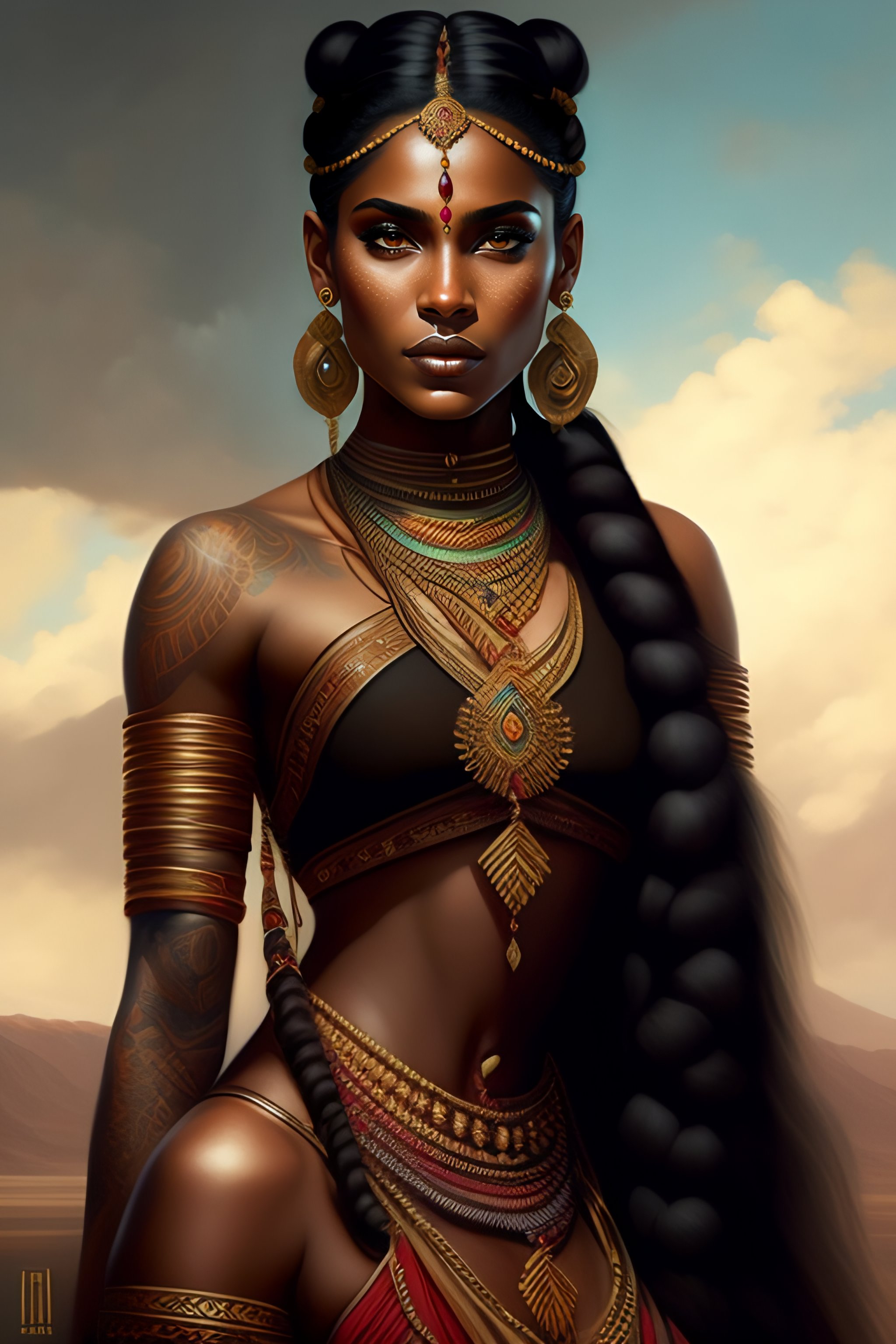 A magical portrait of a female warrior with beautiful brown eyes and braided black hair, hindu, brown skin, tribal face tatoos, art by manuel sanjulian and tom bagshaw, shepard fairey