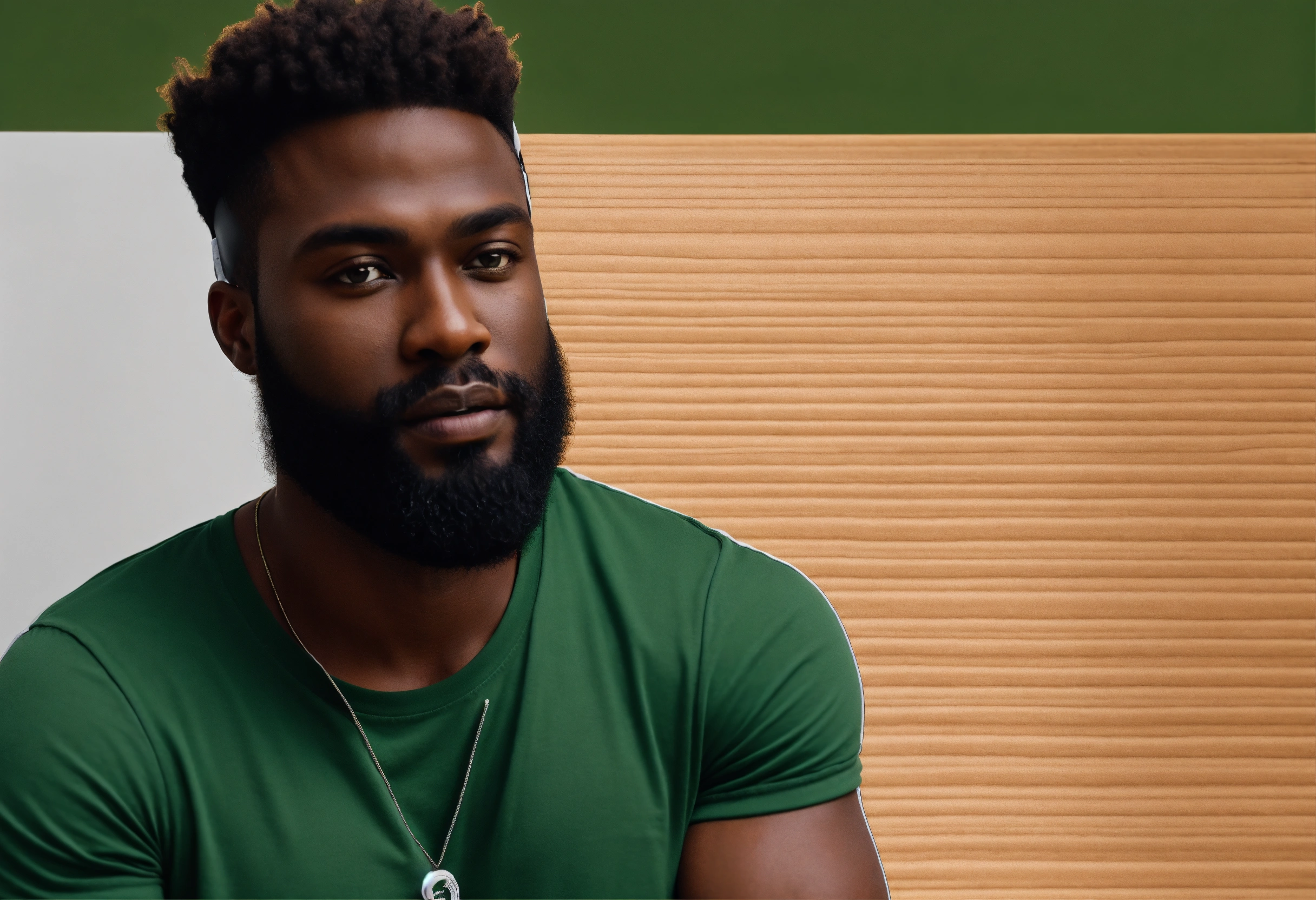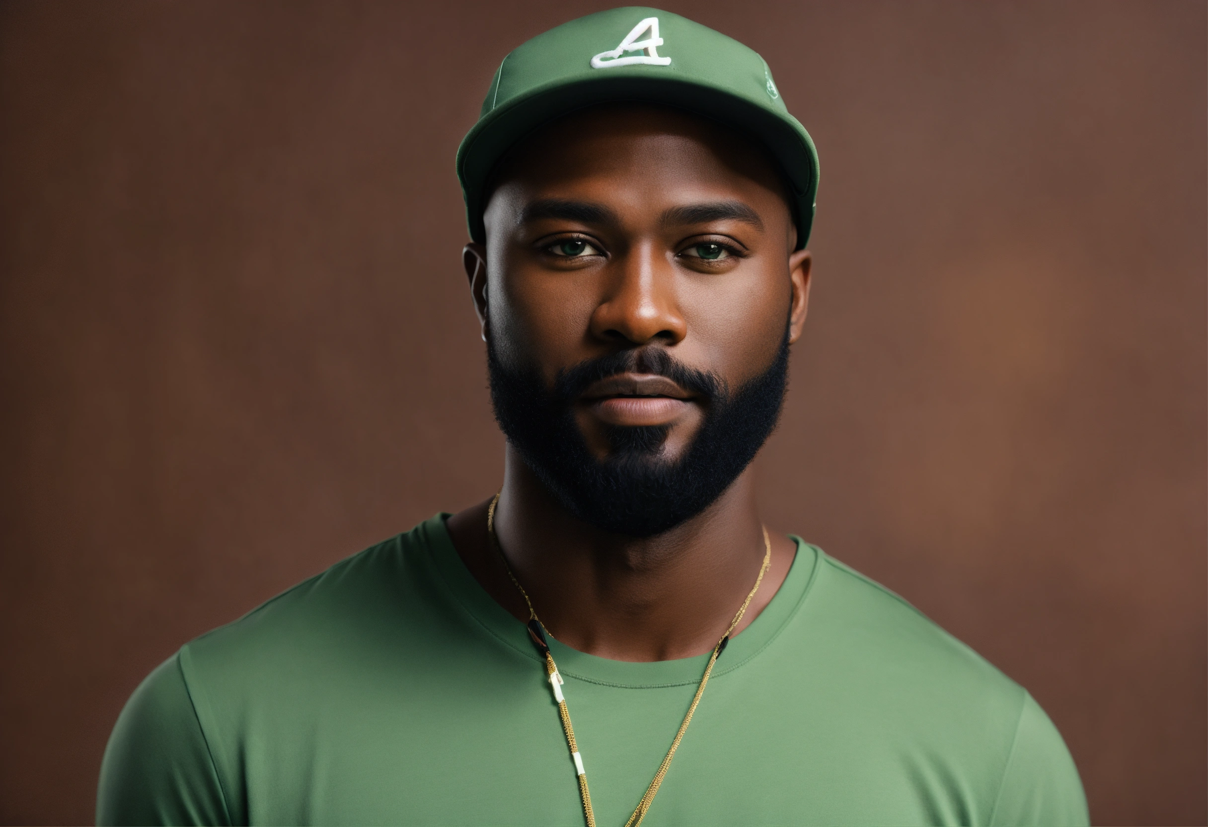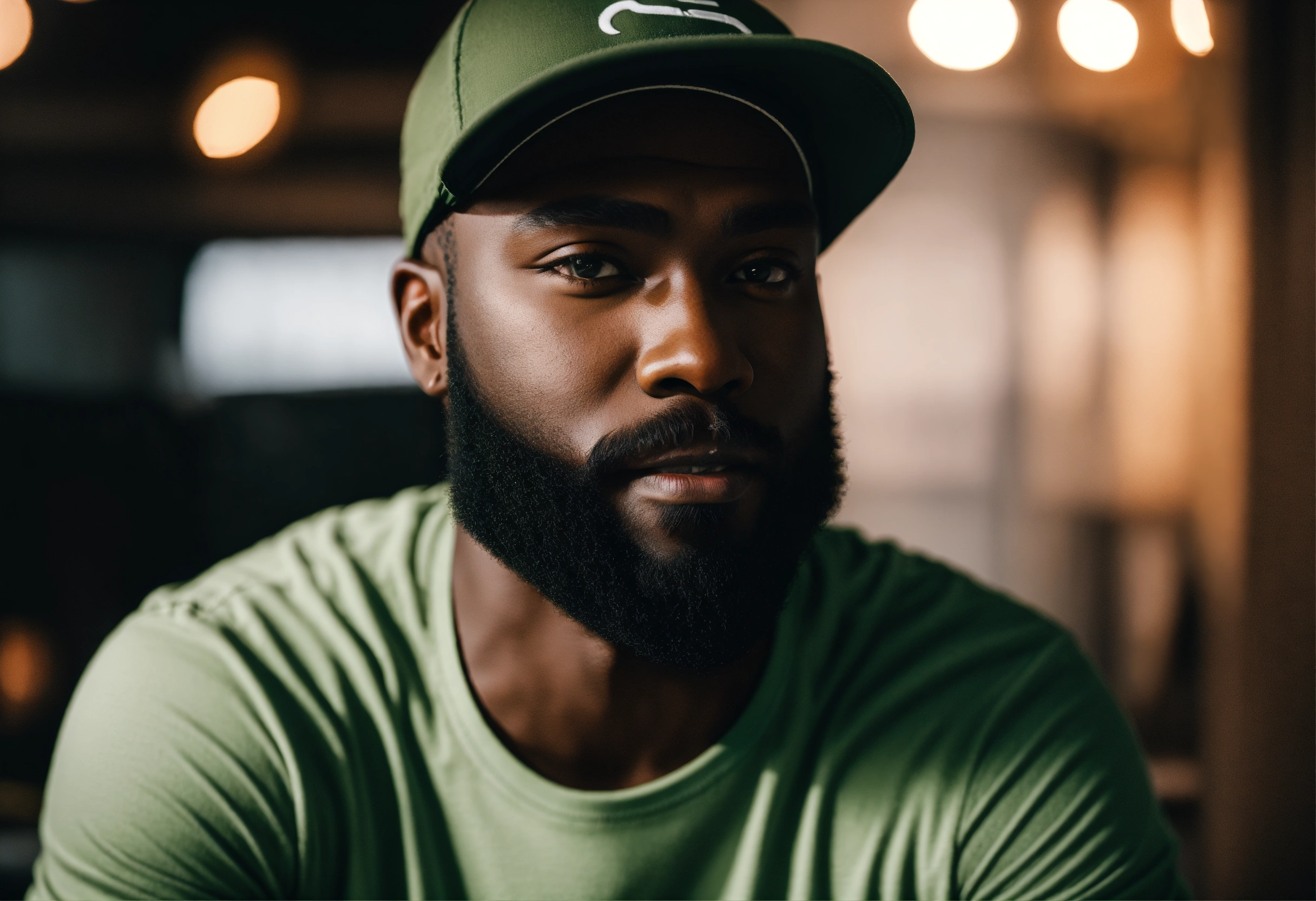 Chocolate dark skin tone handsome black man with beard, on a podcast, wearing long sleeve green t shirt and white atl sun visor, black jeans, very realistic, ultimate detail, 8k, face front looking straight into the camera