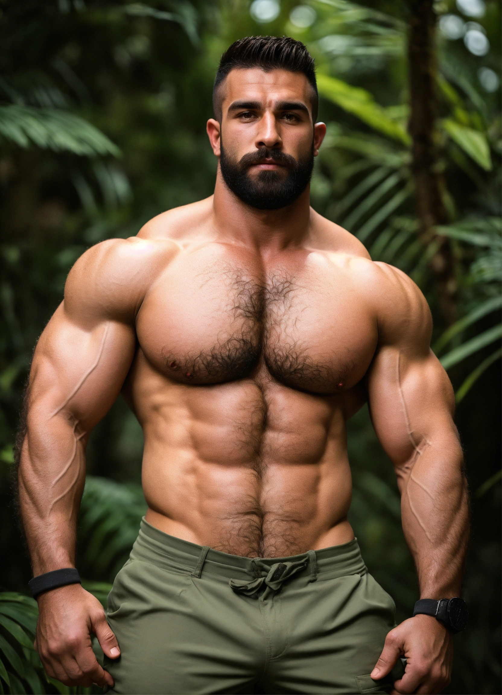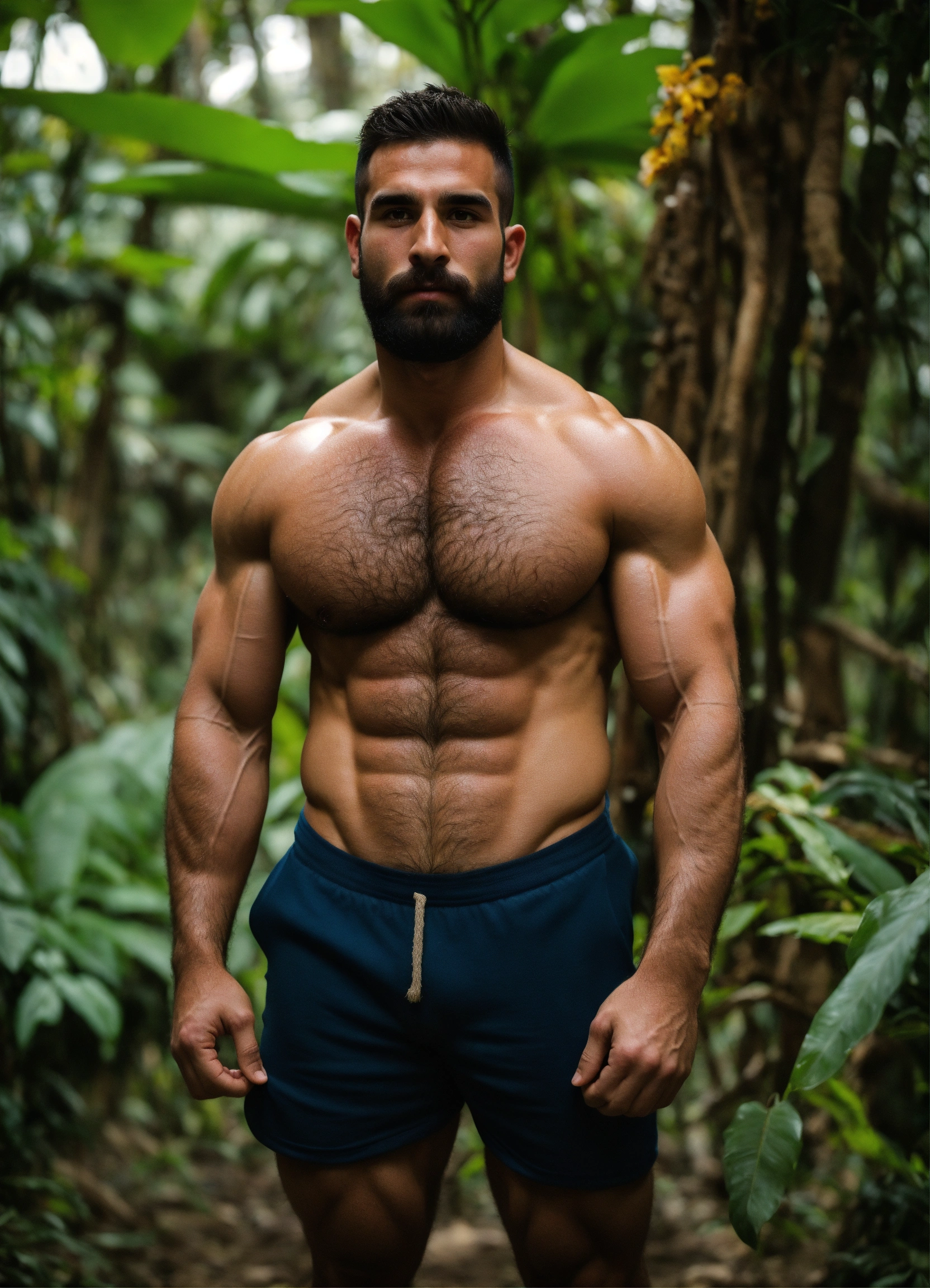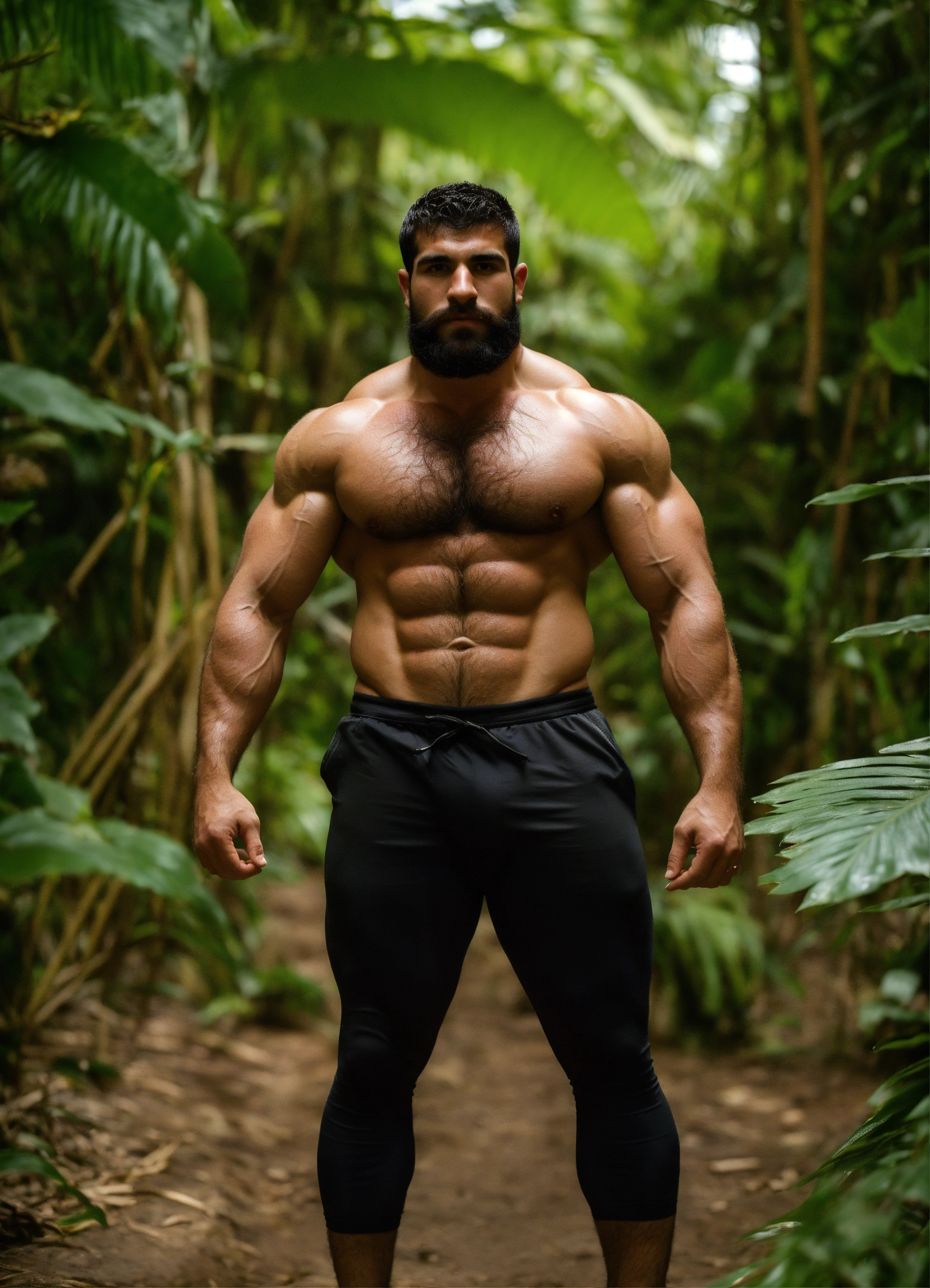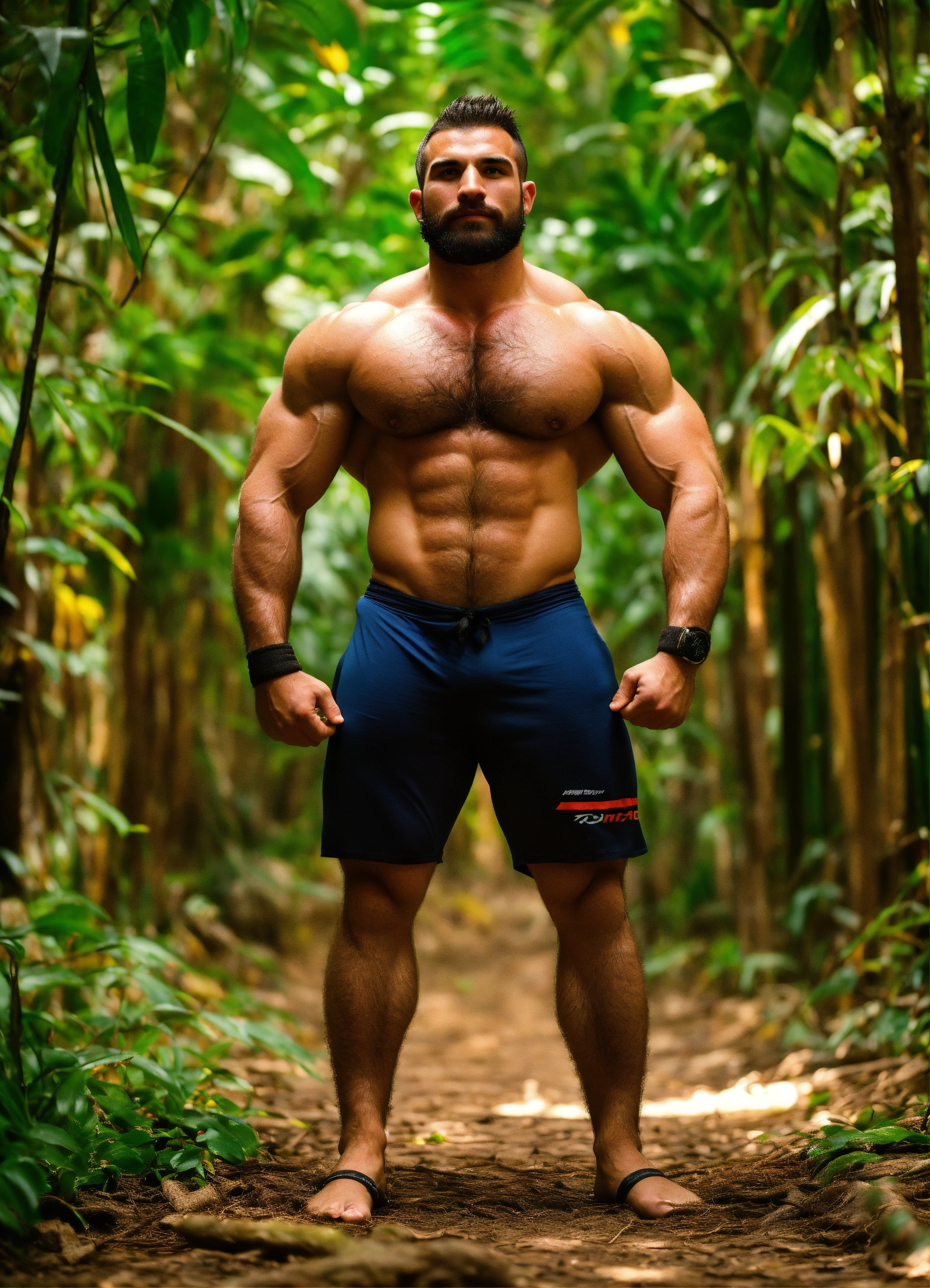 30-year-old man with big muscles, big bodybuilder, kurdish, hairy torso, hairy arms, hairy legs, body like a wrestler, in a jungle