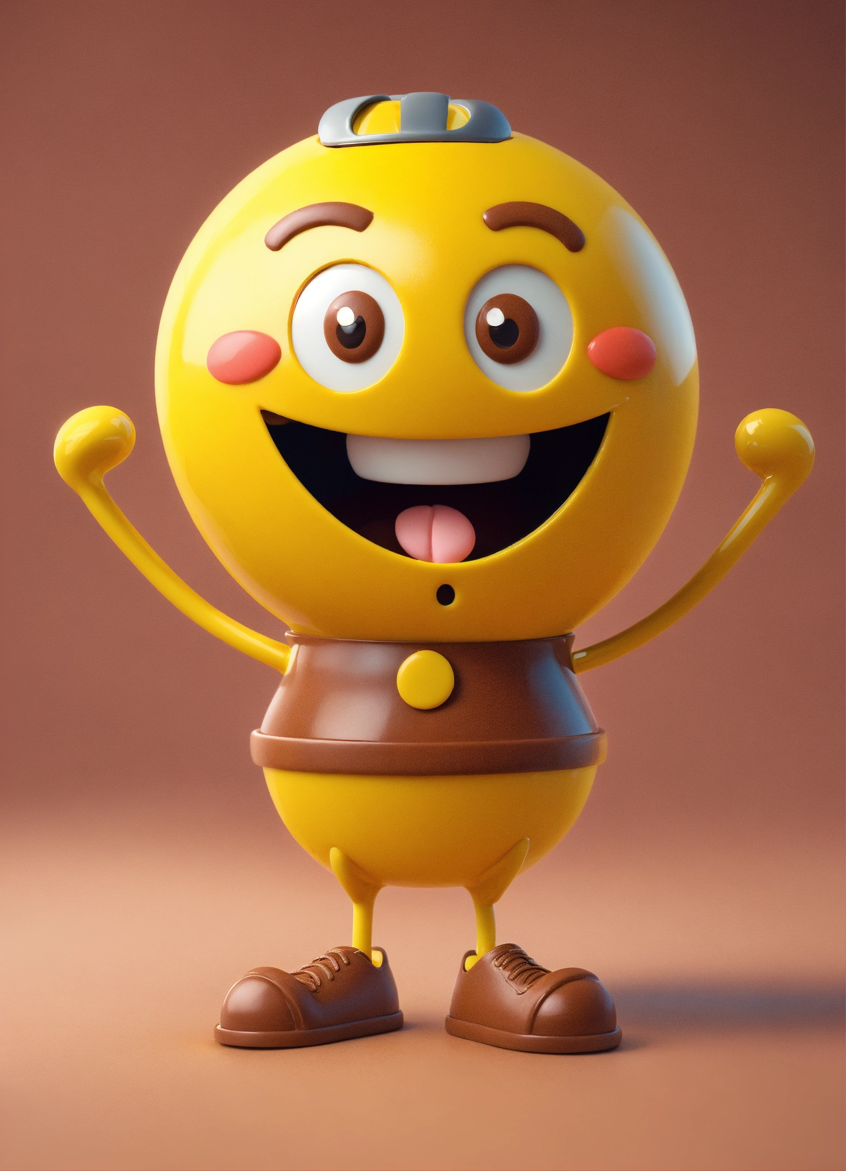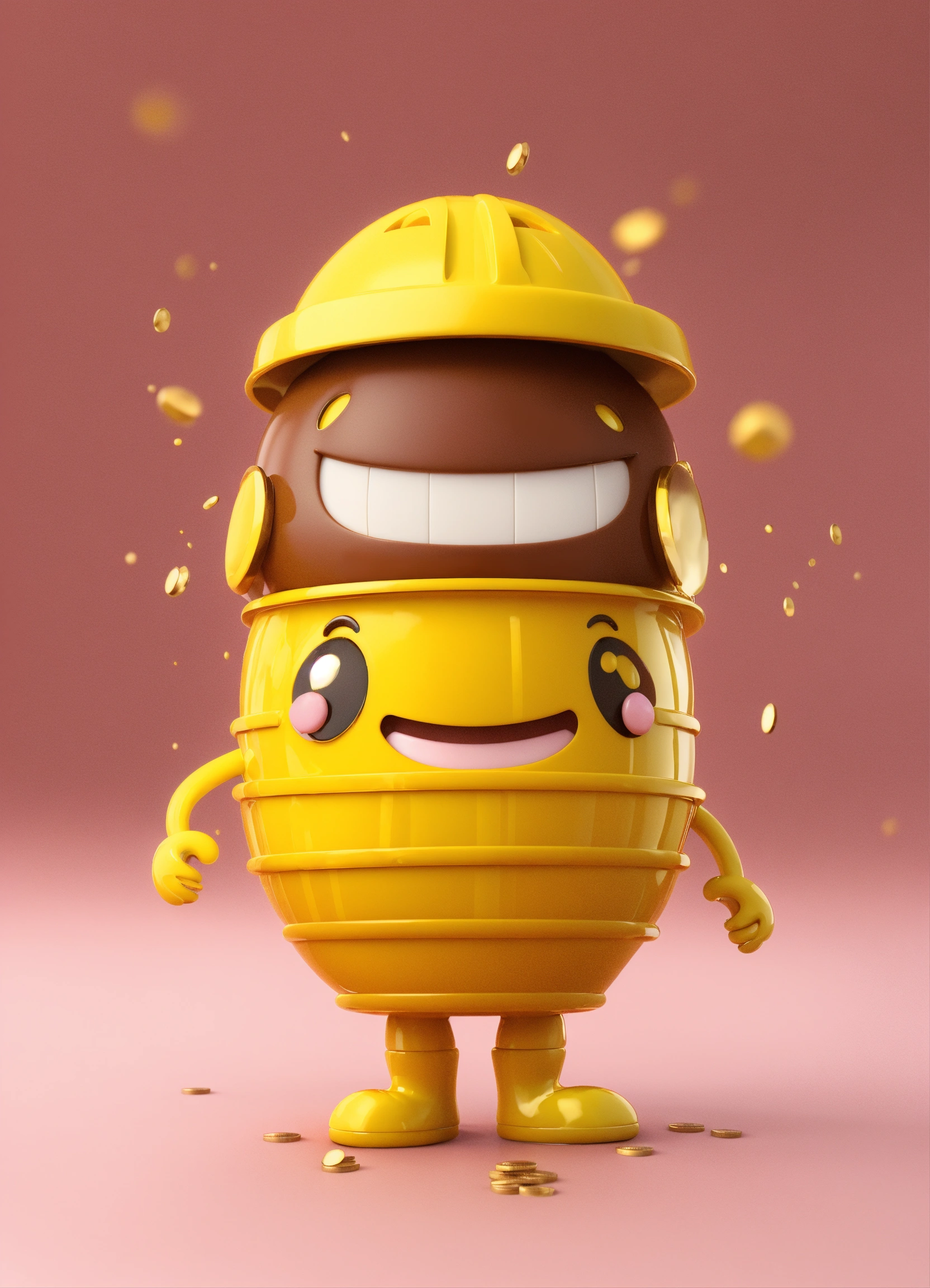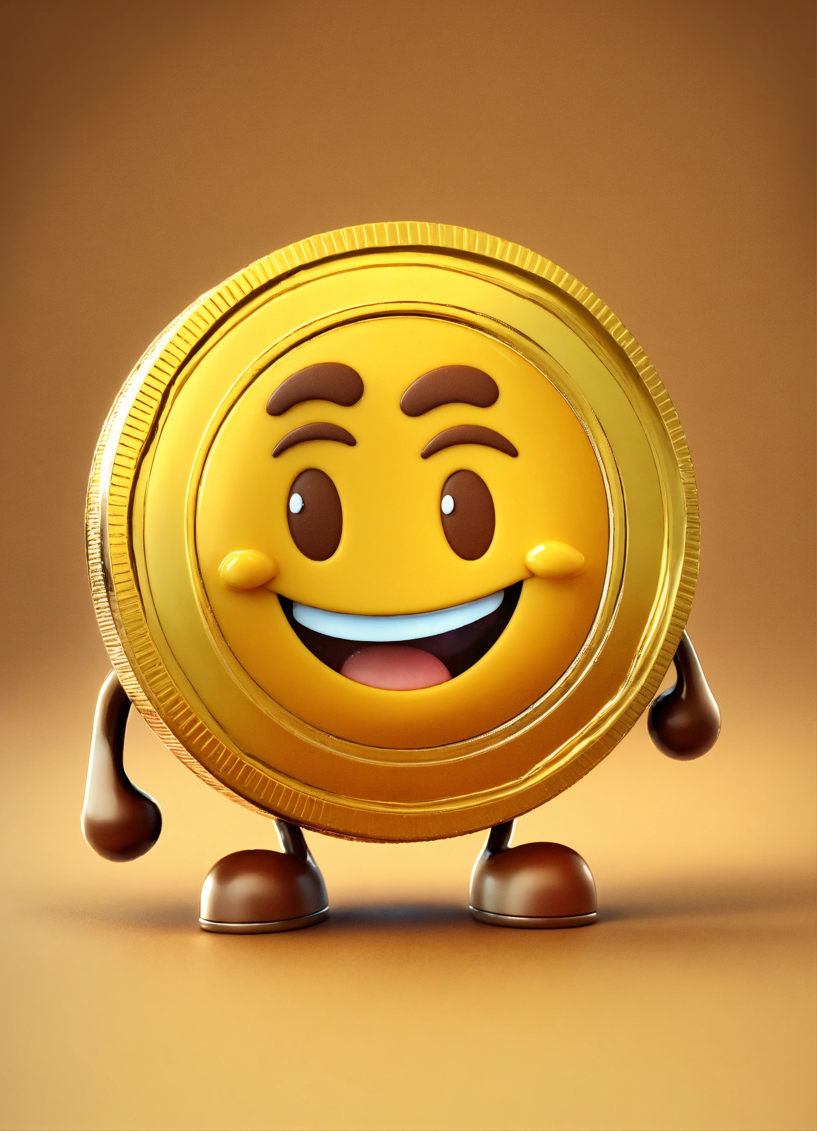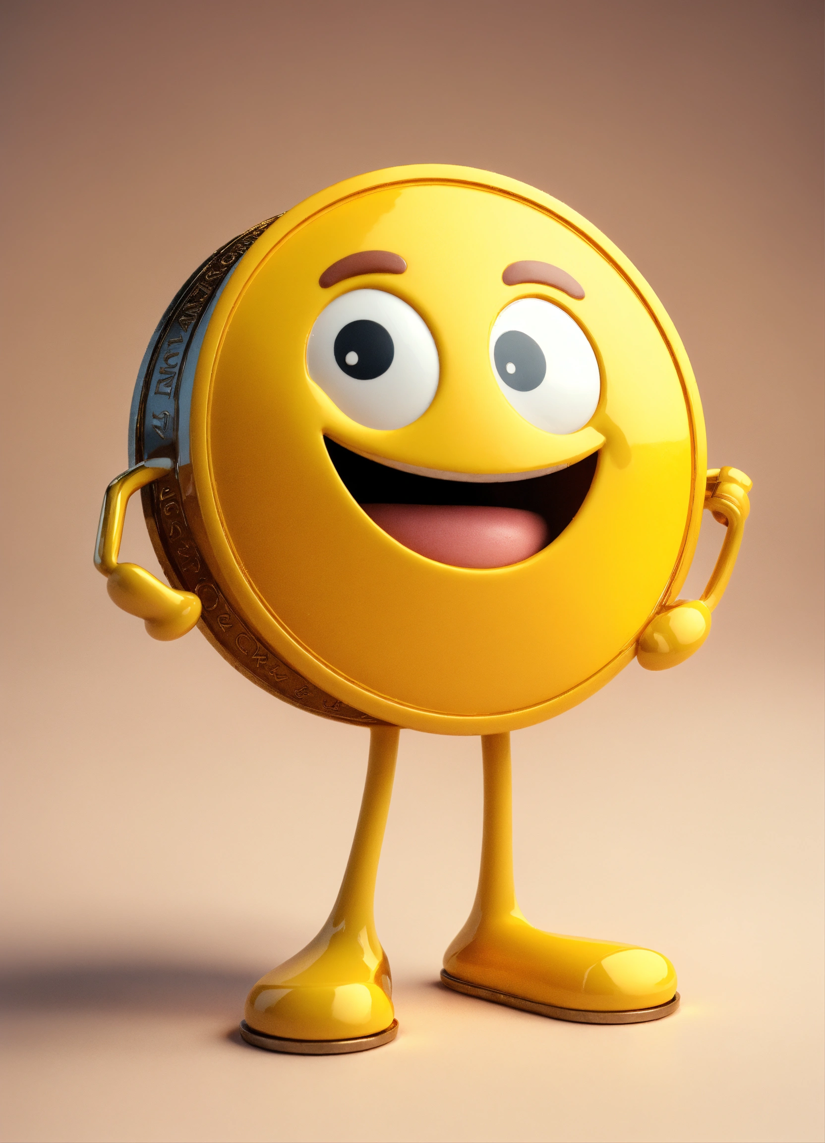 A coin character is a portrait with arms and legs and a smiling face, happy and cute erect yellow body and brown face color name is crazycup 3d