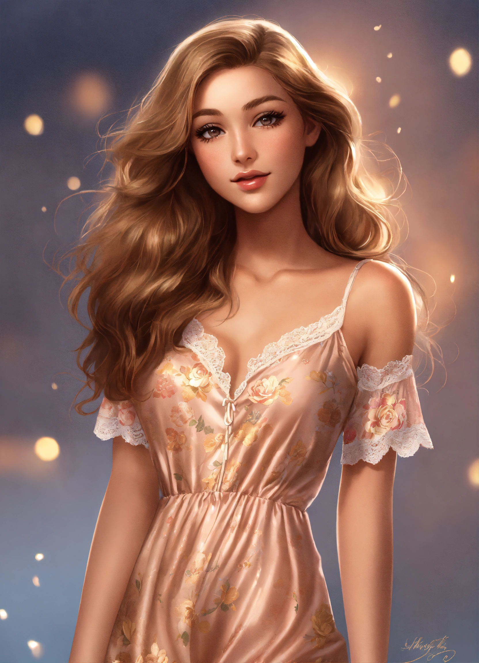 Full body, front view, beautiful 20 year old woman, pinup, romantic, long light brown hair and large hazel eyes, short nightie pajamas with champagne colored lace, barefoot, animated but very realistic, realistic illustration, white background, disney
