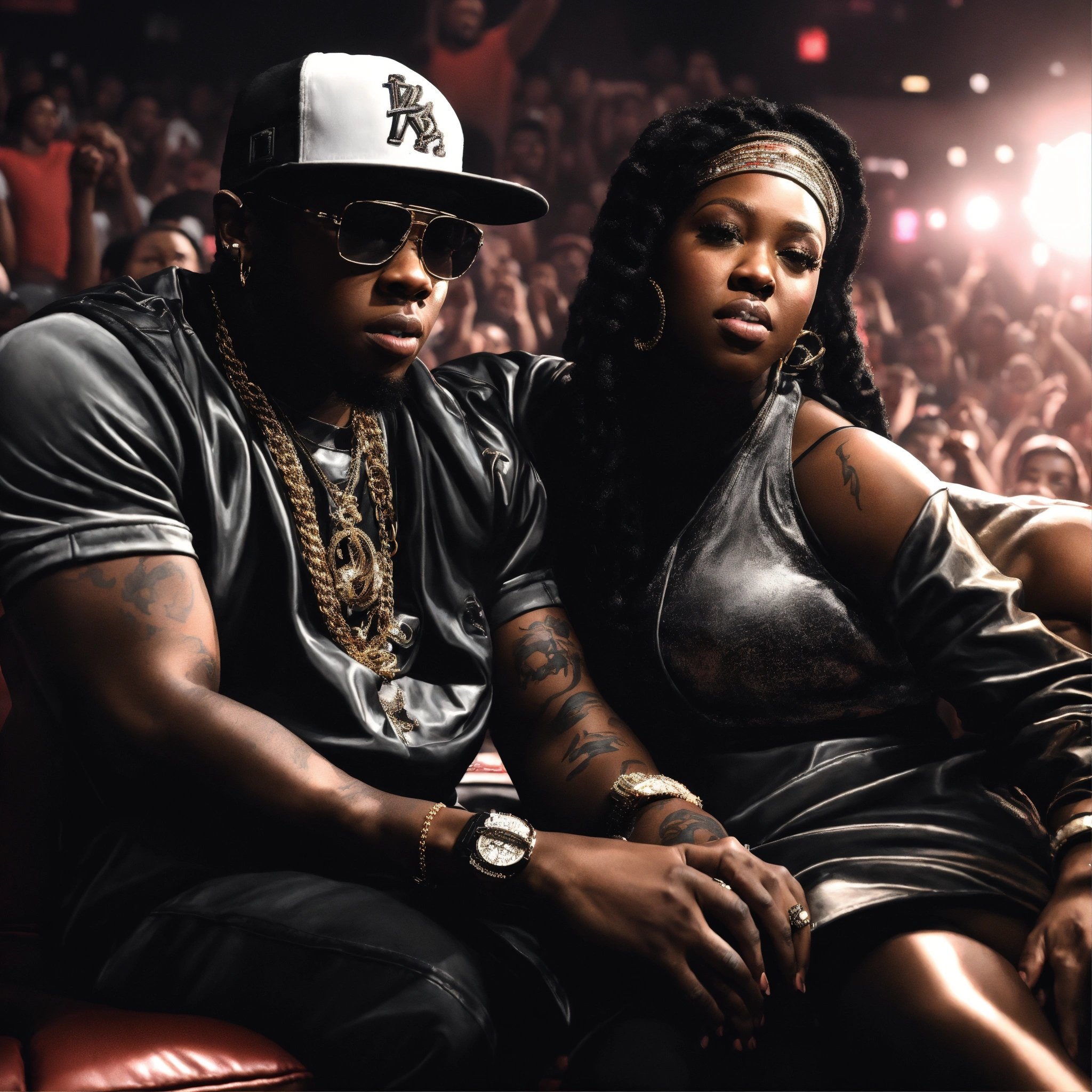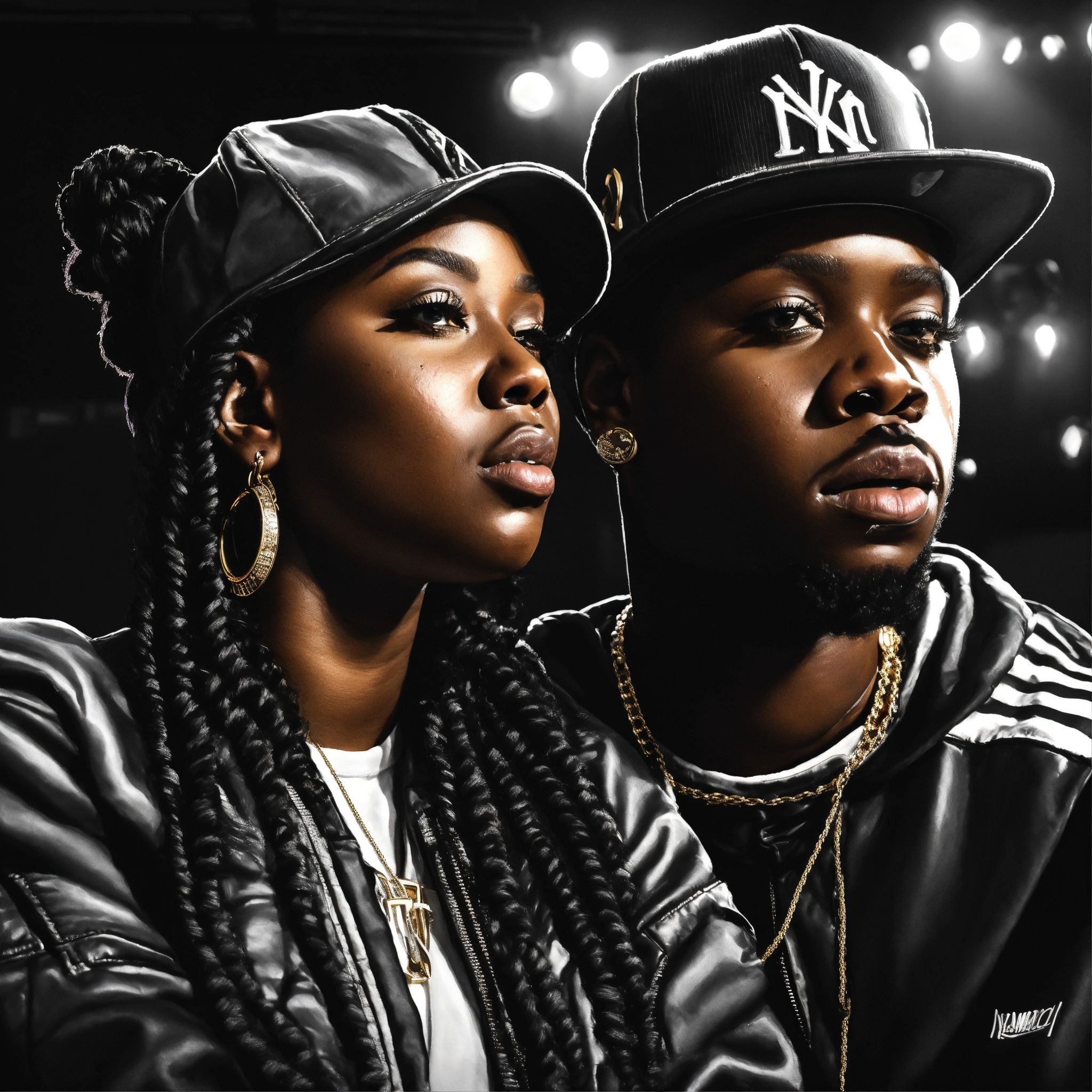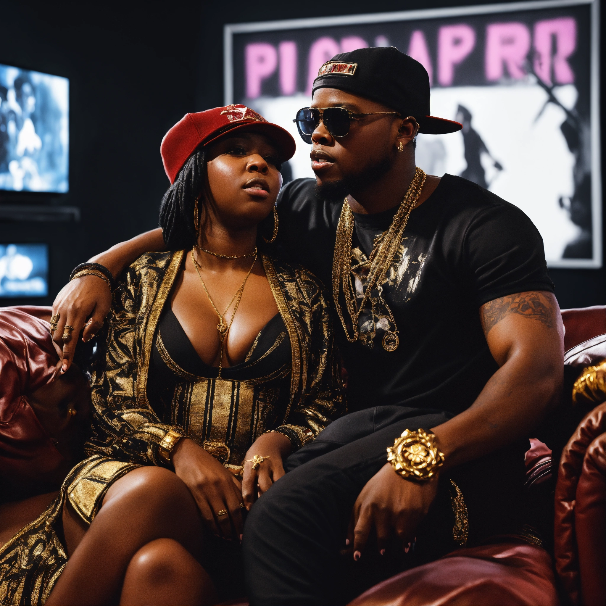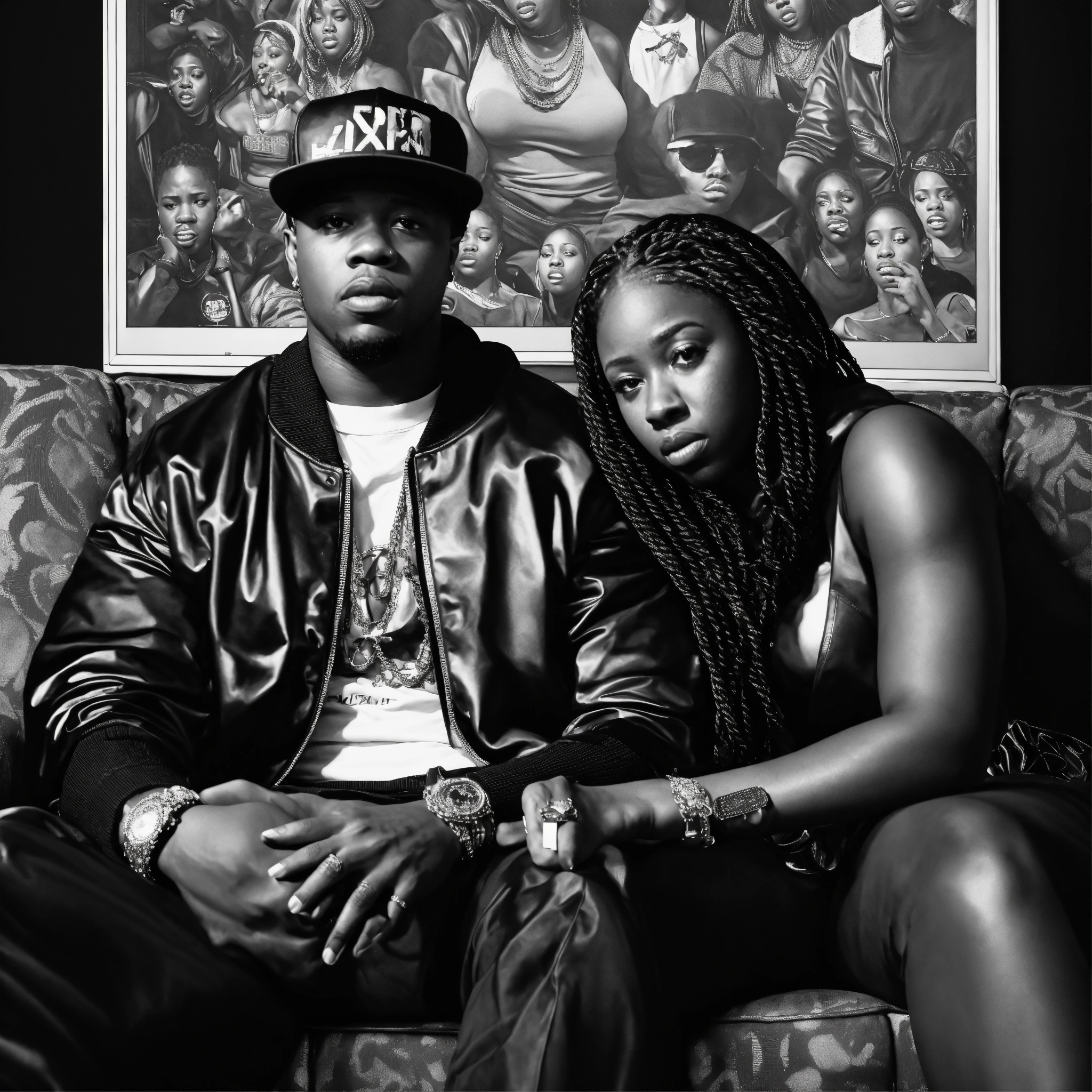 Pop art, hyperrealist portrait of black rapper "papoose" and black woman rapper "remy ma" embracing, watching a battle rap concert in tv sitting in couch, black and white painting, fantasy art, photo realistic, dynamic lighting, artstation, poster, volumetric lighting, very detailed faces, 4 k, award winning