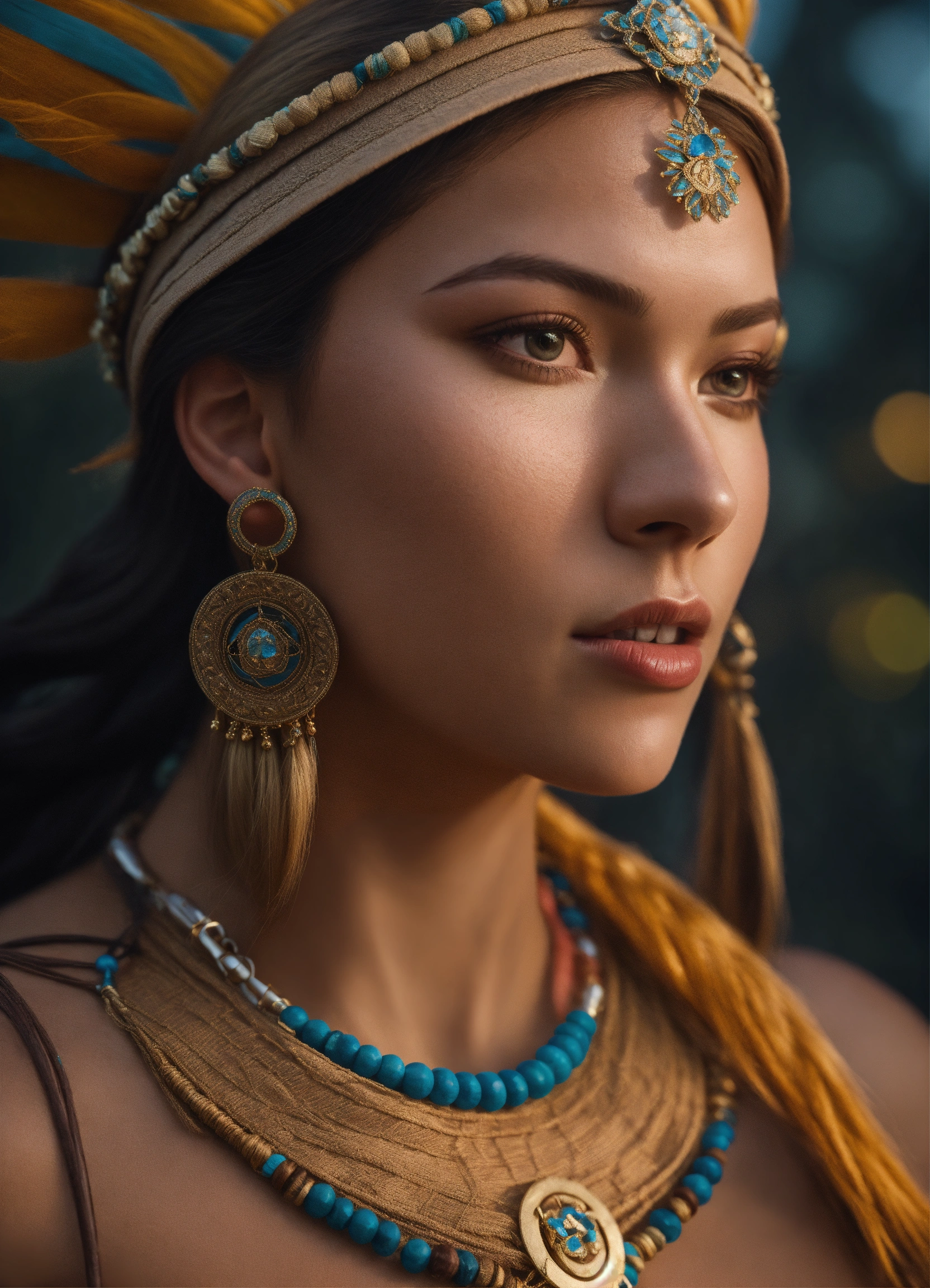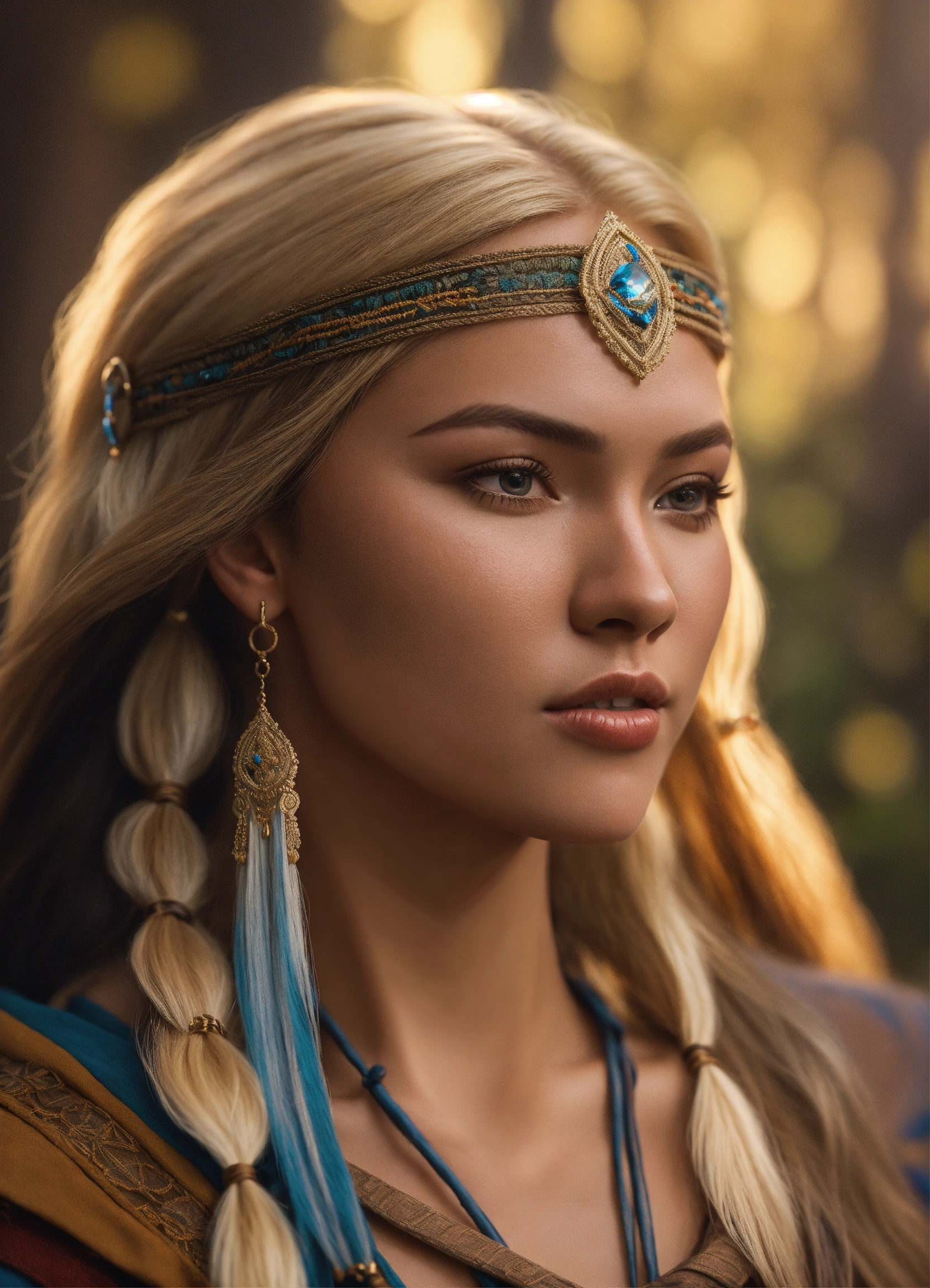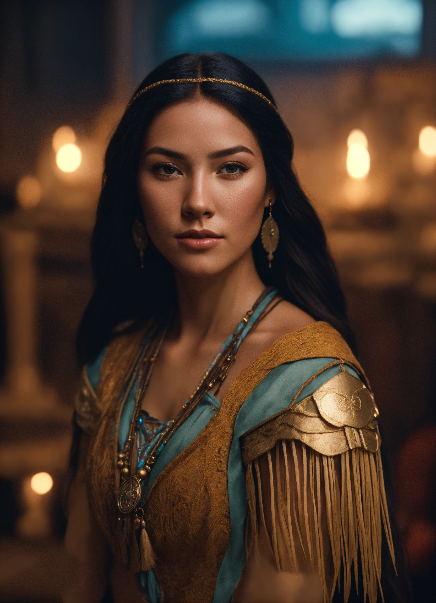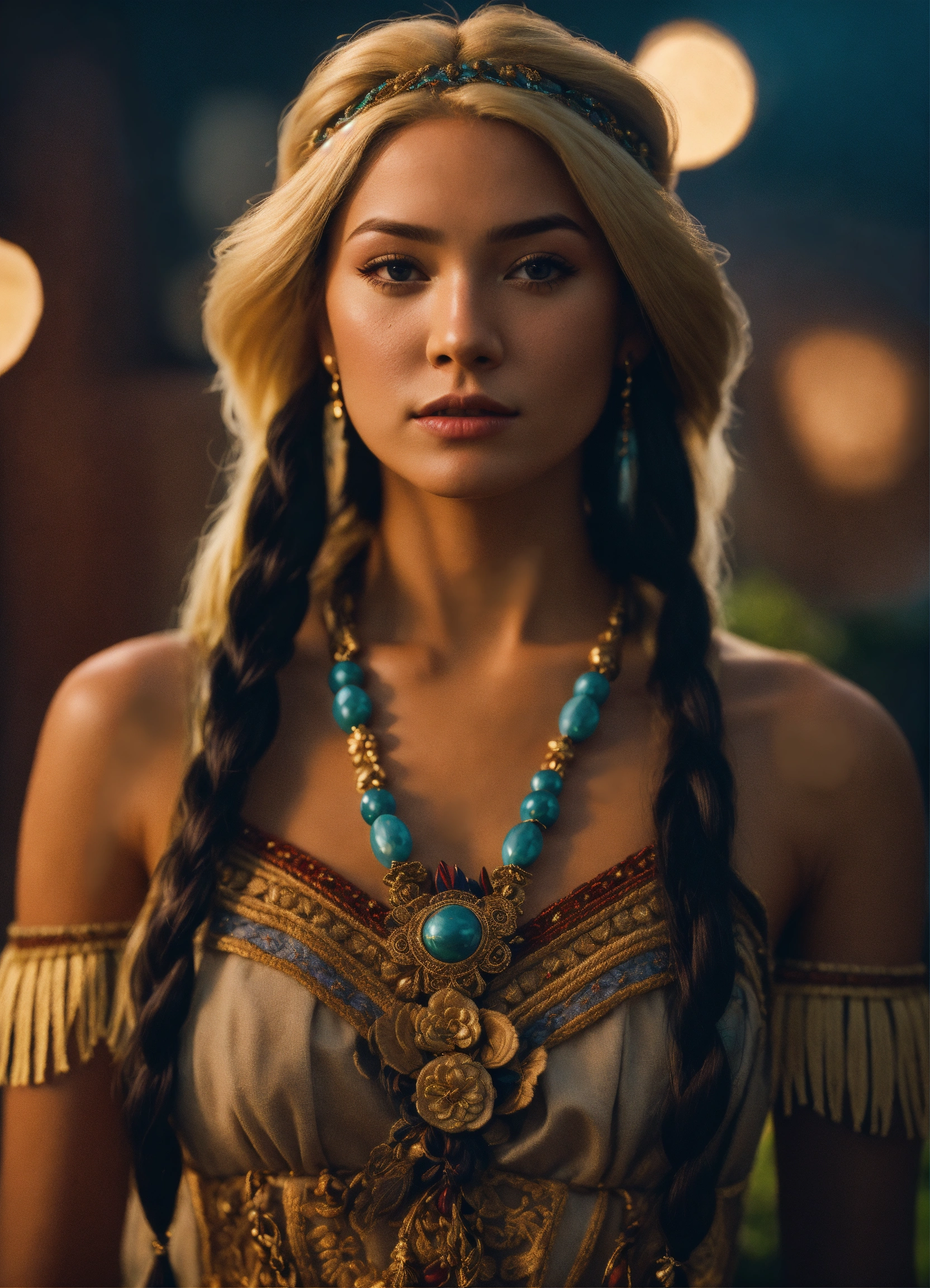 Pocahontas and john smith (blond hair), portrait, best quality, full body portrait, real picture, intricate details, depth of field, fujifilm xt3, raw photo, 8k uhd, unreal engine 5, ray tracing