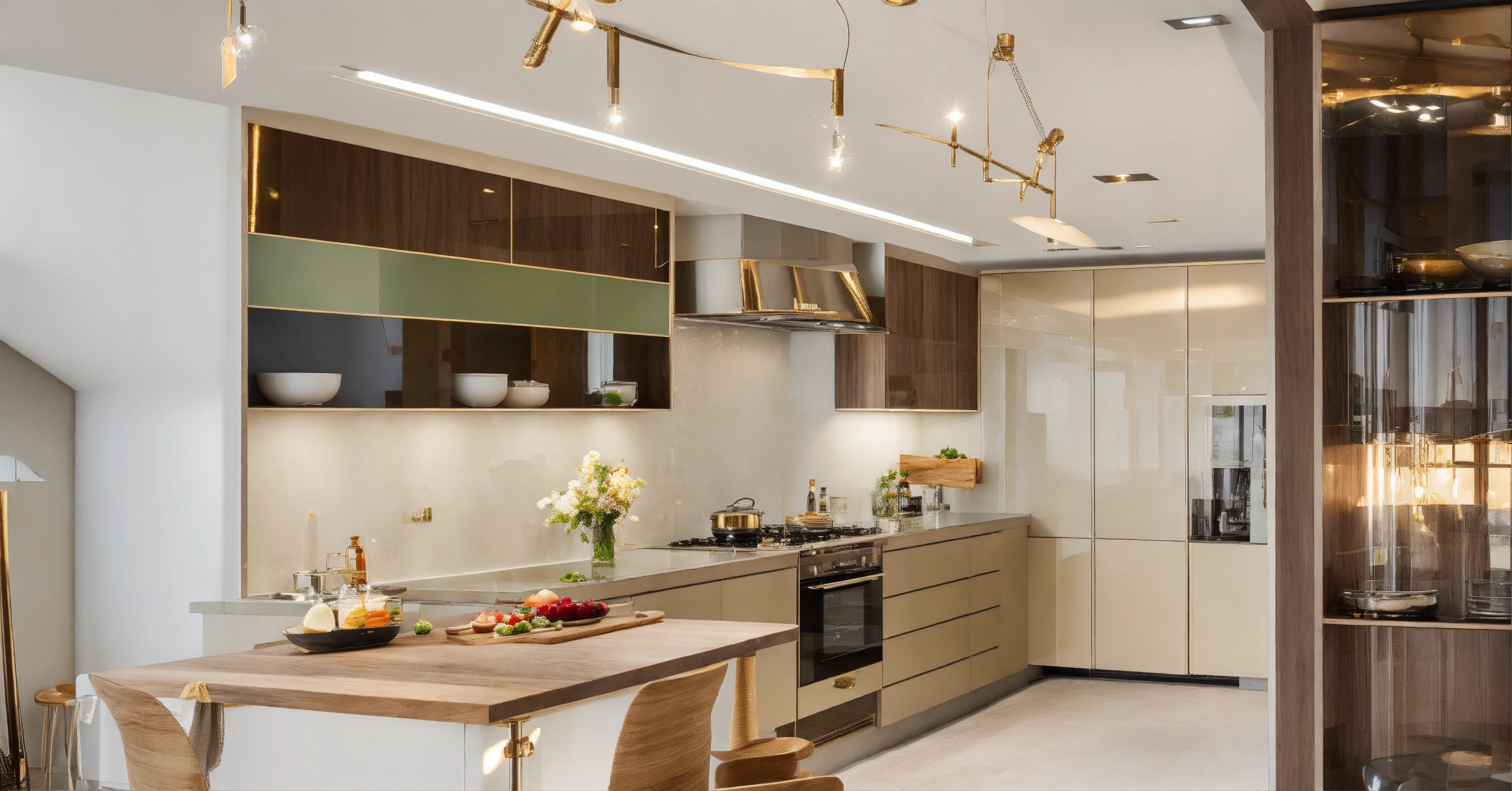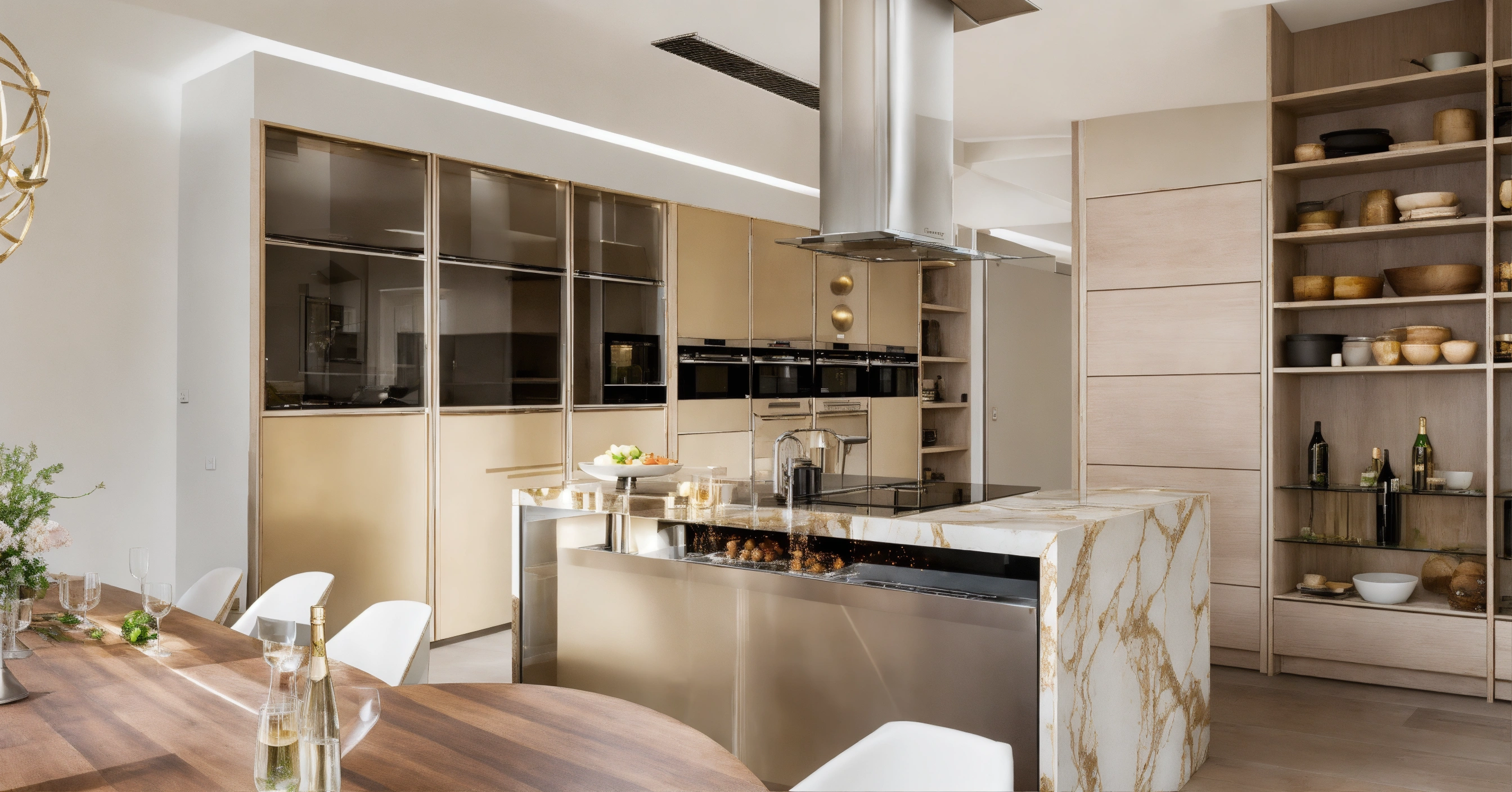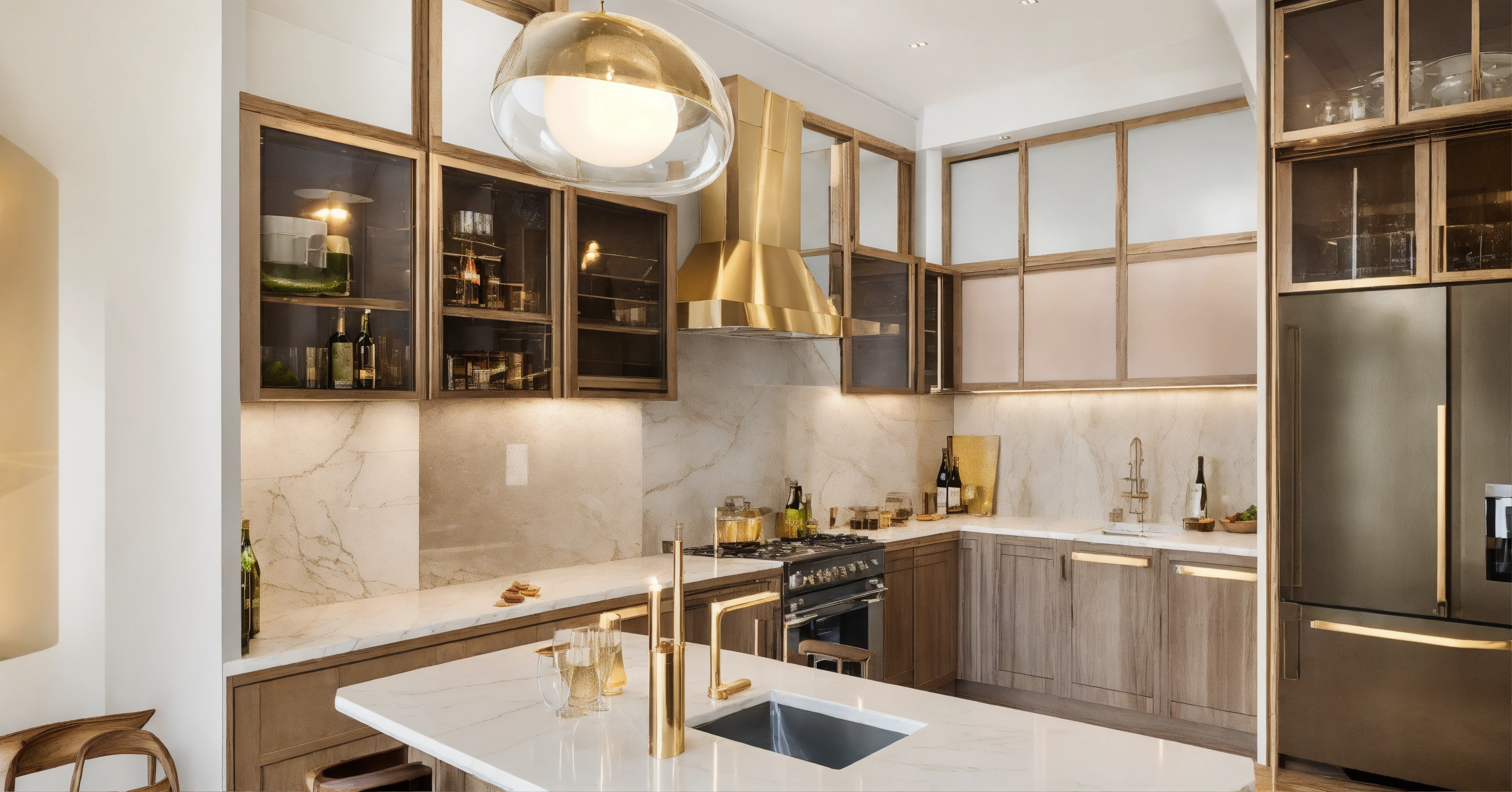 Cuisine couleur champagne avec hotte couleur champagne. cuisinière au gaz, luminaire suspendu doré, retombée de bois noyer, vitrine noyer et verre fumé rétroéclairé, robinet or, comptoir de marbre blanc