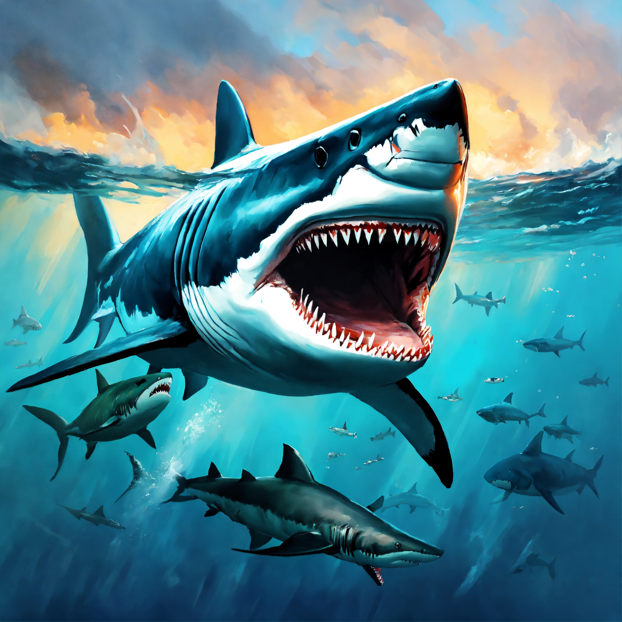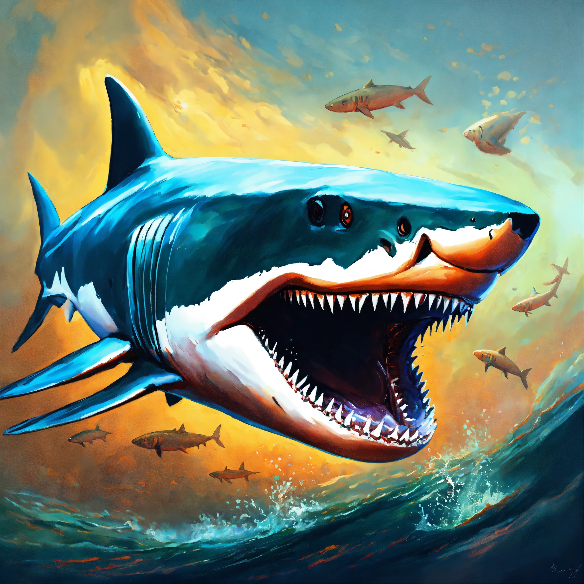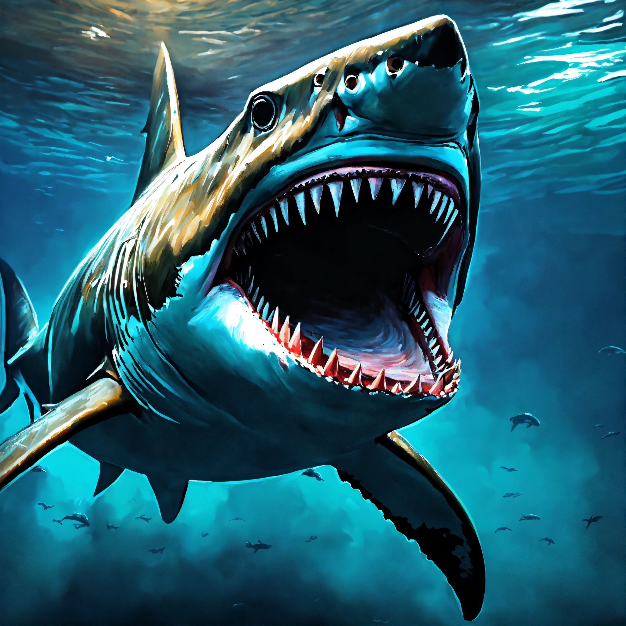 Oil paint concept art of a megalodon shark, blind, full of scars, oil painting style, highly detailed, brush strokes, 8k