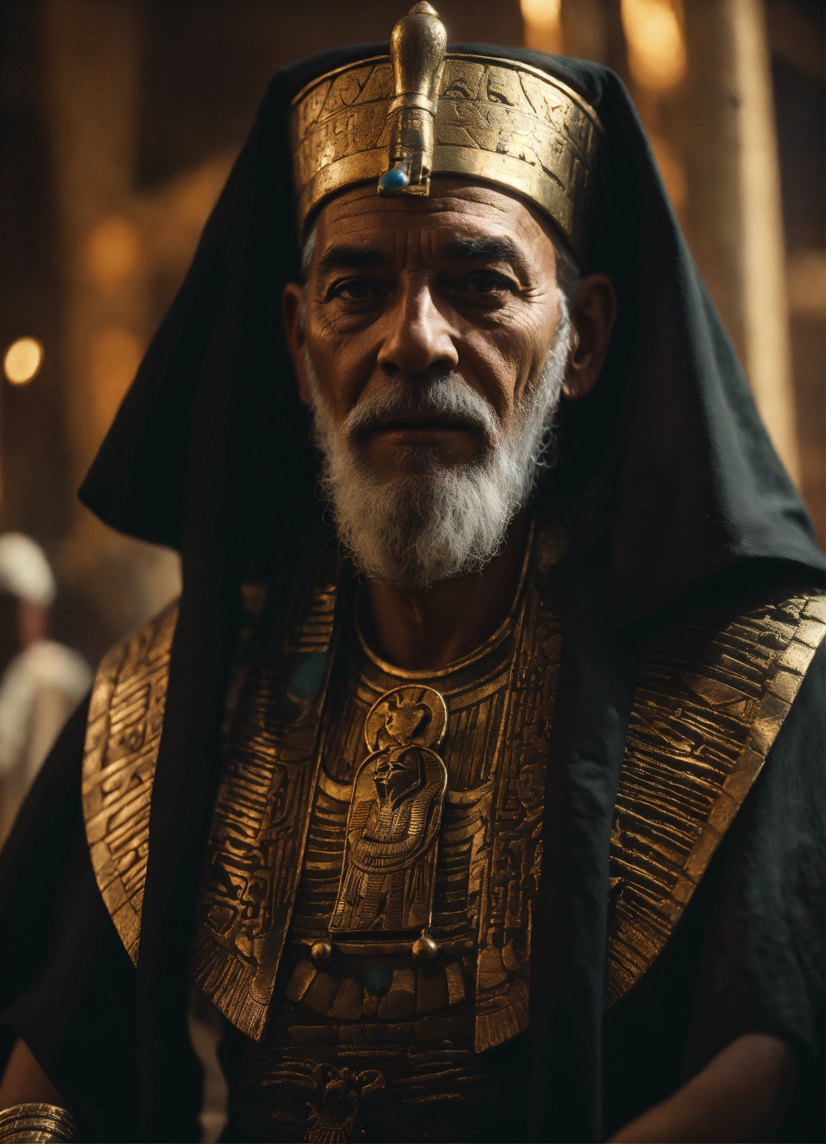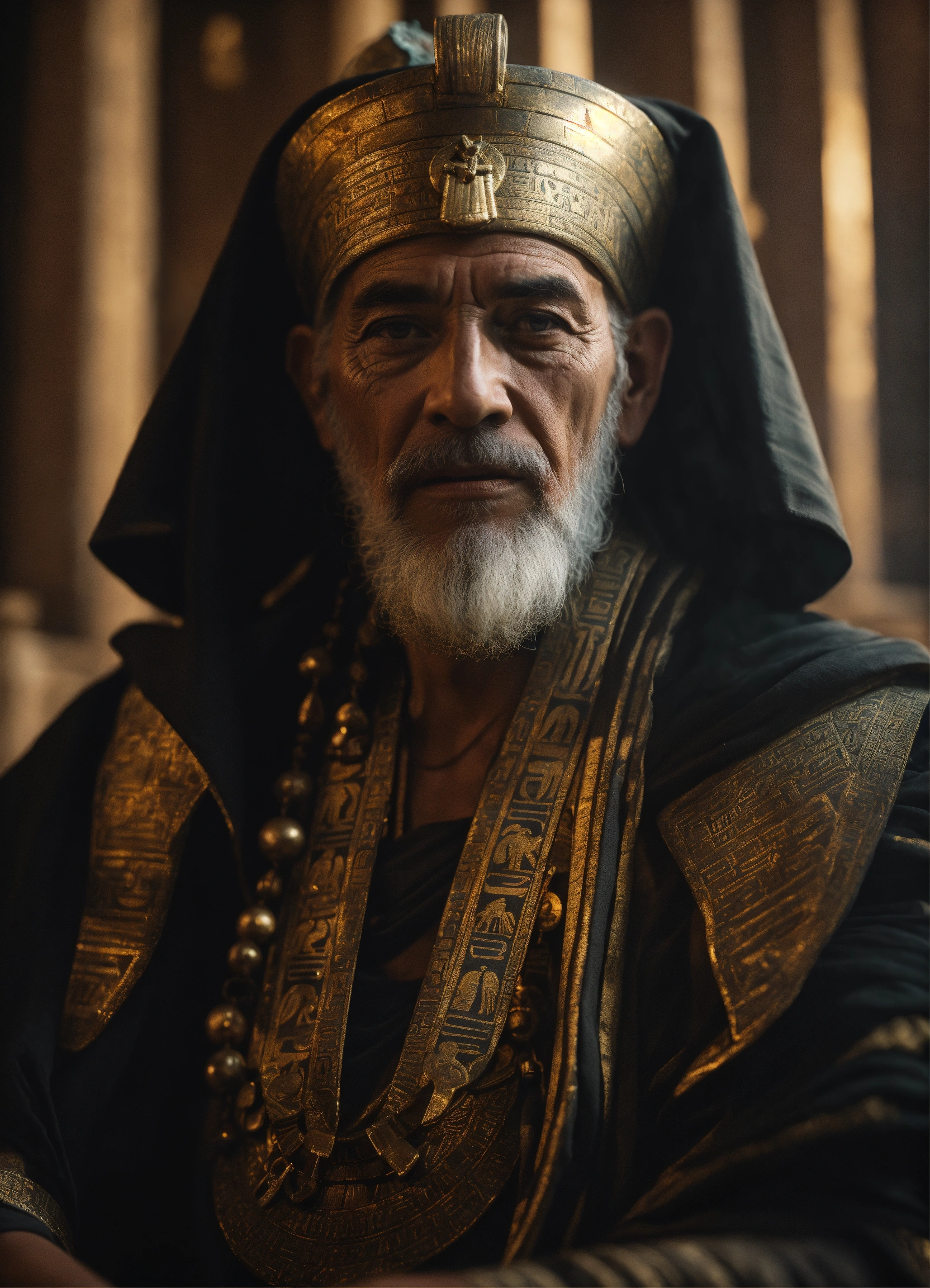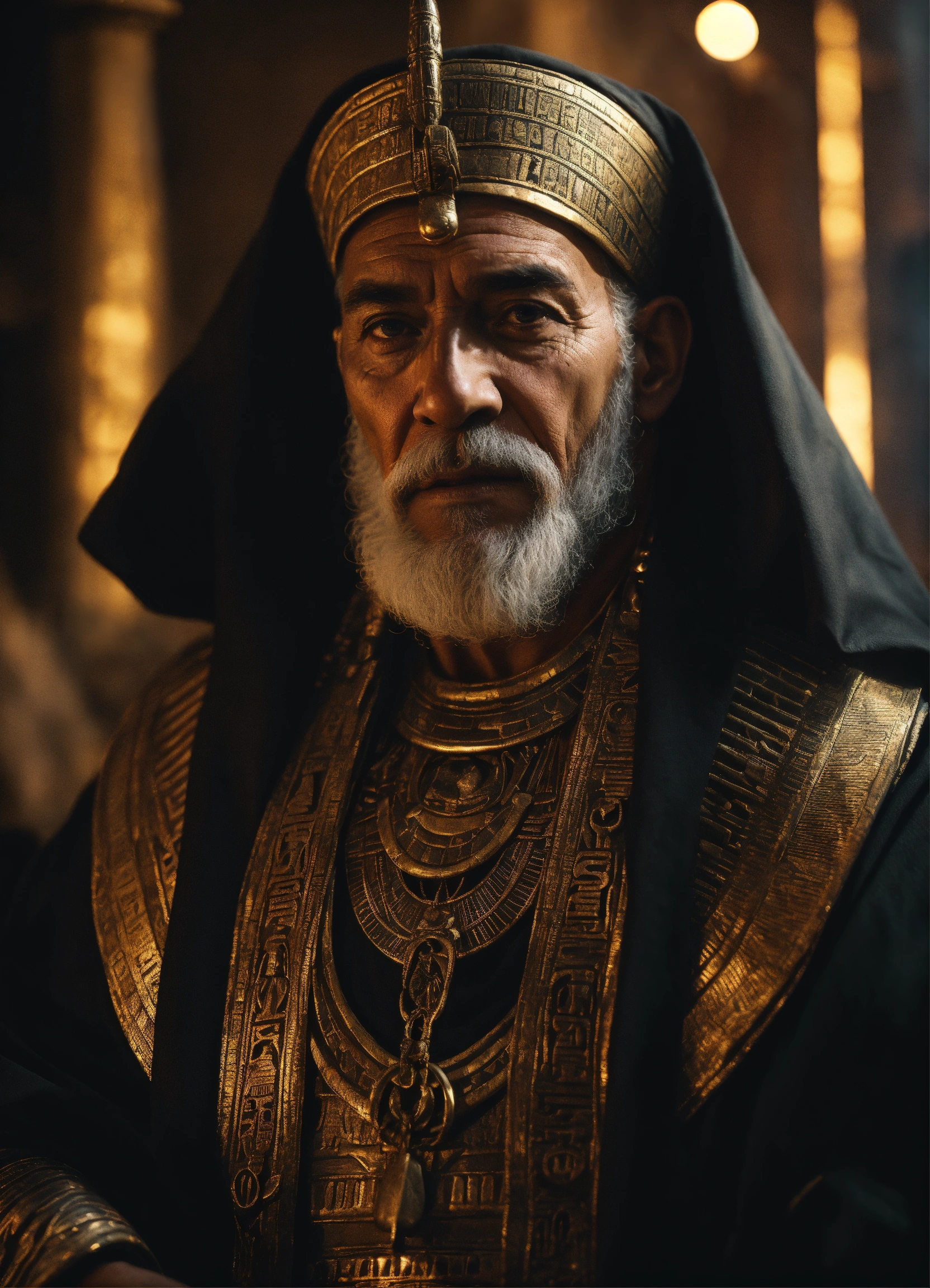 An epic fantasy scene in ancient egypt featuring an old egyptian wizard, dressed in black, highly-detailed, photo realistic, beautiful, moody lighting, best quality, realistic, real picture, intricate details, depth of field, close side view from left, raw photo, 8k uhd, film grain.